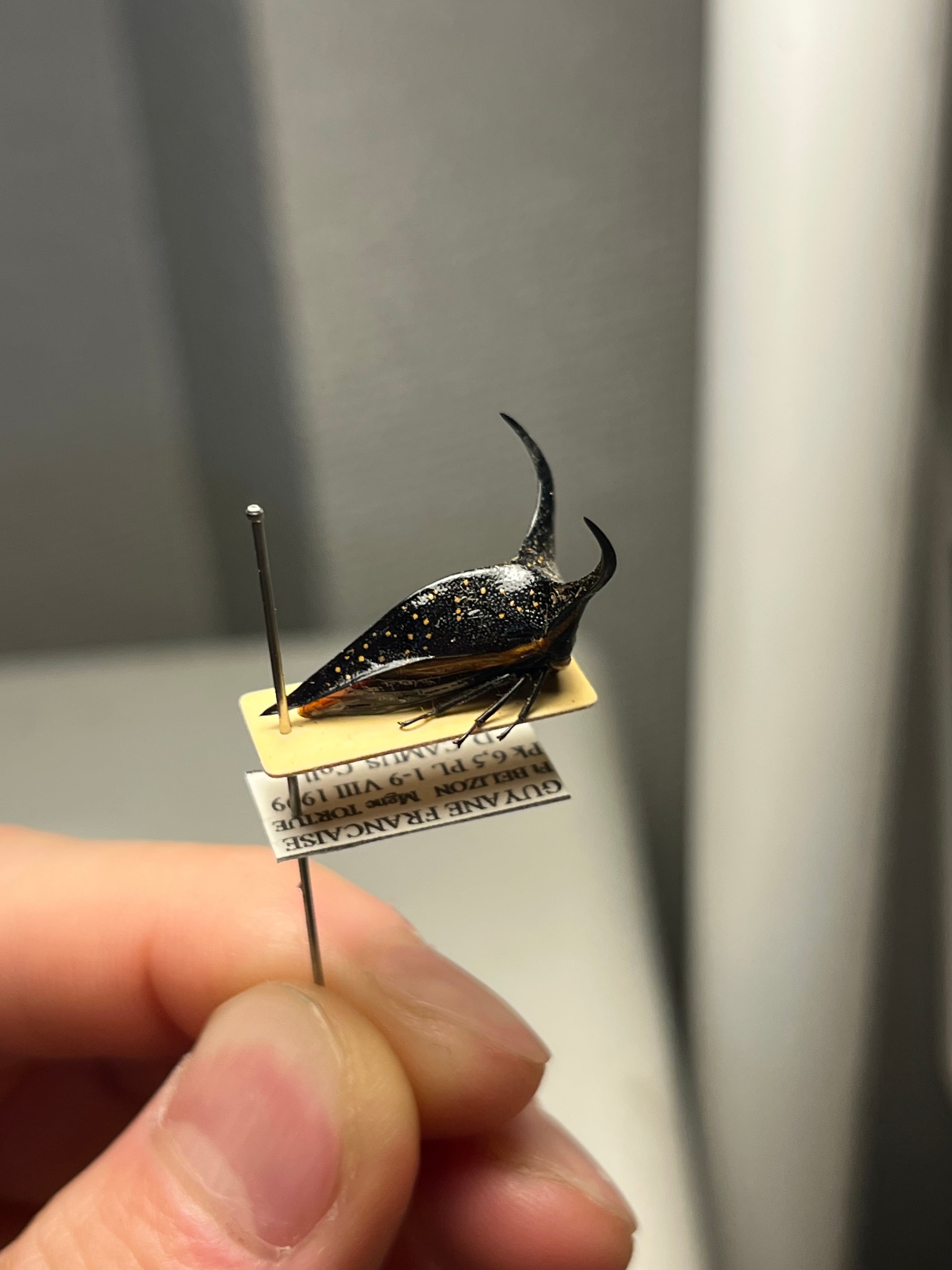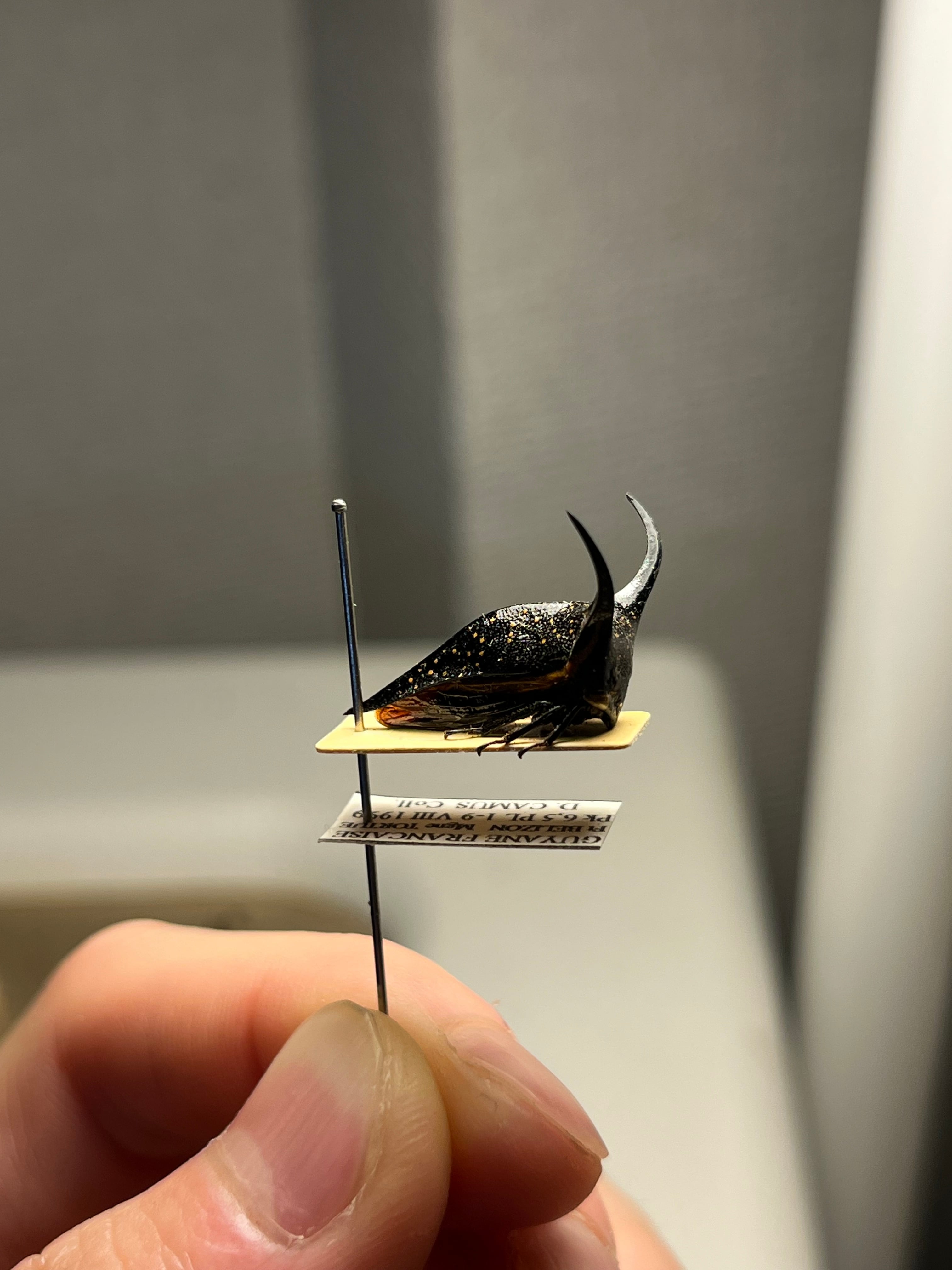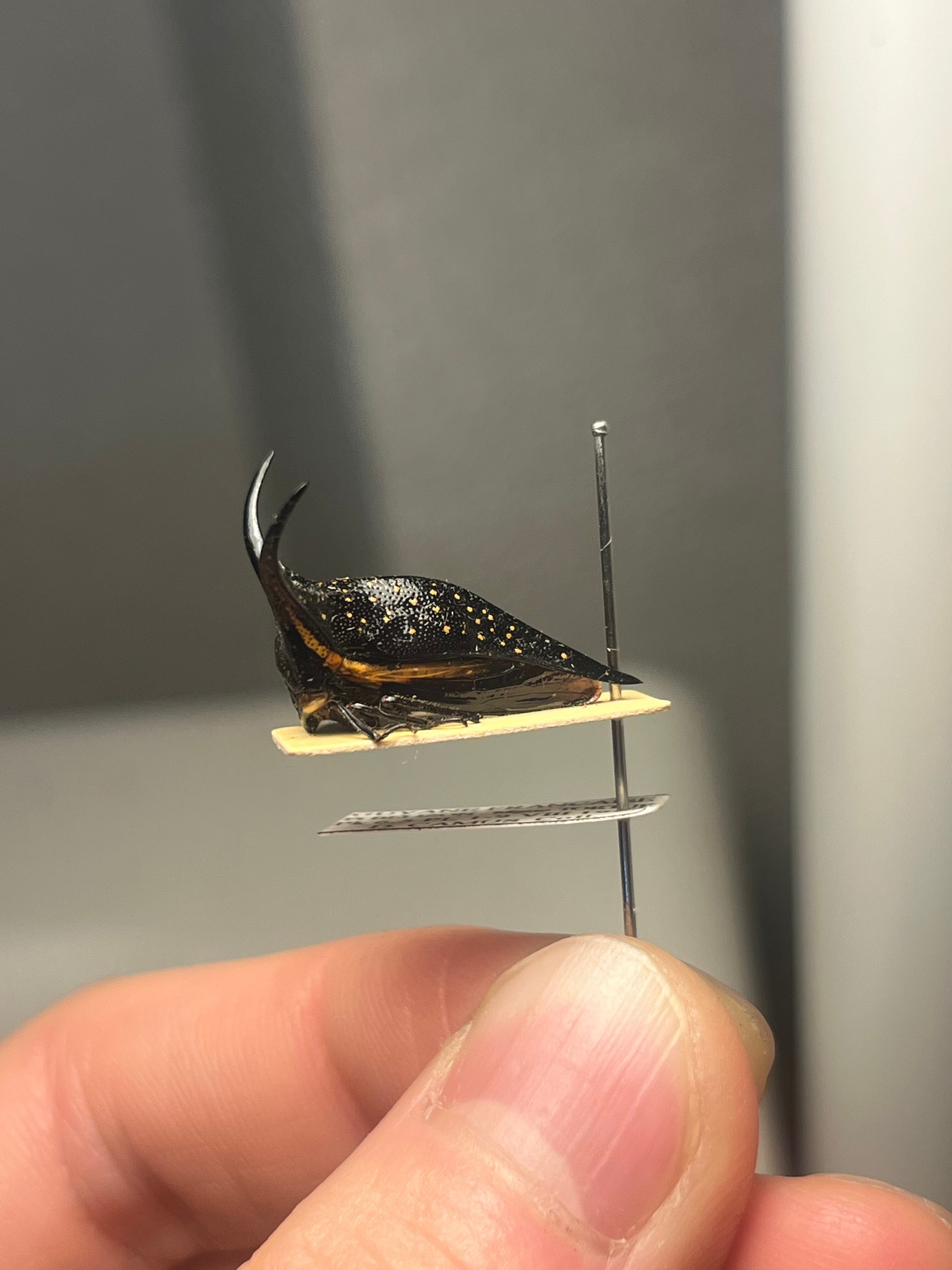 堅牢な体に、長く伸びた角が特徴的です。この角は天敵の鳥が飲み込みにくいように進化したのではないかと思います。