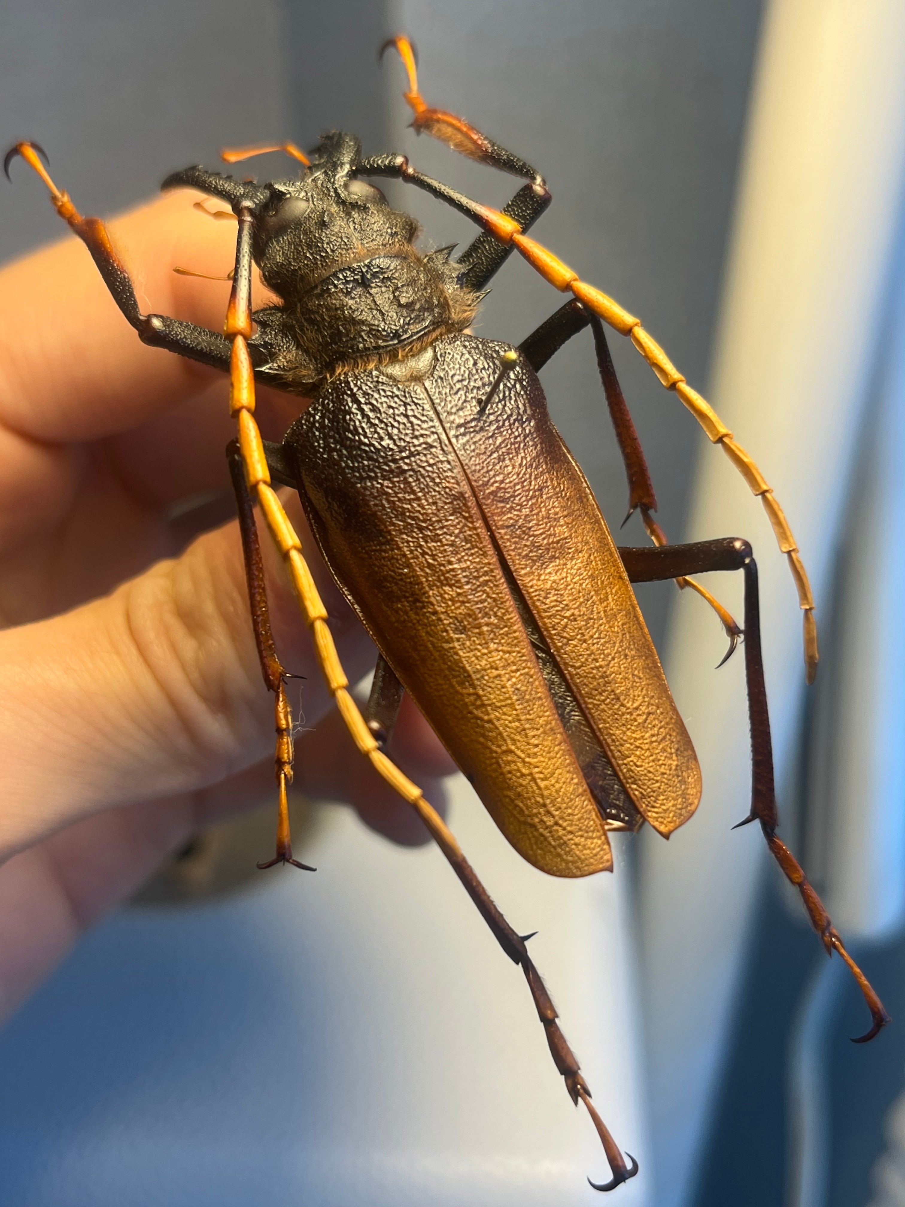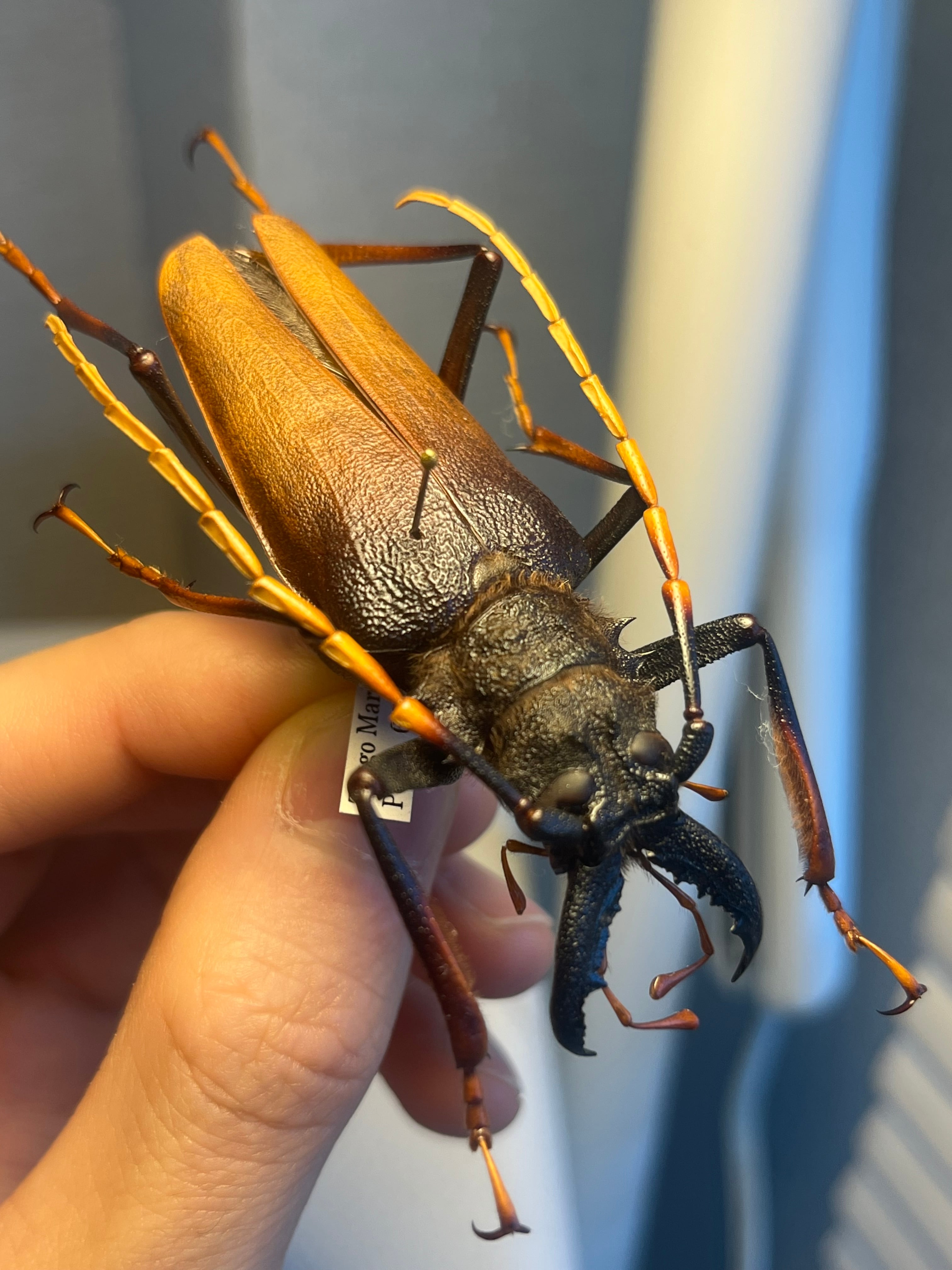 キンオニノコギリカミキリがこの種を示すコモンネームとして1番正しいみたいですが今ではルリオニカミキリが1番使用されているみたいです。英名が載っていないのでわからないです。