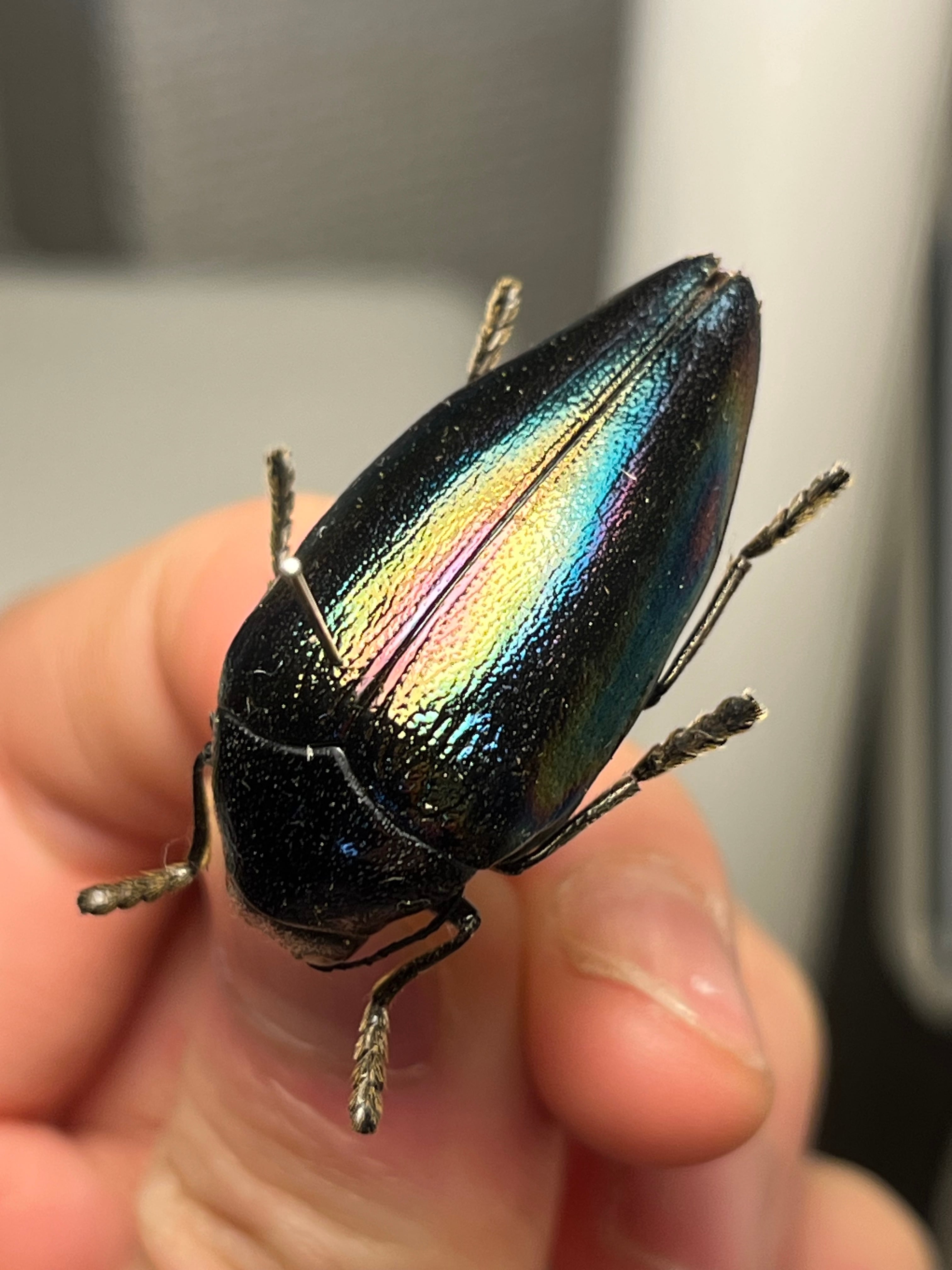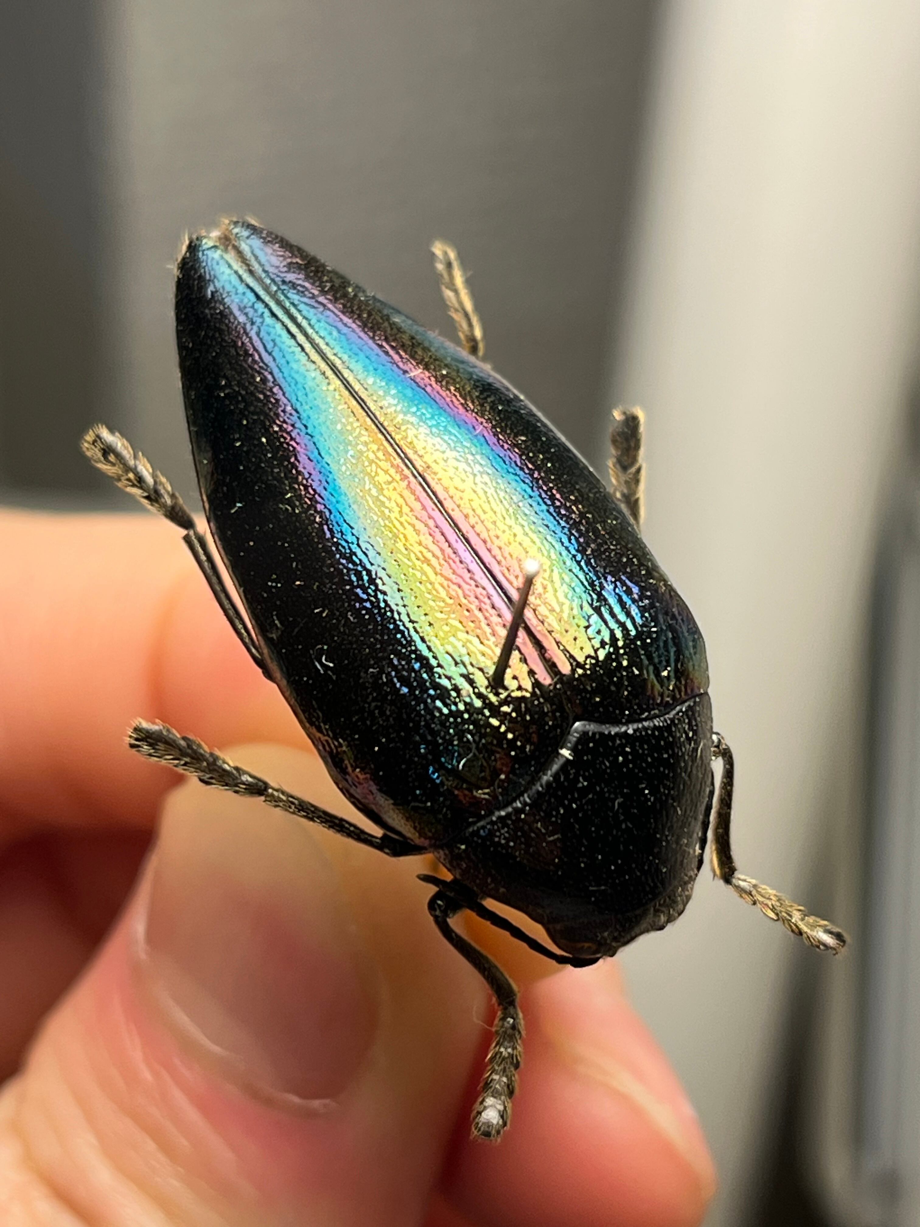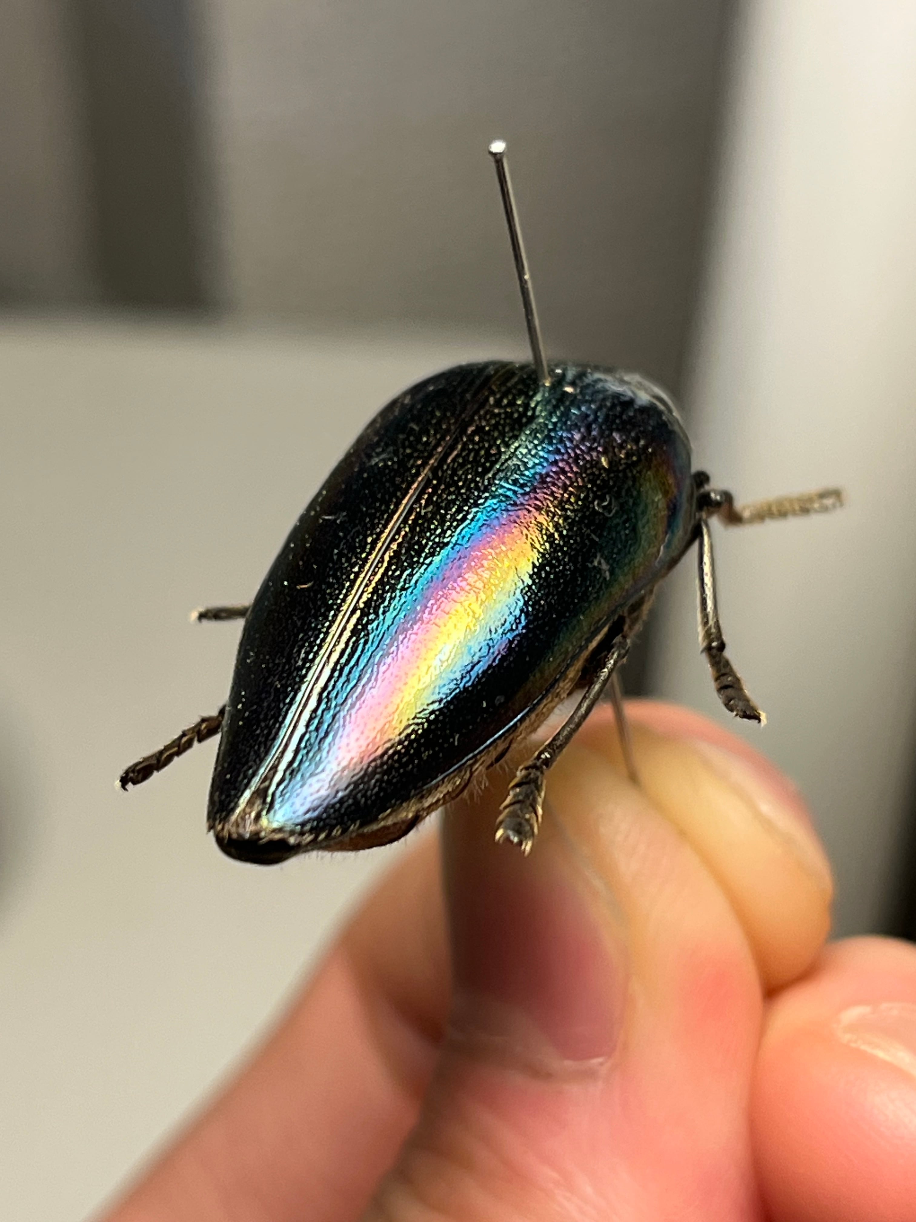 虹の女神の名をもつ、美しいフトタマムシ。チタンのヒートグラデーションのような七色の光沢が素晴らしいです。