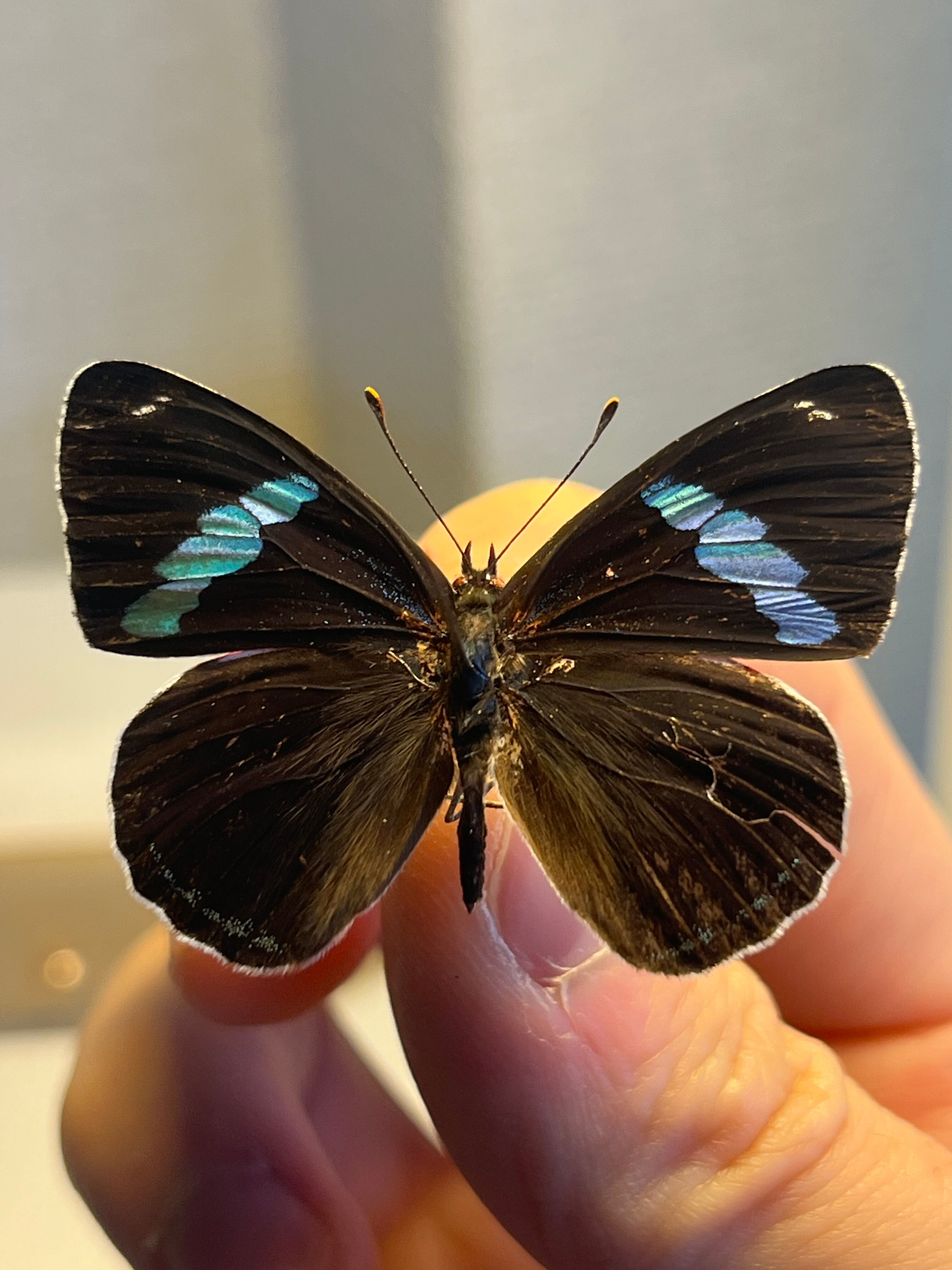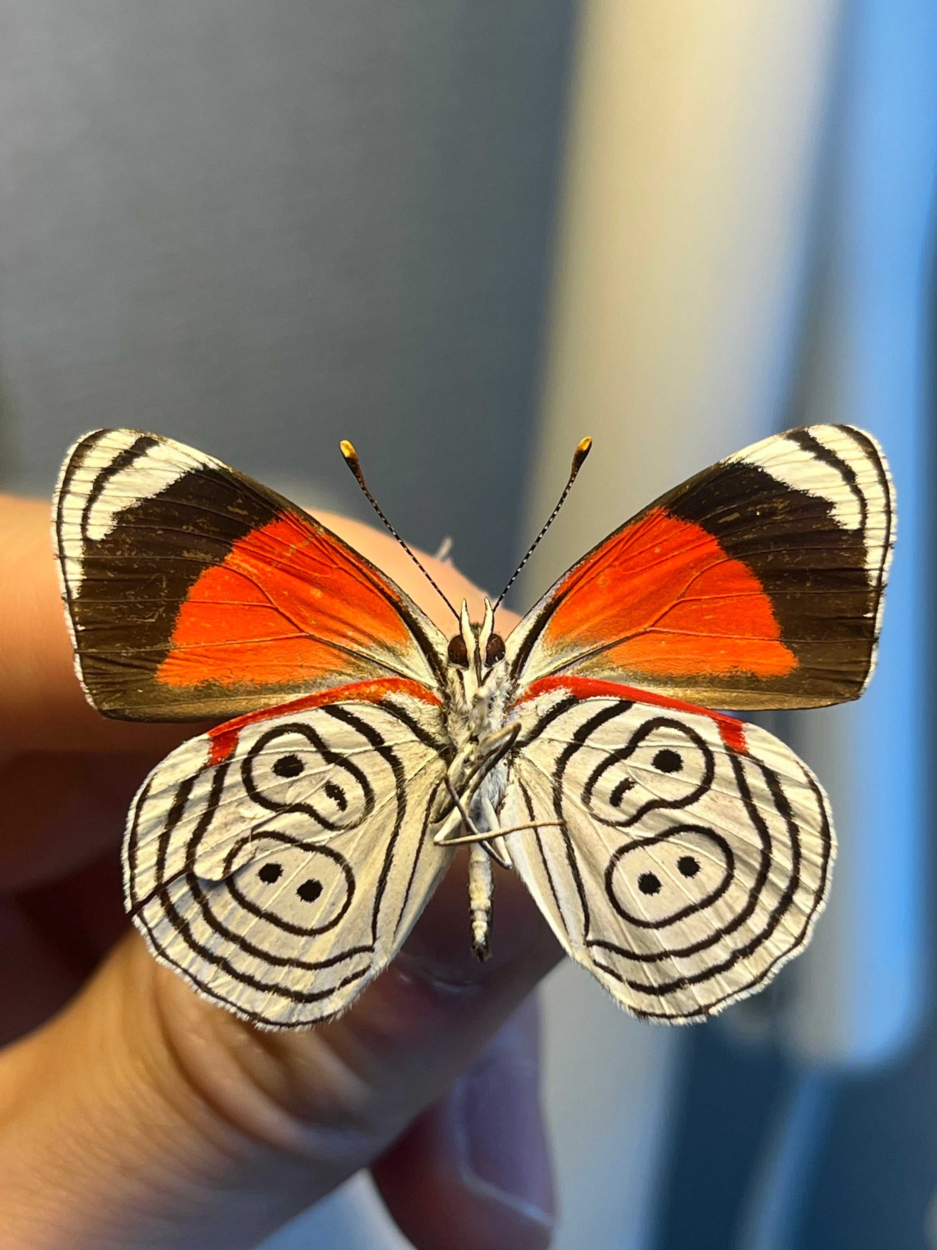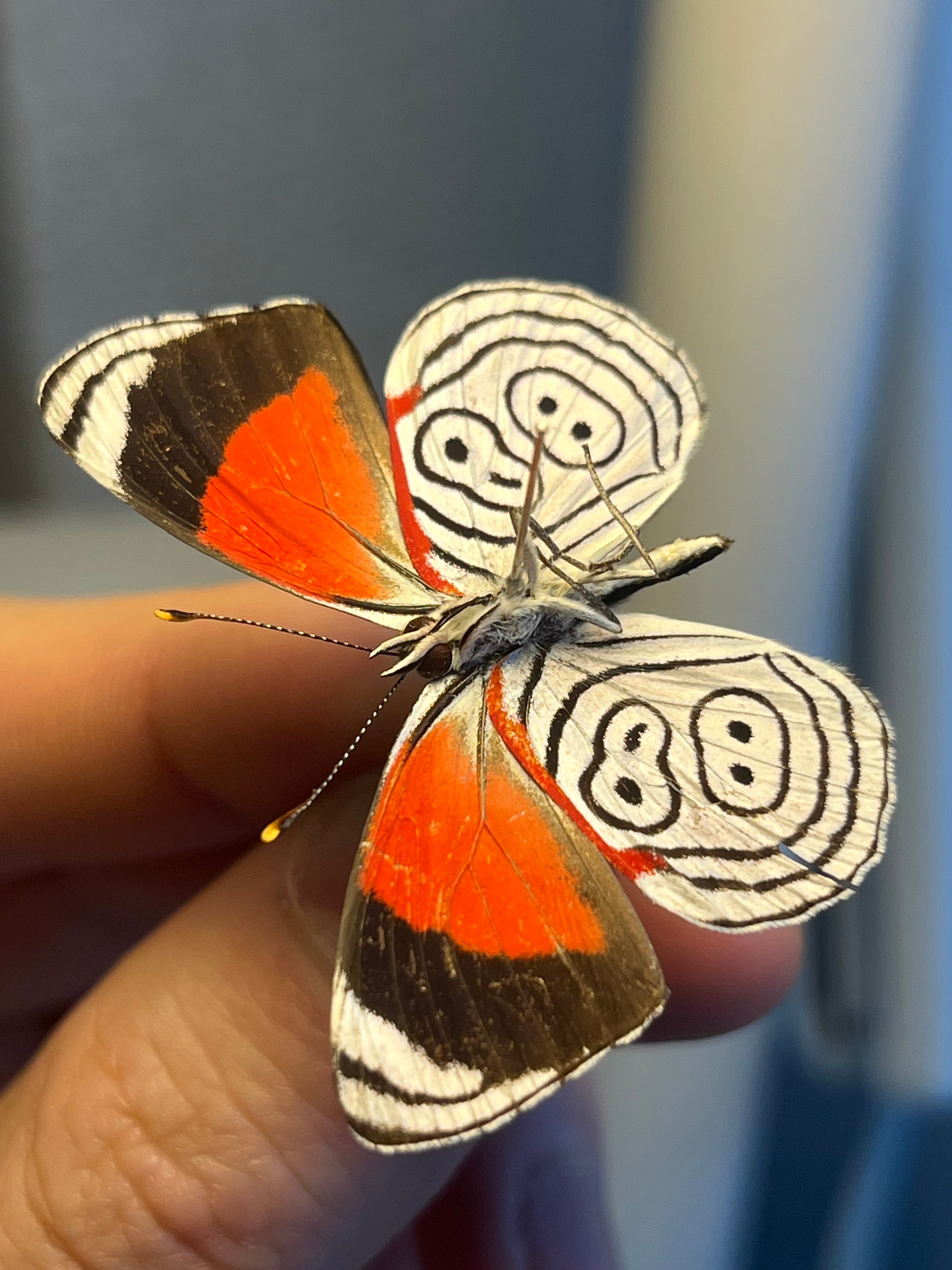 ディアエトリア・アンナ(Diaethria anna)は、アナズエイティエイト(Anna's eighty-eight)またはフィニタ・ブラスカ(Finita Burrasca)とも呼ばれ、中米の湿潤熱帯林に生息する蝶です。稀に、南テキサスで迷い込んだ姿で発見されることがあります。表側は暗褐色で、前翅には青緑色の金属的な帯があります。前翅の裏側は赤色で、その下に幅広の黒帯が続き、先端は白色です。後翅の裏側は白色で、黒で縁取られた「88」に近い線が入り、これがこの種の学名の由来となっています。模様は時折「98」や「89」に似ていることもあります。