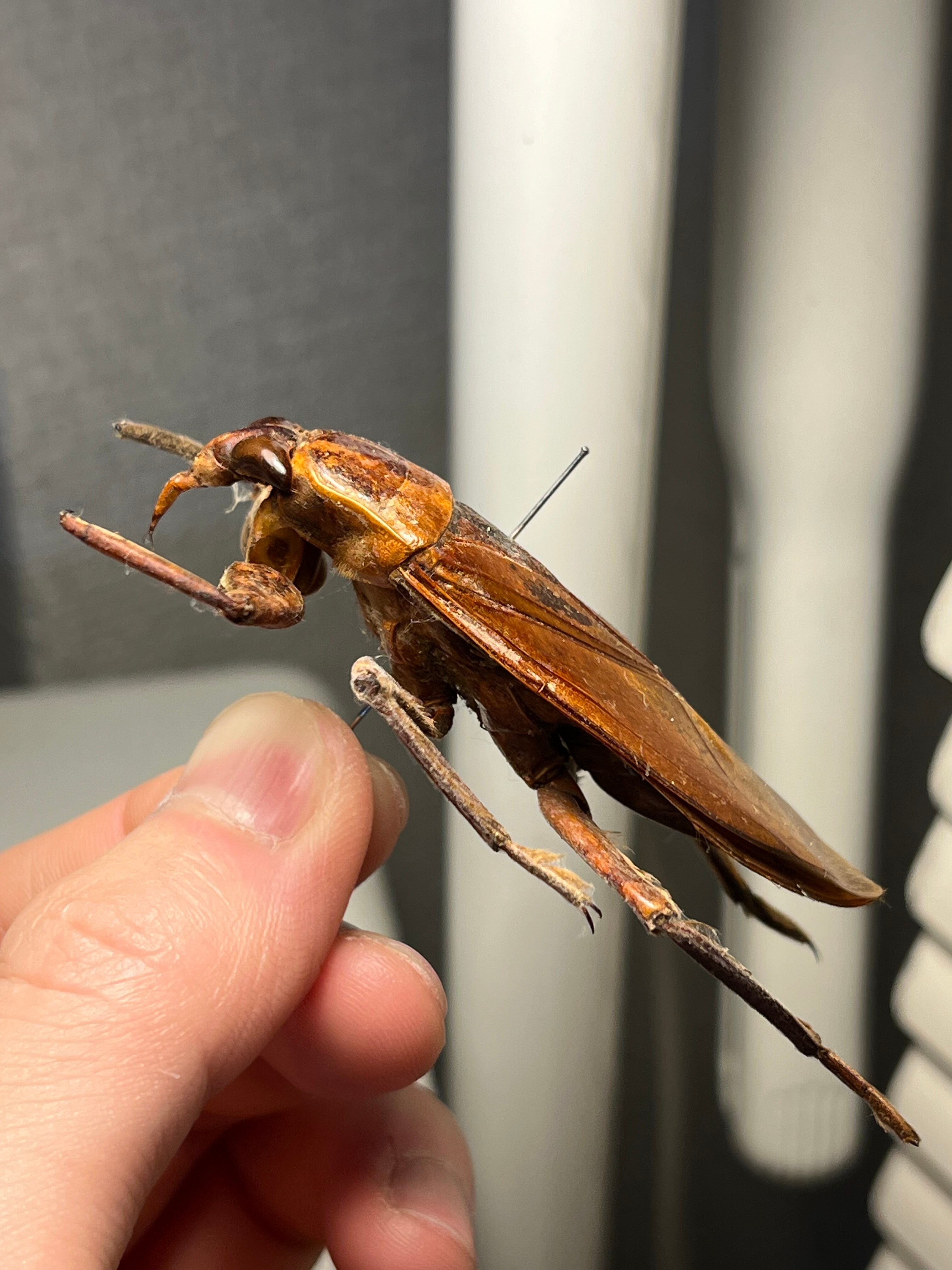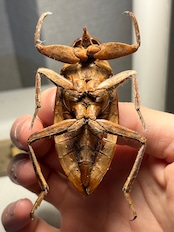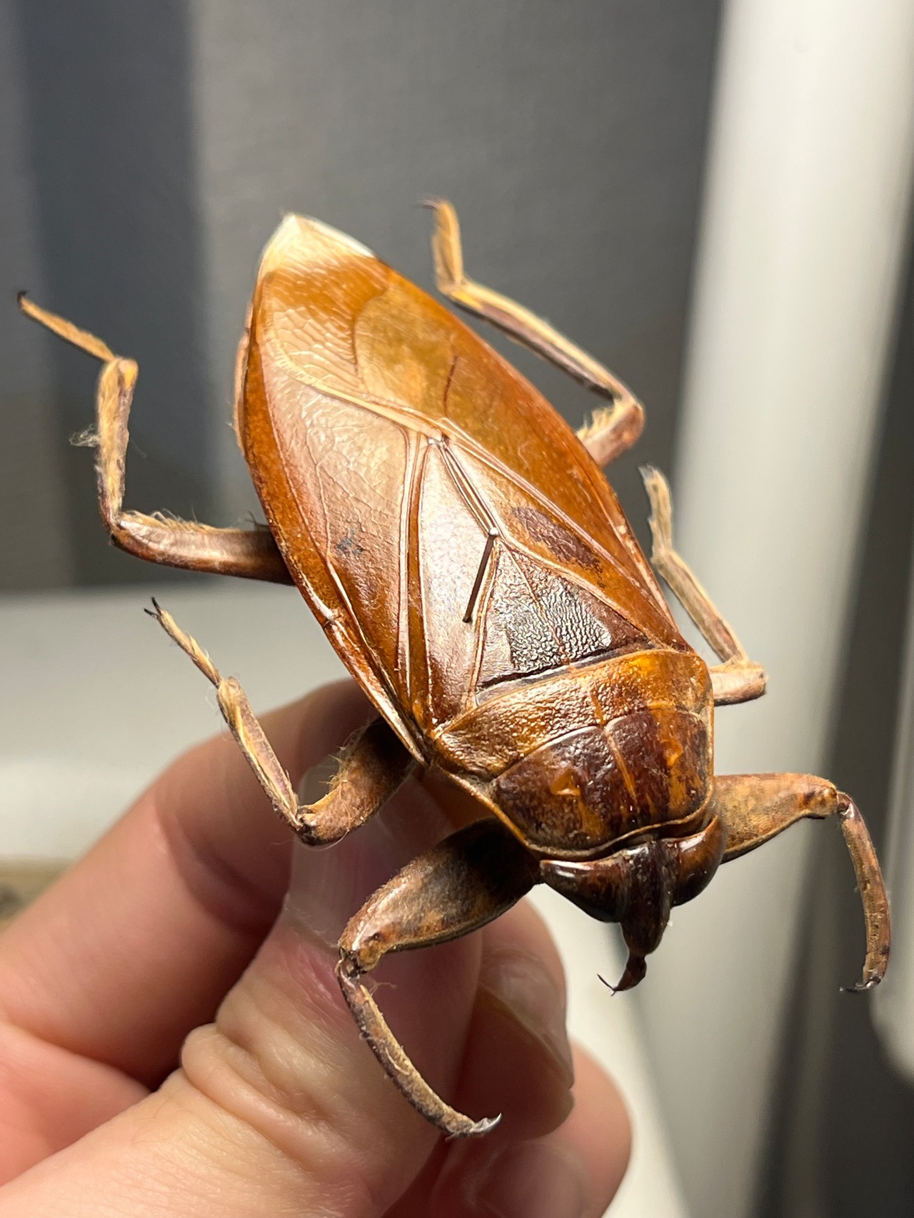 スポーティーなサングラスをかけたような鋭い目つきのタガメです。