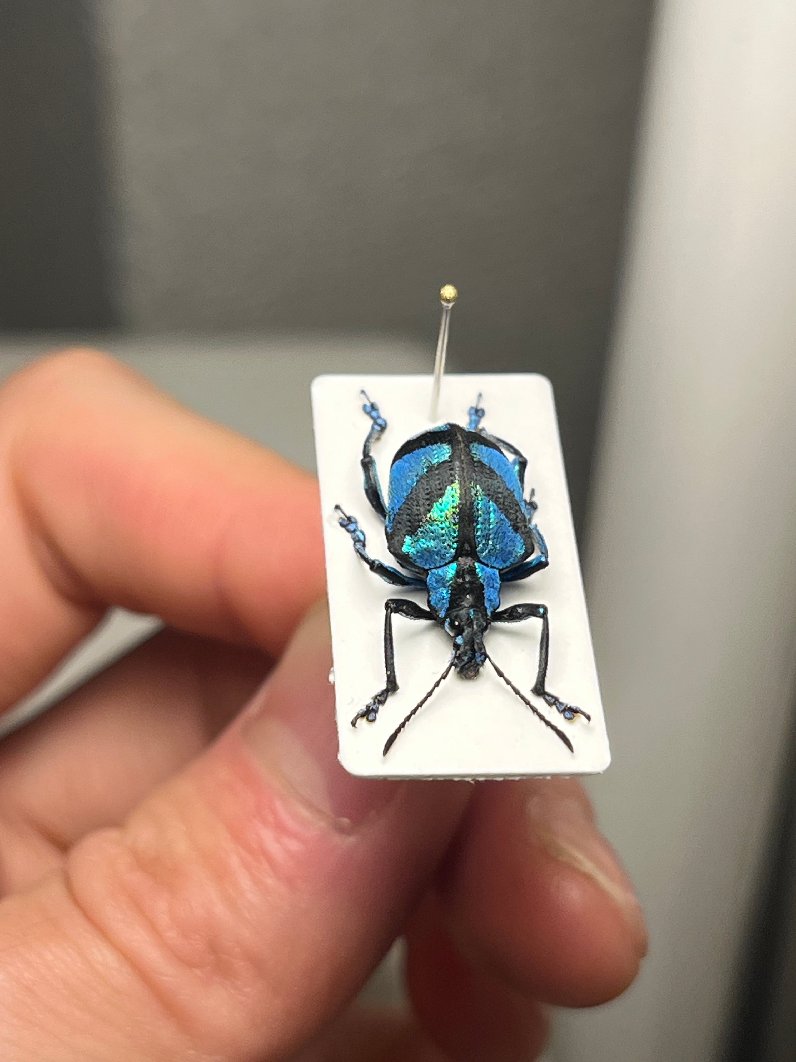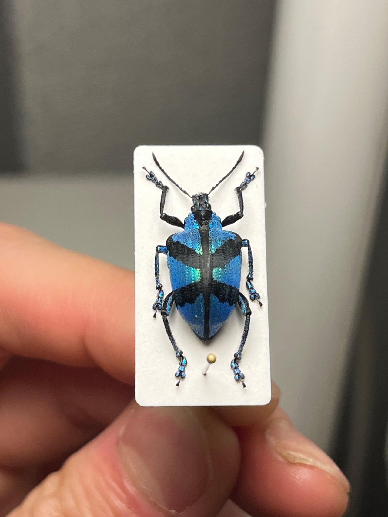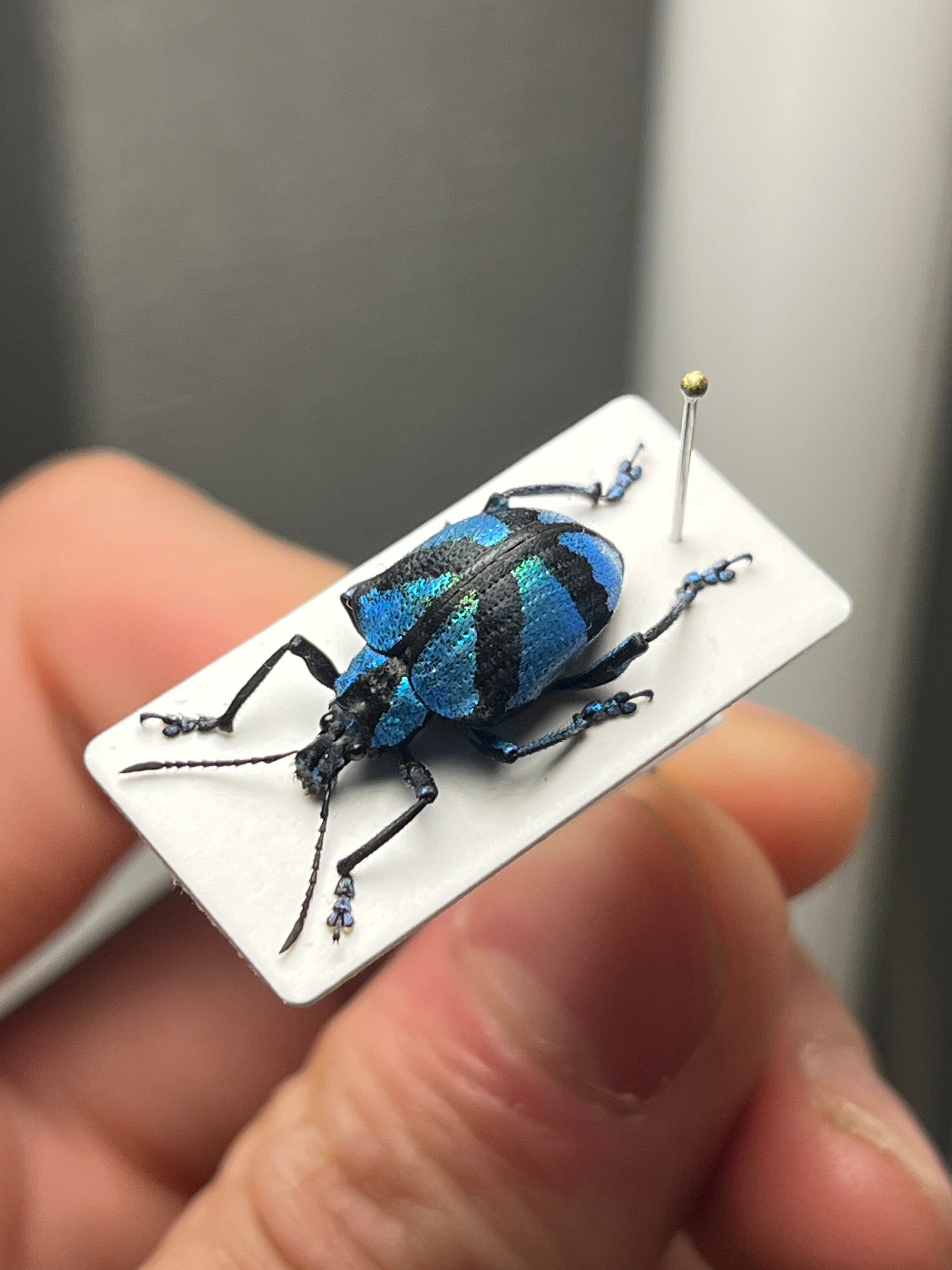 目が覚めるようなセルリアンブルーが美しいゾウムシです。背中のマークが何かの国旗にも見えてきます。
