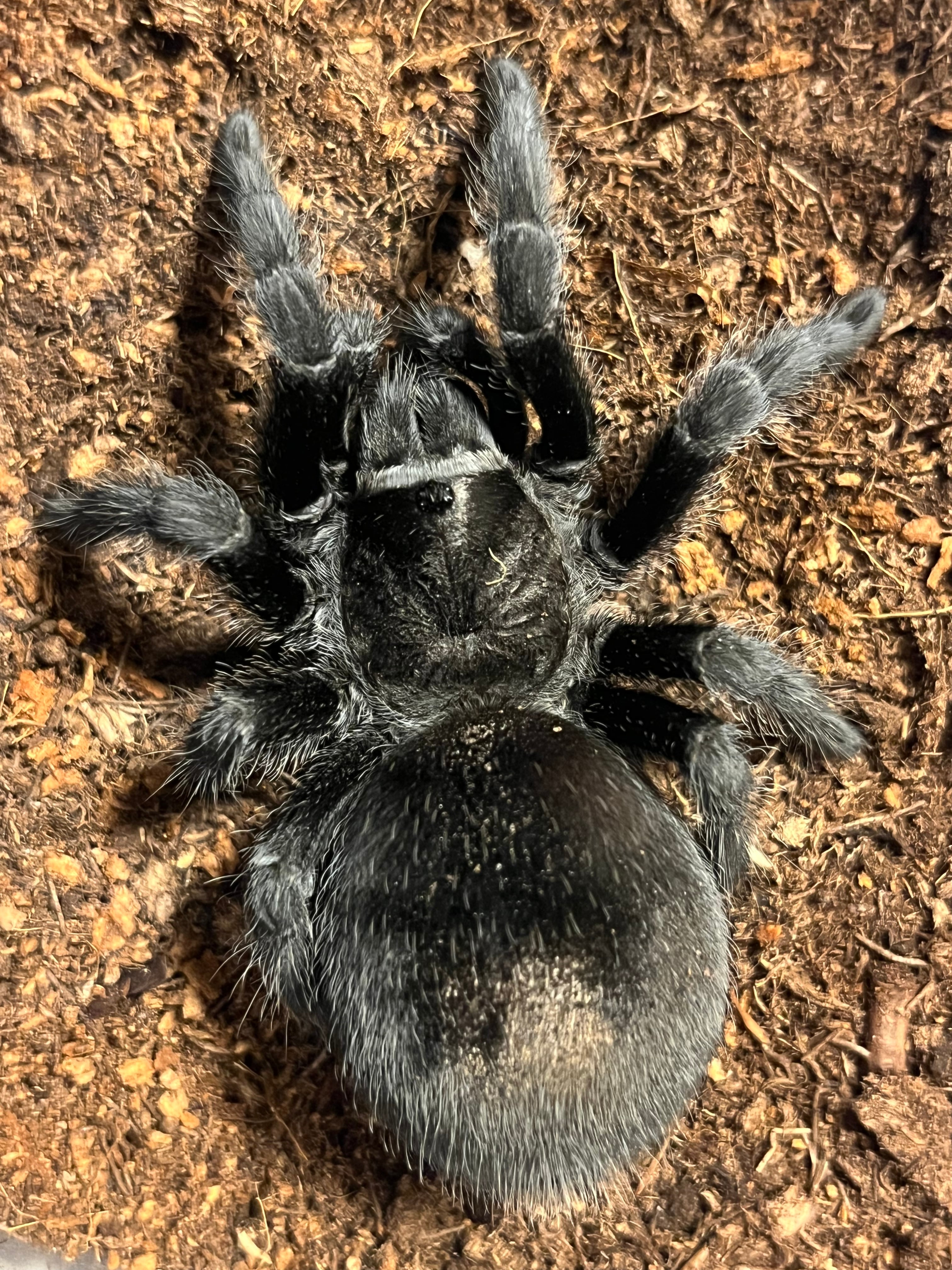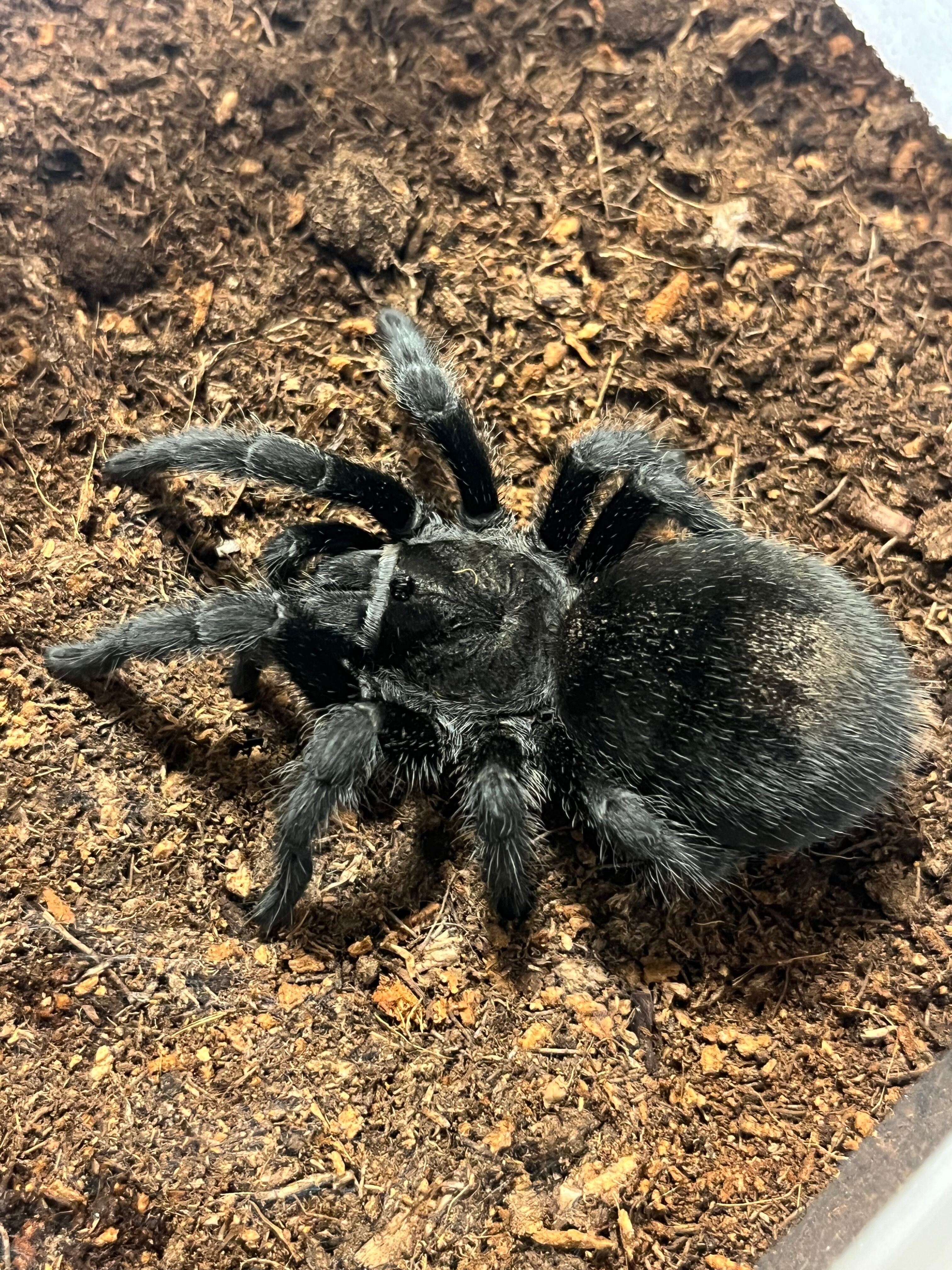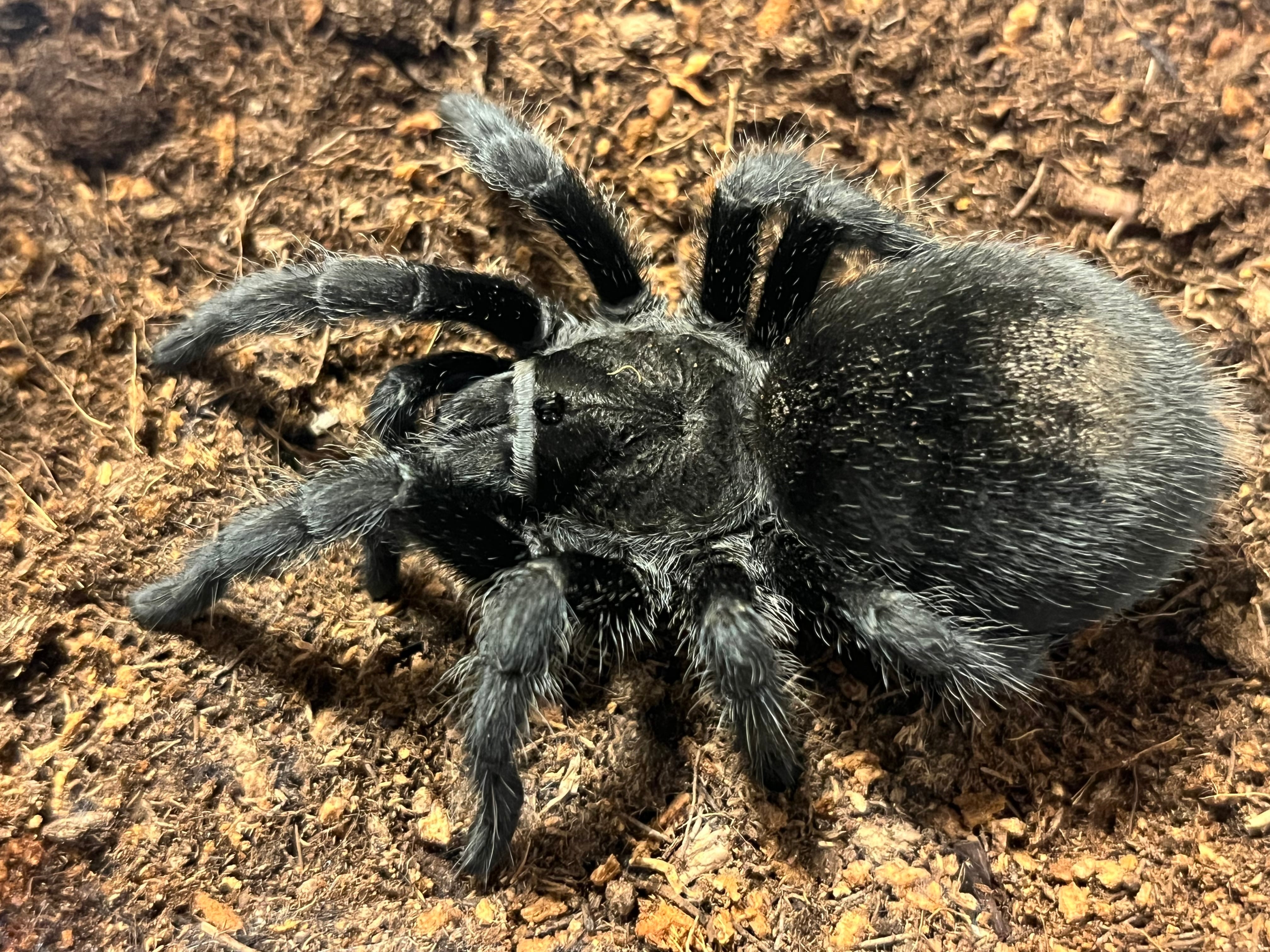 ぷっくりしたお腹とベルベットのような黒い艶感のある体がとてもキュートなタランチュラです。タランチュラの中で1番人気です。