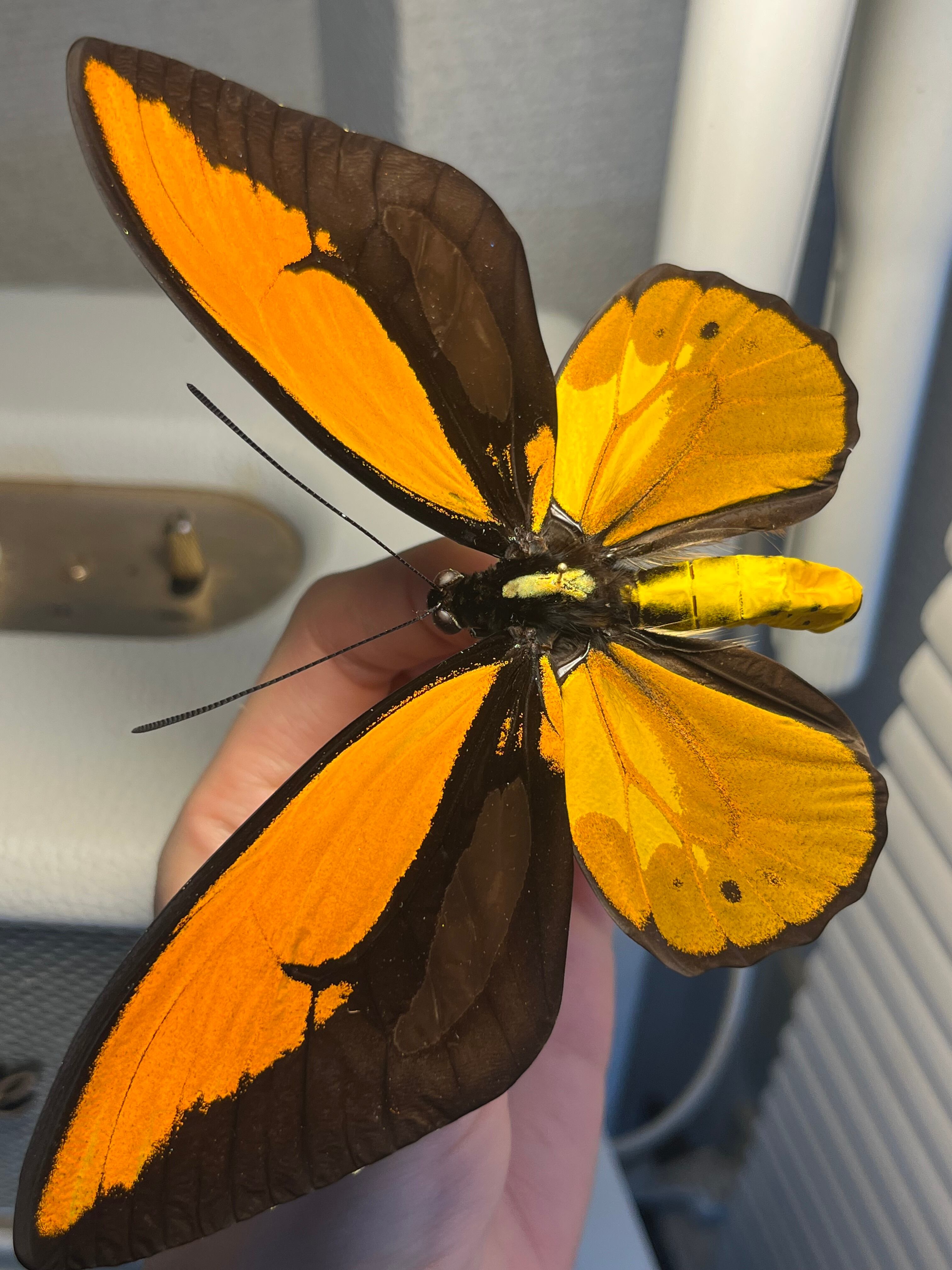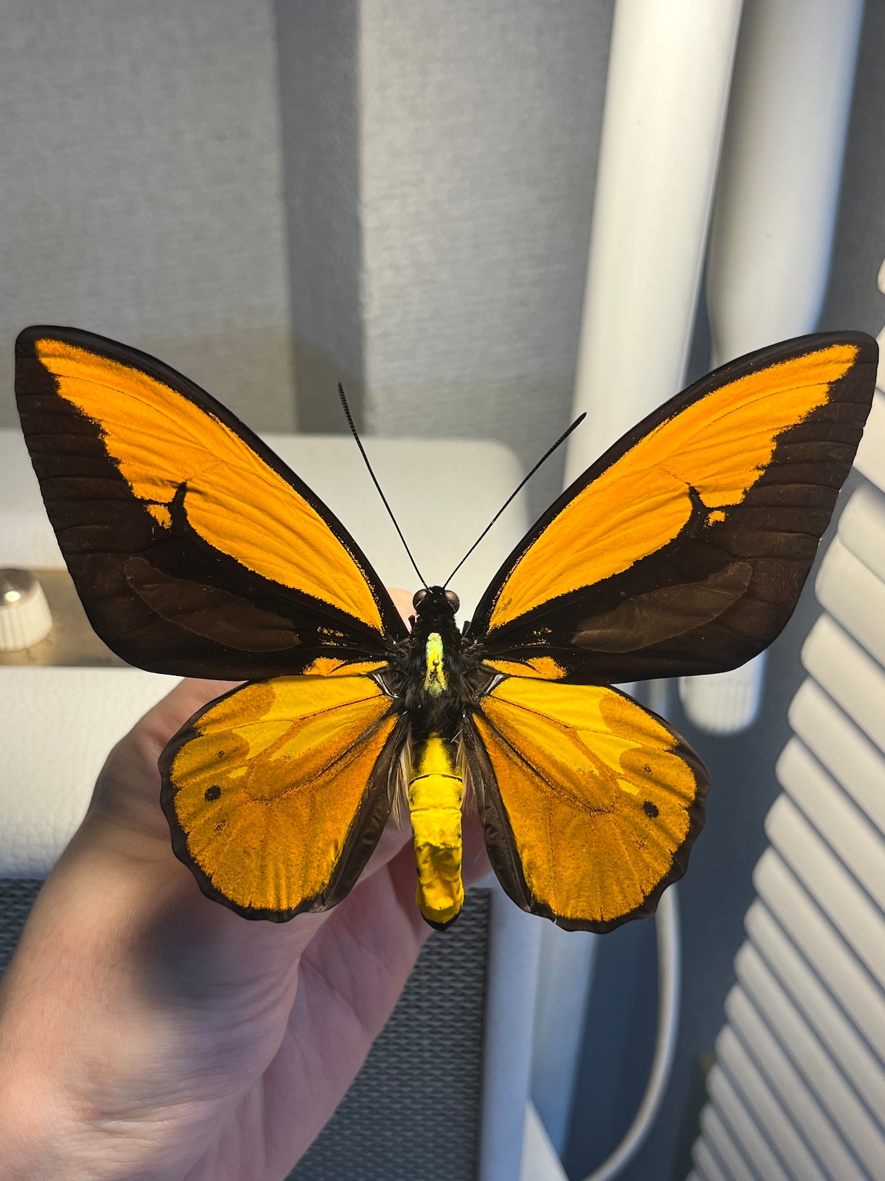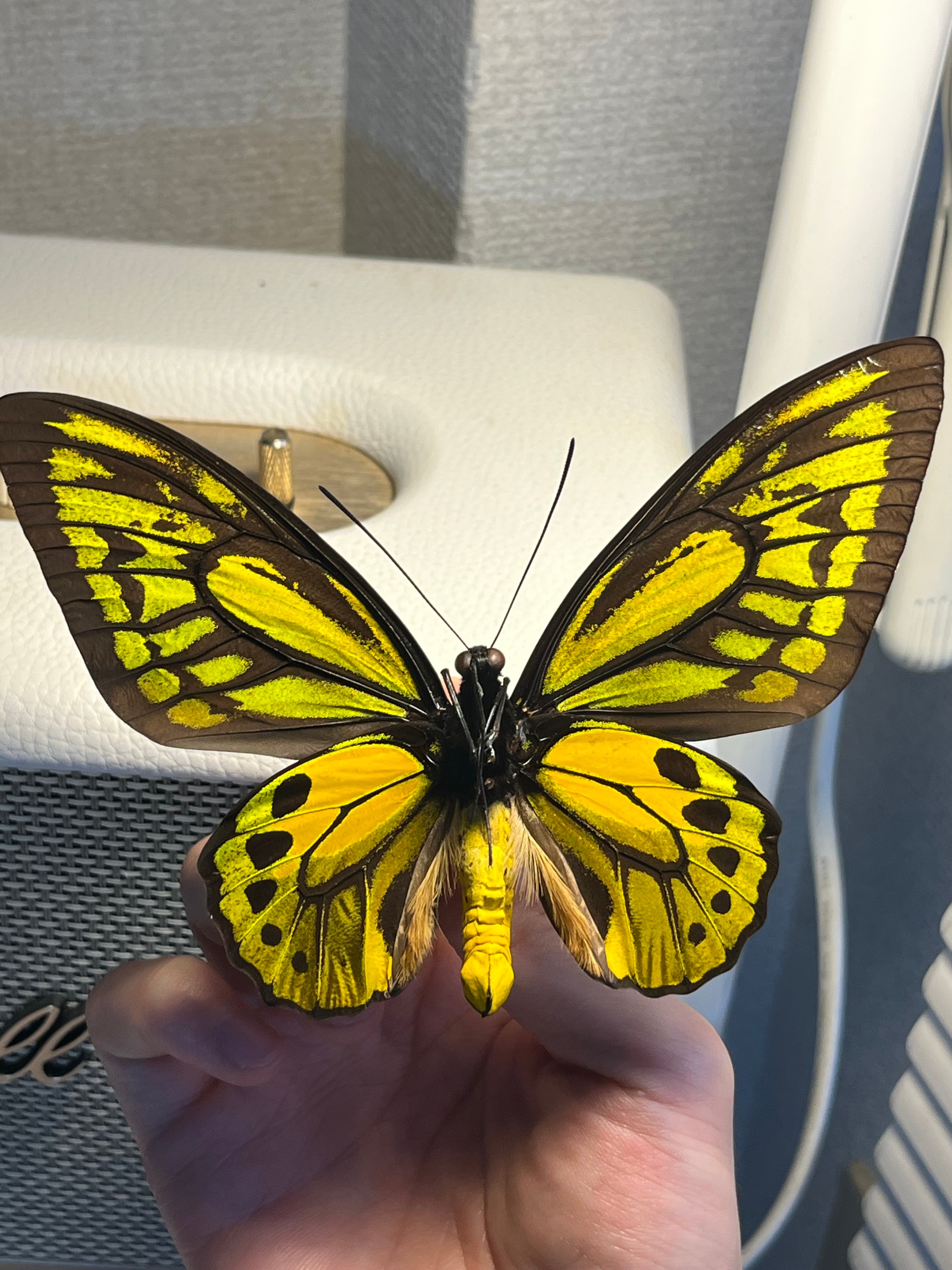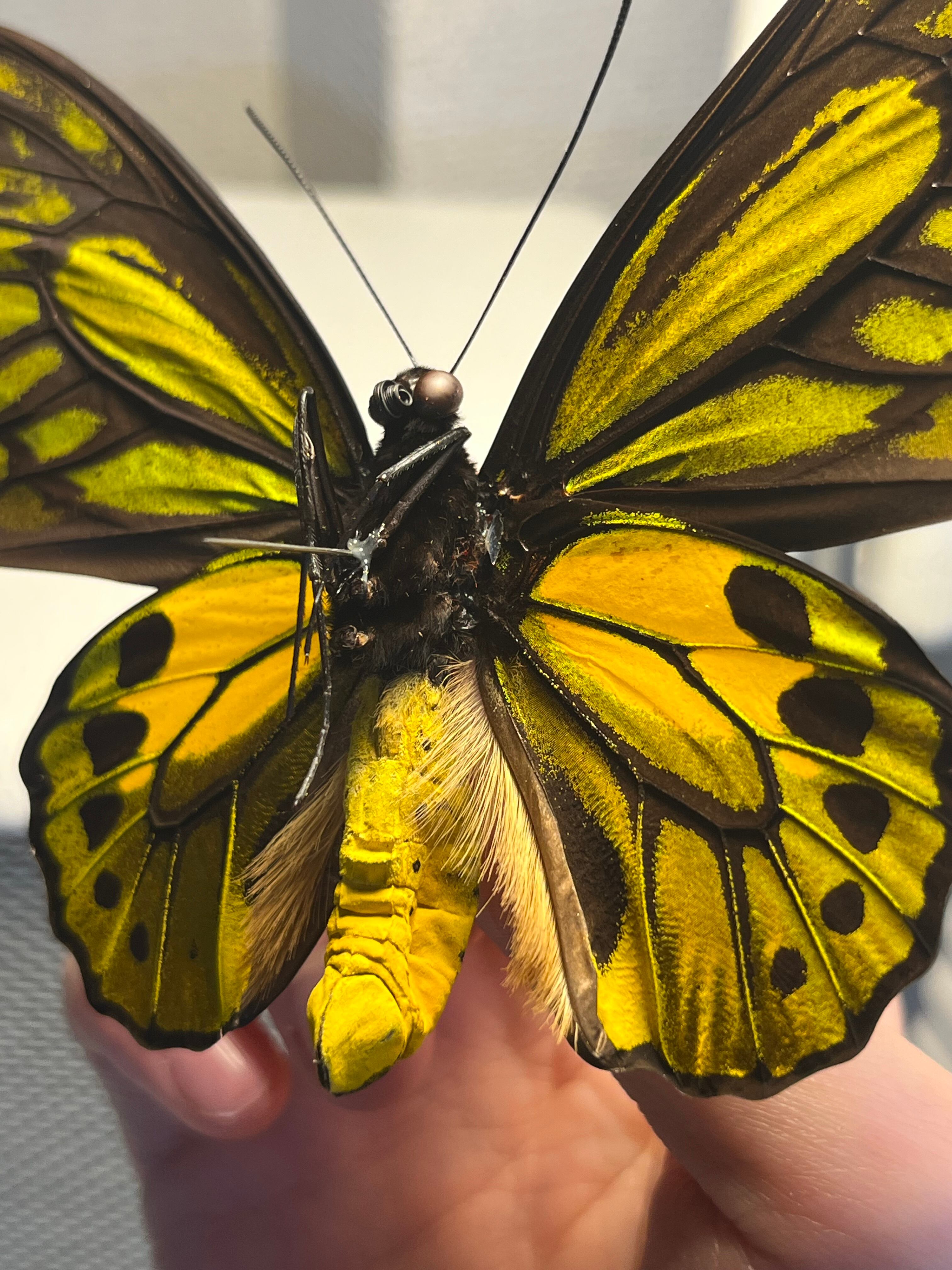 一般名「ウォレス・ゴールデン・バードウィング」の「ウォレス」は、1859年にこの種を記載したアルフレッド・ラッセル・ウォレスに由来しています。ウォレスは著書『マレー諸島』(1869年)の中で、この蝶の捕獲について次のように述べています。「この蝶の美しさと輝きは言葉では言い表せません。ついに捕獲した時の私の強烈な興奮は、博物学者以外には理解できないでしょう。網から取り出し、見事な羽根を広げた瞬間、心臓が激しく鼓動し、頭に血が上り、死の恐怖に襲われた時よりもずっと気を失いそうになりました。その日の残りは頭痛に悩まされました。ほとんどの人にとっては取るに足らない原因に思える出来事によって、この興奮はあまりにも強烈だったからです。」