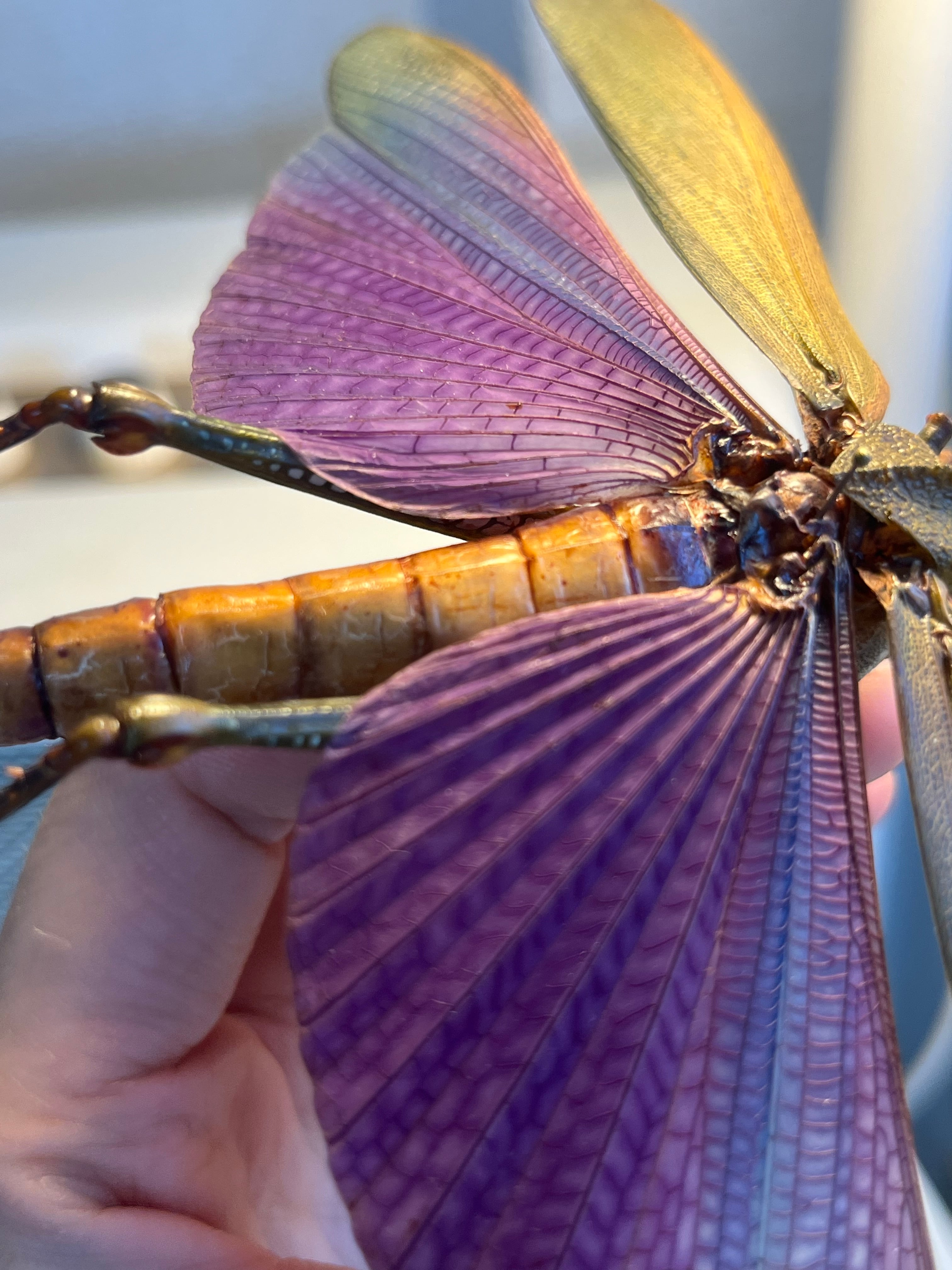 成鳥のオスの体長は通常6.5~8cm、メスの体長は9.5~11cmです。雌雄ともに主に濃い緑色で、羽の大部分は均一に紫色です。これは飛行中に目立ち、羽全体に赤、オレンジがかった赤、またはピンク色の他のすべてのTitanacris種と区別する特徴です。