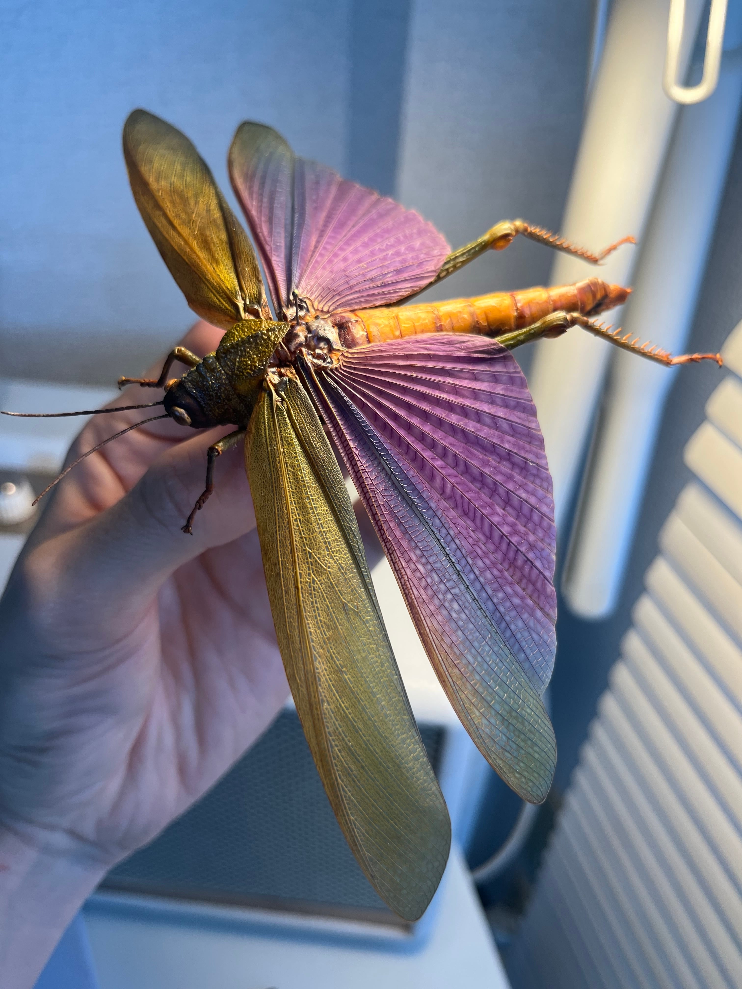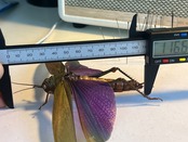 Titanacris albipes(紫色の羽を持つバッタ)は、バッタ科に属する南米の大型バッタの一種です。この種はアマゾンの熱帯雨林の樹冠に生息し、ギャラリーフォレストのセラード地域にも広がっています。夜間に人工光に引き寄せられることがよくあります。