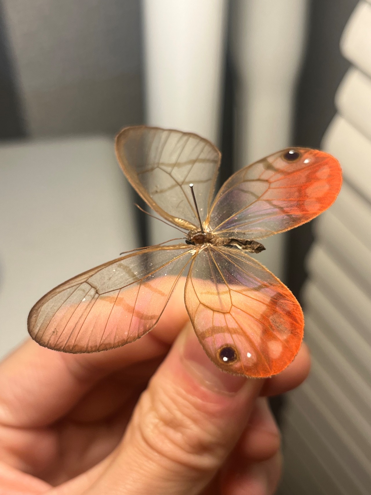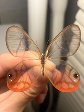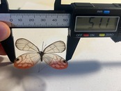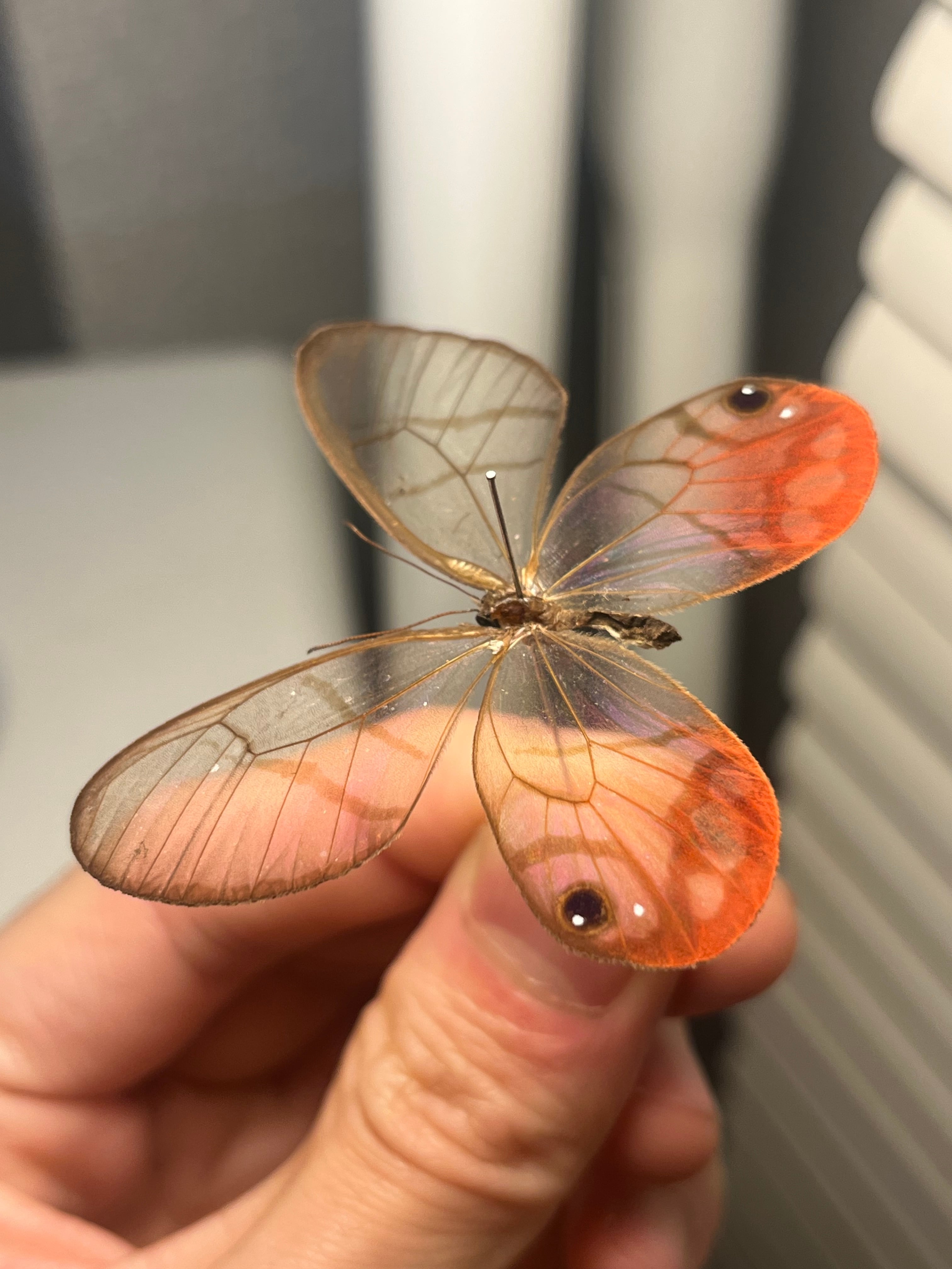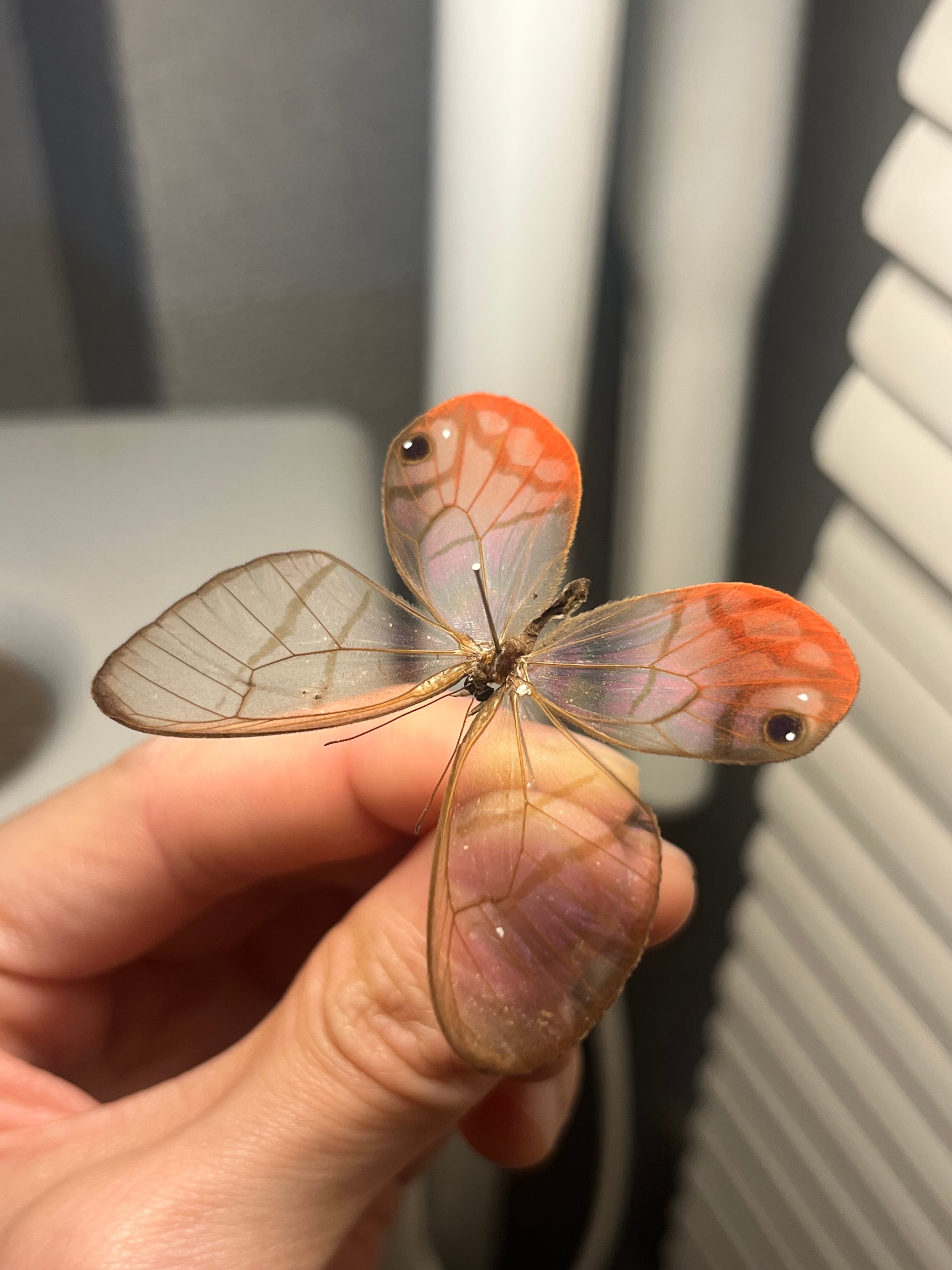 透明とピンクの美しい色合いを持つ蜻蛉のシュバネカワトンボに似た印象のチョウです。