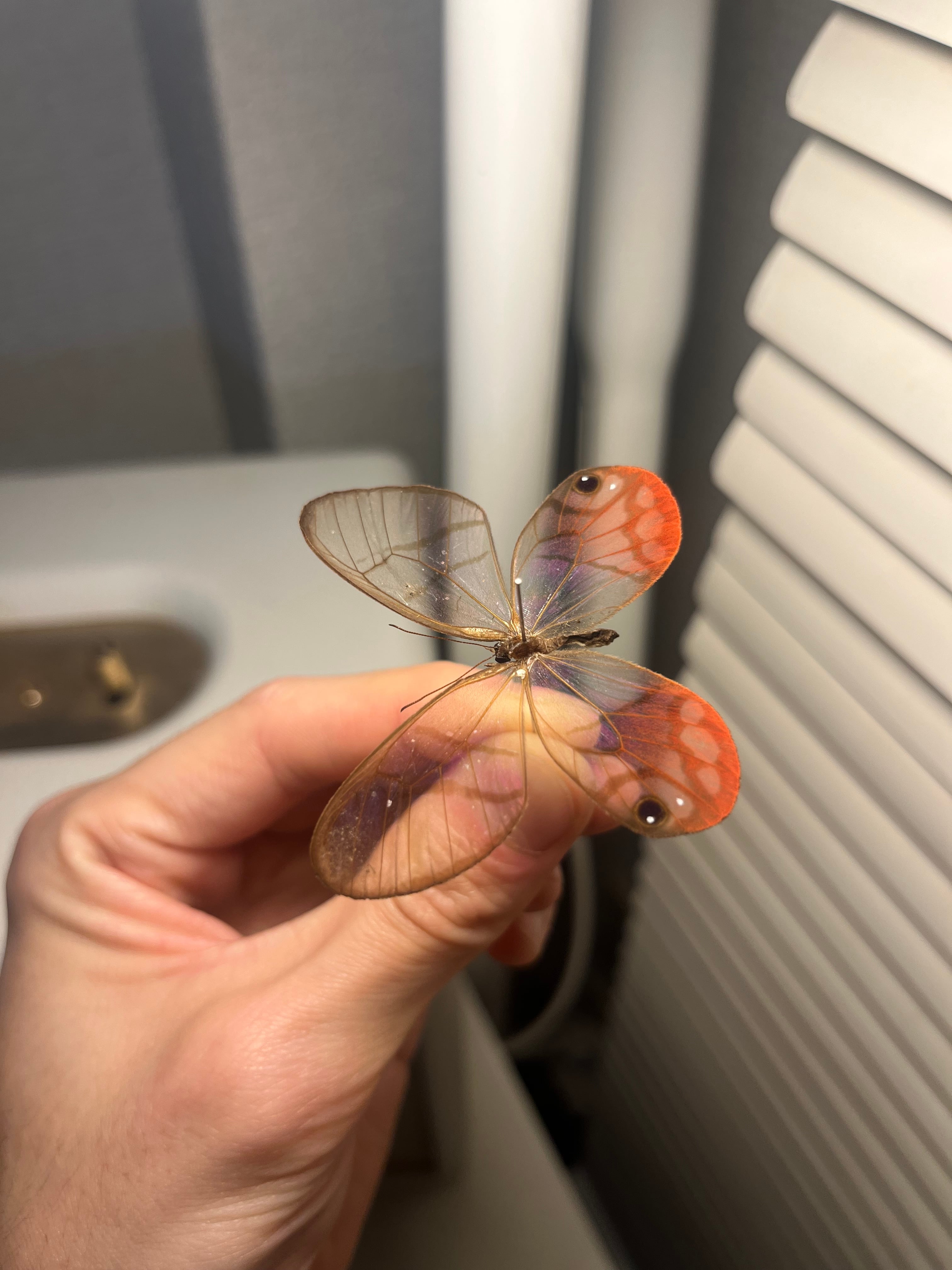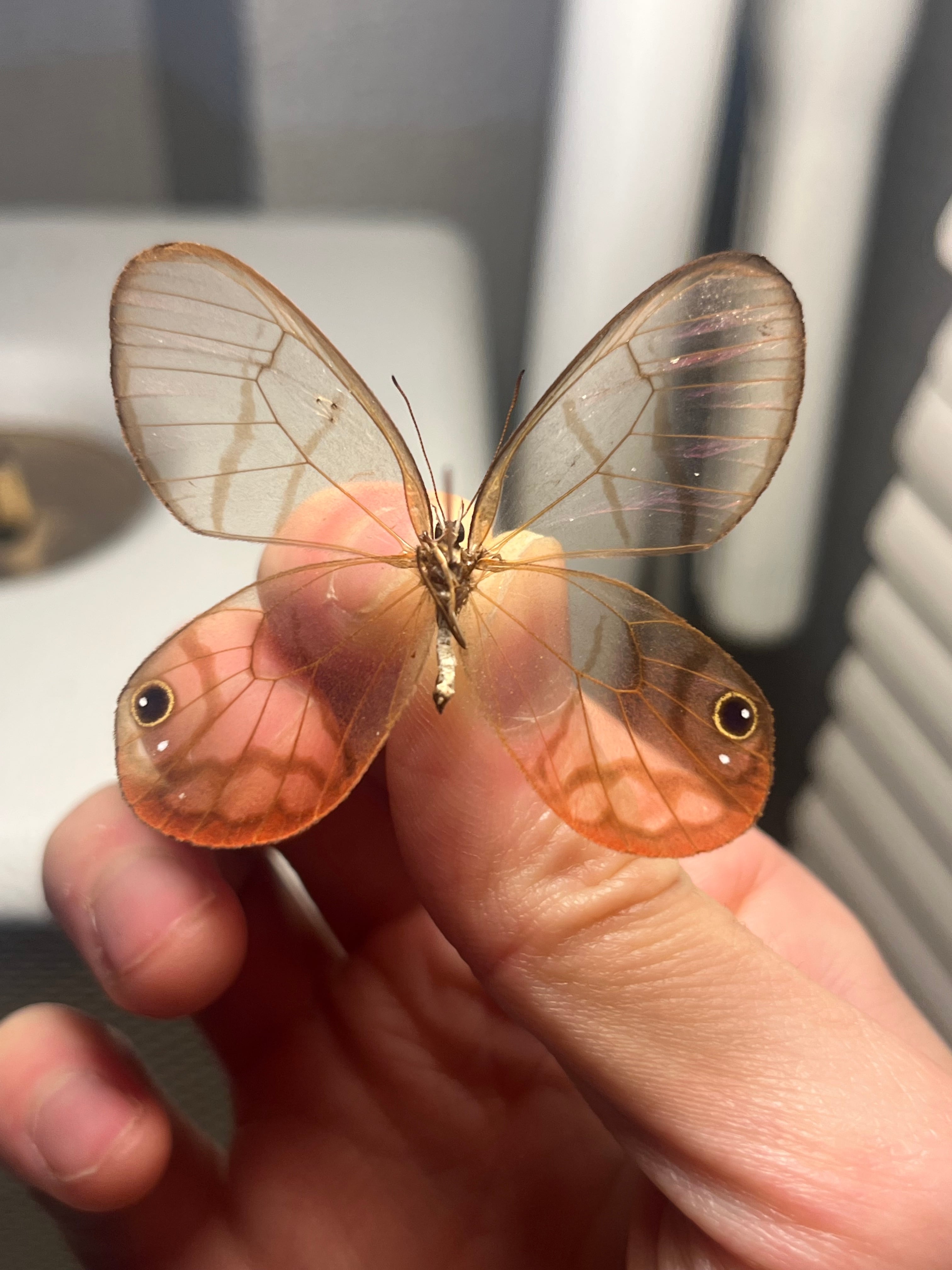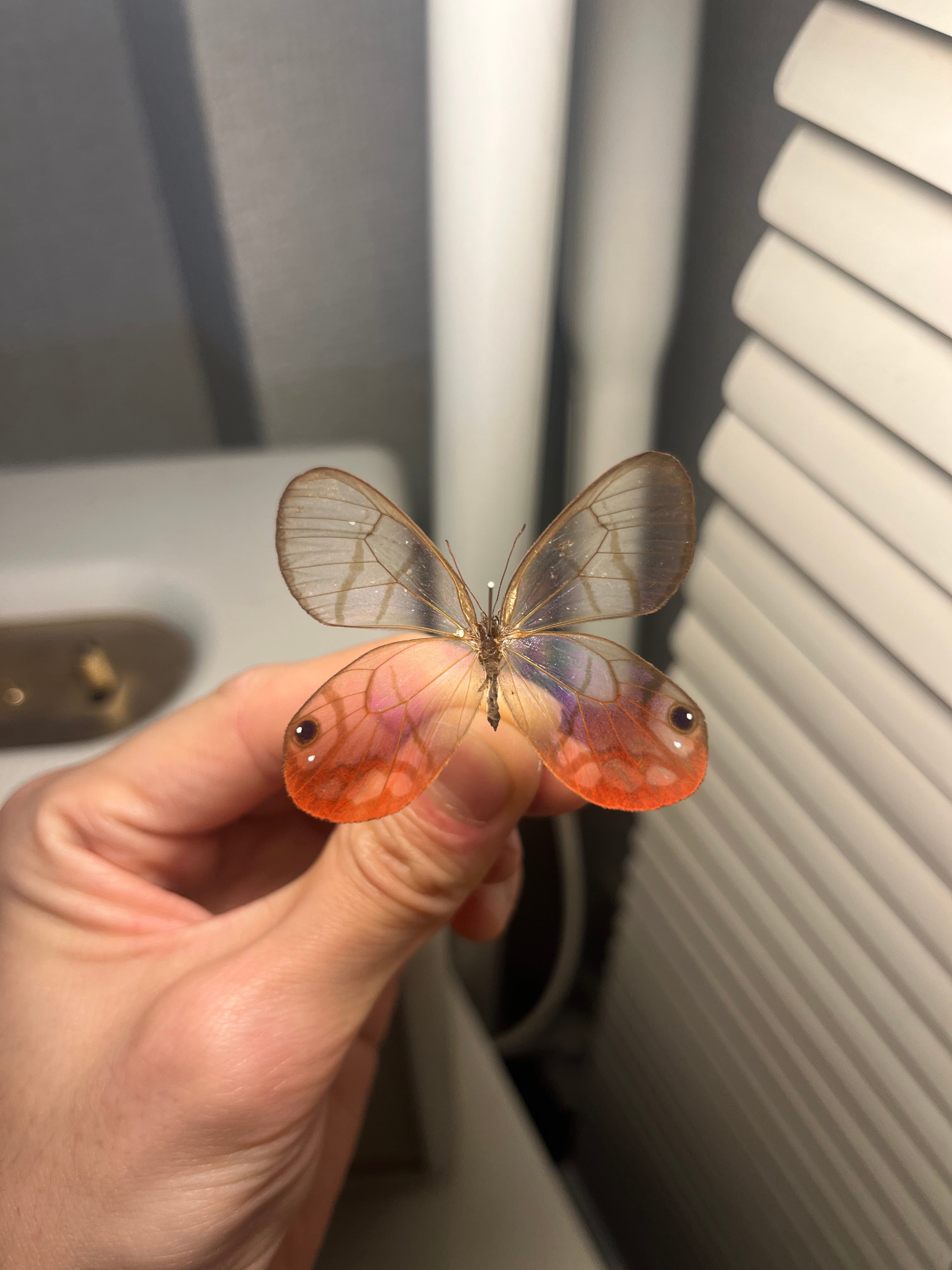 透明とピンクの美しい色合いを持つ蜻蛉のシュバネカワトンボに似た印象のチョウです。