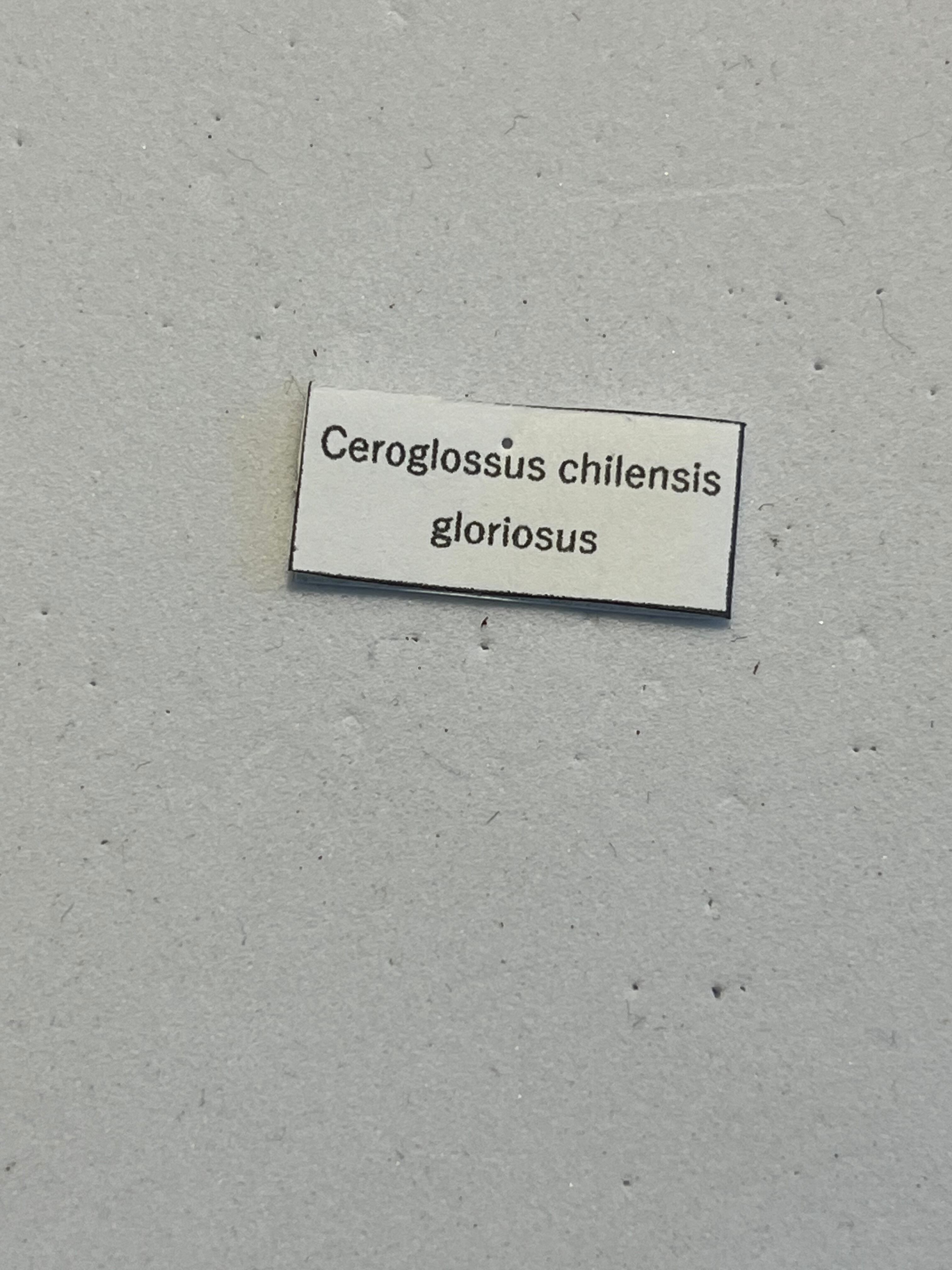 Ceroglossus chilensis は体長約25~32 mmに達します。本種は顕著な性的二形を示し、雄は雌よりも前胸骨が広く、雌は腹部の胸骨が広いのが特徴です。また、本種は染色体多型性も示し、亜種や個体群によって、形状や大きさに顕著な遺伝的変異と形態学的変異が見られます。体色はメタリックグリーン、褐色、赤みがかった色、青みがかった色などです。