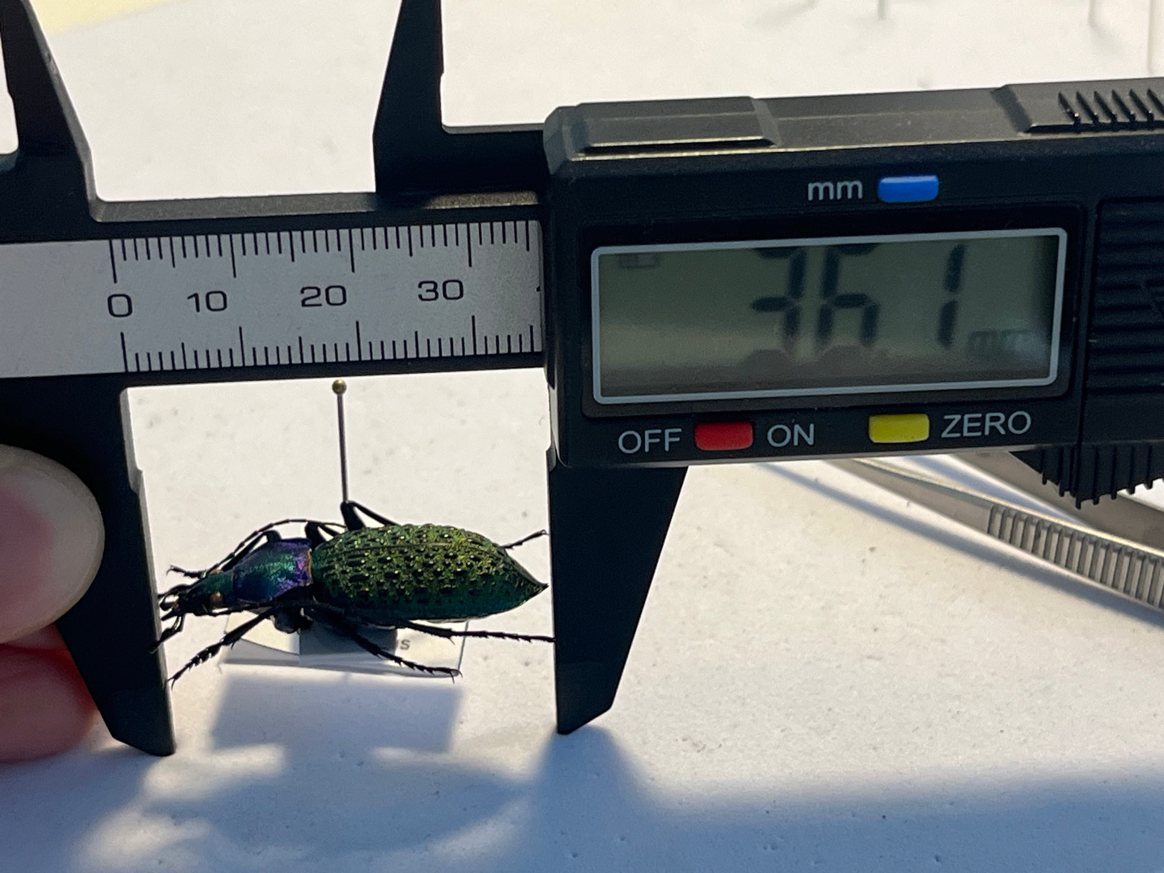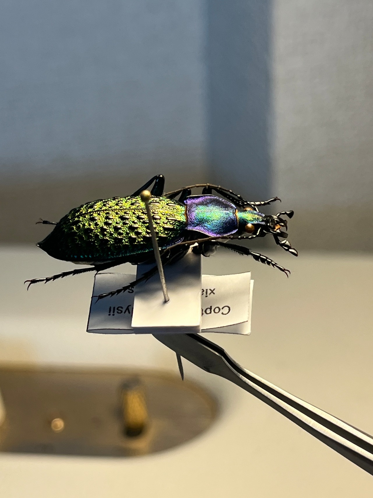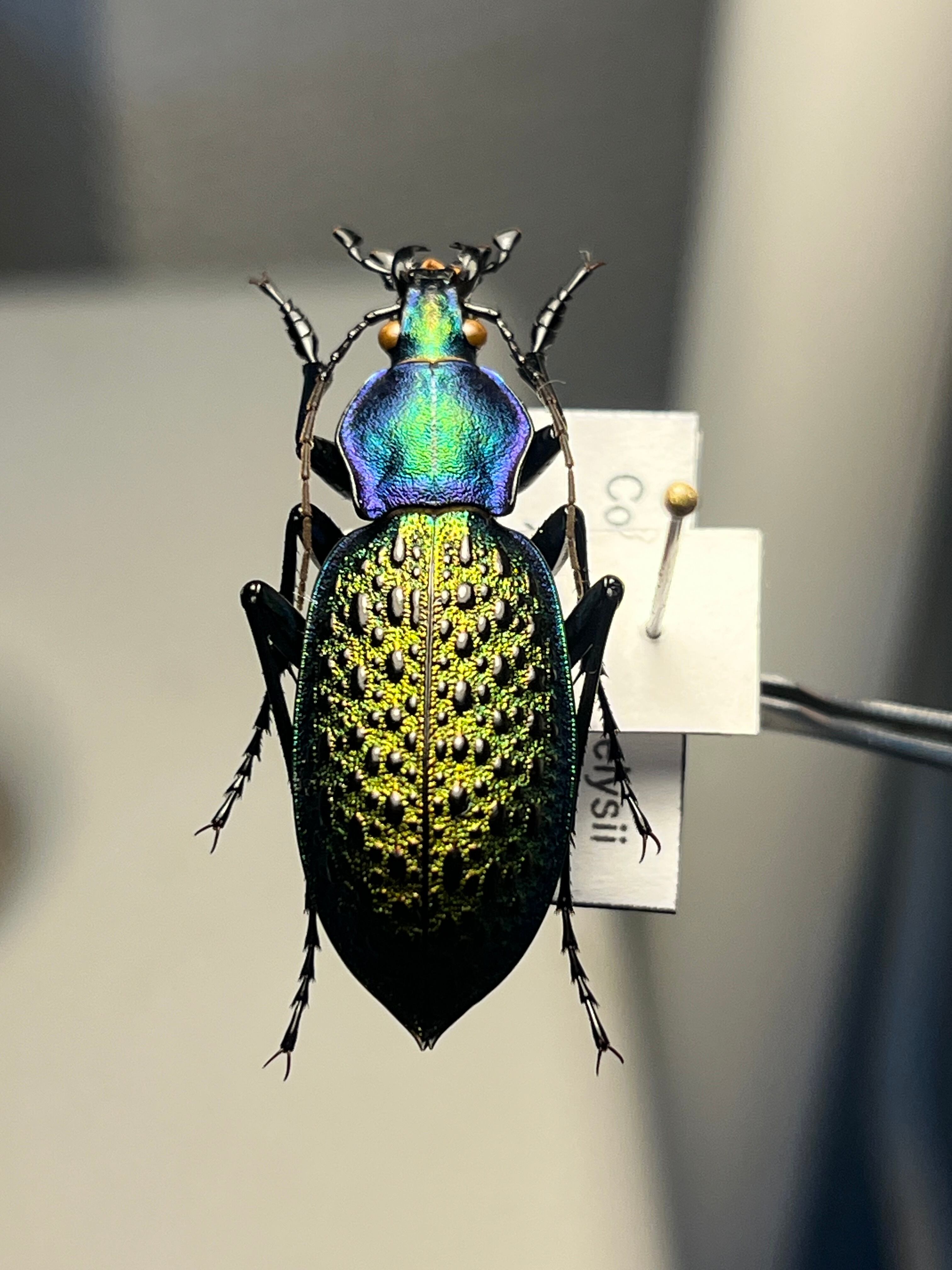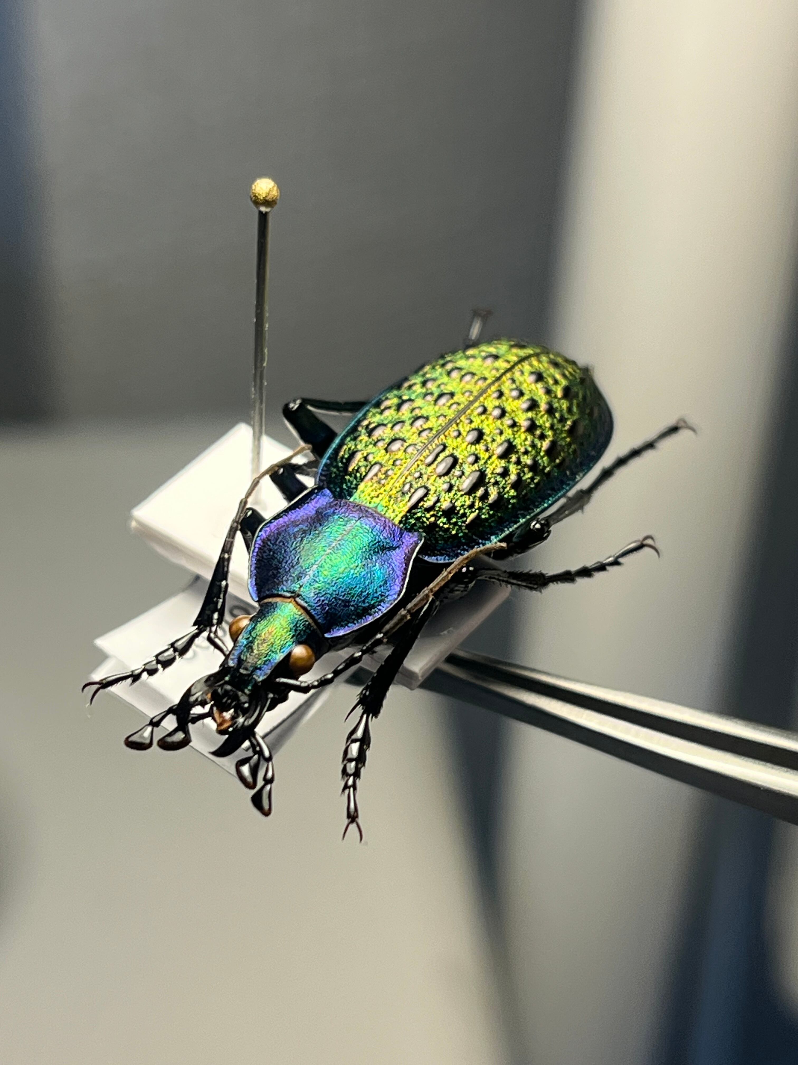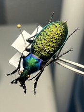 バットマンのジョーカーのような緑×紫の補色関係にある色合いが絶妙なバランスの美麗オサムシです。