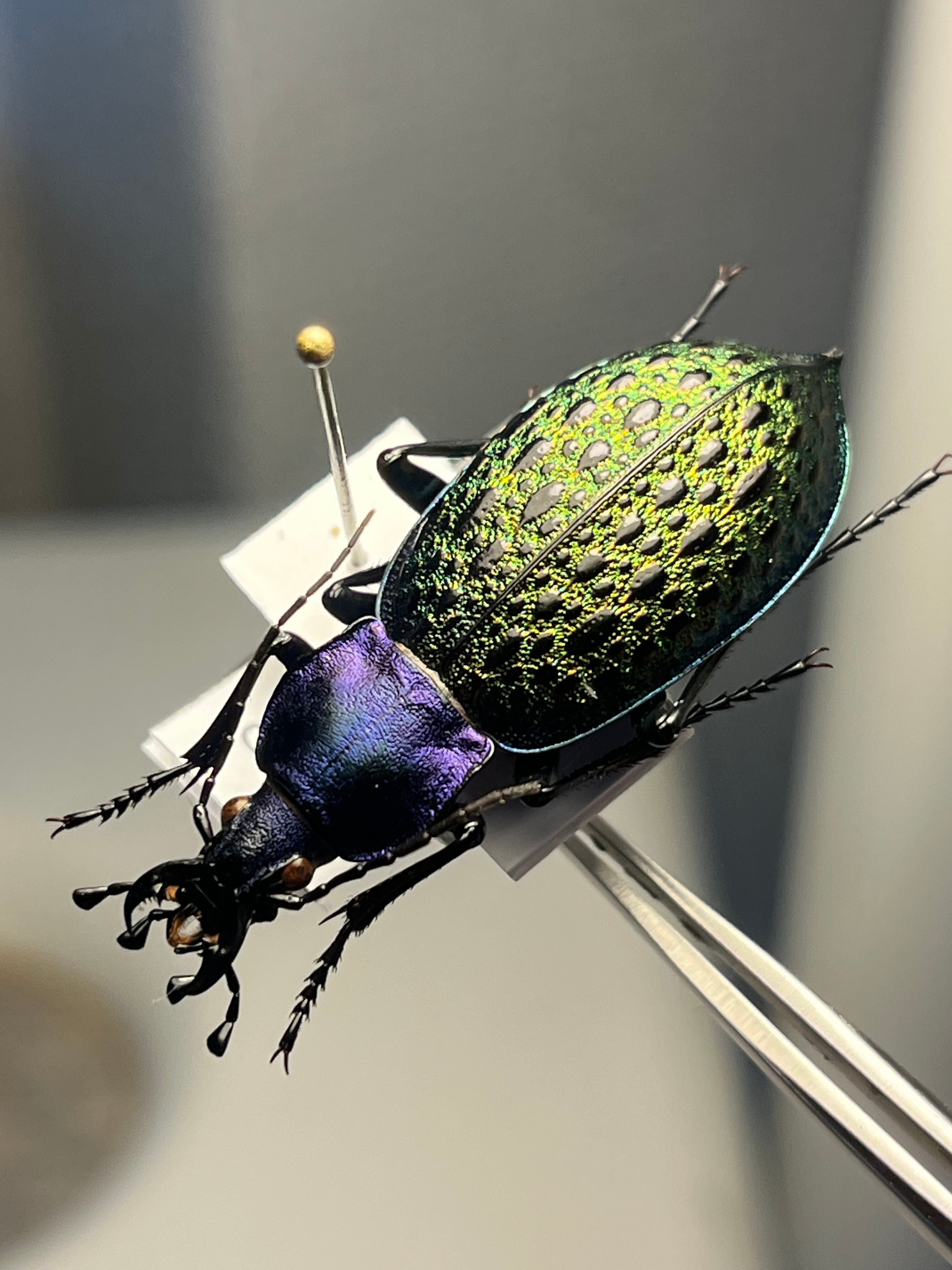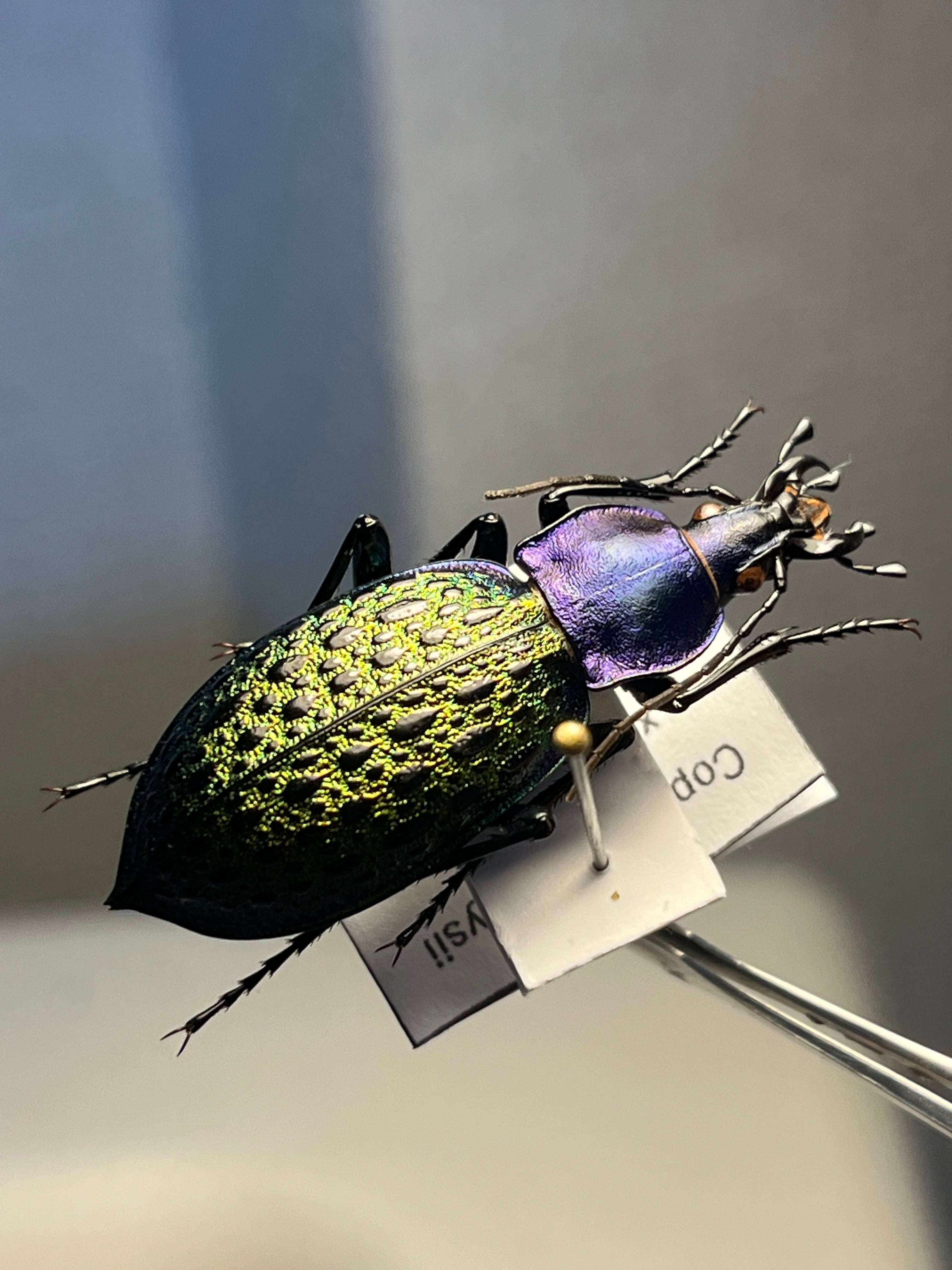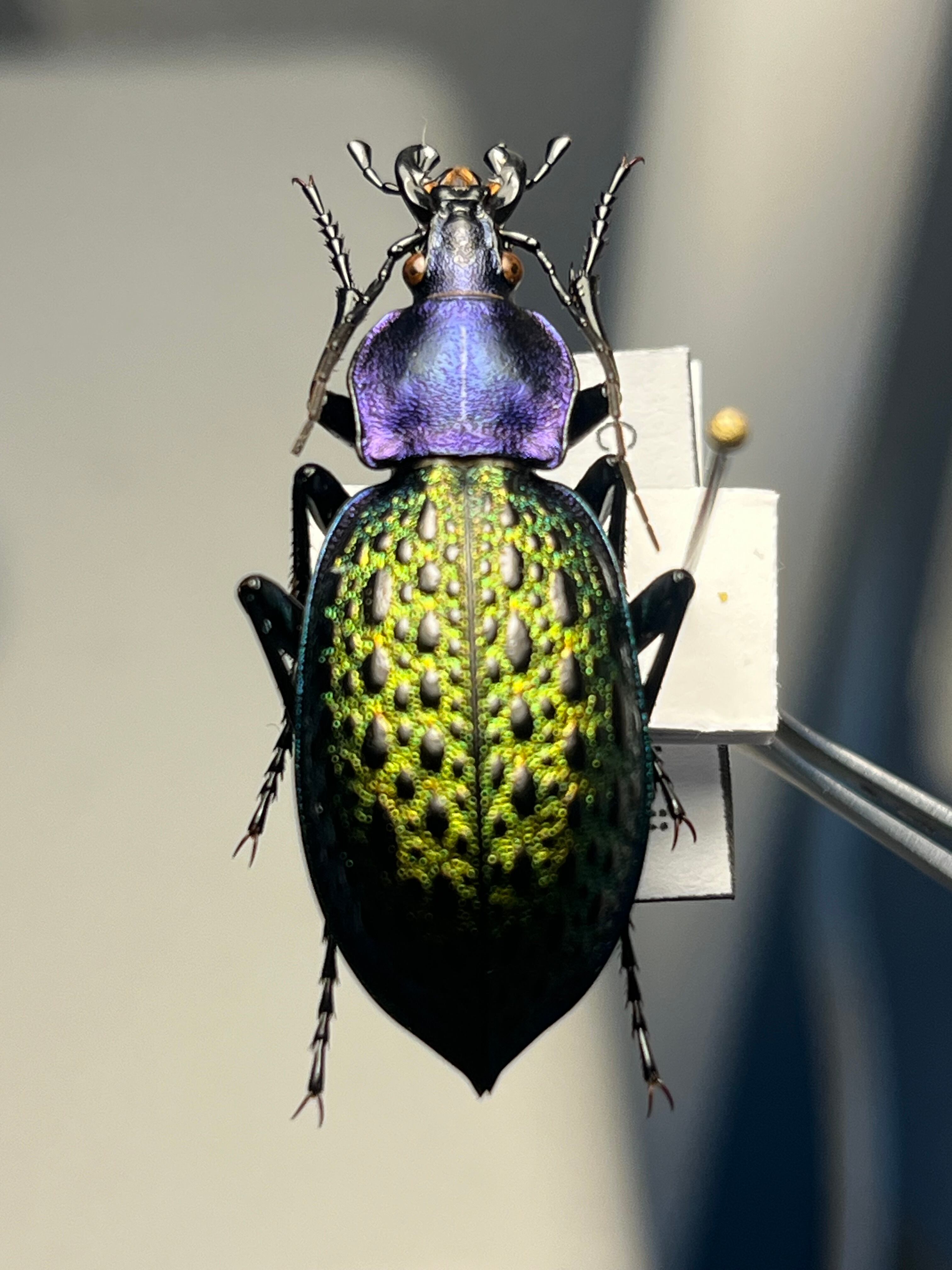 バットマンのジョーカーのような緑×紫の補色関係にある色合いが絶妙なバランスの美麗オサムシです。