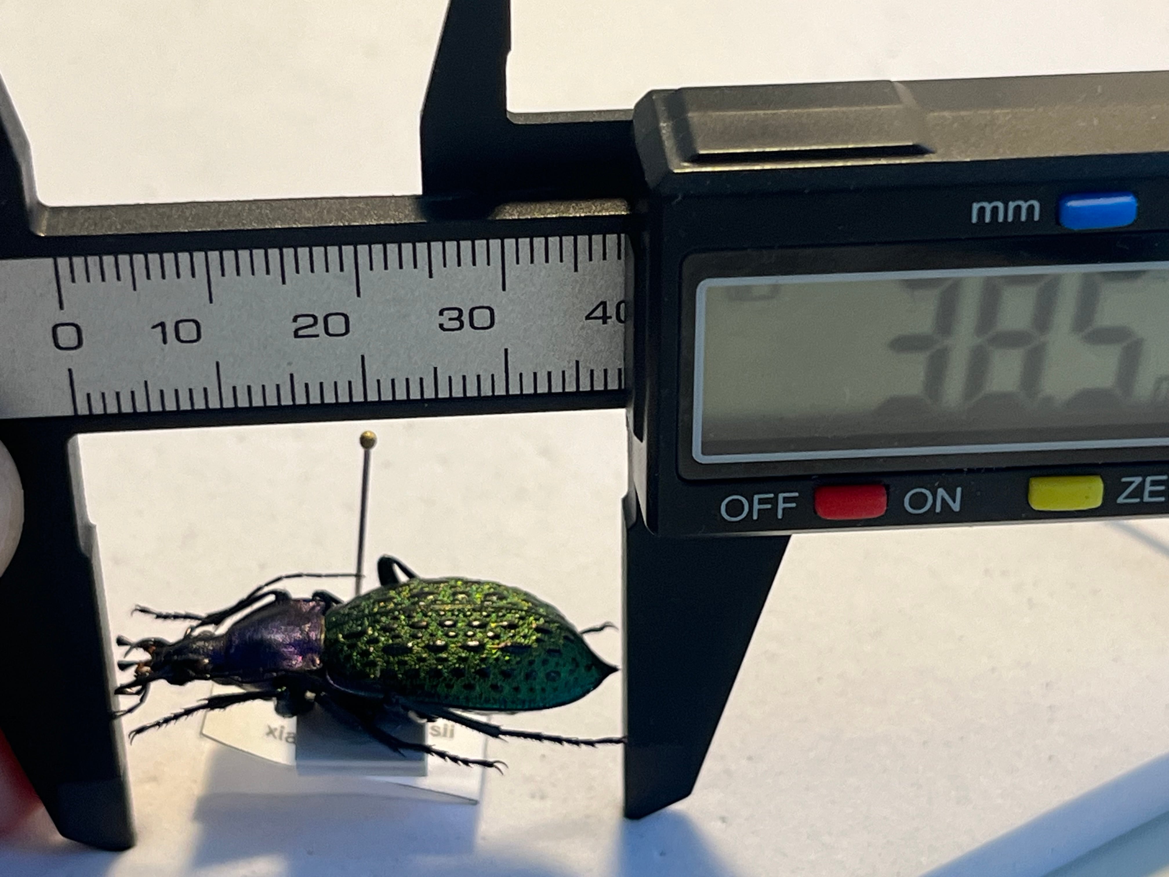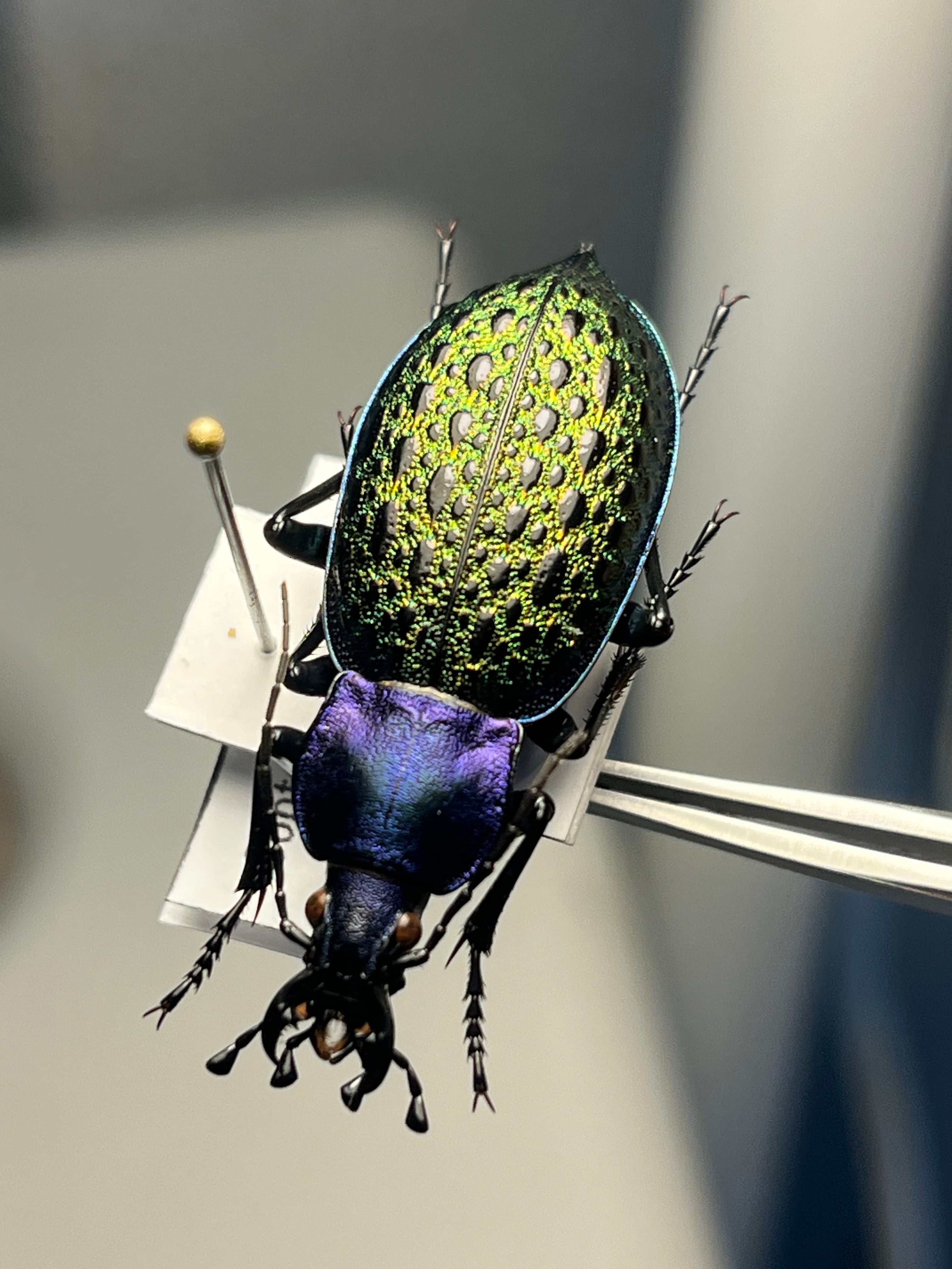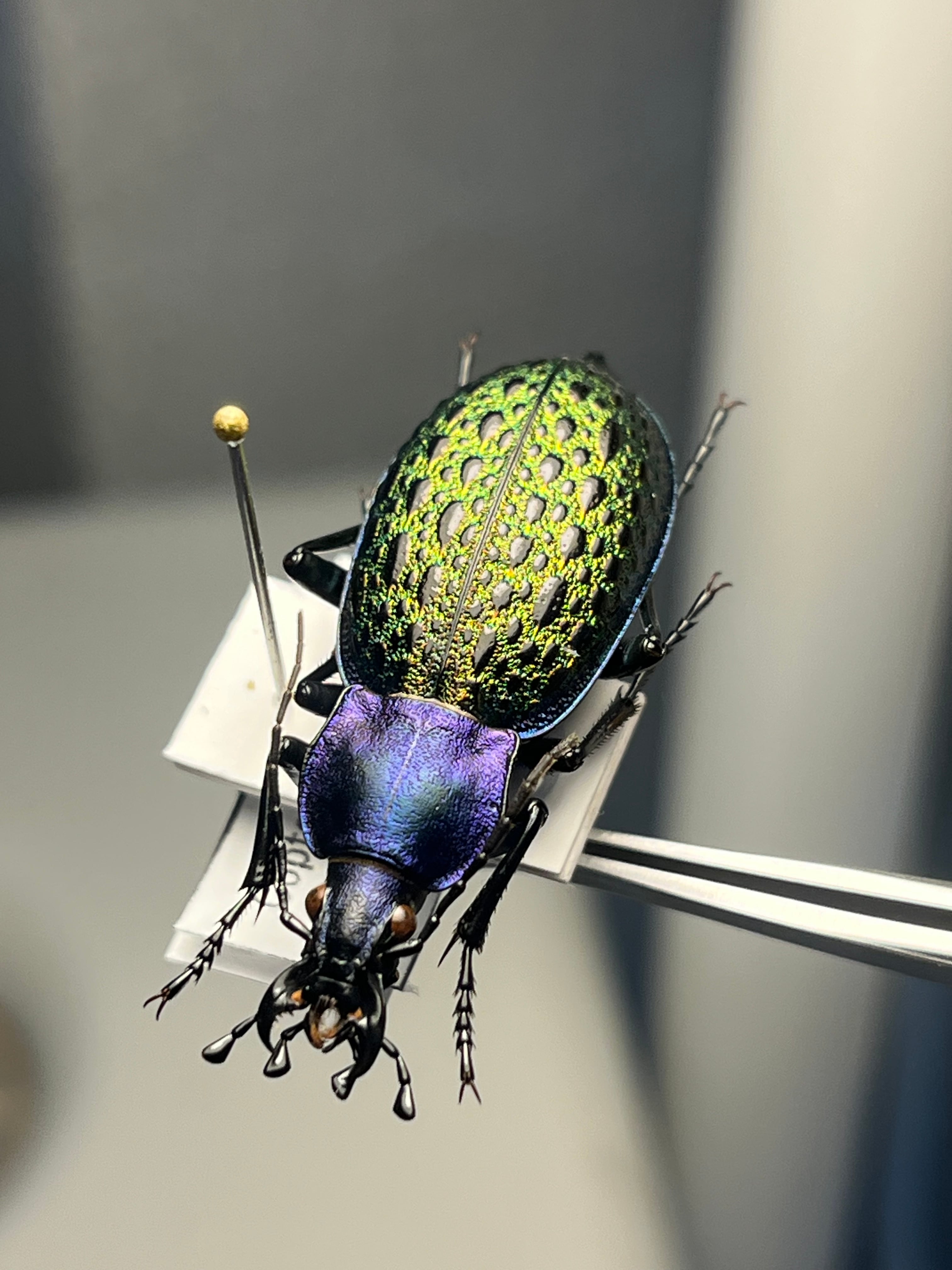 バットマンのジョーカーのような緑×紫の補色関係にある色合いが絶妙なバランスの美麗オサムシです。
