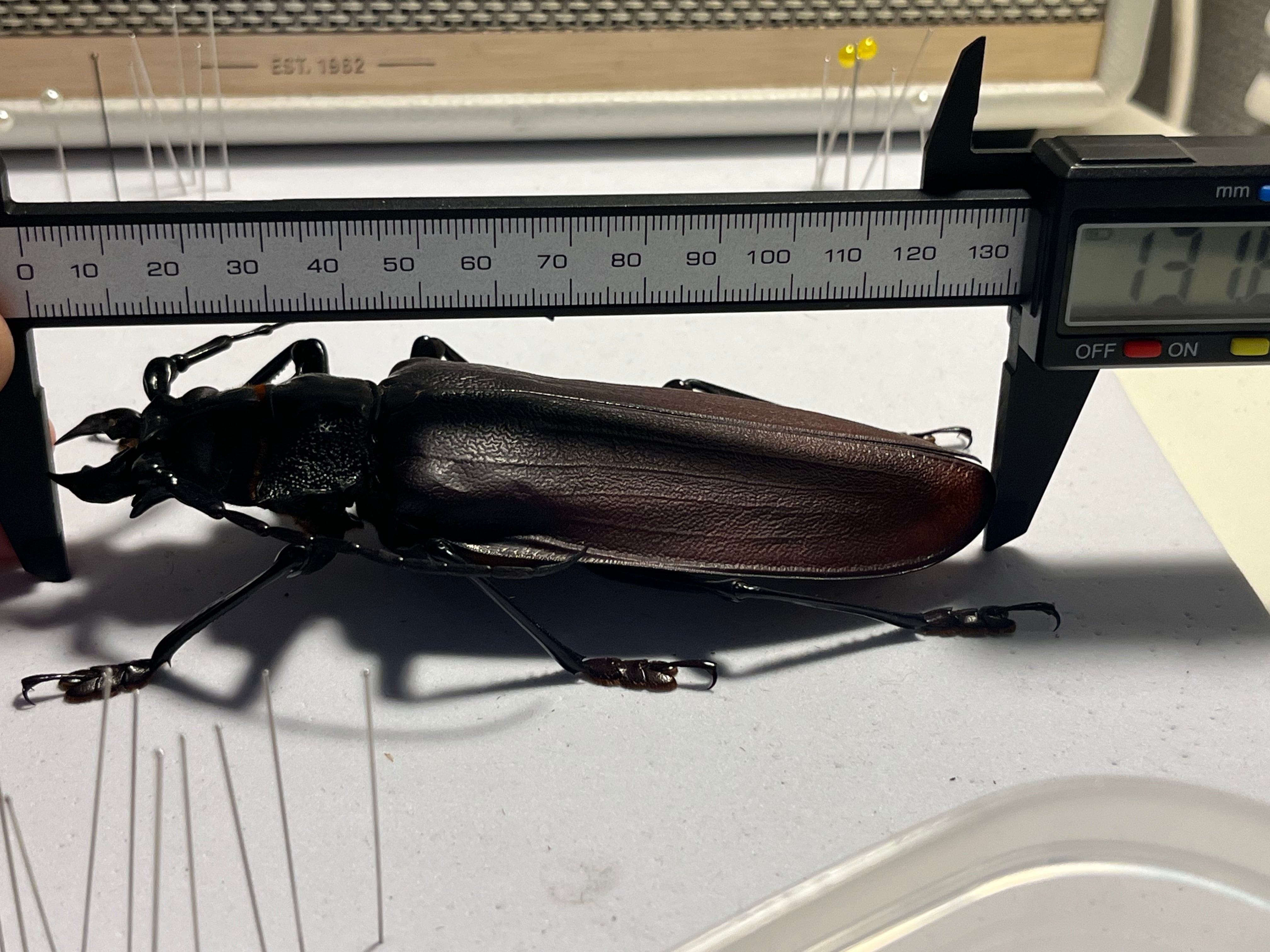 私が計測したところ131mmでした。針刺ししていない極美個体だと思います。