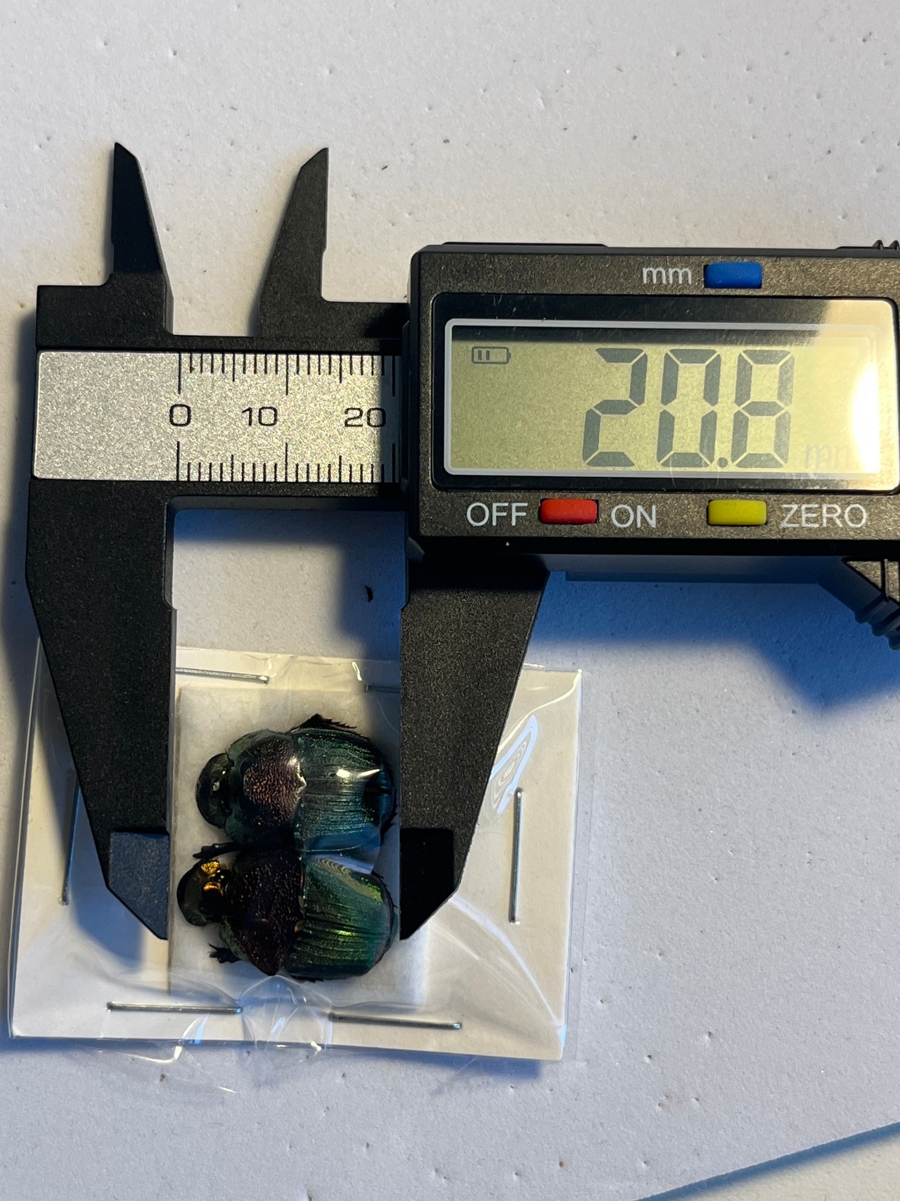 P. vindexの成虫は、体長約11~22ミリメートルの硬い体を持つ甲虫です。比較的ずんぐりとした体躯で、長楕円形をしています。これらの甲虫は性的二形性があり、オスは虹色の鞘翅と頭部の大きな角で識別できますが、メスはやや鮮やかな殻ではなく、角がありません。また、メスの腹部の節の数もオスと異なります。さらに、オスの腹部の先端は鞘翅より上に伸びますが、メスは伸びません。さらに、腹部は雌雄ともに明確な色彩を帯びています。ほとんどのPhanaeus属の種と同様に、オスのレインボースカラベは、大きな角と体を持つメジャーモルフと、角と体が大きく縮小したマイナーモルフのいずれかで観察されます。