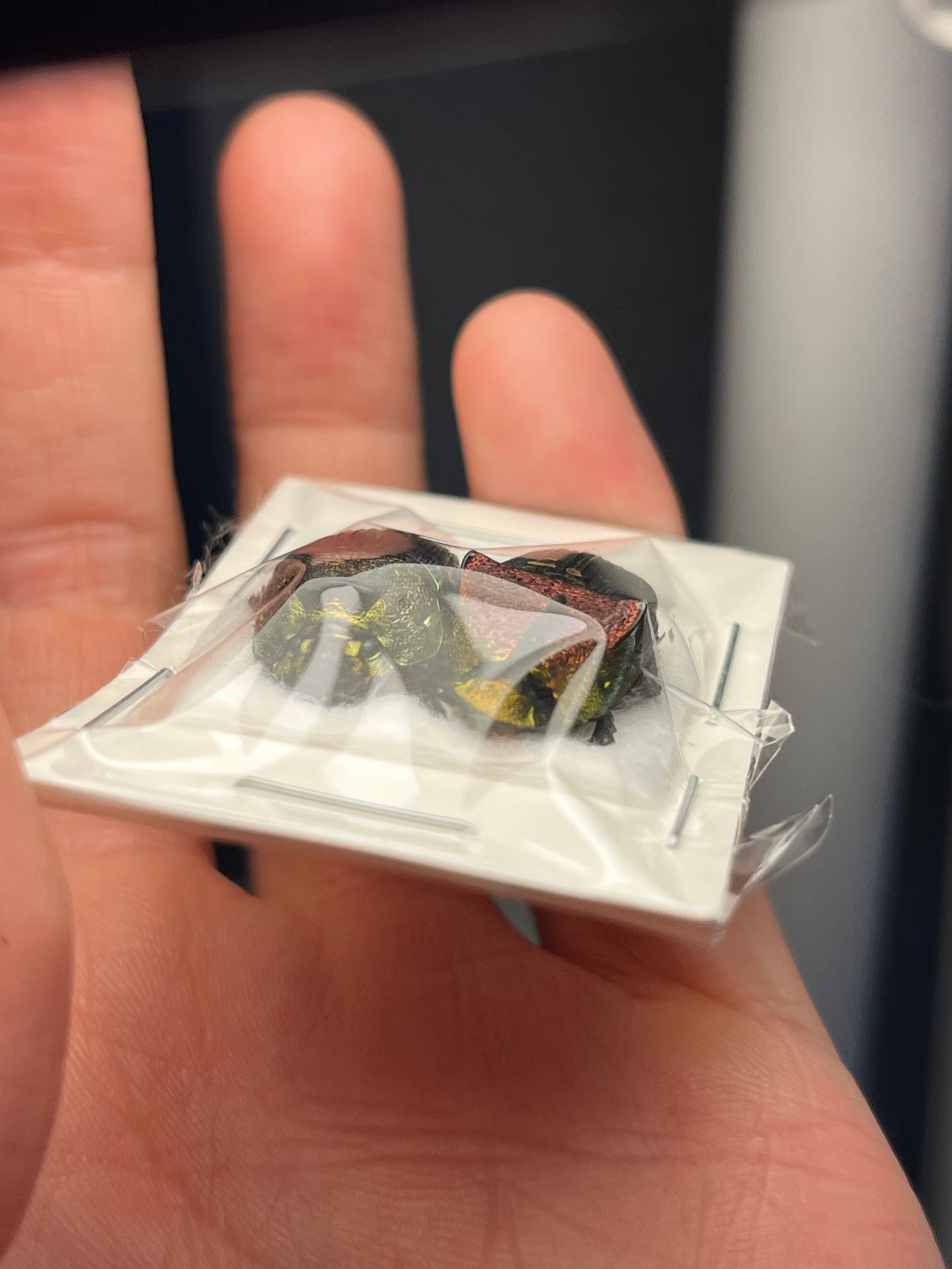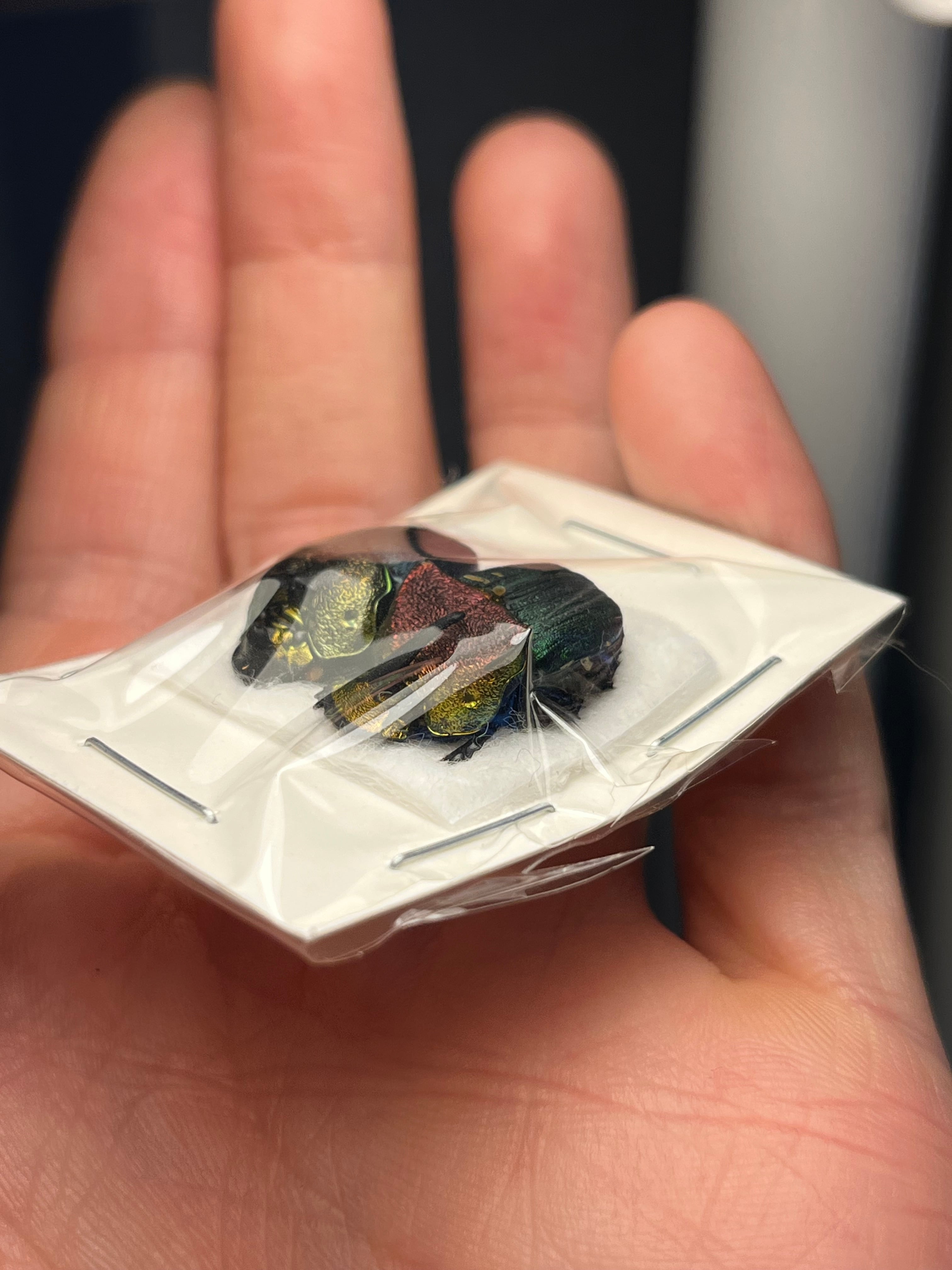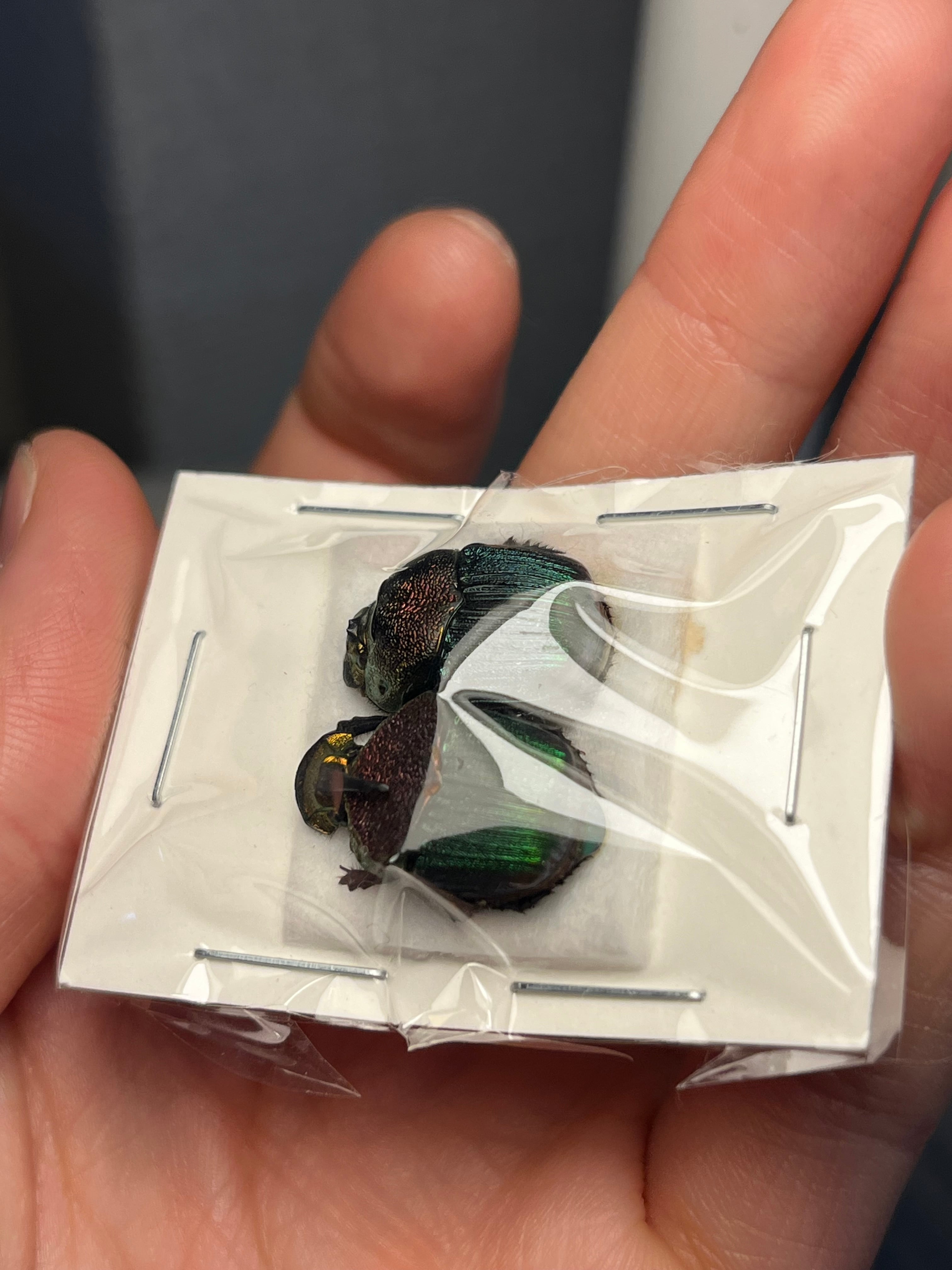 他の甲虫と同様に、P. vindexは幼虫期を経て蛹化し、成虫になります。幼虫と脱皮は親玉内で行われ、成虫になった甲虫は親が飼育していた糞から出てきます。虹色のスカラベがこれらの段階を完了するのにかかる時間は2~6ヶ月で、甲虫全体の寿命は1年未満です。寒冷地域では、成虫は凍結線より下のトンネル網に留まり、気温が上昇すると外に出ます。P. vindex は分布域が広いため、そのほとんどは土壌中で越冬します。