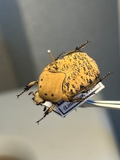 フードのように菱形状に垂れ下がった胸部が和名の由来のハナムグリ。小楯板が隠れてしまうほどのボリューム感ある胸部と短い手足により、独特のずんぐりとしたフォルムとなっている。体はベルベット状の毛に覆われ、多彩な模様が入り、コレクター心をそそられる。