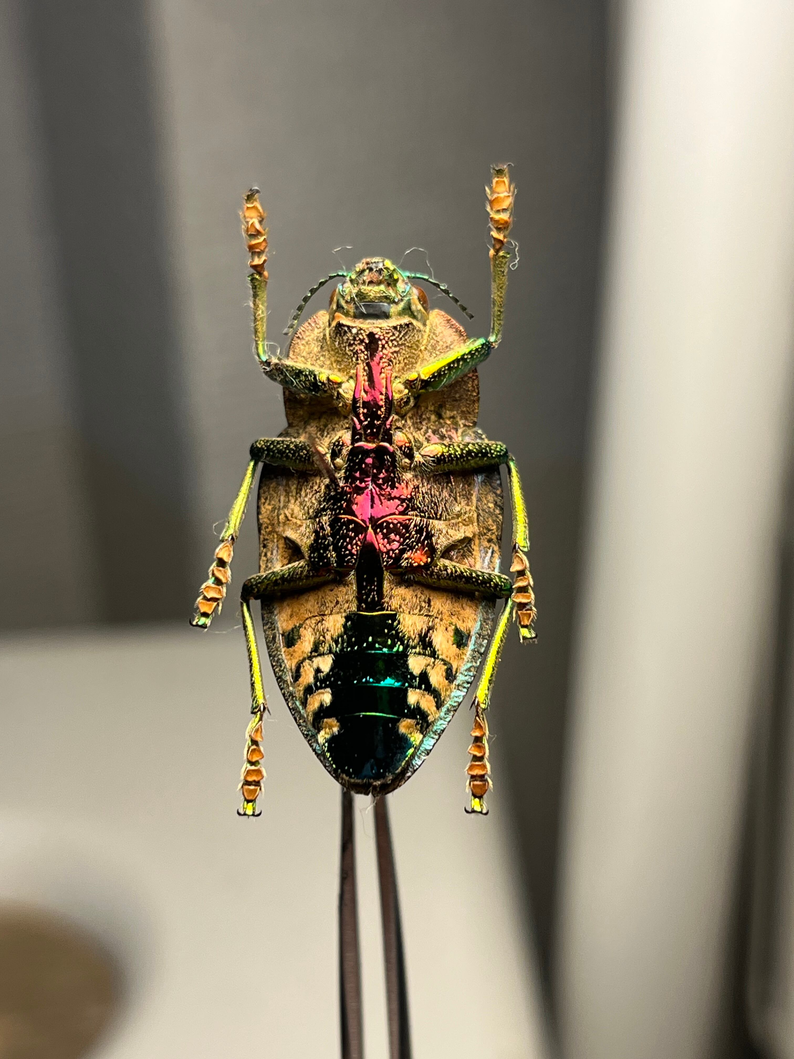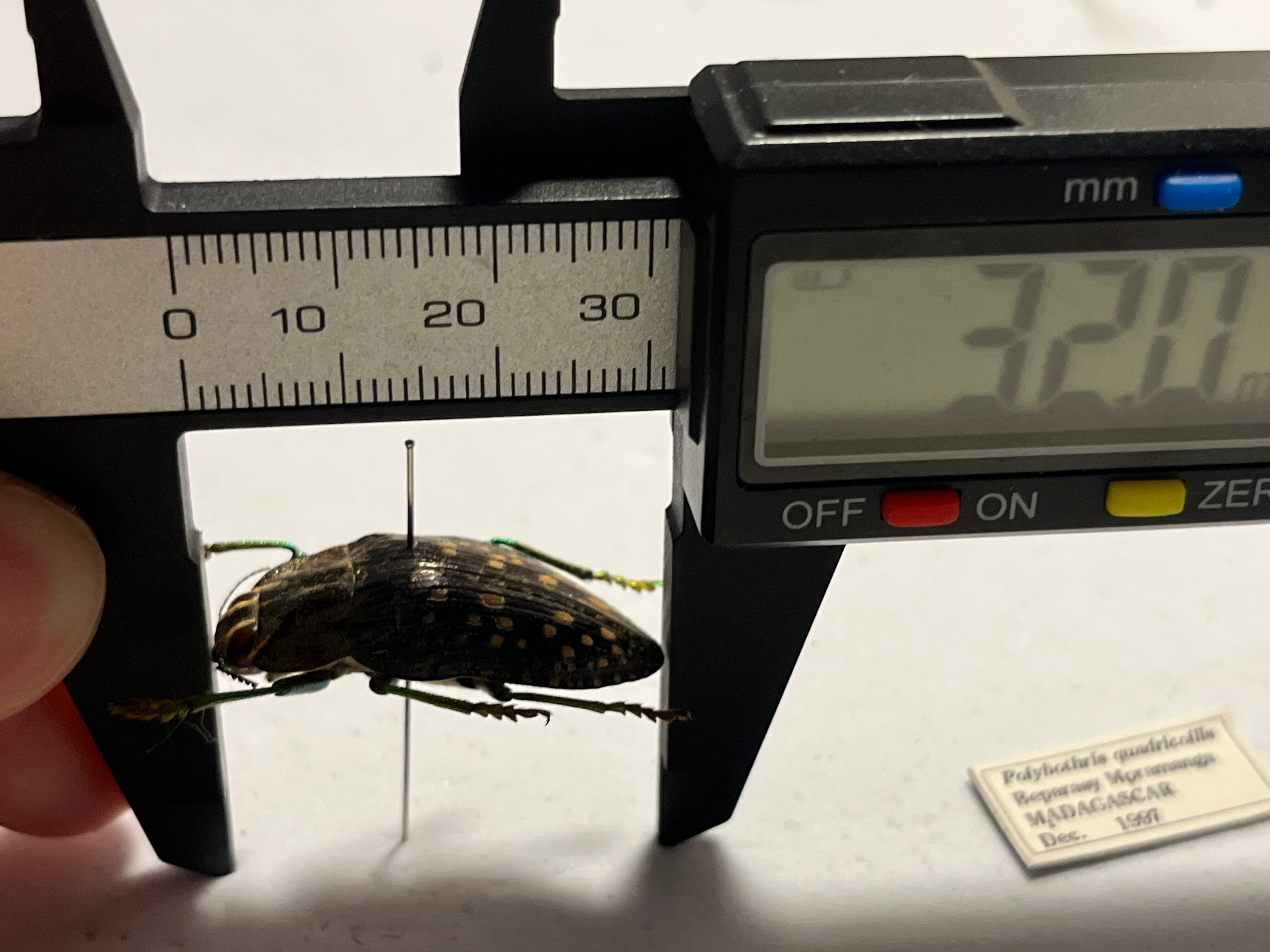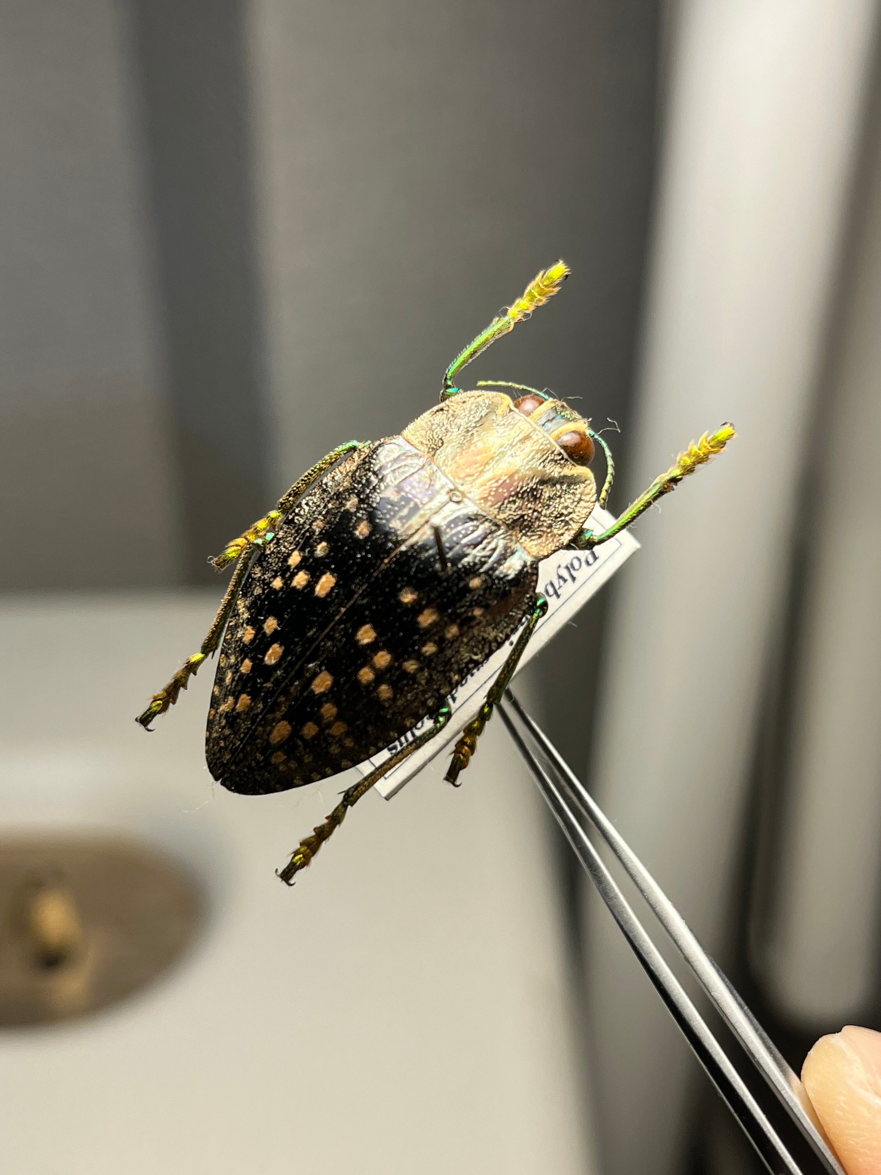 ポリボトリス・クアドリコリス(Polybothris quadricollis)は、体長約37~43ミリメートルに達します。このごく一般的な種は、最も色鮮やかな種の一つです。鞘翅はオリーブグリーンの粒状で、体の下面は非常に鮮やかな金属的な虹色を呈します。下面の色は、この属内の異なる種の間で雌雄判別を行う上で重要なようです。