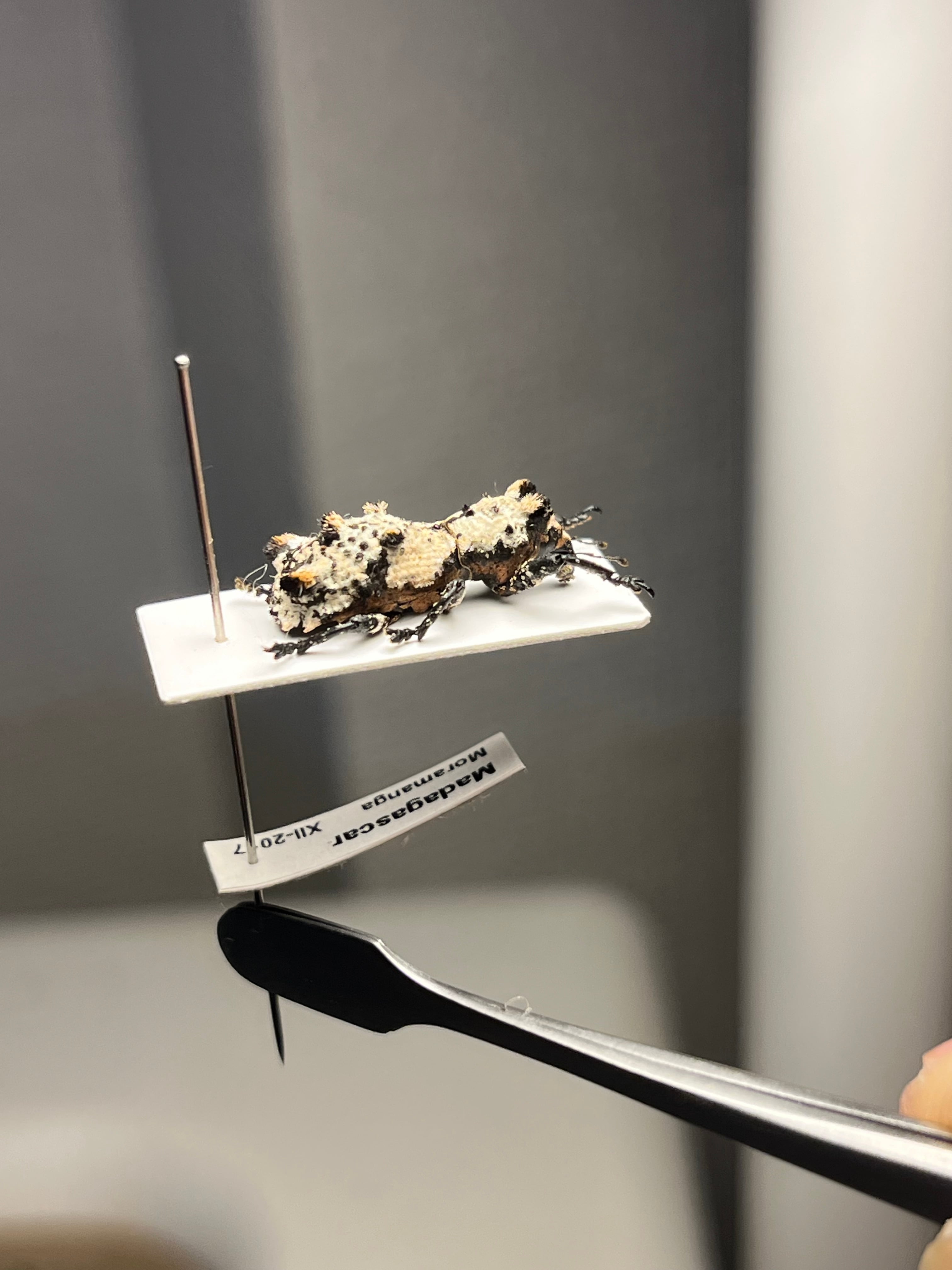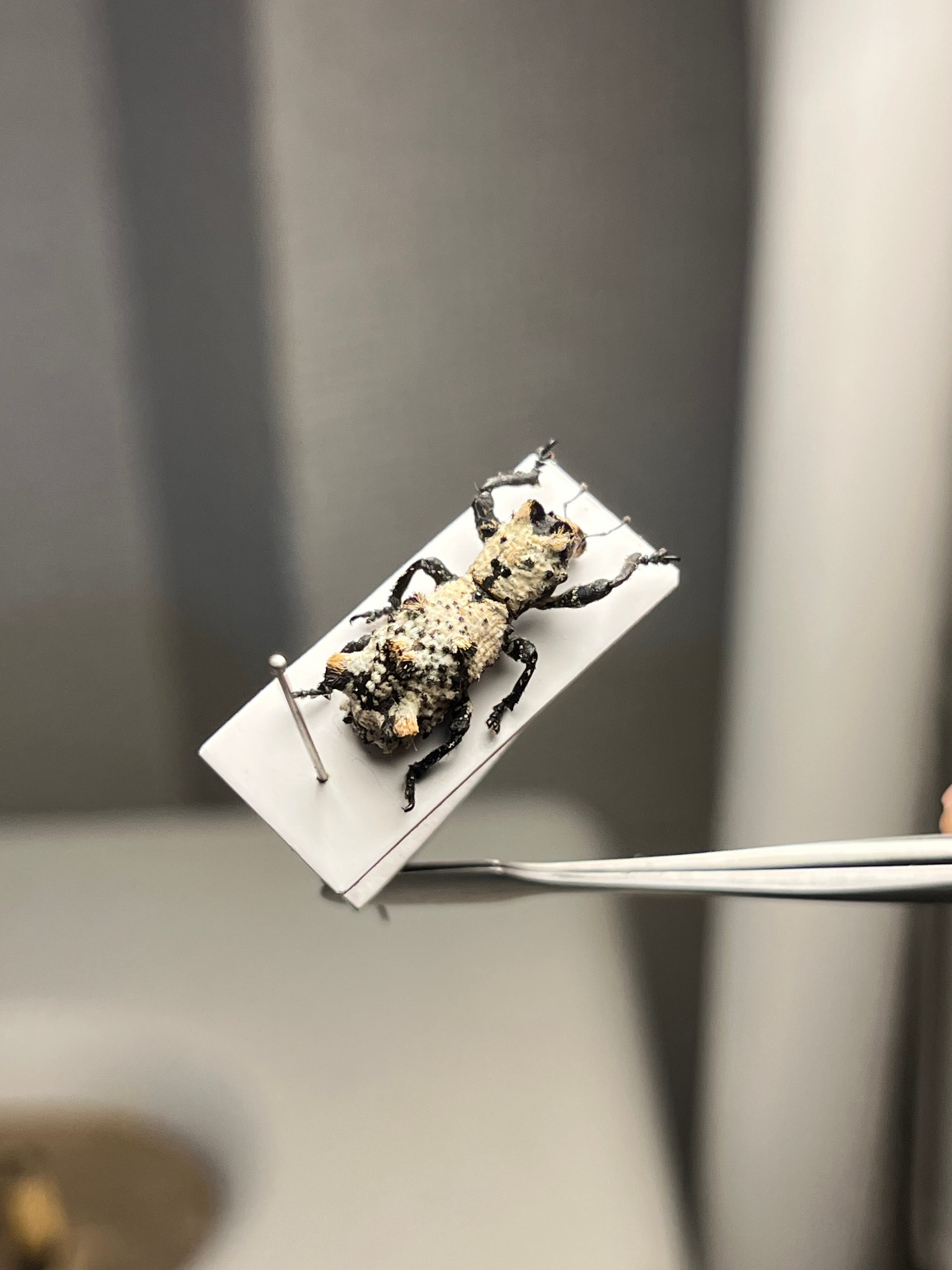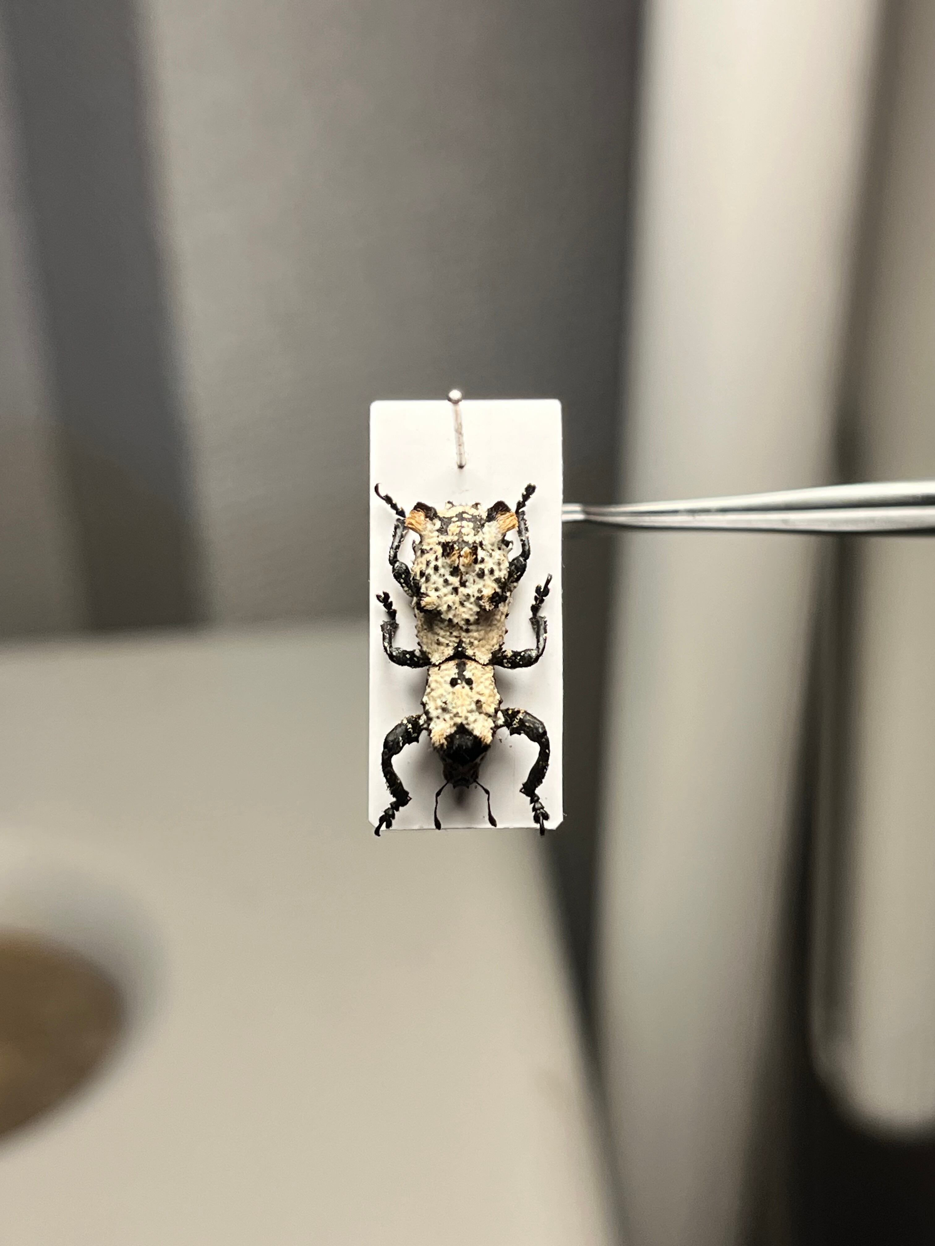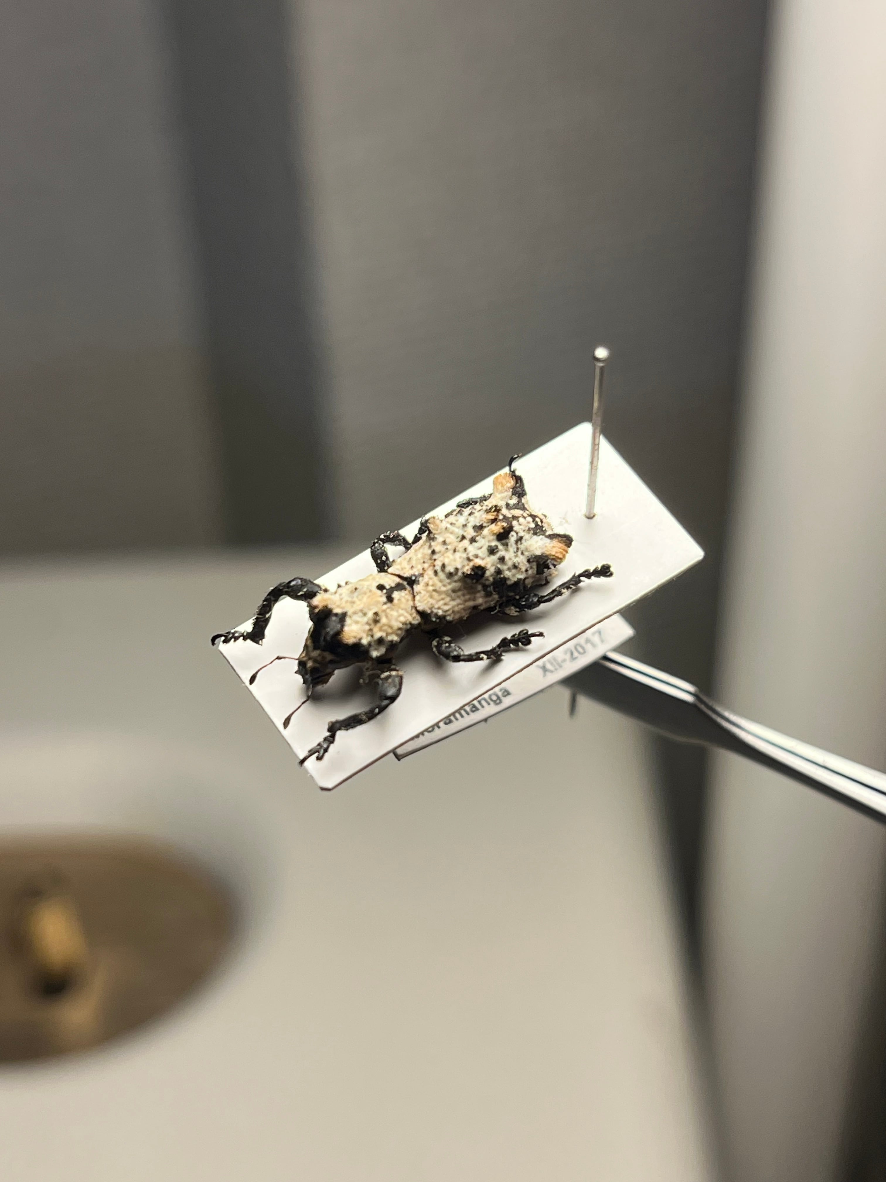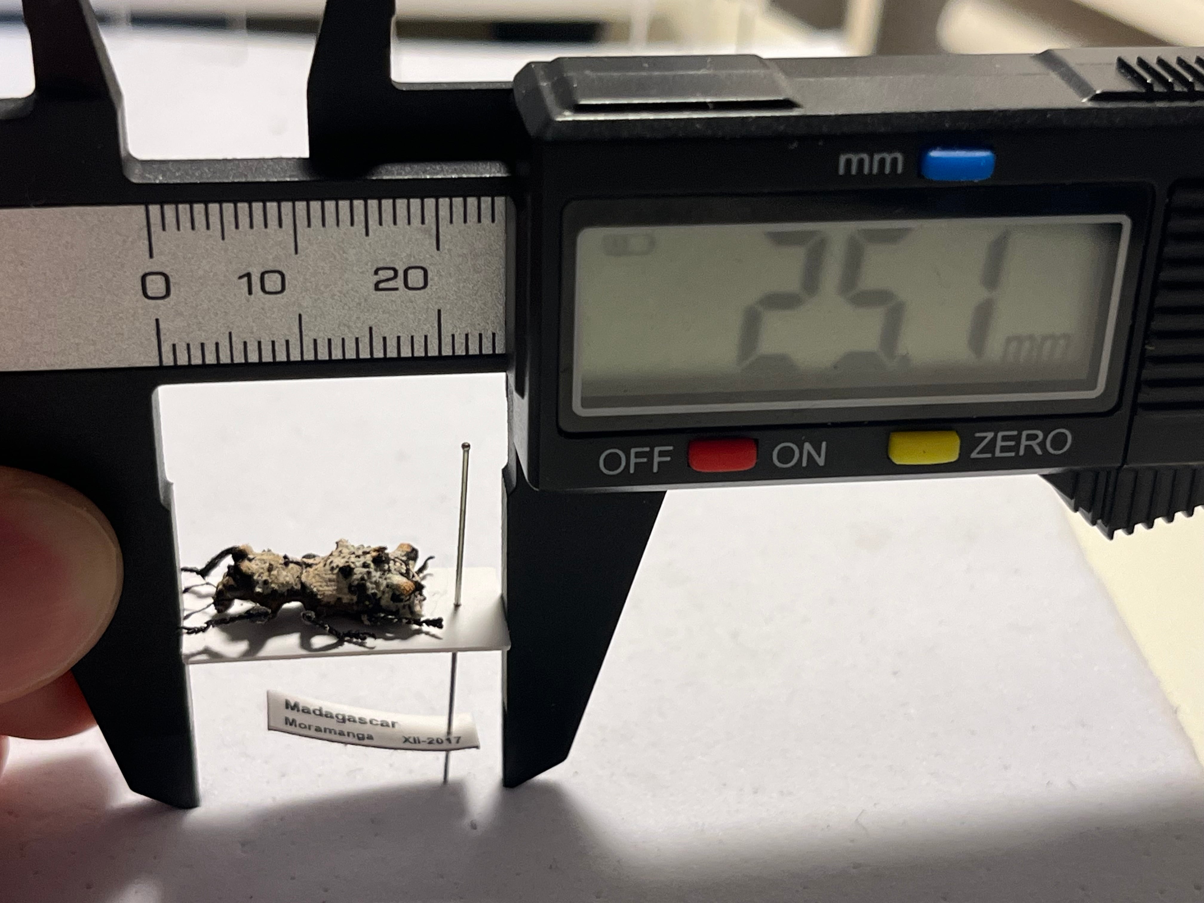マダガスカル産の全身が鱗片状の毛で覆われているゾウムシ。地衣類に擬態しているのではないかと思われる。本種のように、クチブトゾウムシの仲間は口物が短く、シルエットが異なる。
