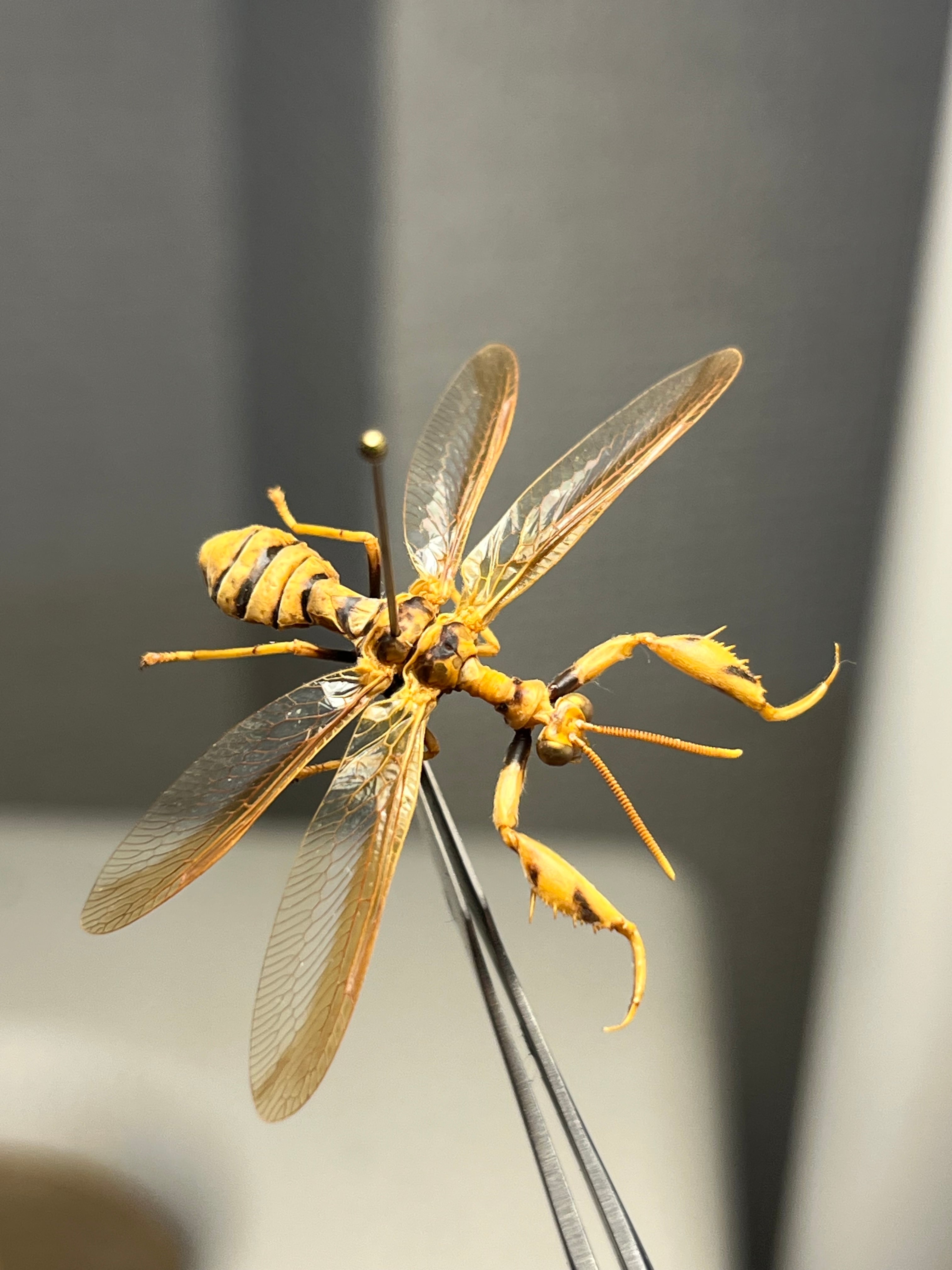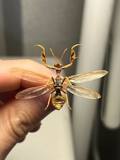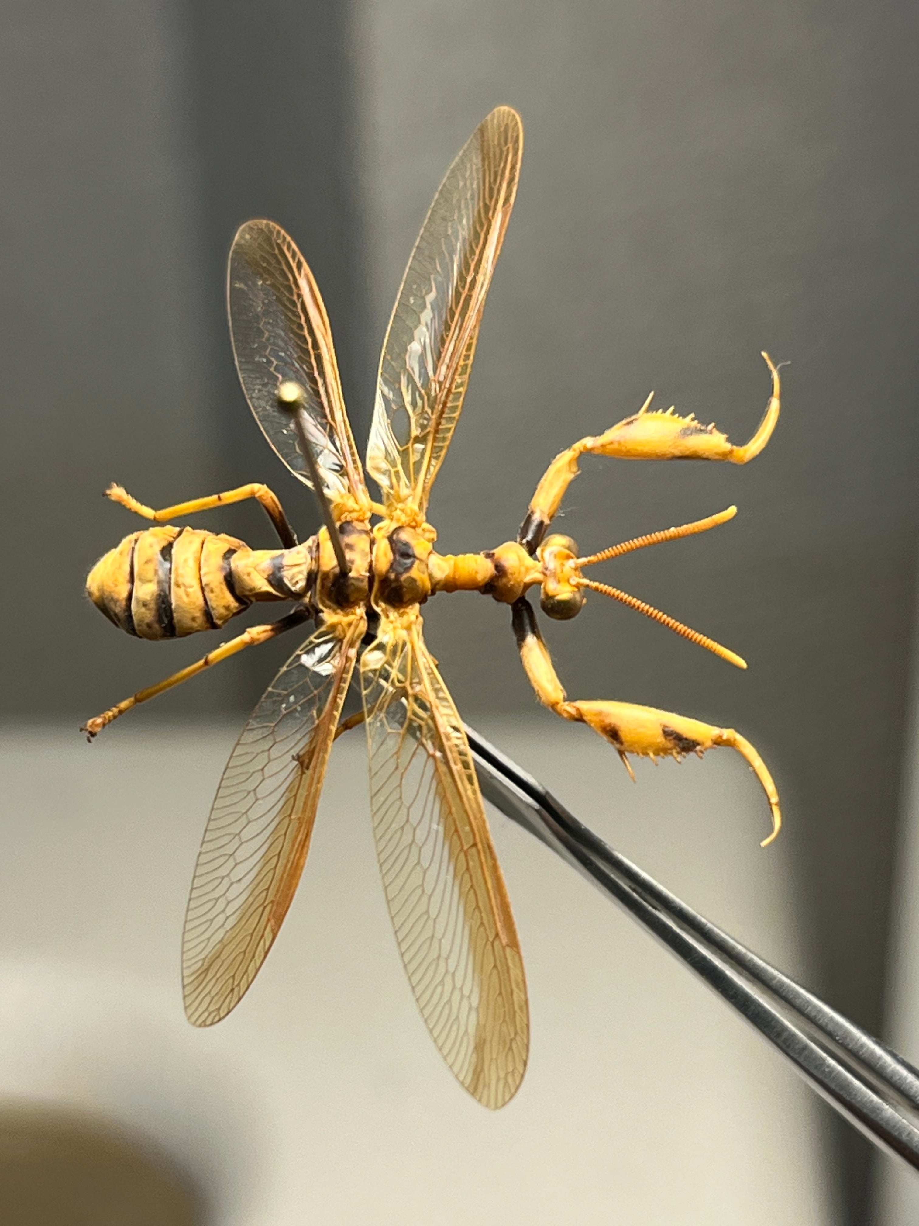 日本(特に八重山諸島以南)に分布する大型のカマキリモドキの仲間で、ハチに擬態し、カマキリのような鎌(かま)を持つのが特徴です。クモに寄生する生態を持ち、腹部を曲げて刺すような動作でハチを真似るなど、非常に魅力的な昆虫とされています。