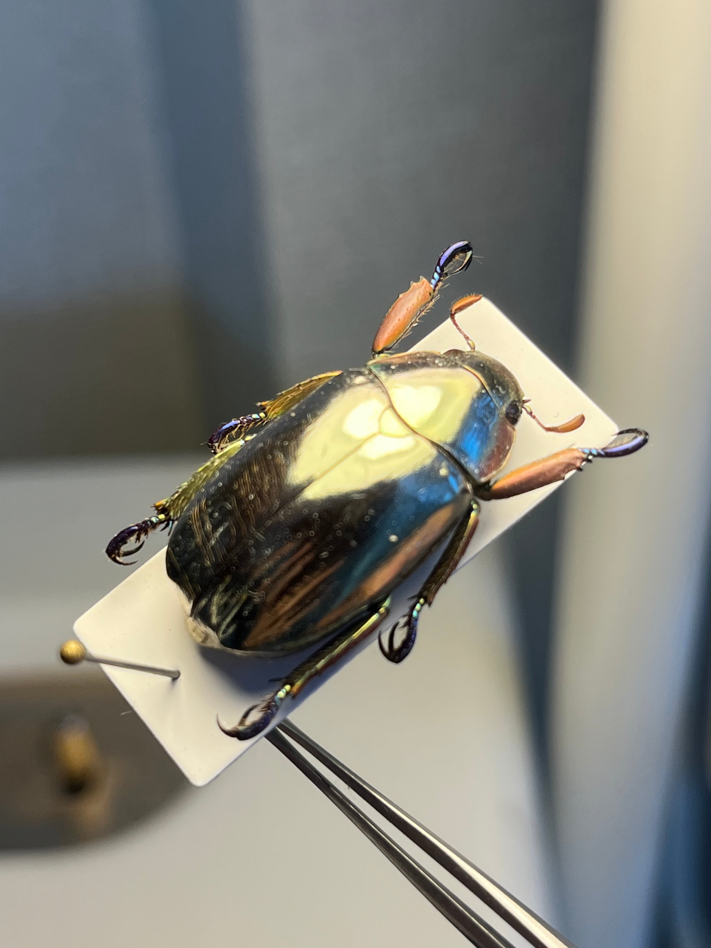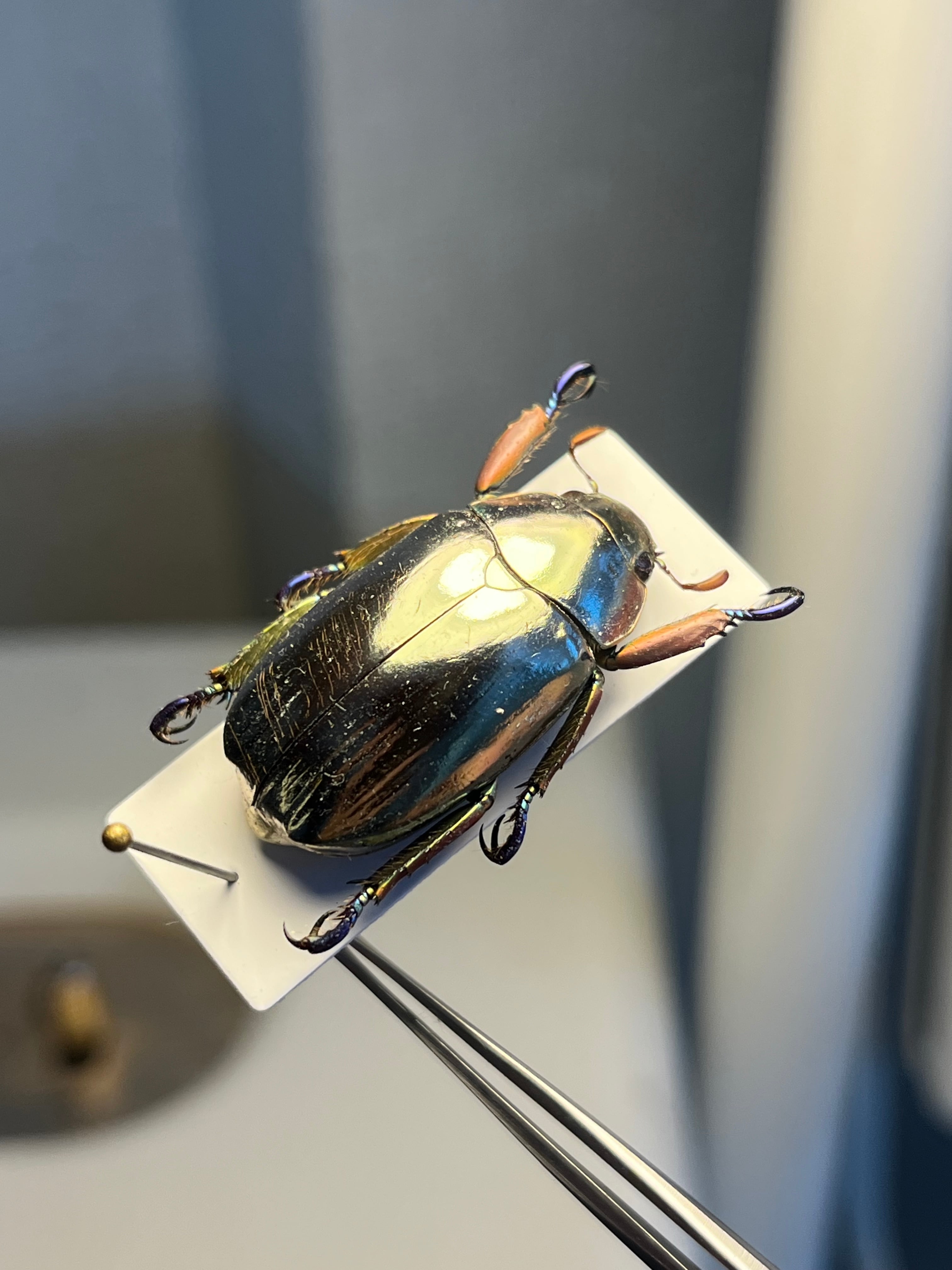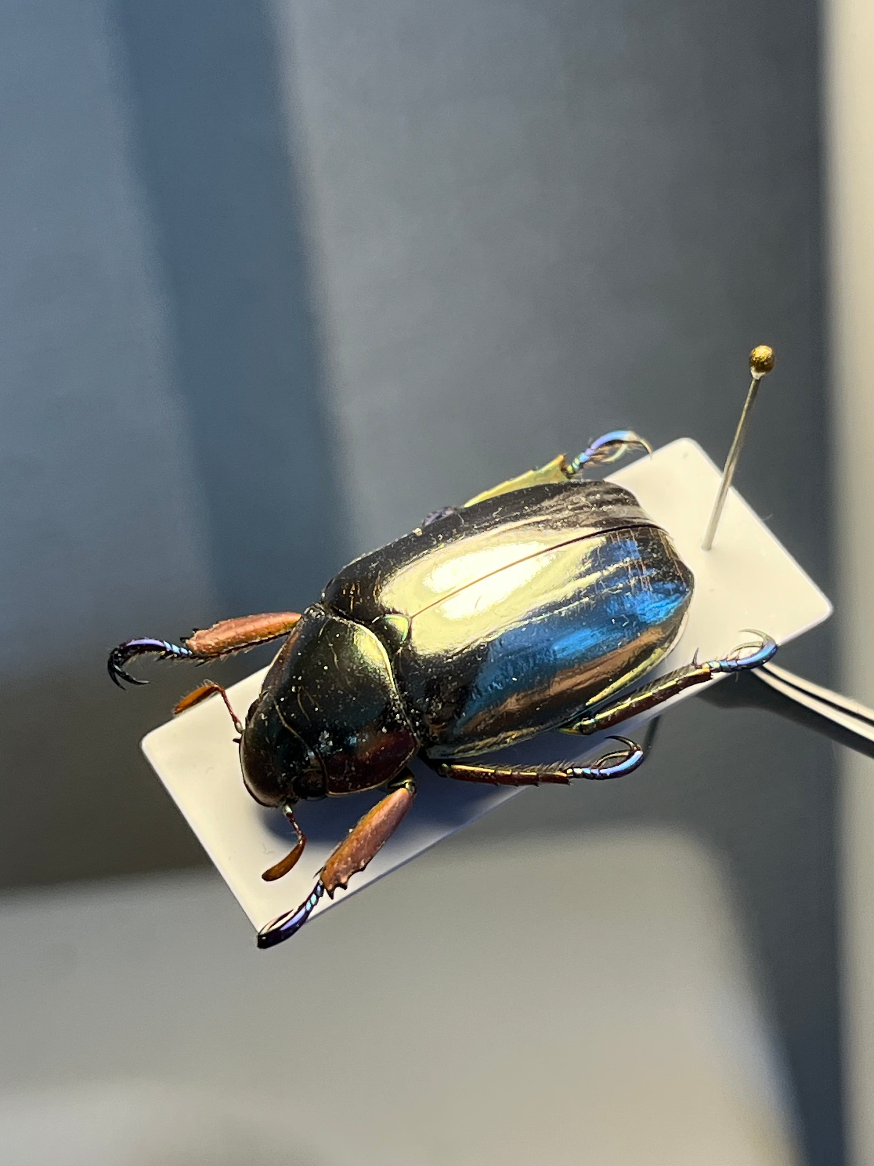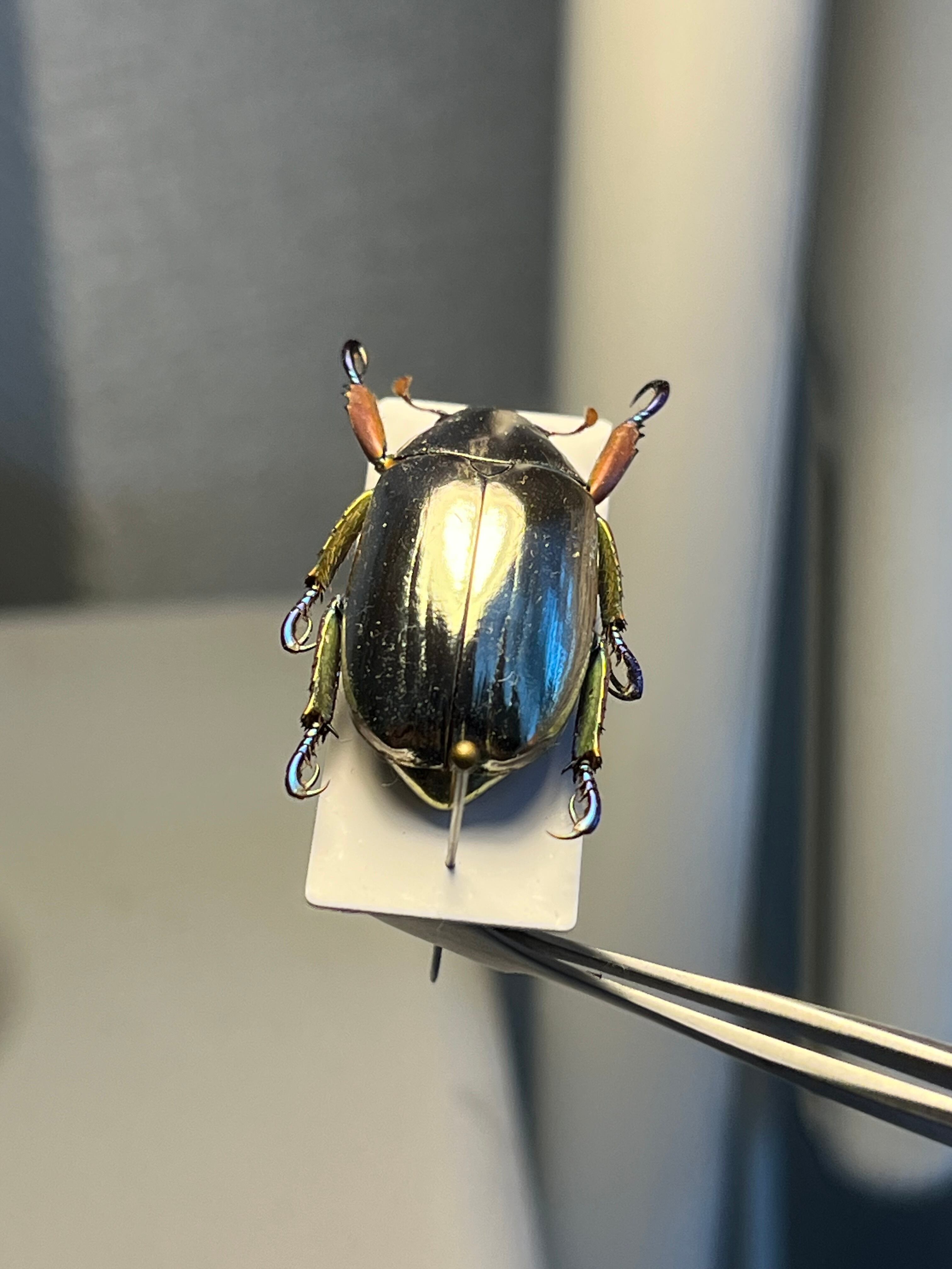 「プラチナコガネ」の仲間(Chrysina属)の中でも特に鏡のような輝きを持ち、周囲を映し込むことで敵から身を守ると考えられています。その金属光沢は、翅の構造と尿酸分子の組み合わせによって生み出され、プラモデルとしても人気があります。