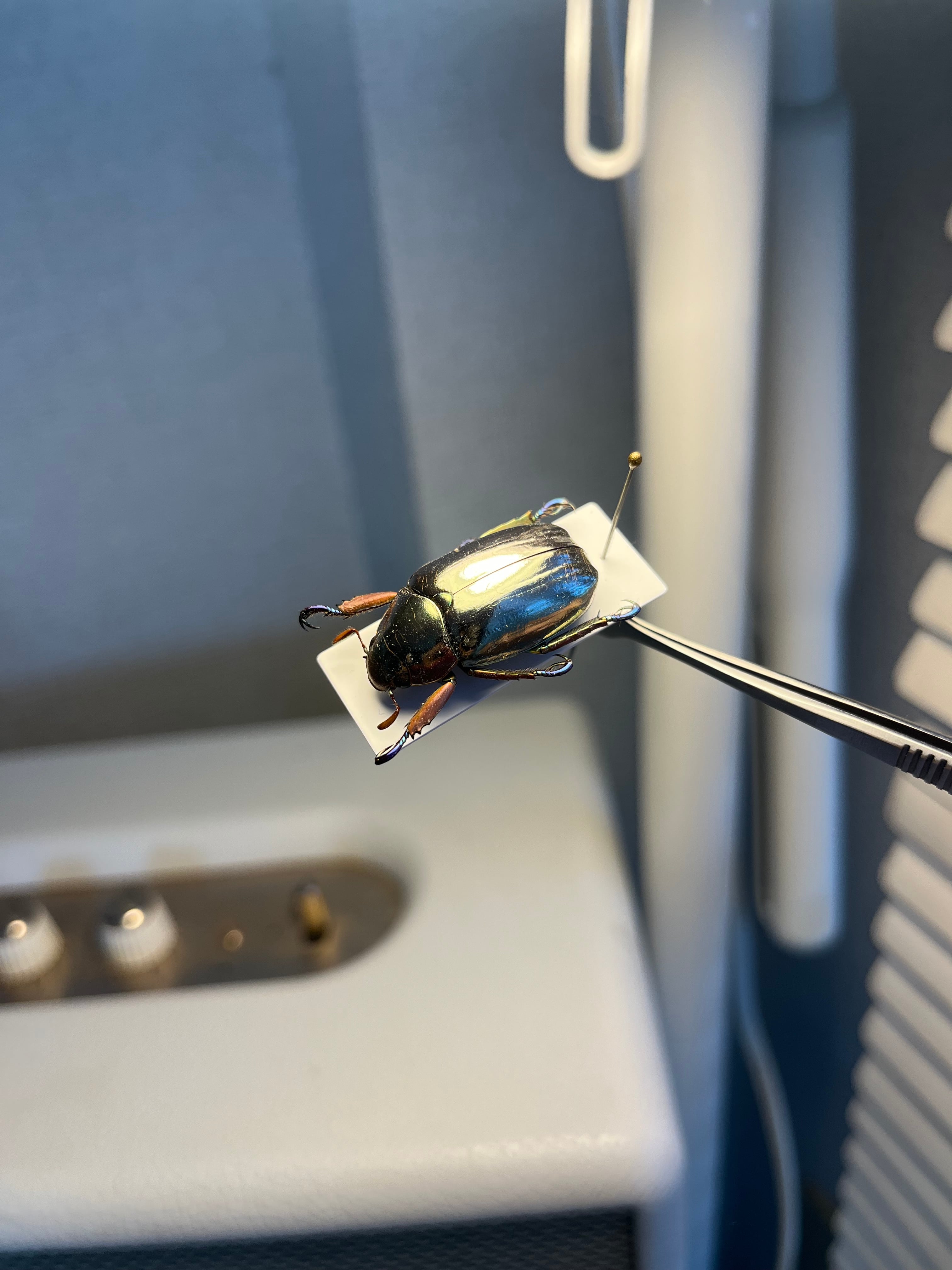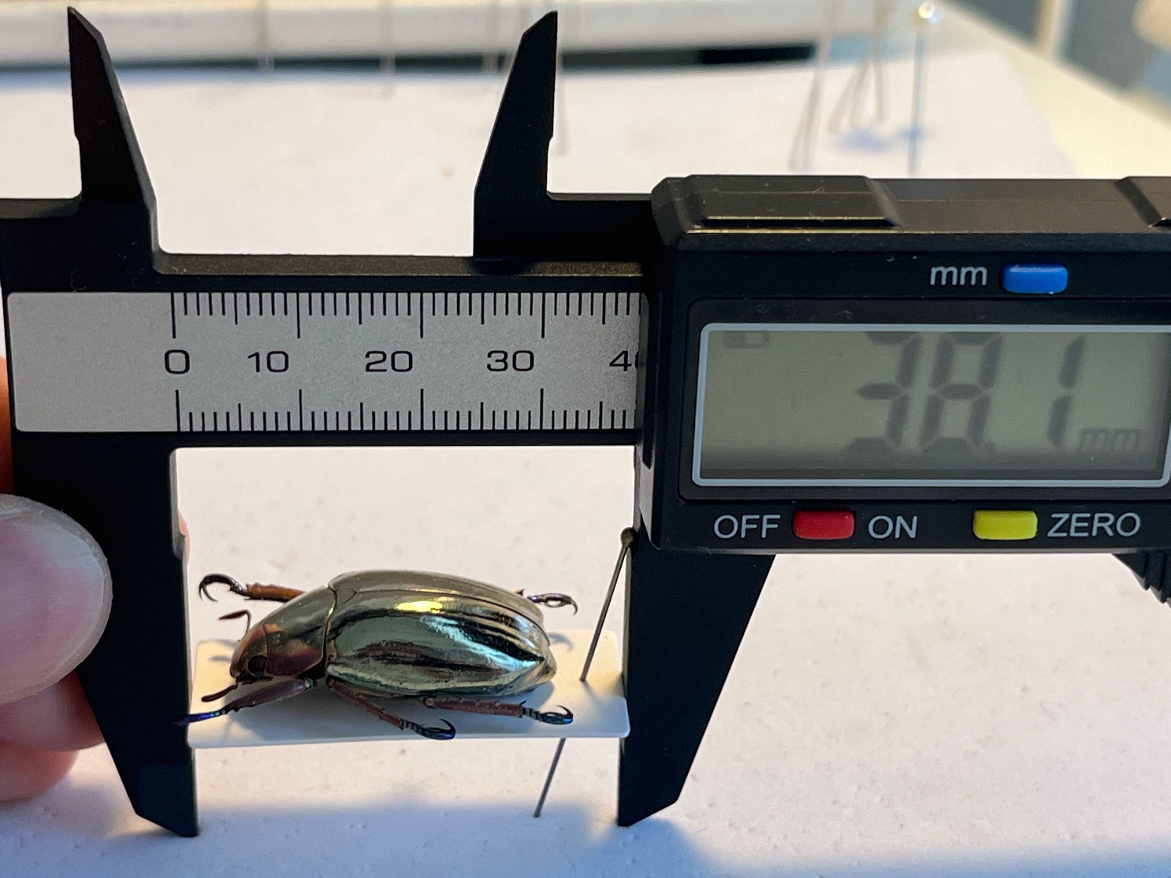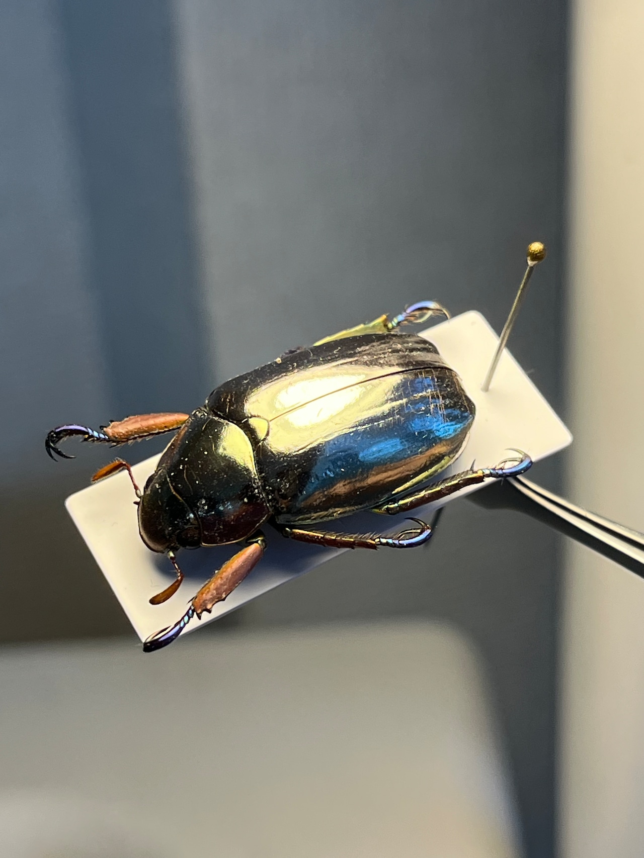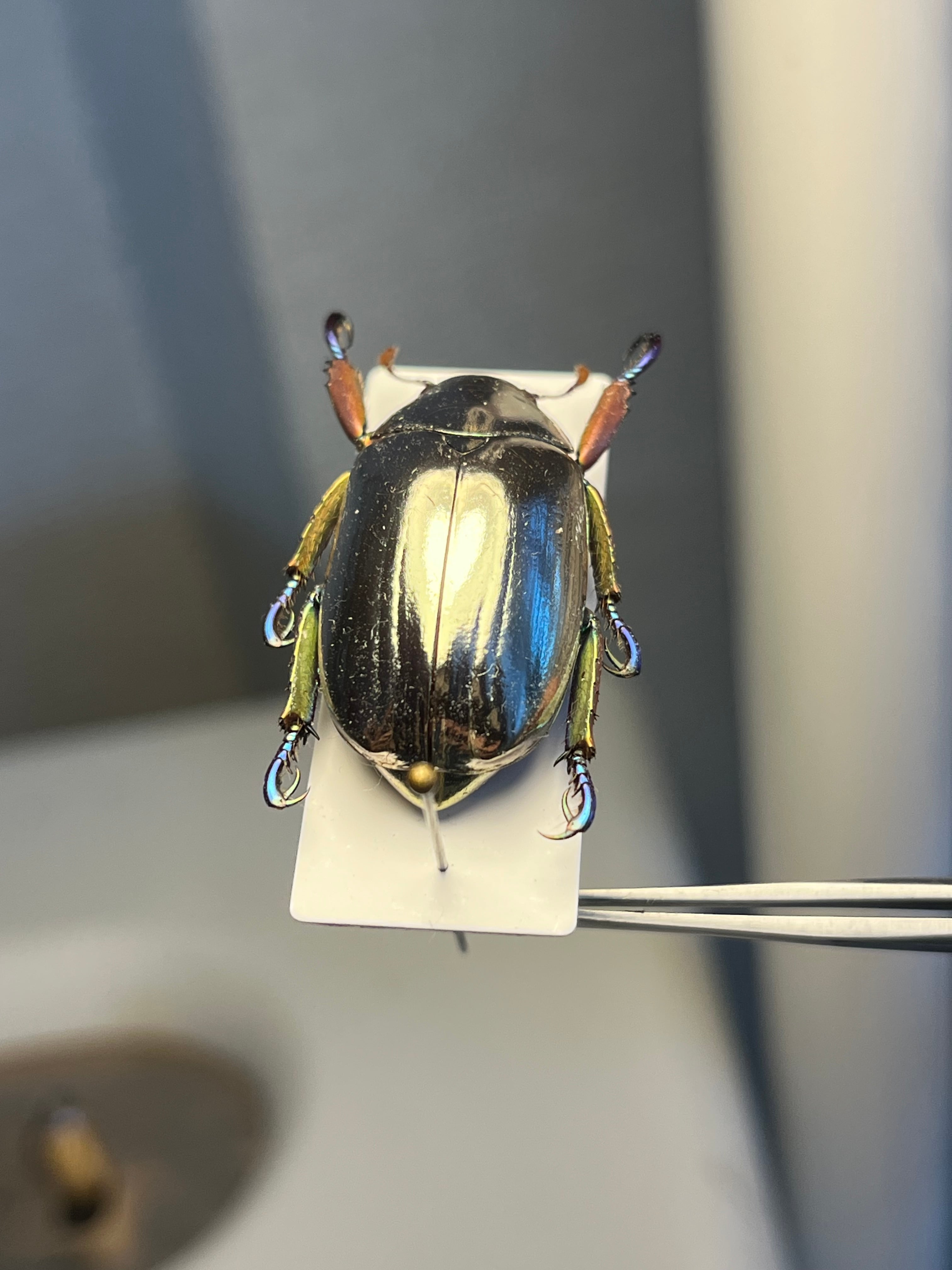 「プラチナコガネ」の仲間(Chrysina属)の中でも特に鏡のような輝きを持ち、周囲を映し込むことで敵から身を守ると考えられています。その金属光沢は、翅の構造と尿酸分子の組み合わせによって生み出され、プラモデルとしても人気があります。