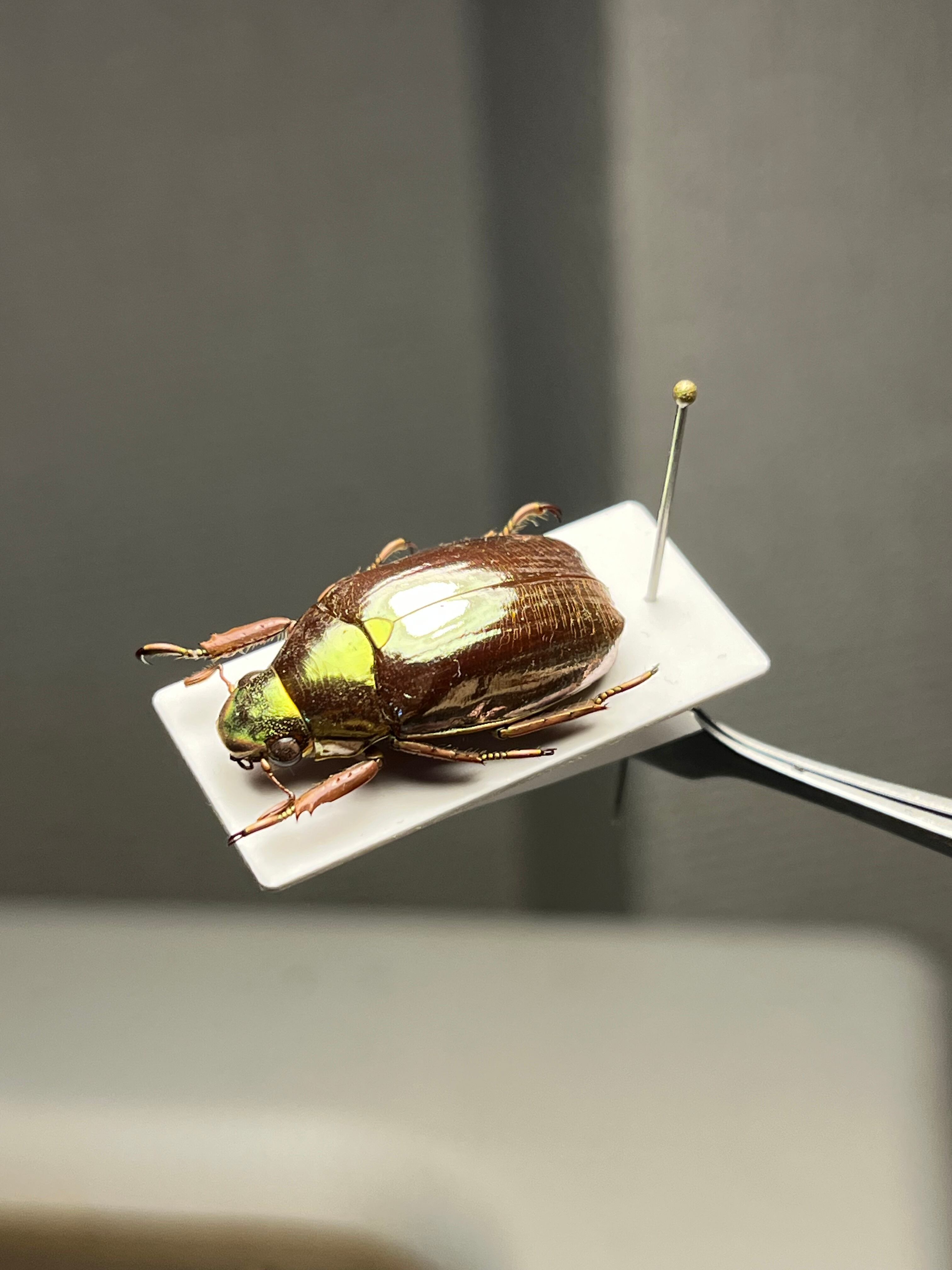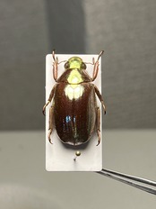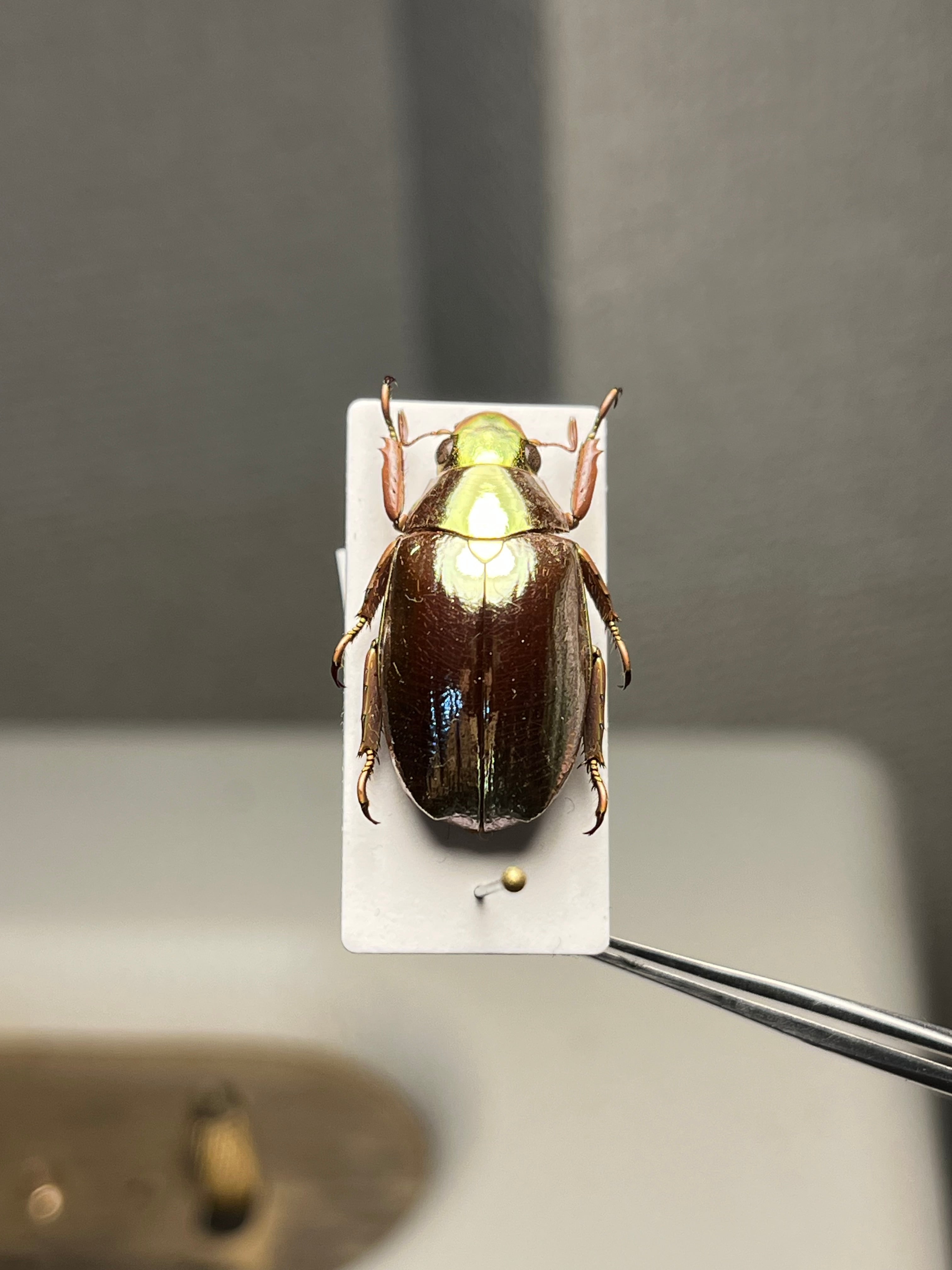 オプティマプラチナコガネとして知られる、美しい金属光沢を持つコガネムシの一種で、鏡のような体色で周囲に溶け込みカモフラージュする特徴を持ち、主に中南米に生息するシャイニングリーフカブトムシの仲間です。その独特な金属光沢は、翅の微細構造と尿酸分子の組み合わせによる「構造色」で、単なる色素ではなく光の反射によって生み出されており、捕食者から身を守る役割があると考えられています。