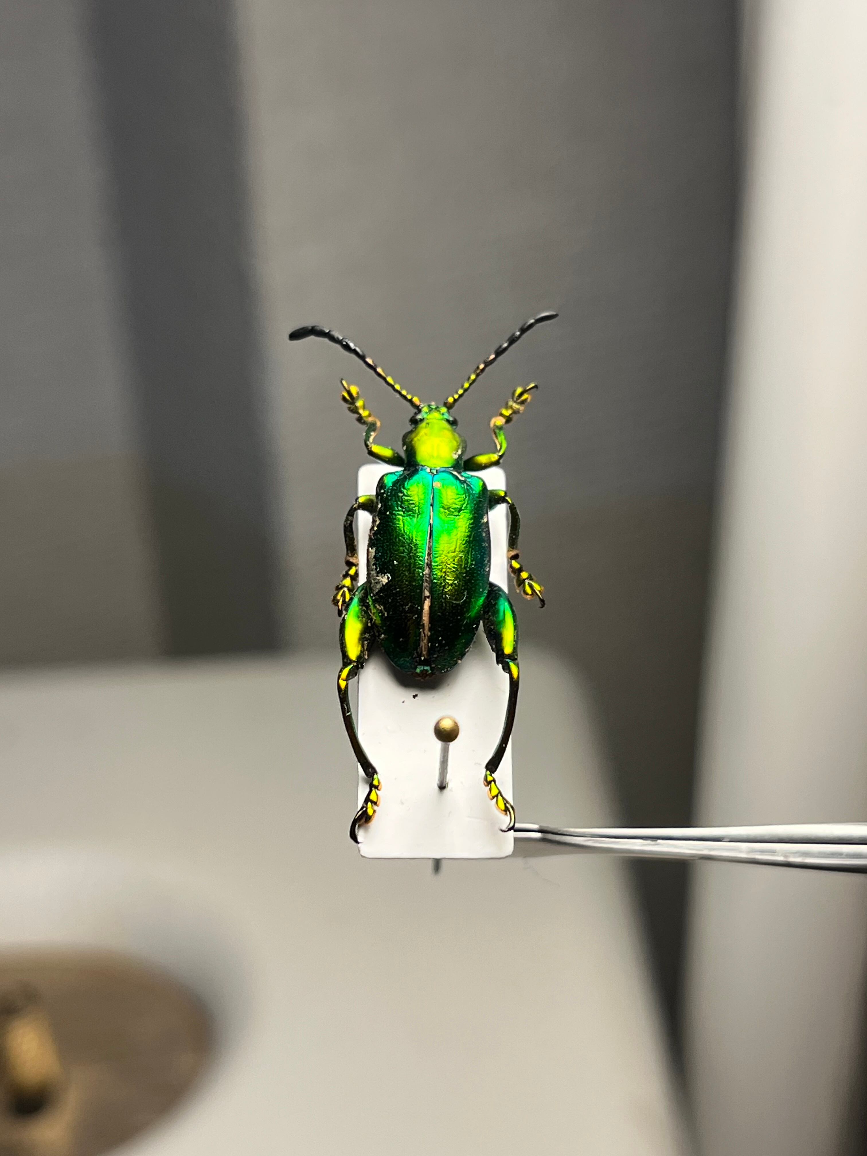 Sagra longicollis(サグラ・ロンギコリス)は、タイなどアジアに生息する「モモブトハムシ」の仲間で、バッタのような大きな後脚を持つ特徴的なハムシ(葉虫)の一種です。ミドリモモブトハムシとも呼ばれ、カメムシ目(鞘翅目)に属するタマムシ科(Chrysomelidae)に分類され、そのユニークな外見から「カエルハムシ」とも呼ばれることがあります。