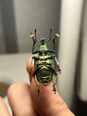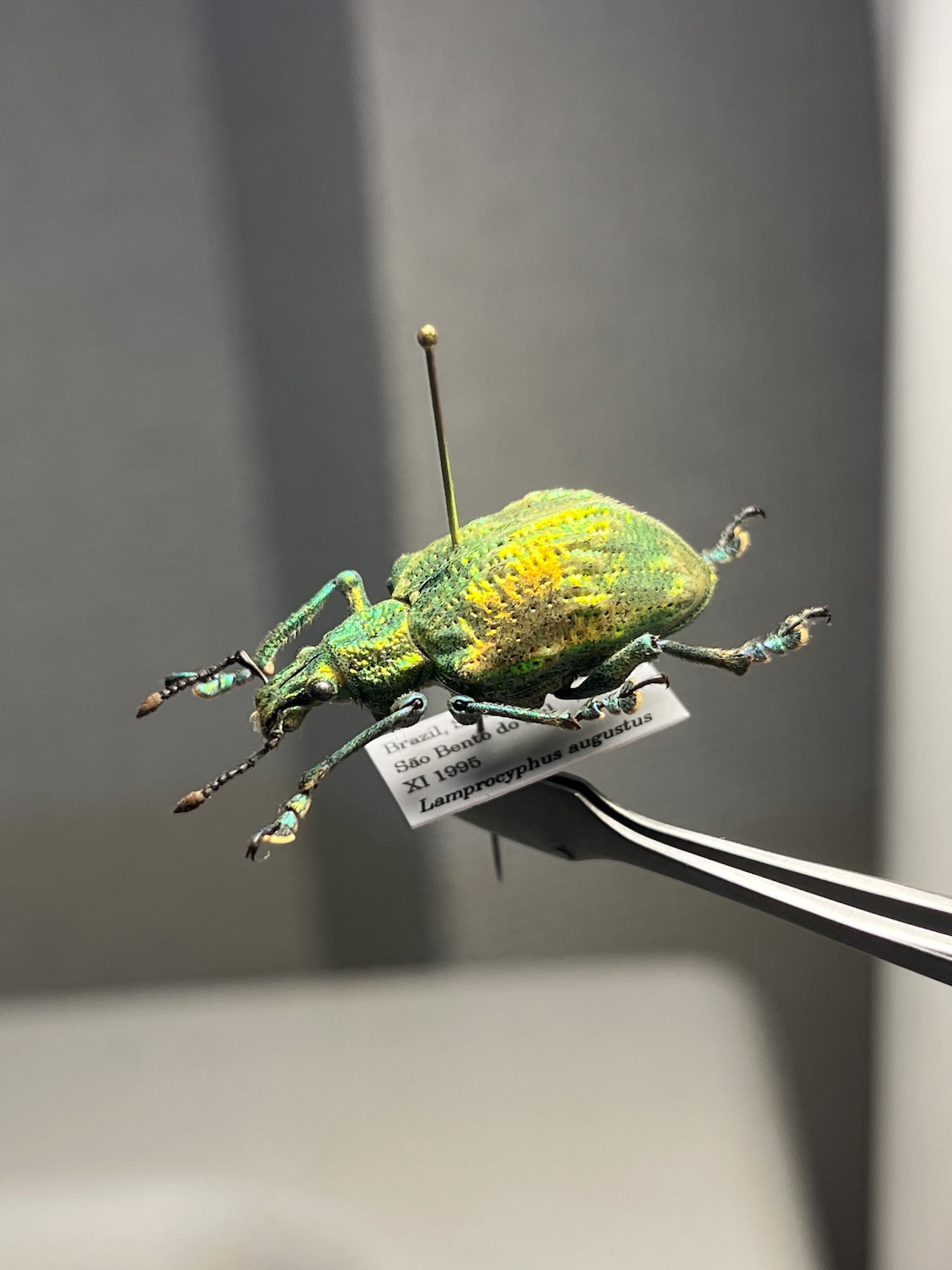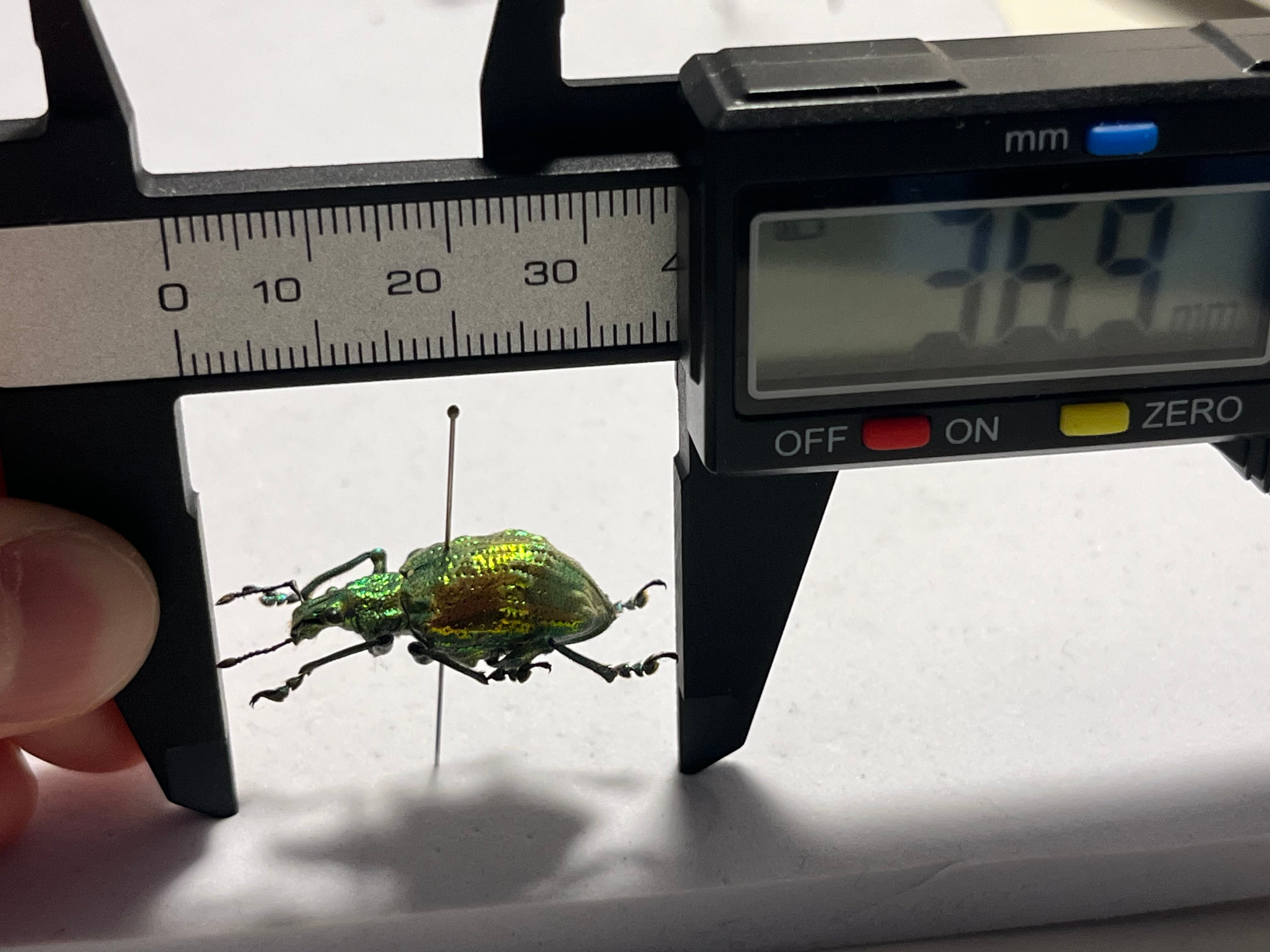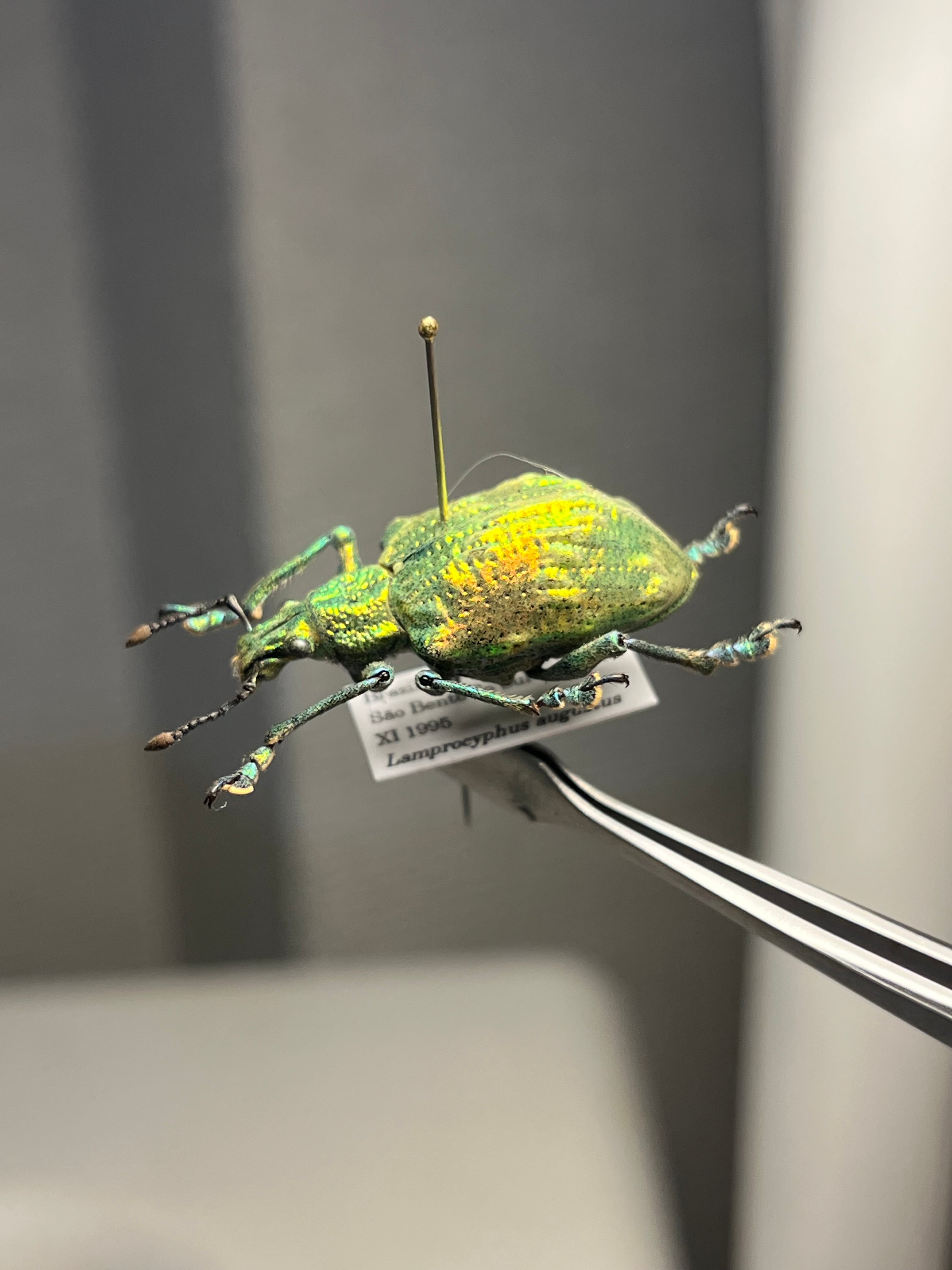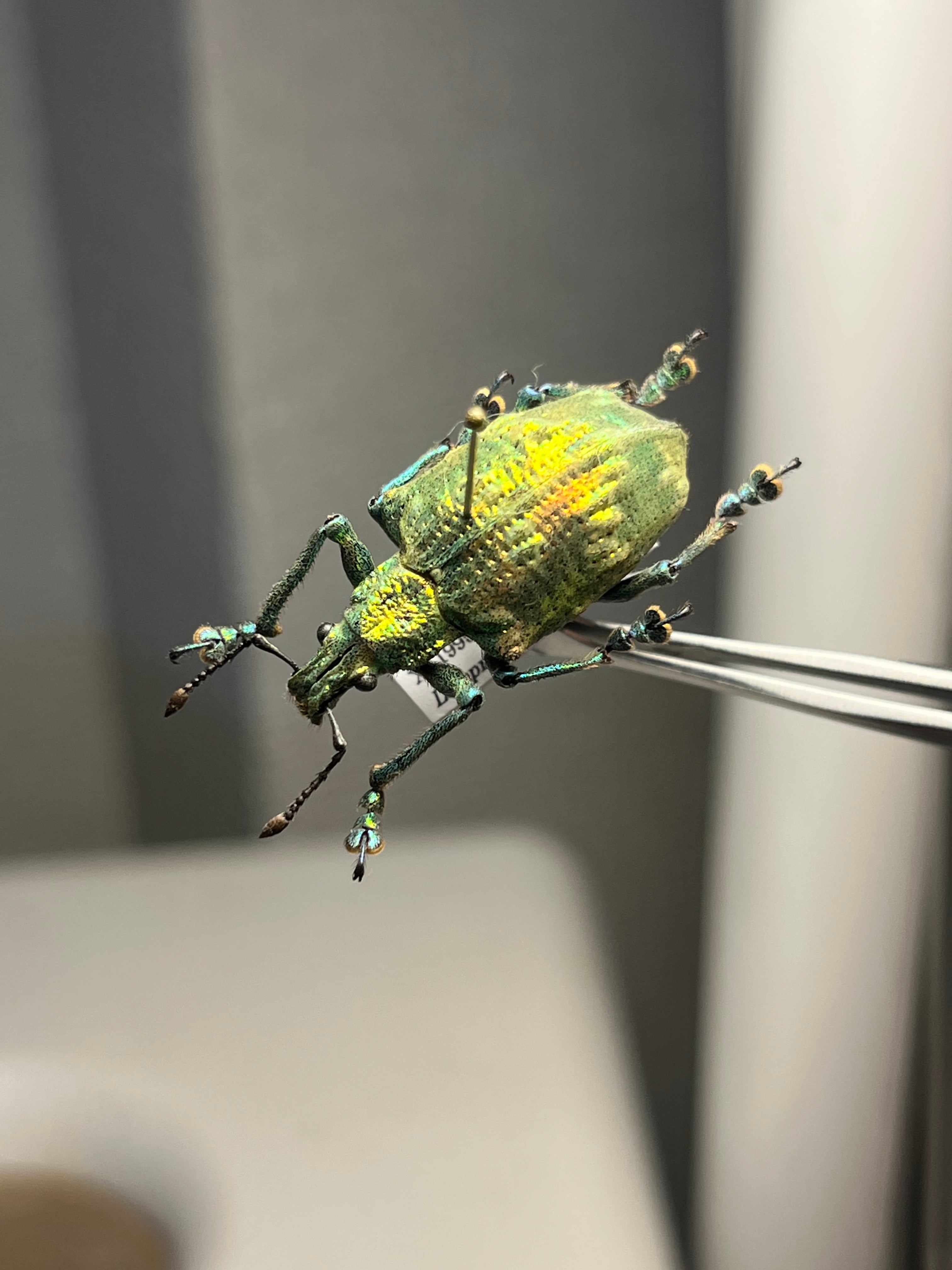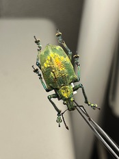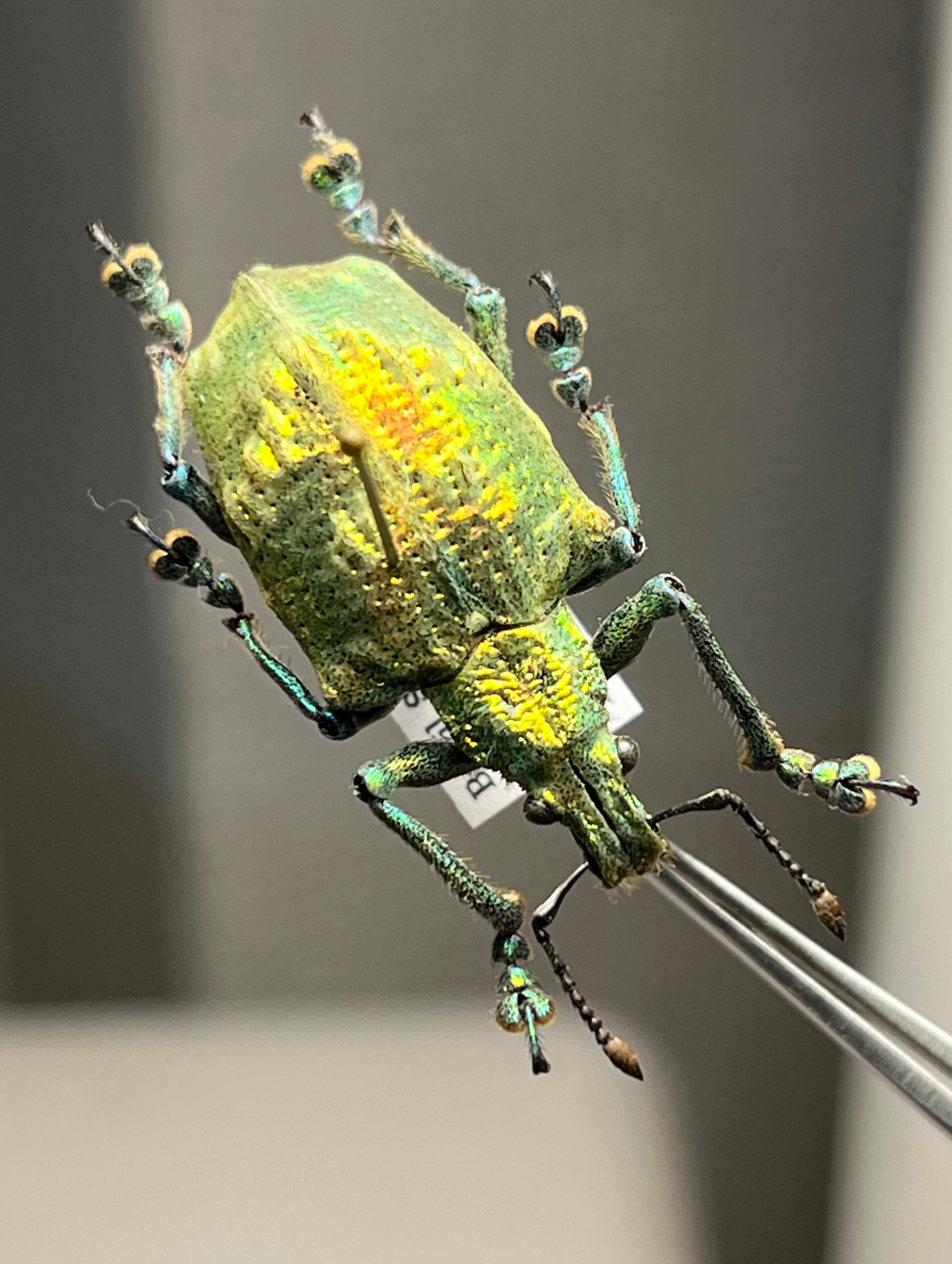 金色の反射を伴う虹彩色の緑色は構造色です。これはキチン質の鱗片のフォトニック結晶構造によって生み出されます。