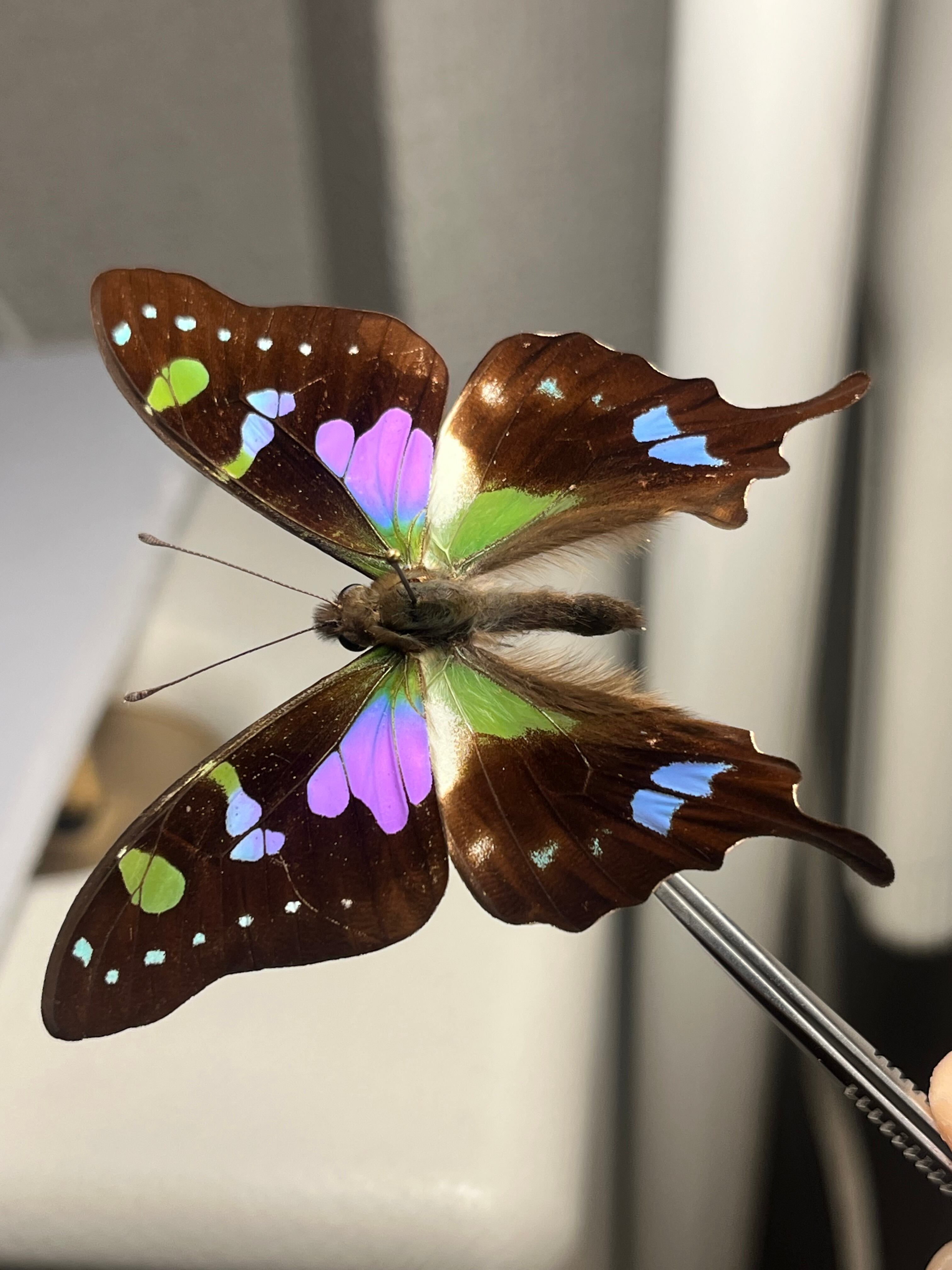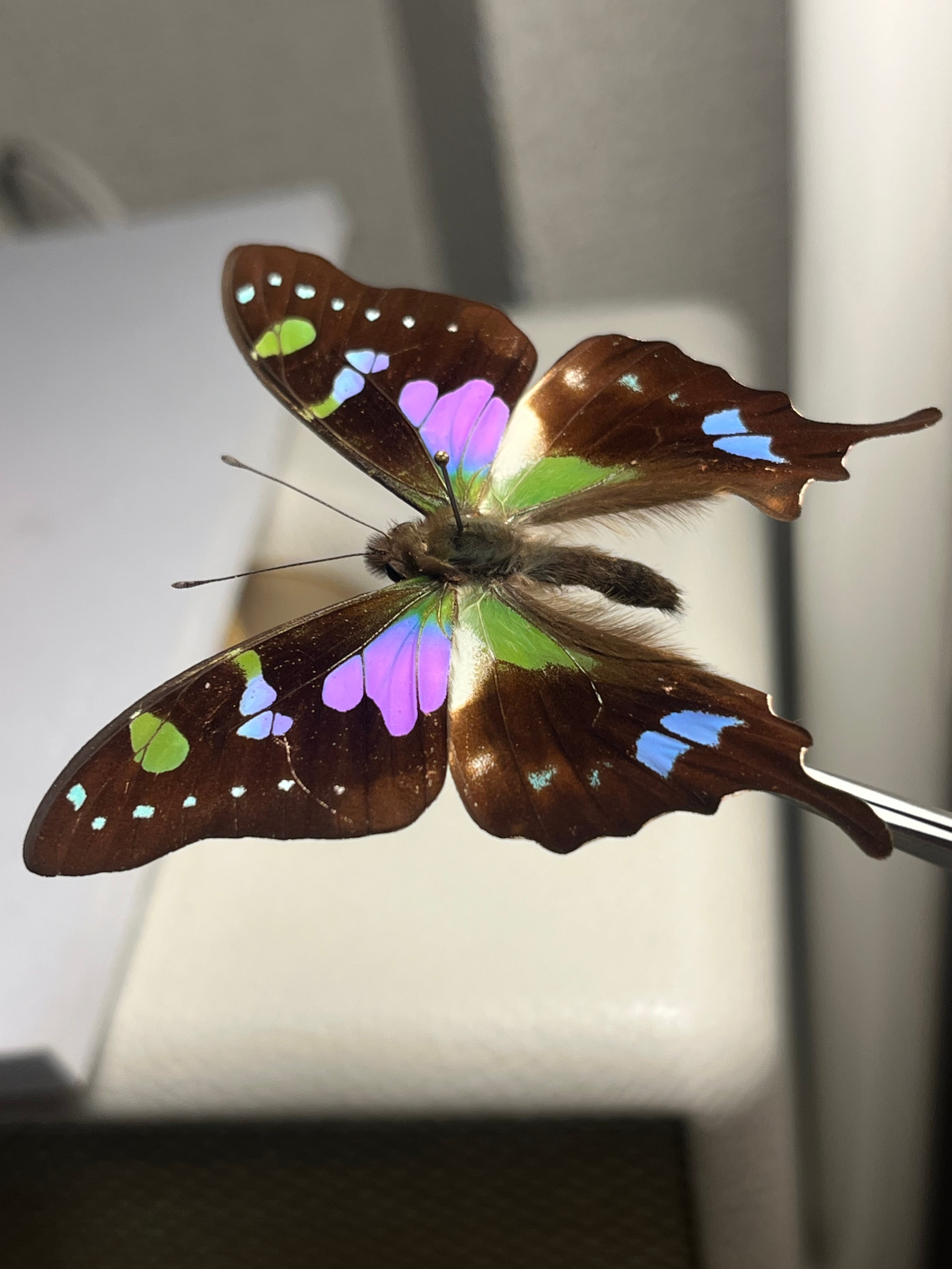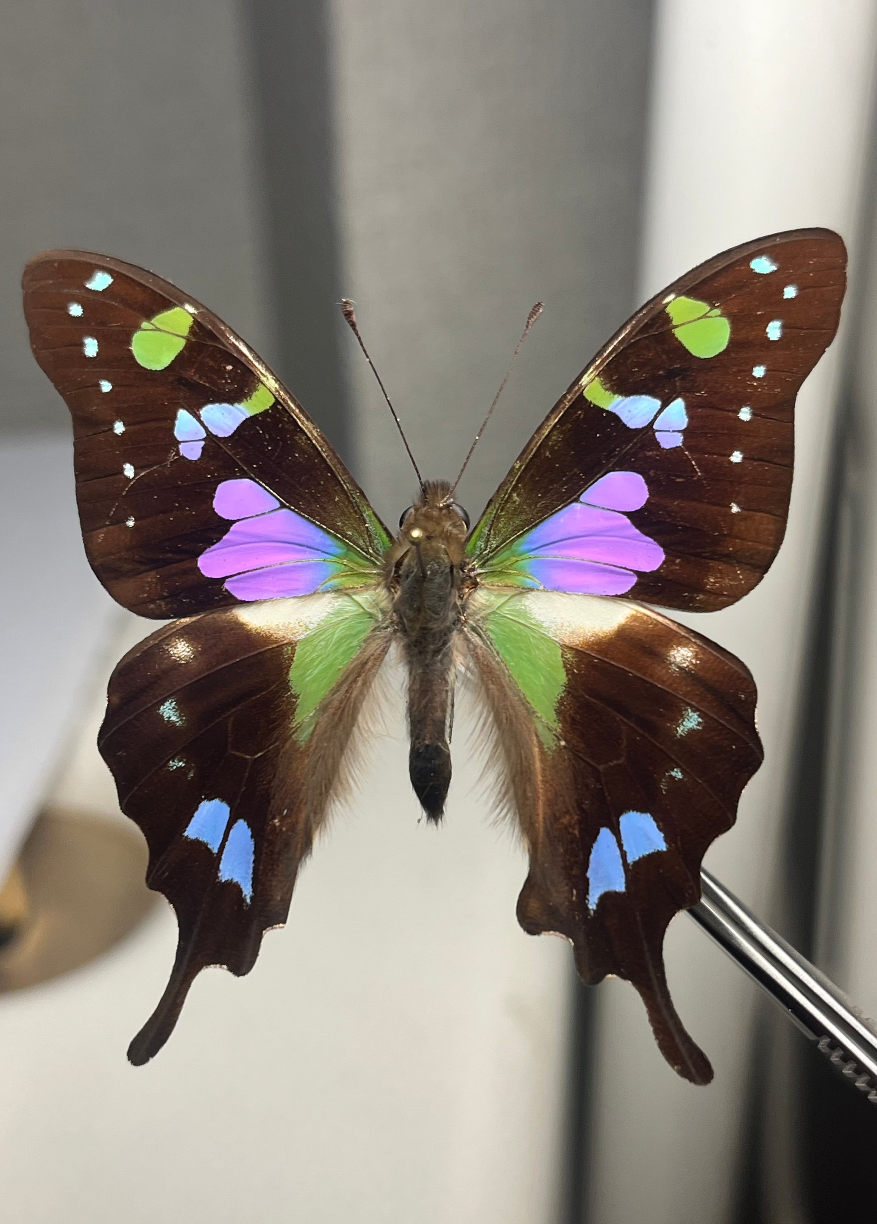 外見: 黒い翅(はね)に、角度によって色が変わる緑色とピンク色の鮮やかな鱗粉を持つ。