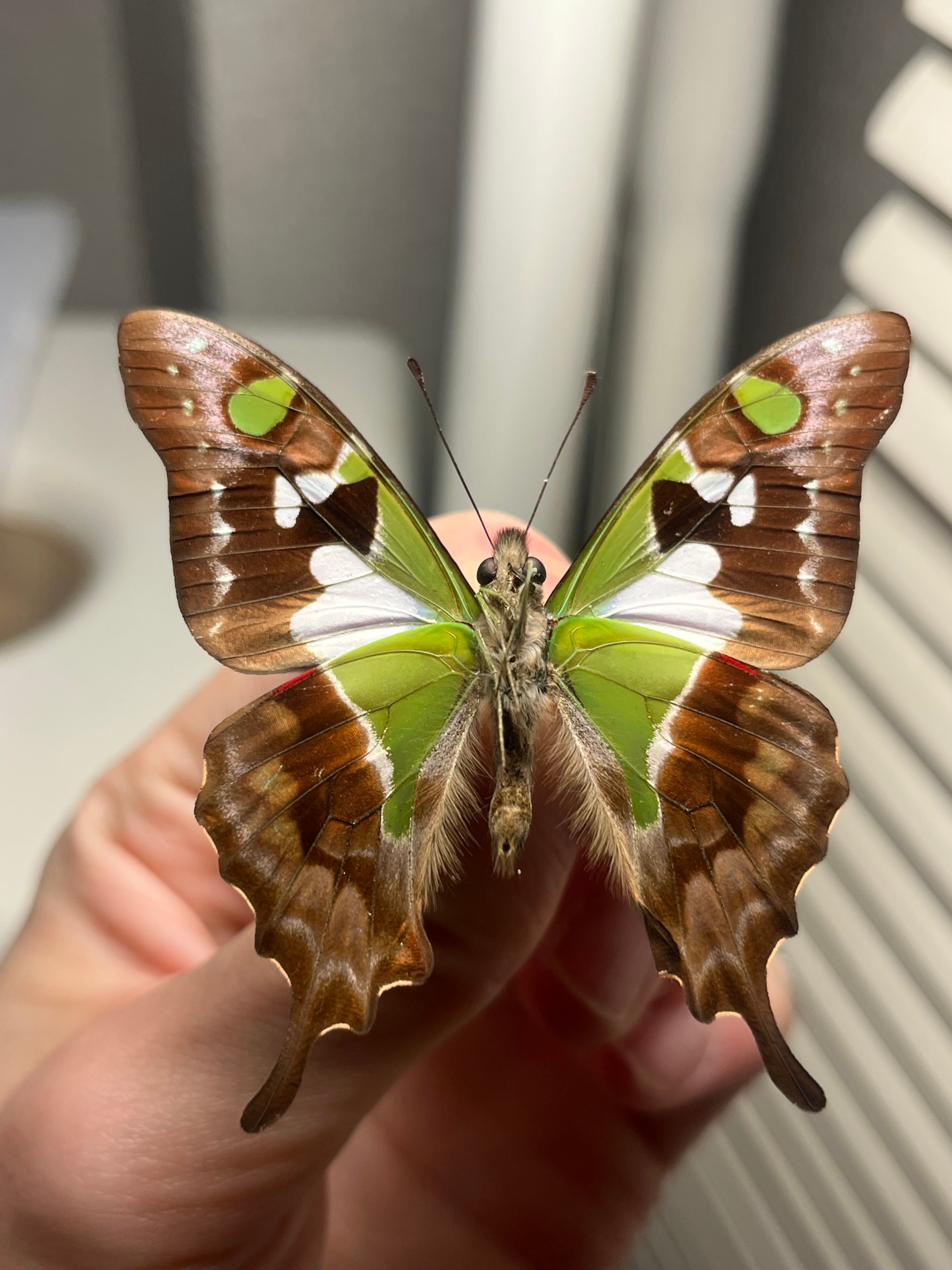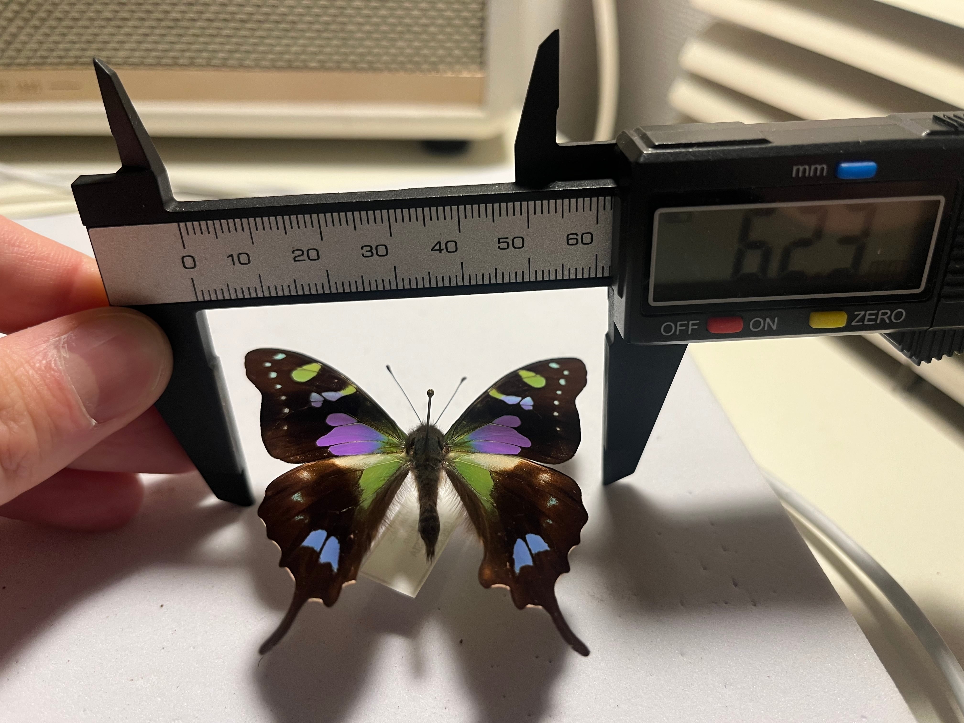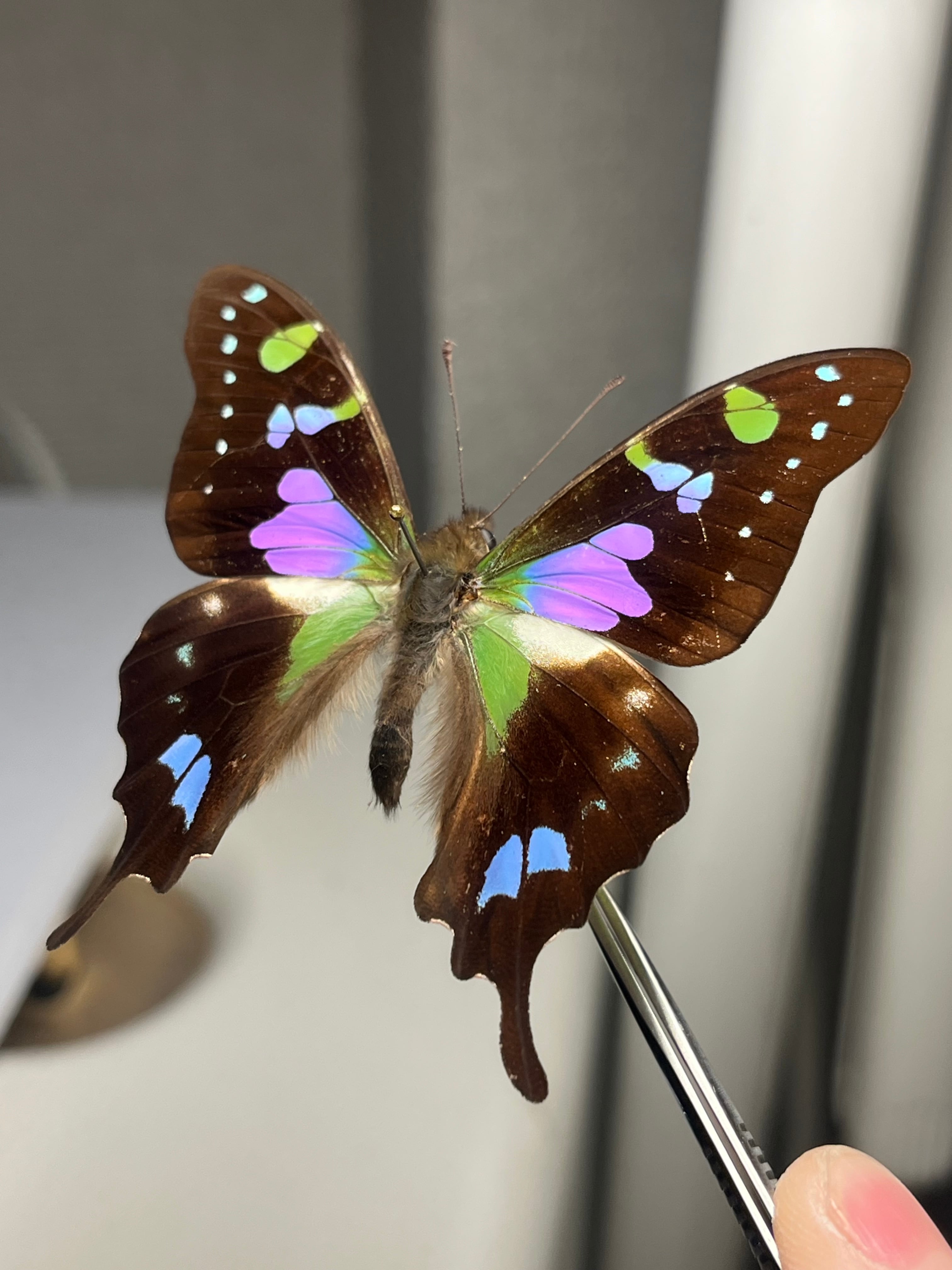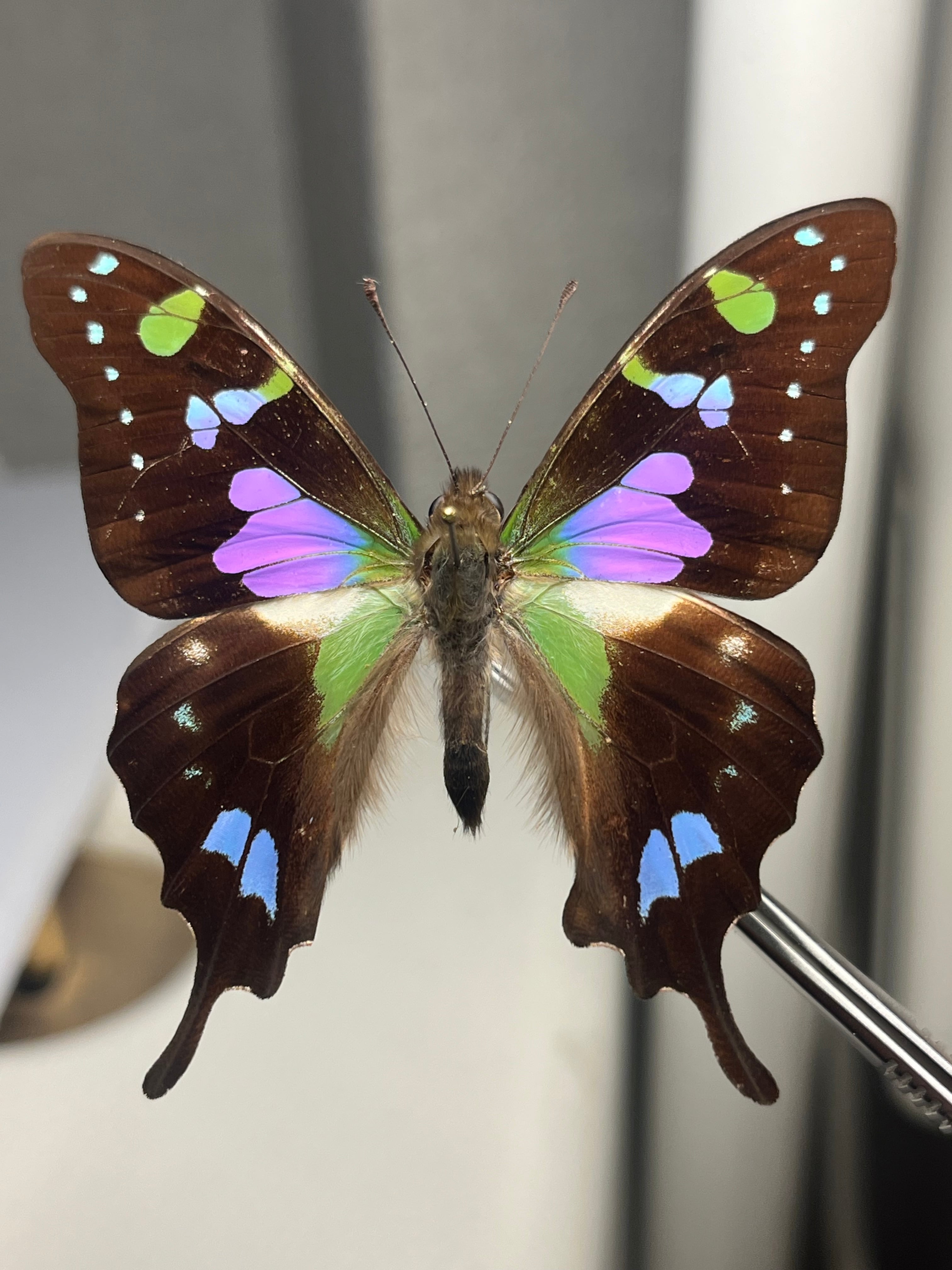 外見: 黒い翅(はね)に、角度によって色が変わる緑色とピンク色の鮮やかな鱗粉を持つ。