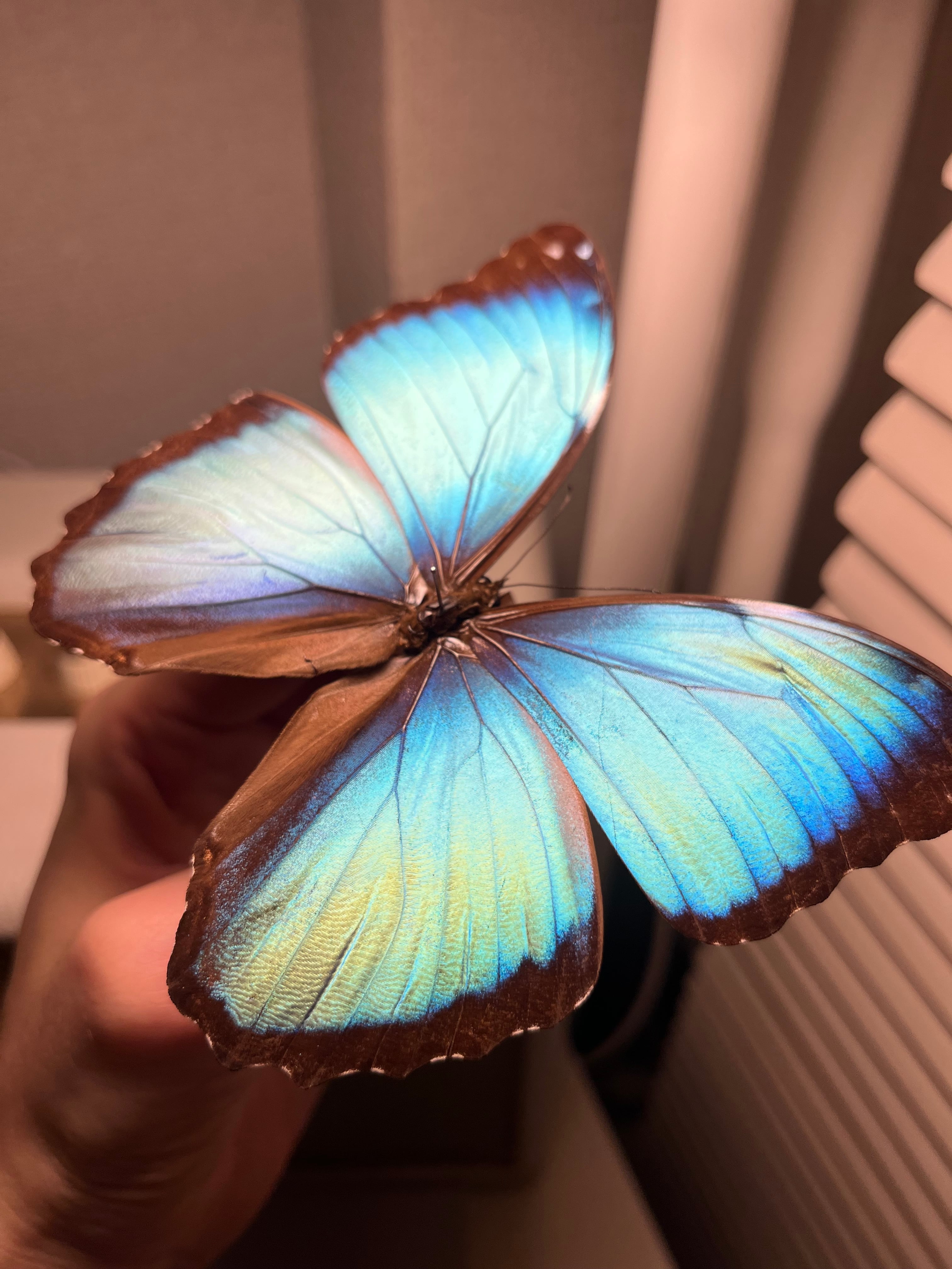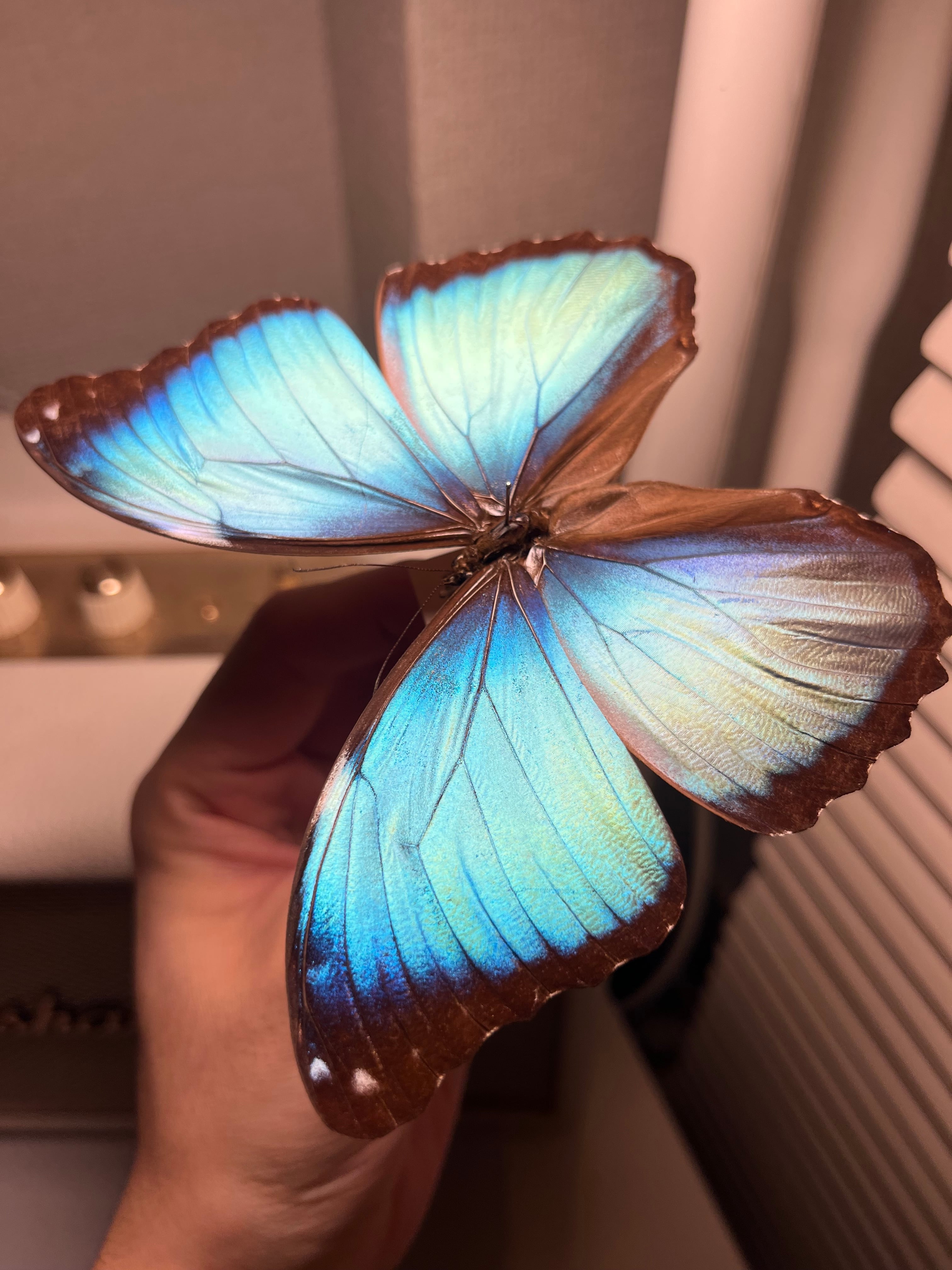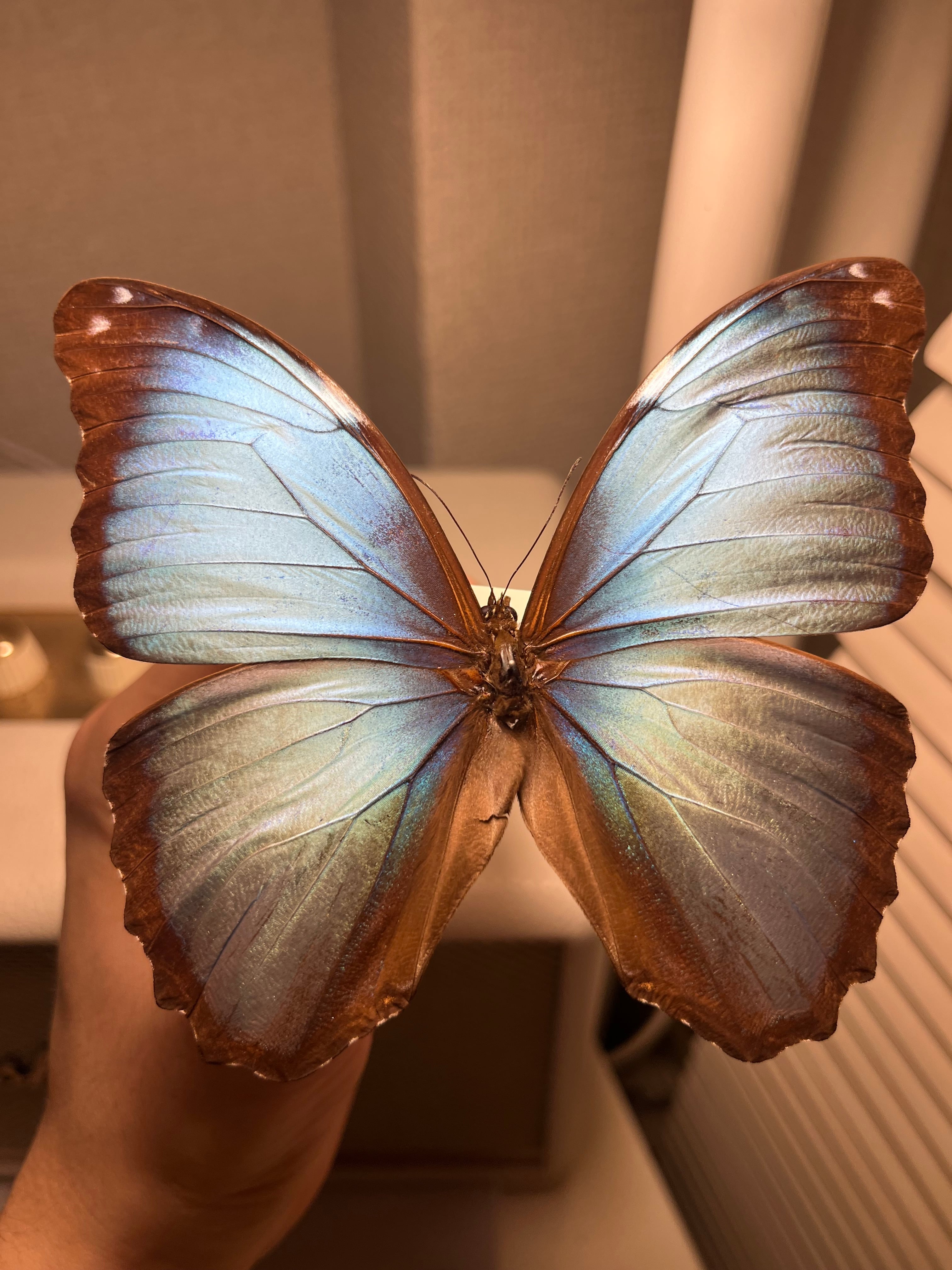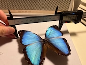 非常に大きな翅を持ち、翅の表面が金属のような青い光沢をもっているのがモルフォ蝶の特徴です。この蝶には、前後の翅の基部や外縁に幅の広い黒色の縁取りがあります。たくさんの亜種があります。