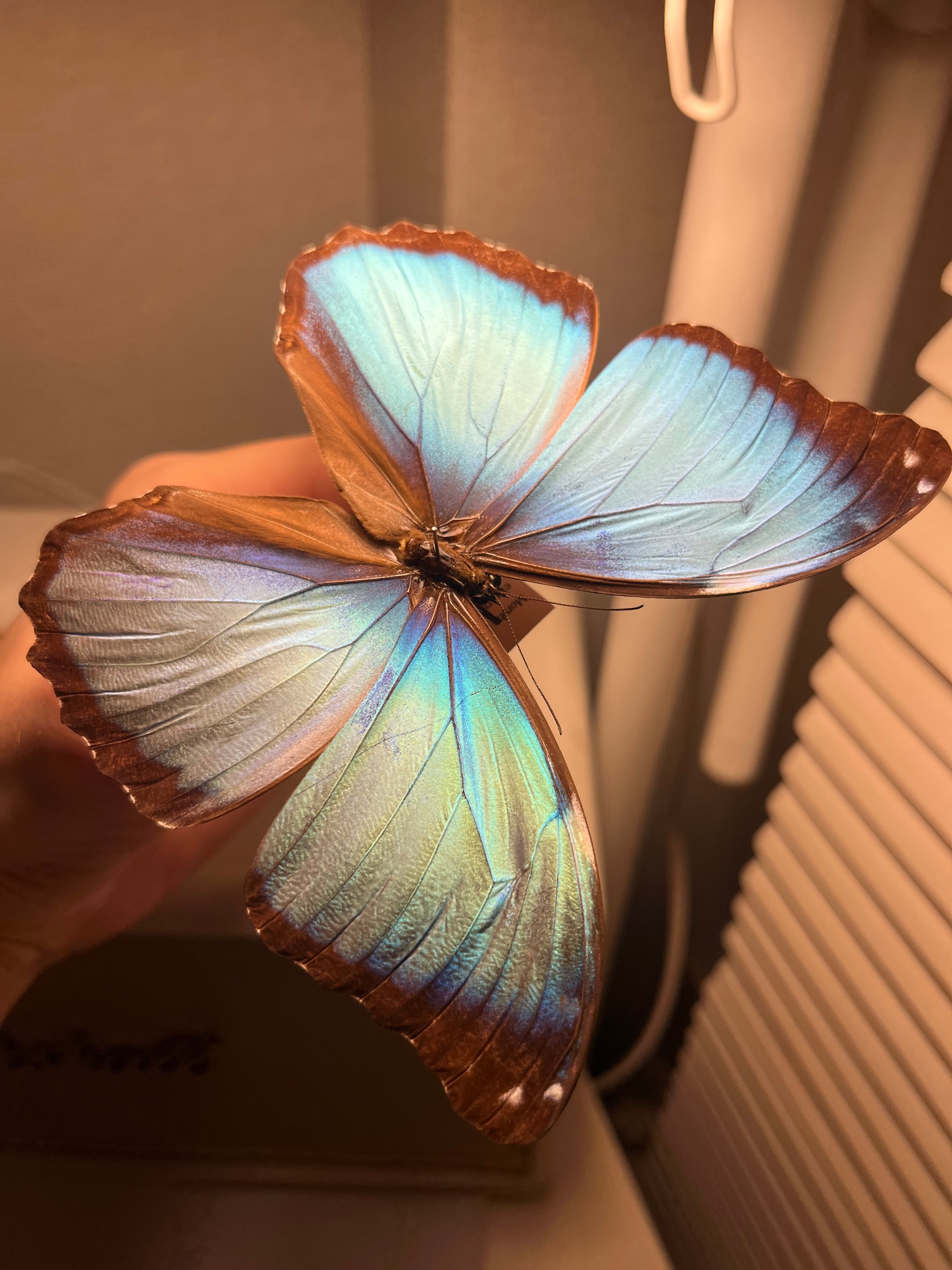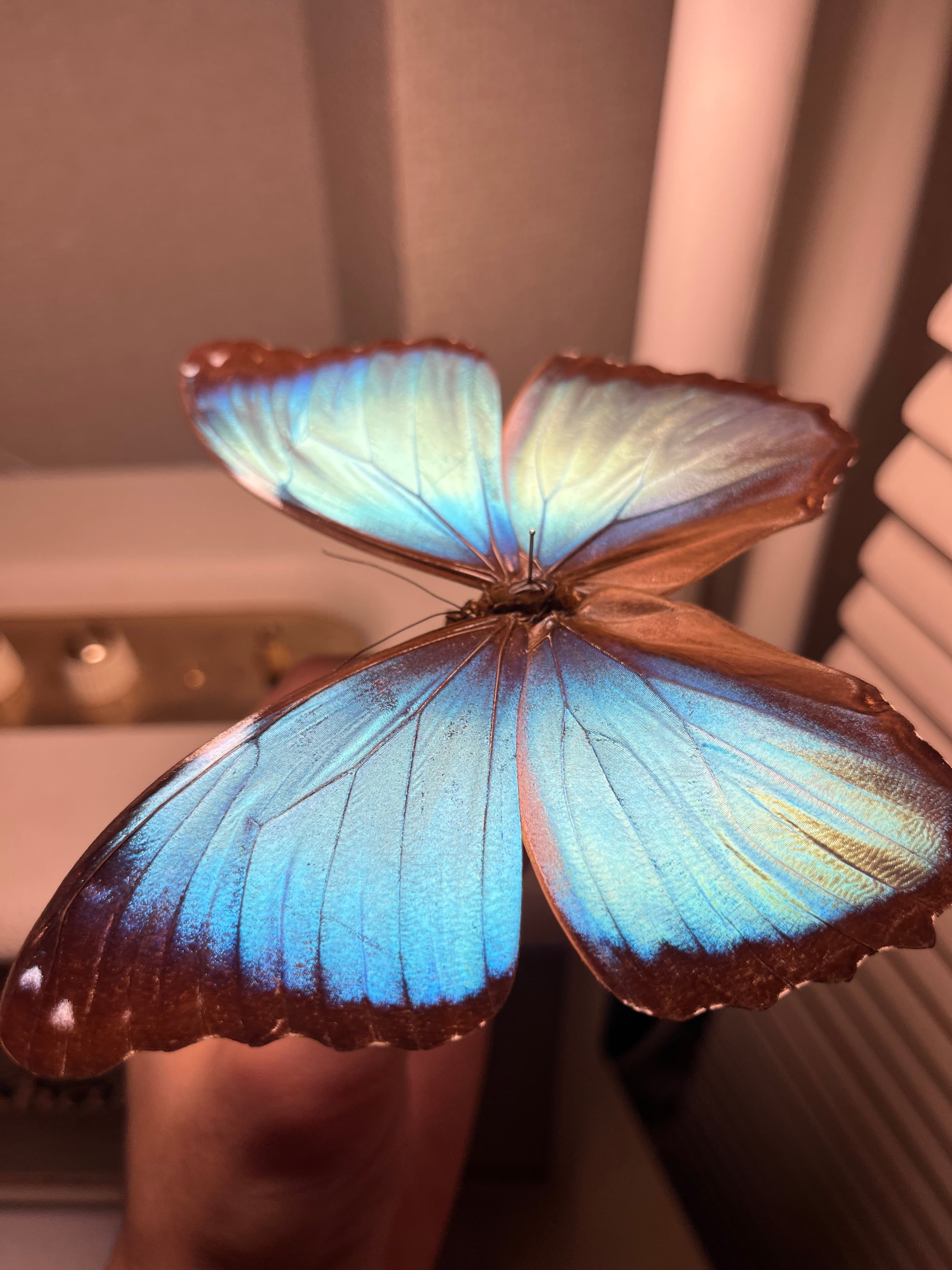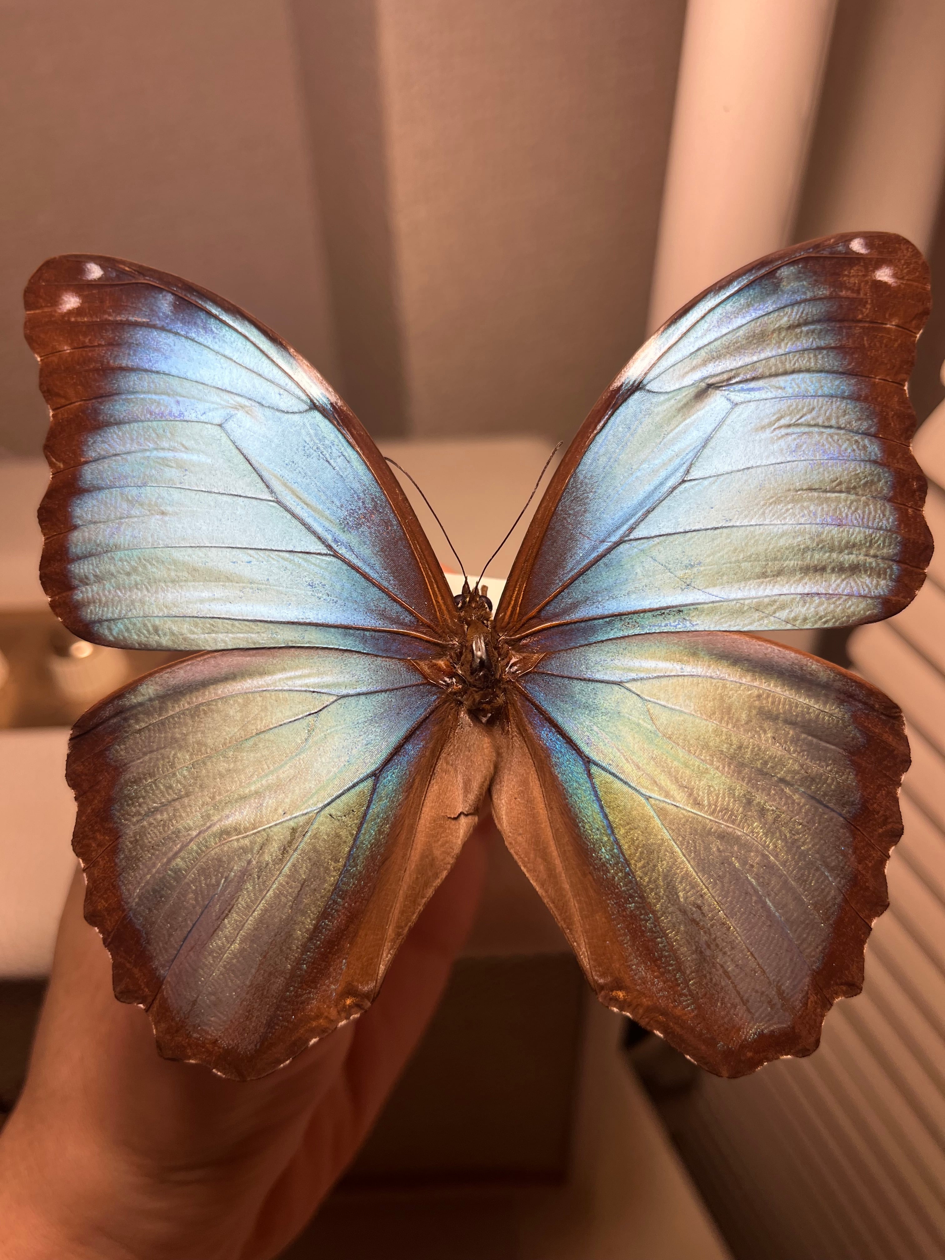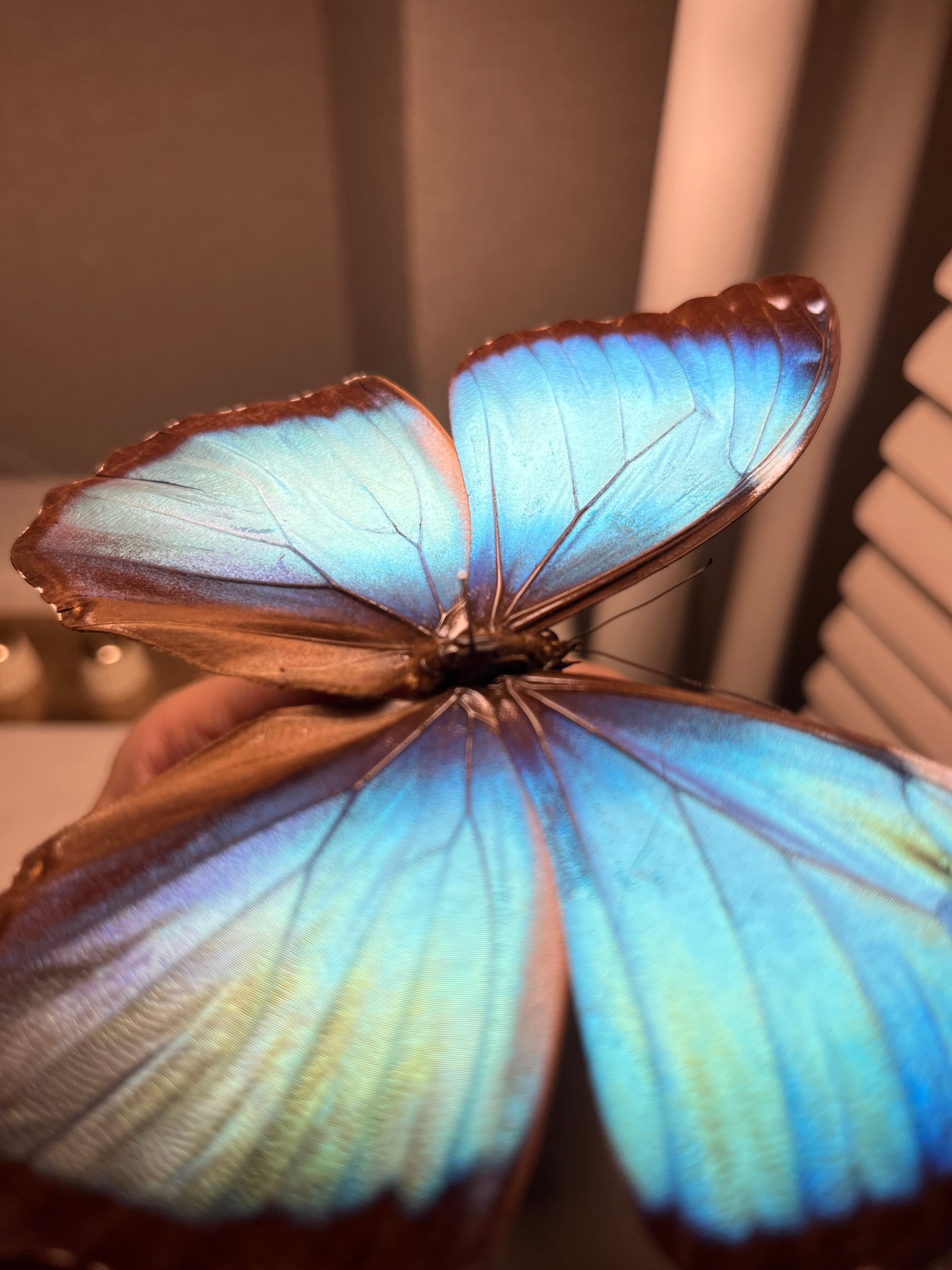 非常に大きな翅を持ち、翅の表面が金属のような青い光沢をもっているのがモルフォ蝶の特徴です。この蝶には、前後の翅の基部や外縁に幅の広い黒色の縁取りがあります。たくさんの亜種があります。