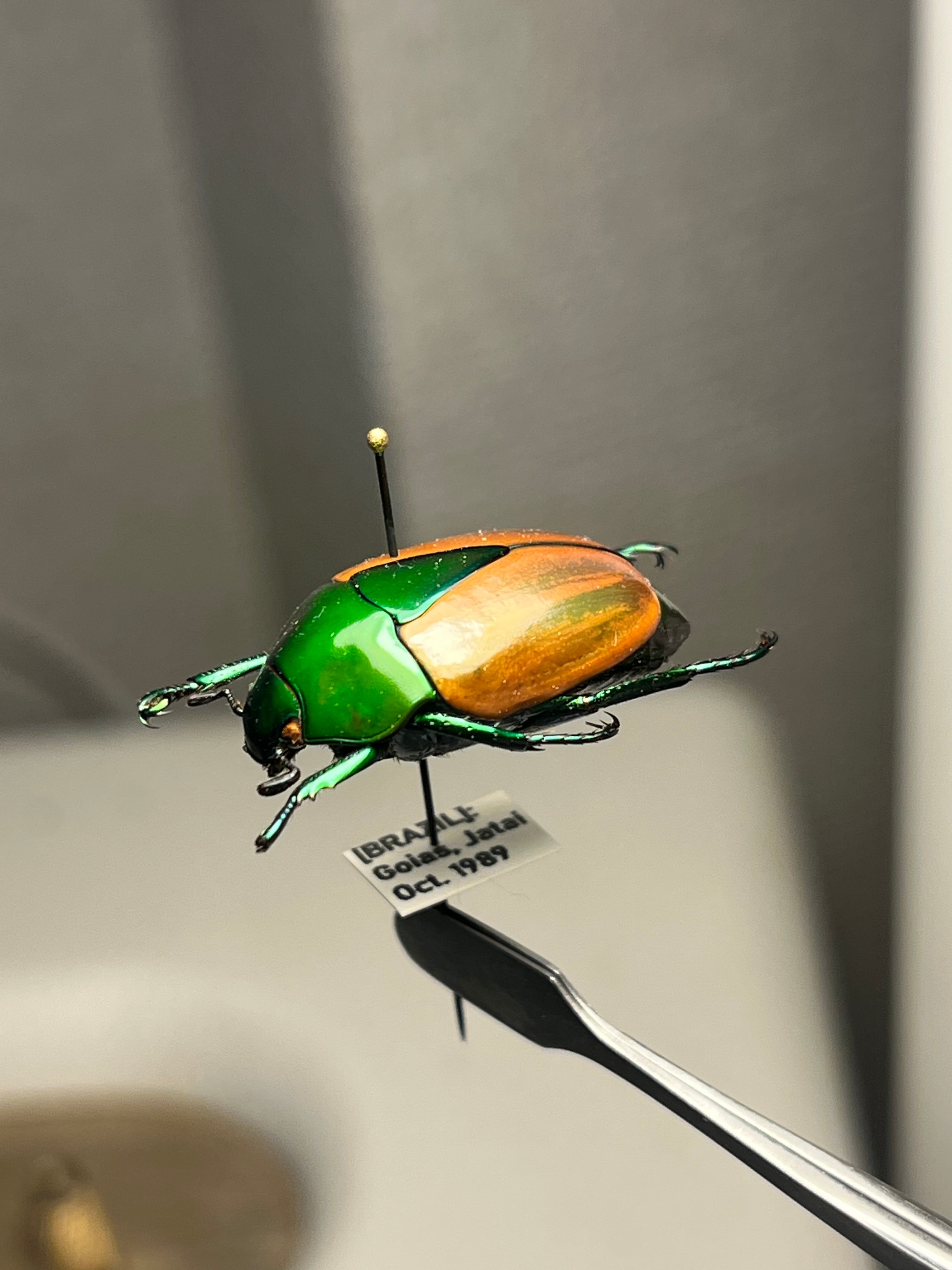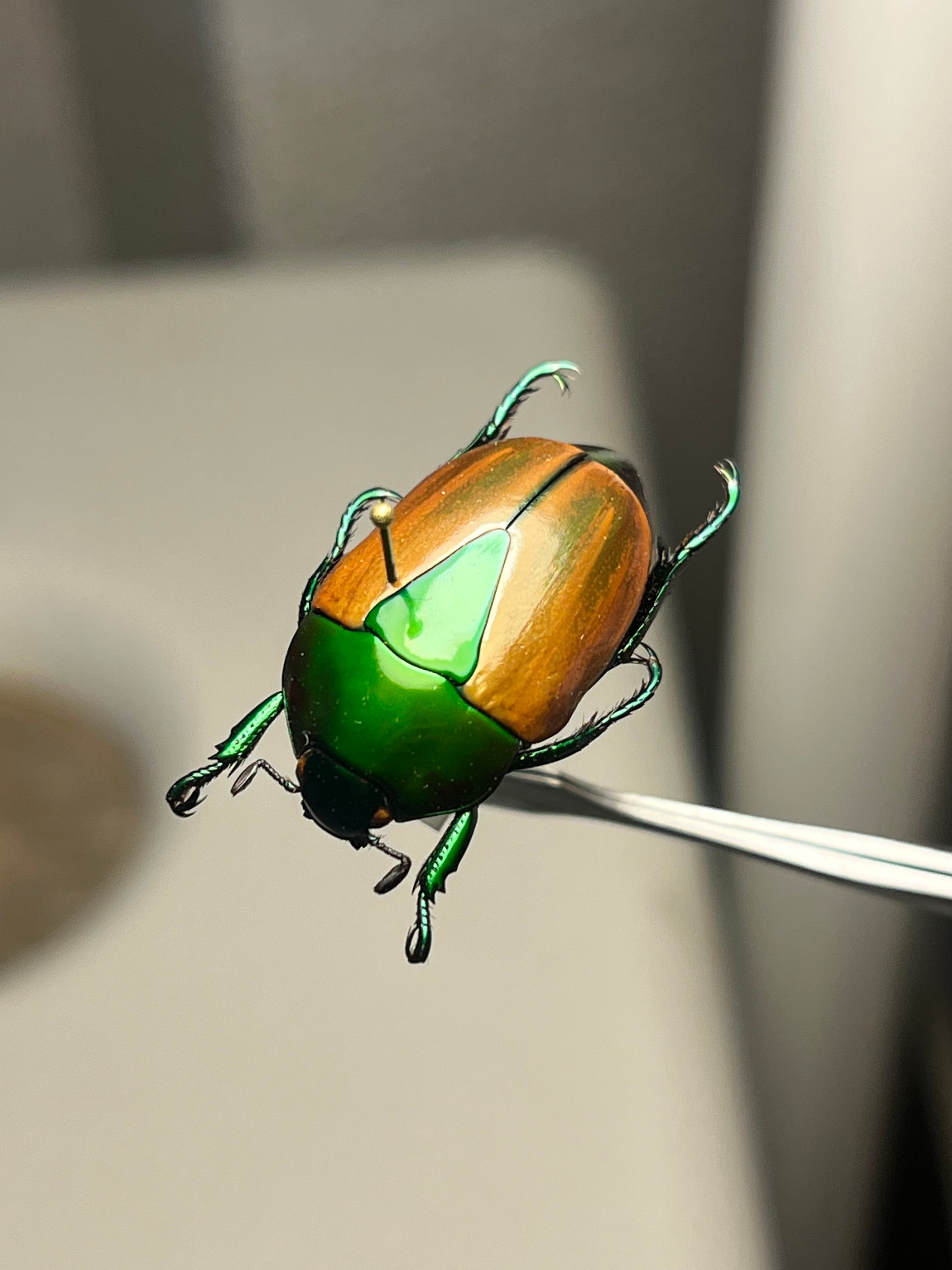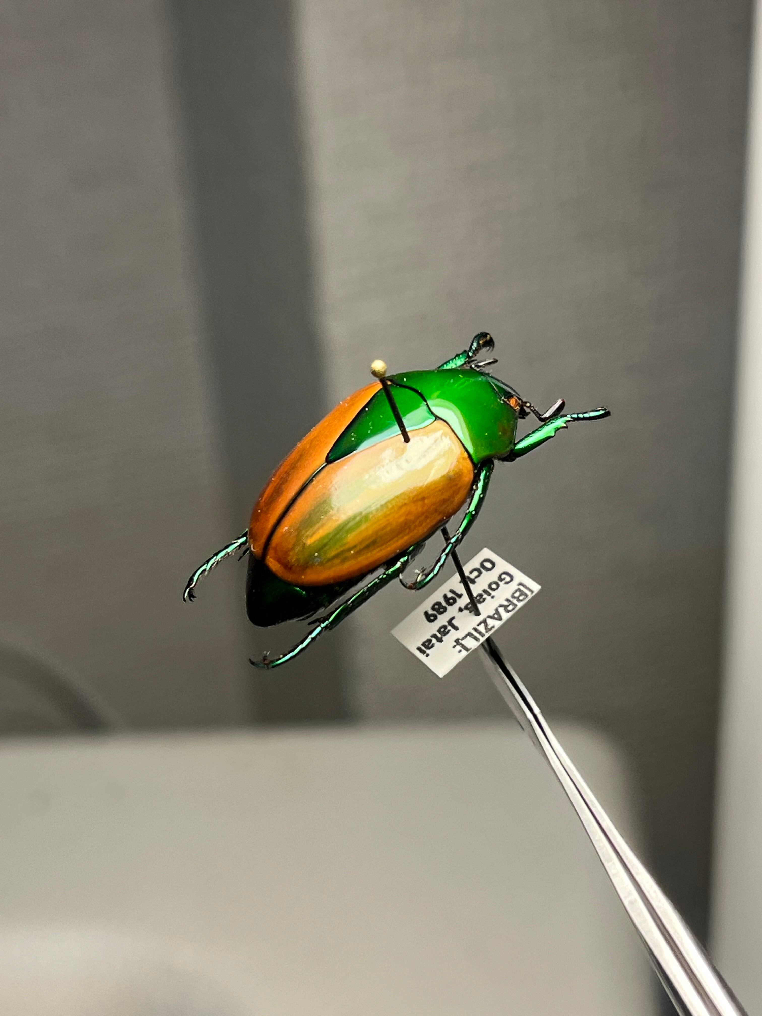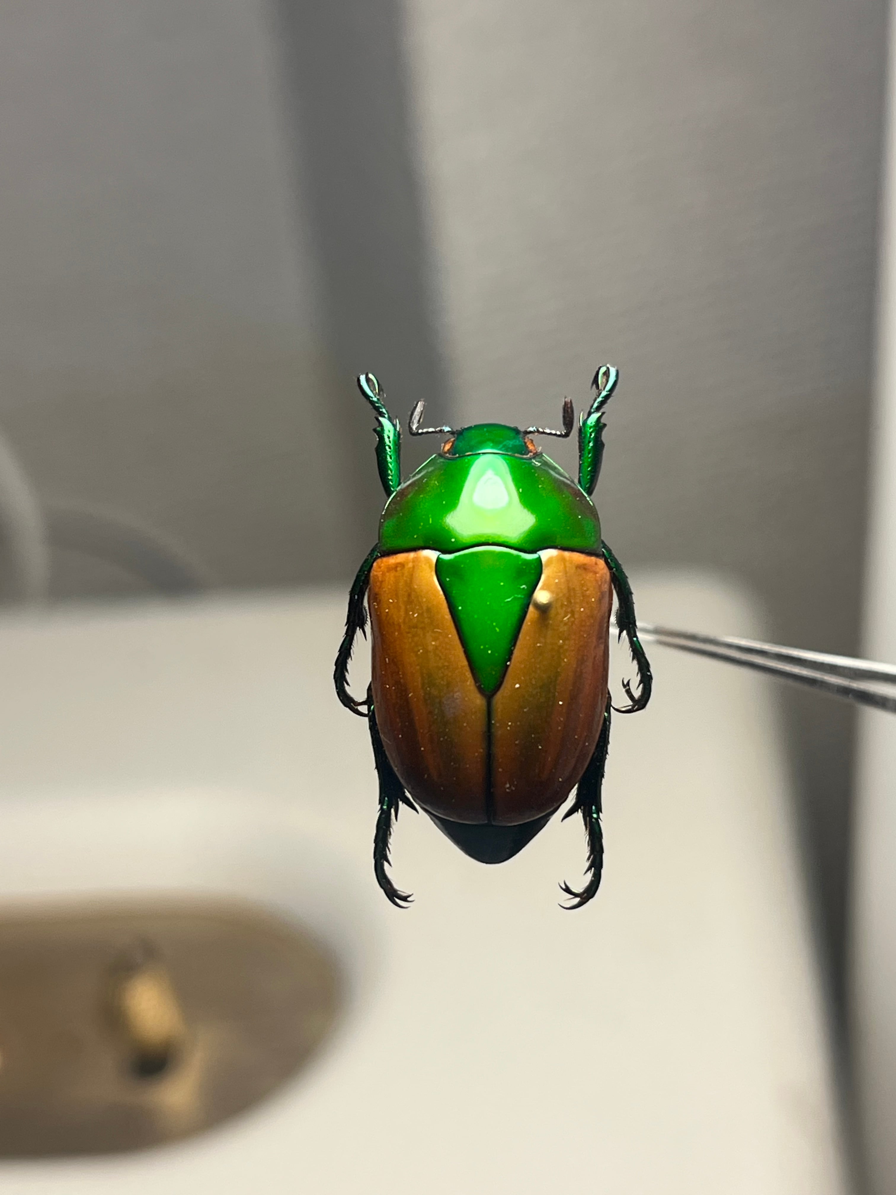 Macraspis festivaは、頭部と前胸背板(側縁を含む)に鮮やかな金属緑色を呈し、金属斑のない黄色の鞘翅とのコントラストがブラジル国旗を思わせる模様を作り出し、現地では「brasileirinho(ブラジレイリーニョ)」という愛称で呼ばれています。この虹彩効果は外骨格の構造色に由来し、微細なキチン層が可視光の波長に干渉することで光沢を生み出します。外皮には中程度からまばらに点状の模様があり、背部全体の色彩表現を高めています。一方、腹面には感覚機能のためのまばらな剛毛が見られます。