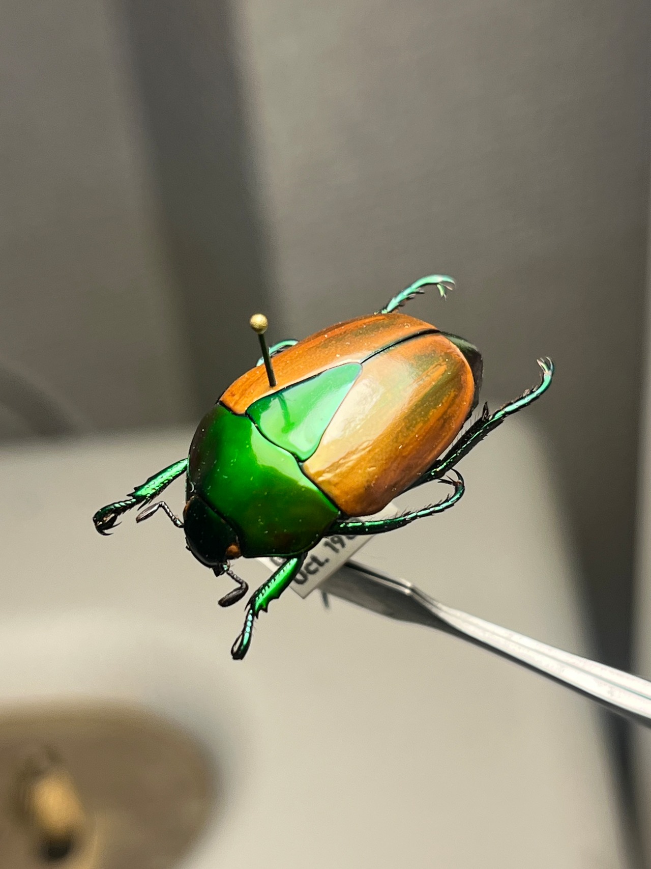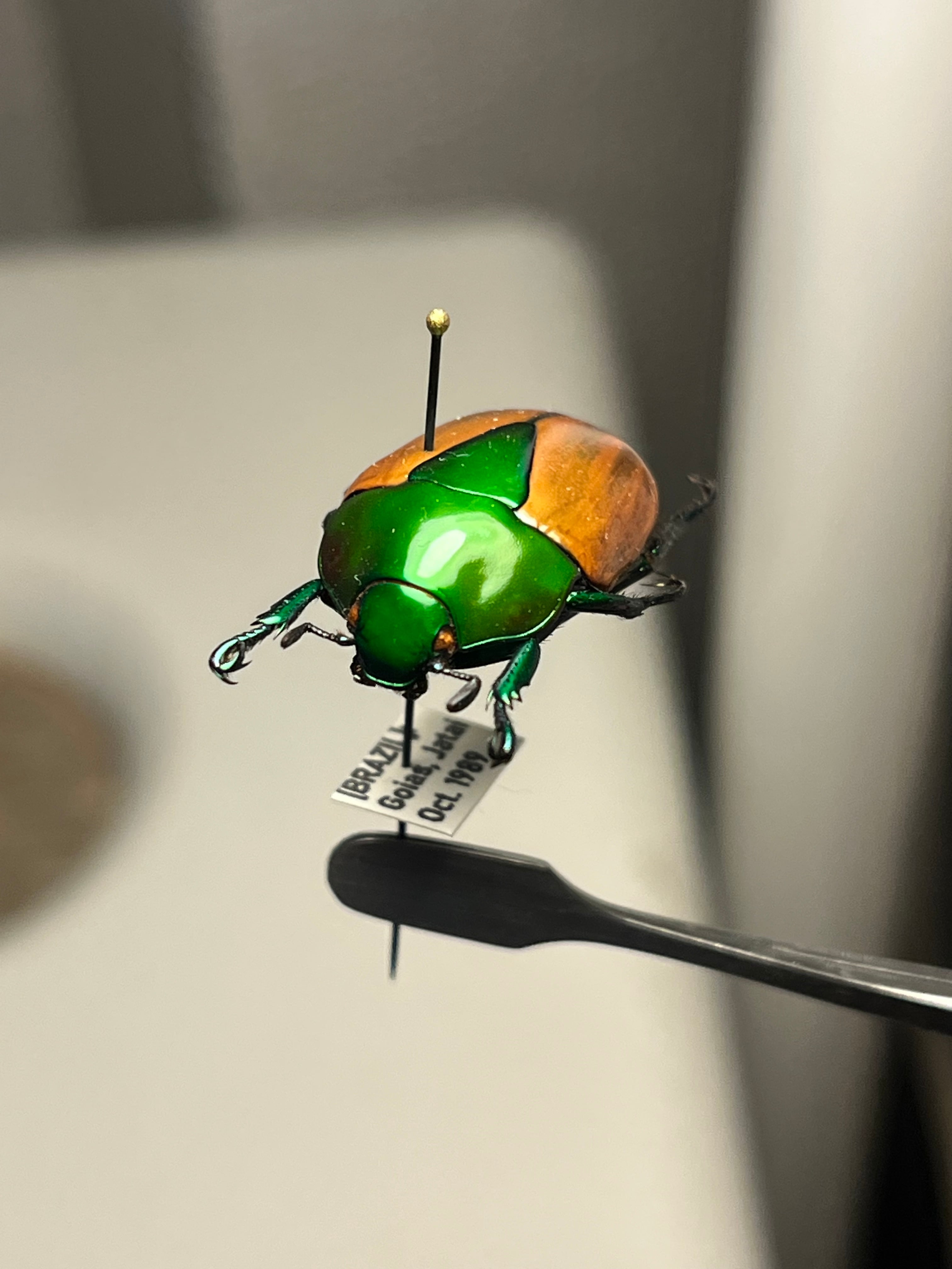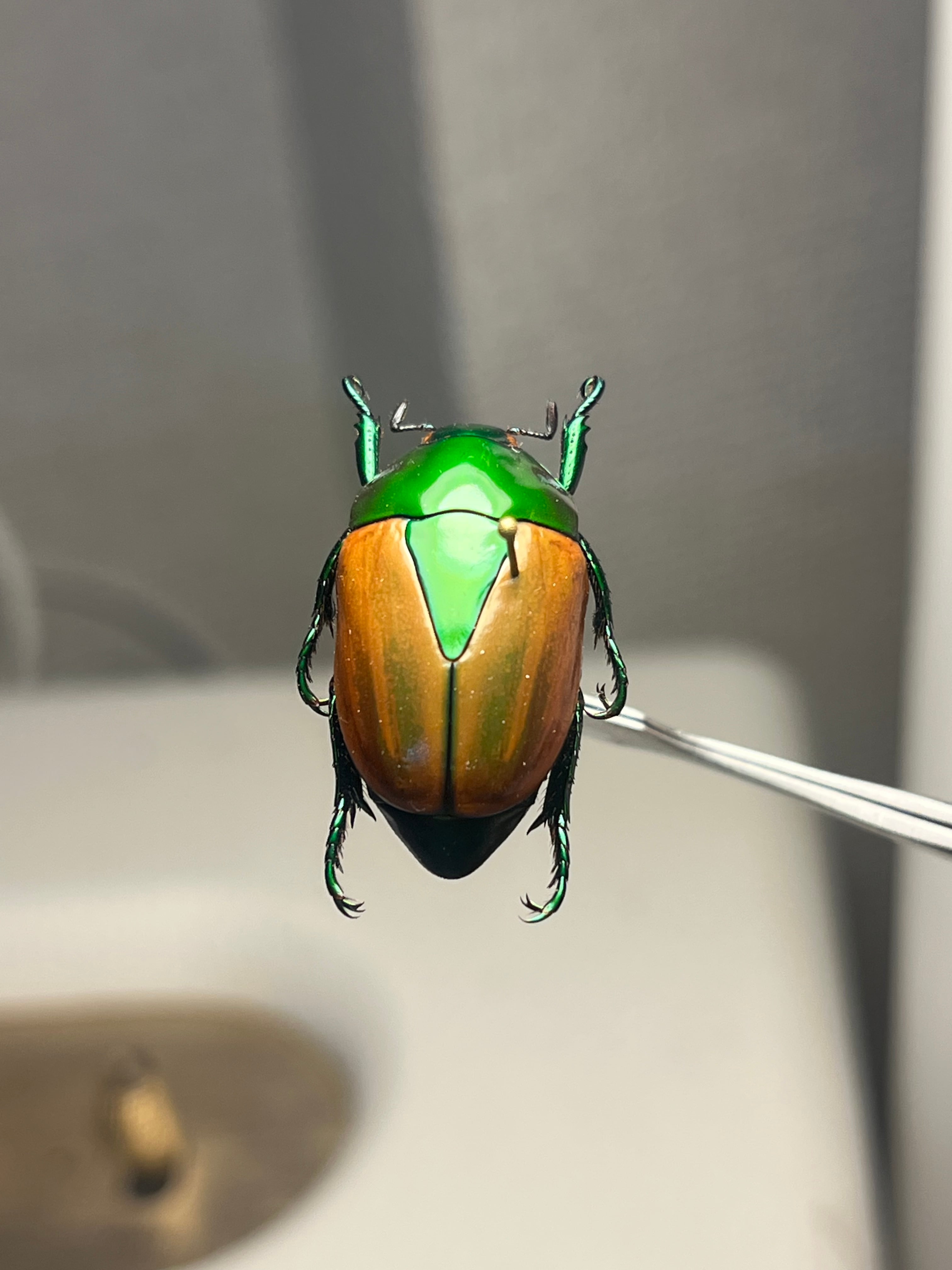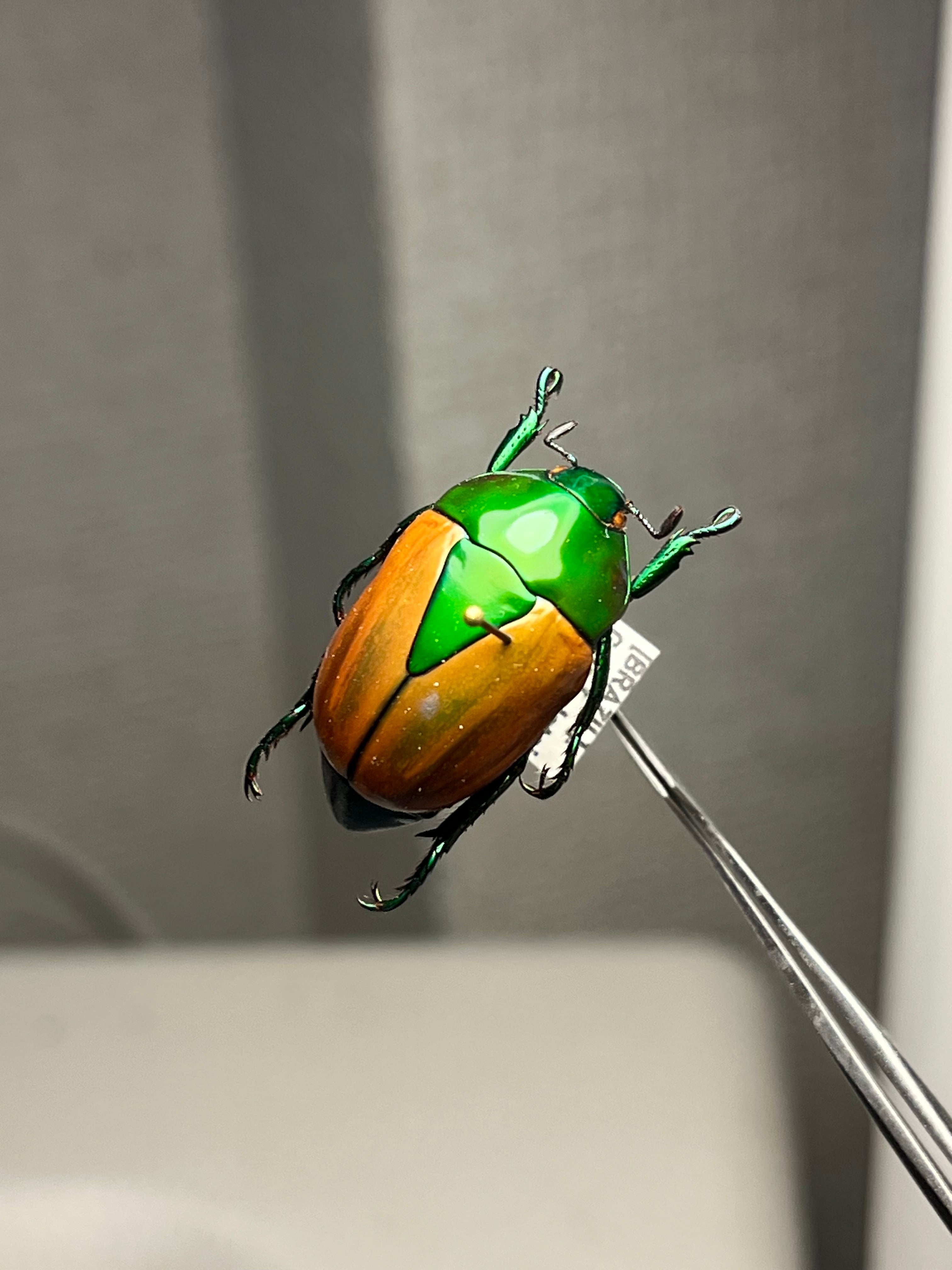 Macraspis festivaは、頭部と前胸背板(側縁を含む)に鮮やかな金属緑色を呈し、金属斑のない黄色の鞘翅とのコントラストがブラジル国旗を思わせる模様を作り出し、現地では「brasileirinho(ブラジレイリーニョ)」という愛称で呼ばれています。この虹彩効果は外骨格の構造色に由来し、微細なキチン層が可視光の波長に干渉することで光沢を生み出します。外皮には中程度からまばらに点状の模様があり、背部全体の色彩表現を高めています。一方、腹面には感覚機能のためのまばらな剛毛が見られます。