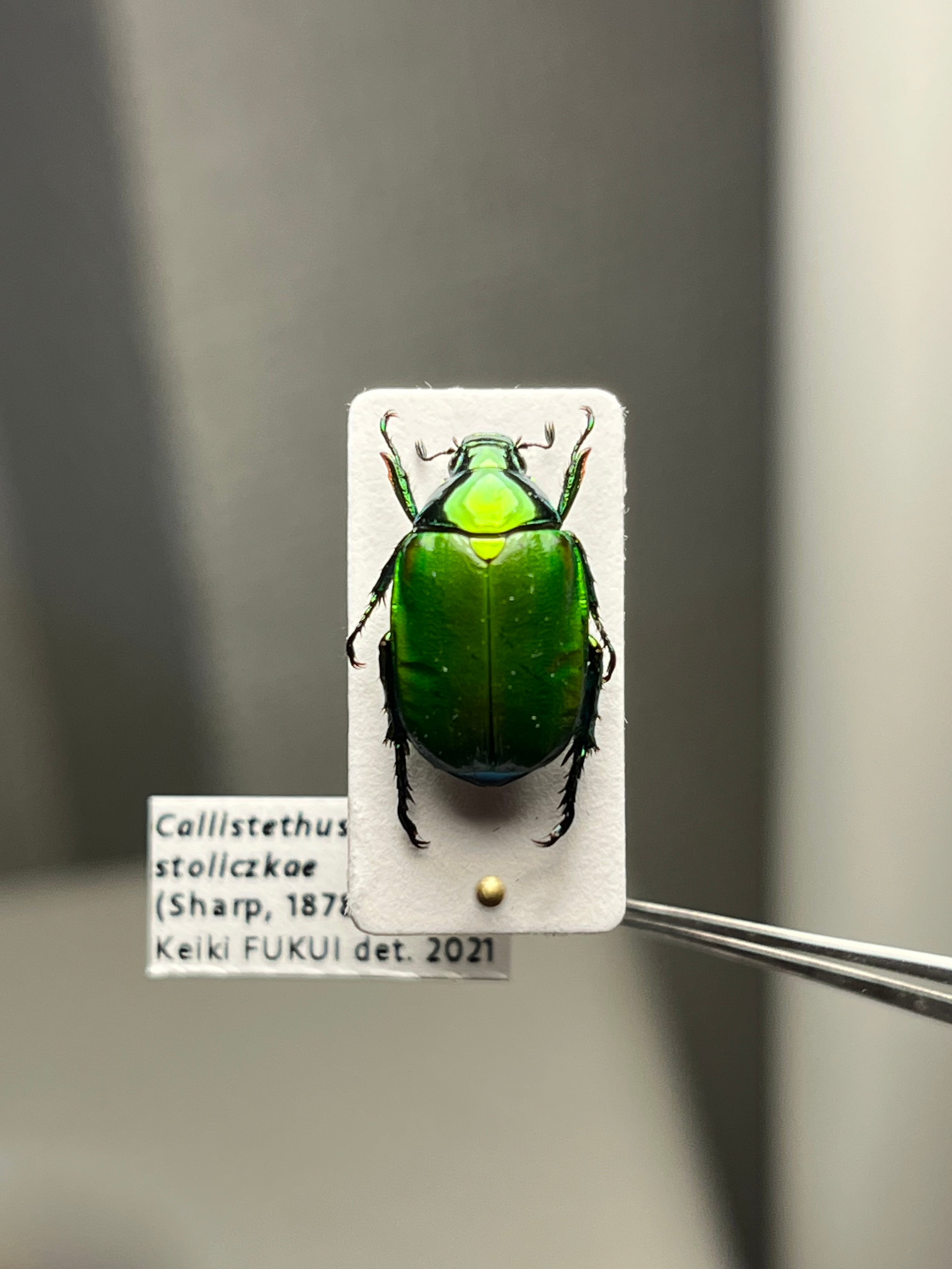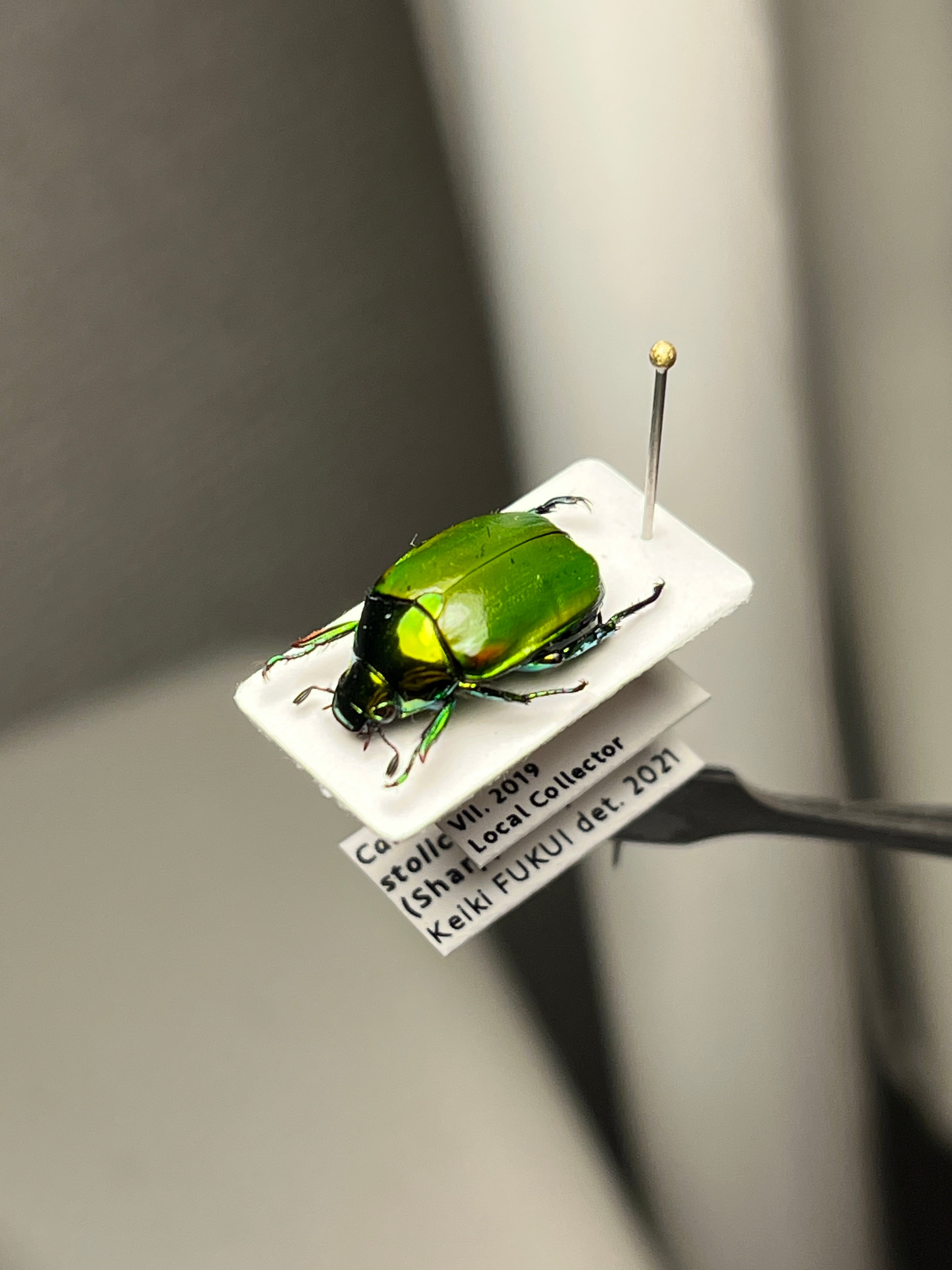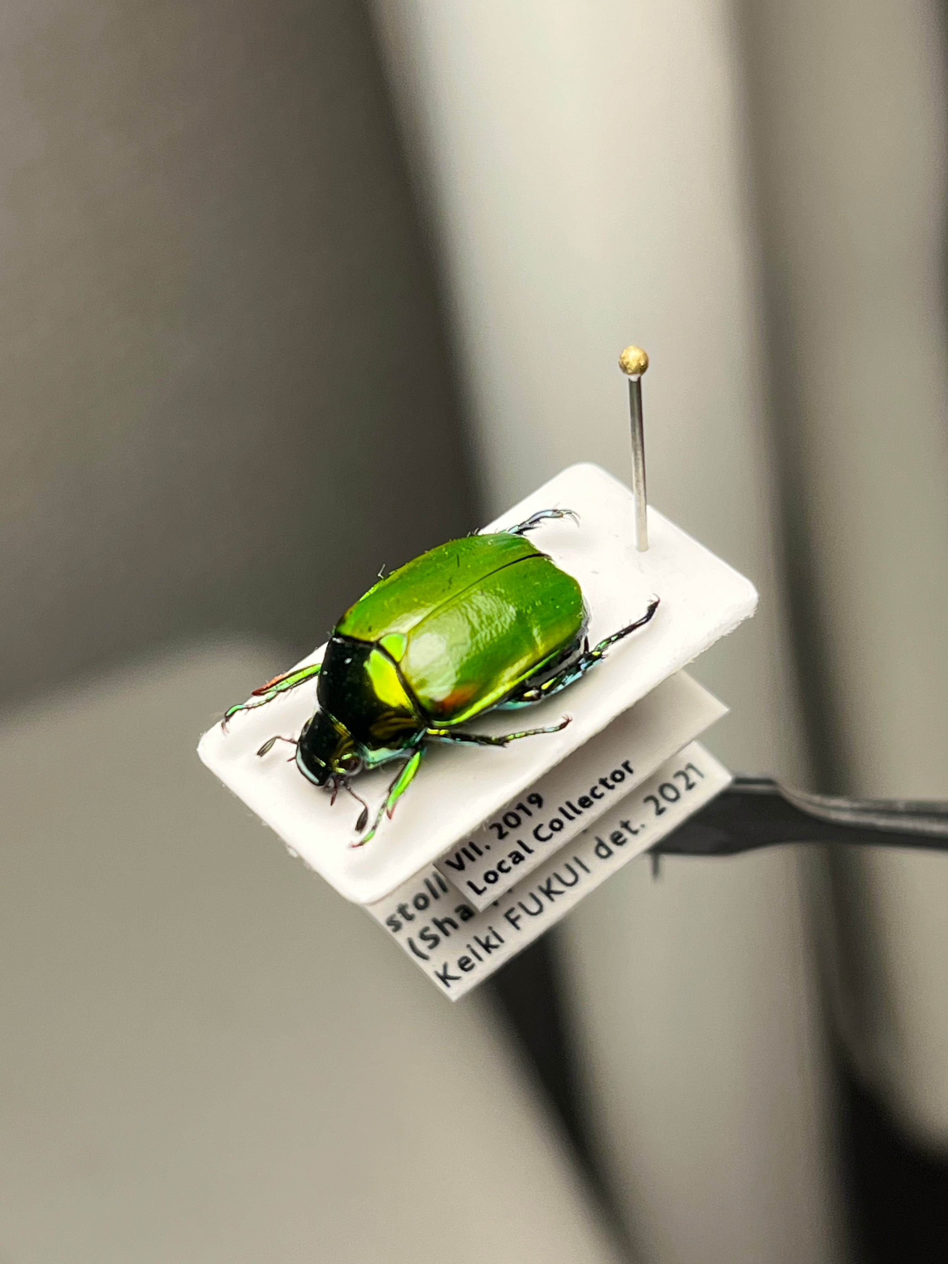 頭だけプラチナコガネのように光り輝いているスジコガネの一種です。