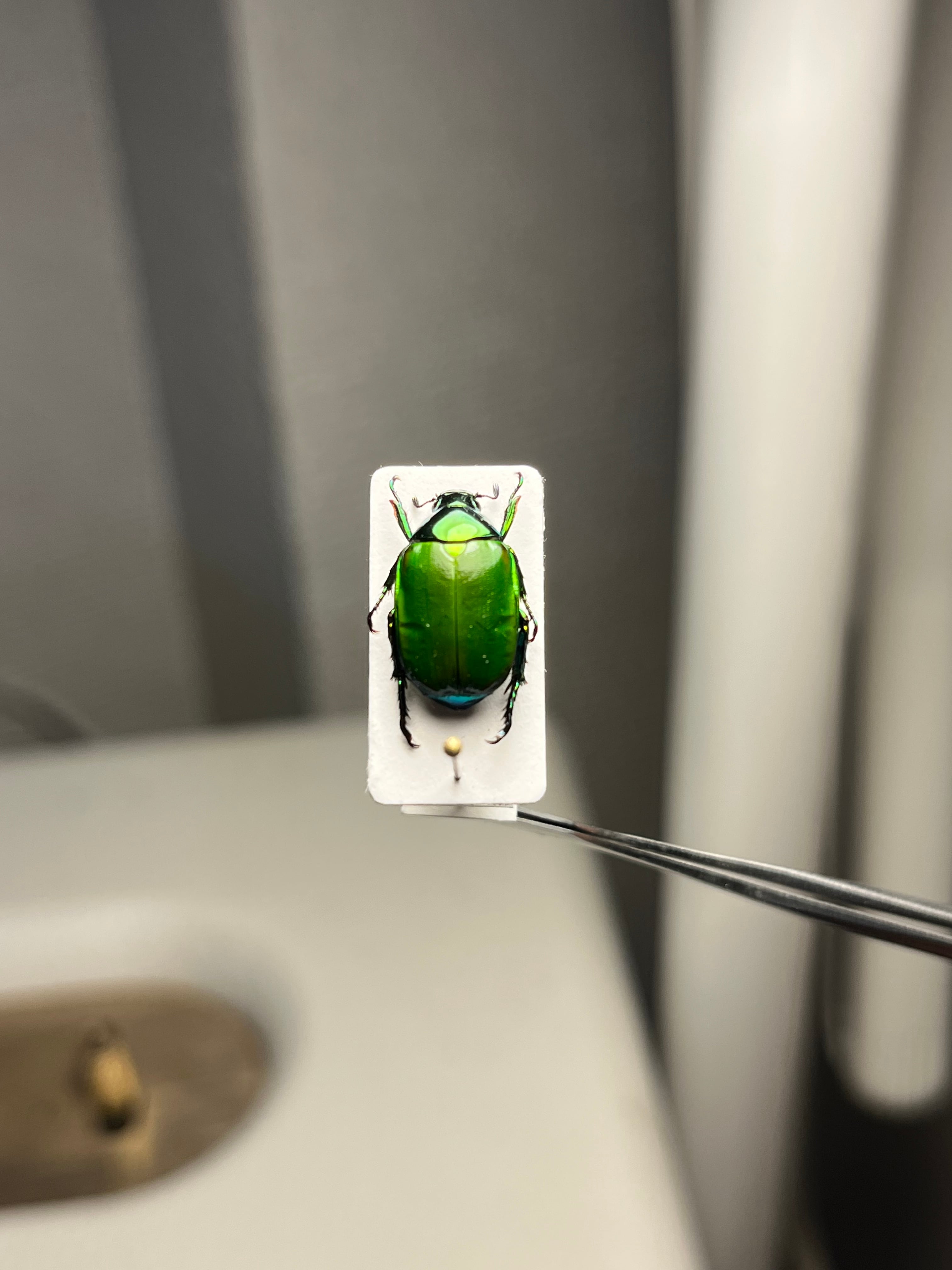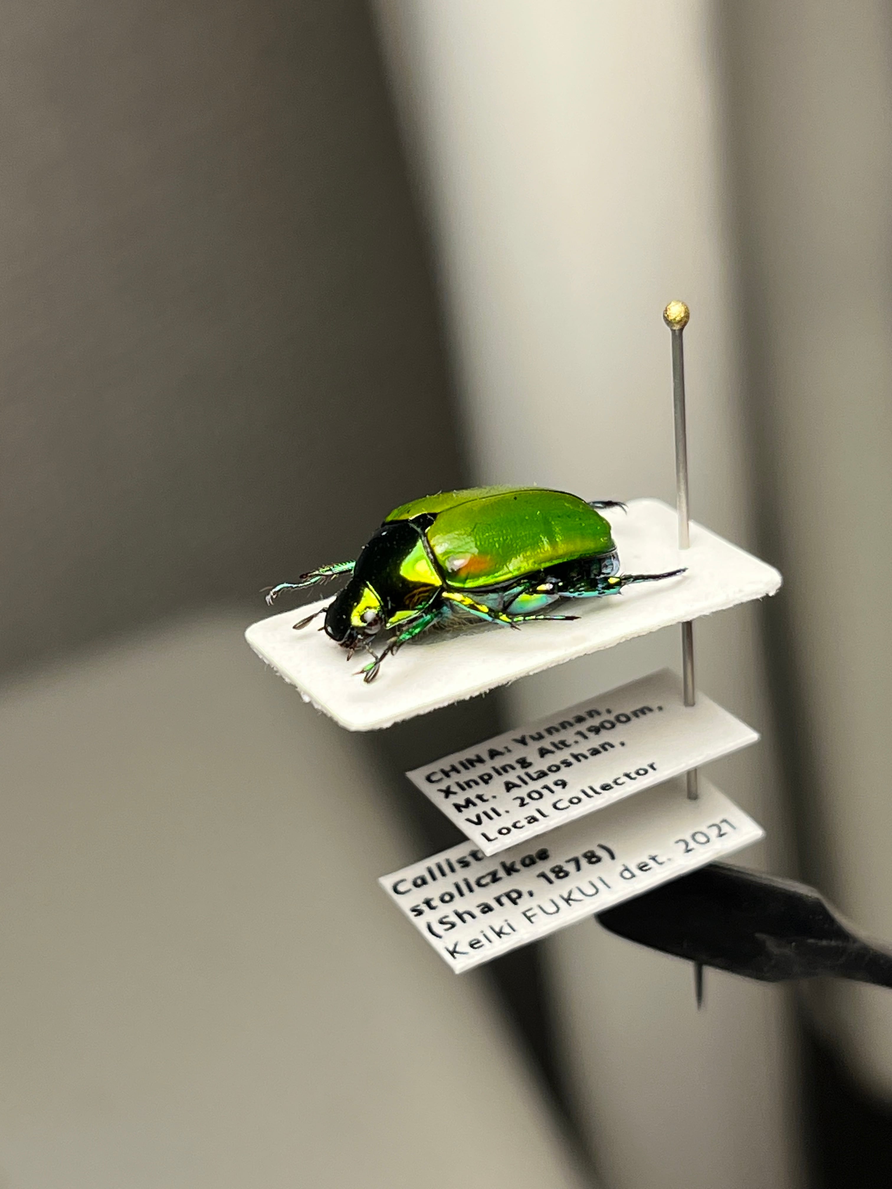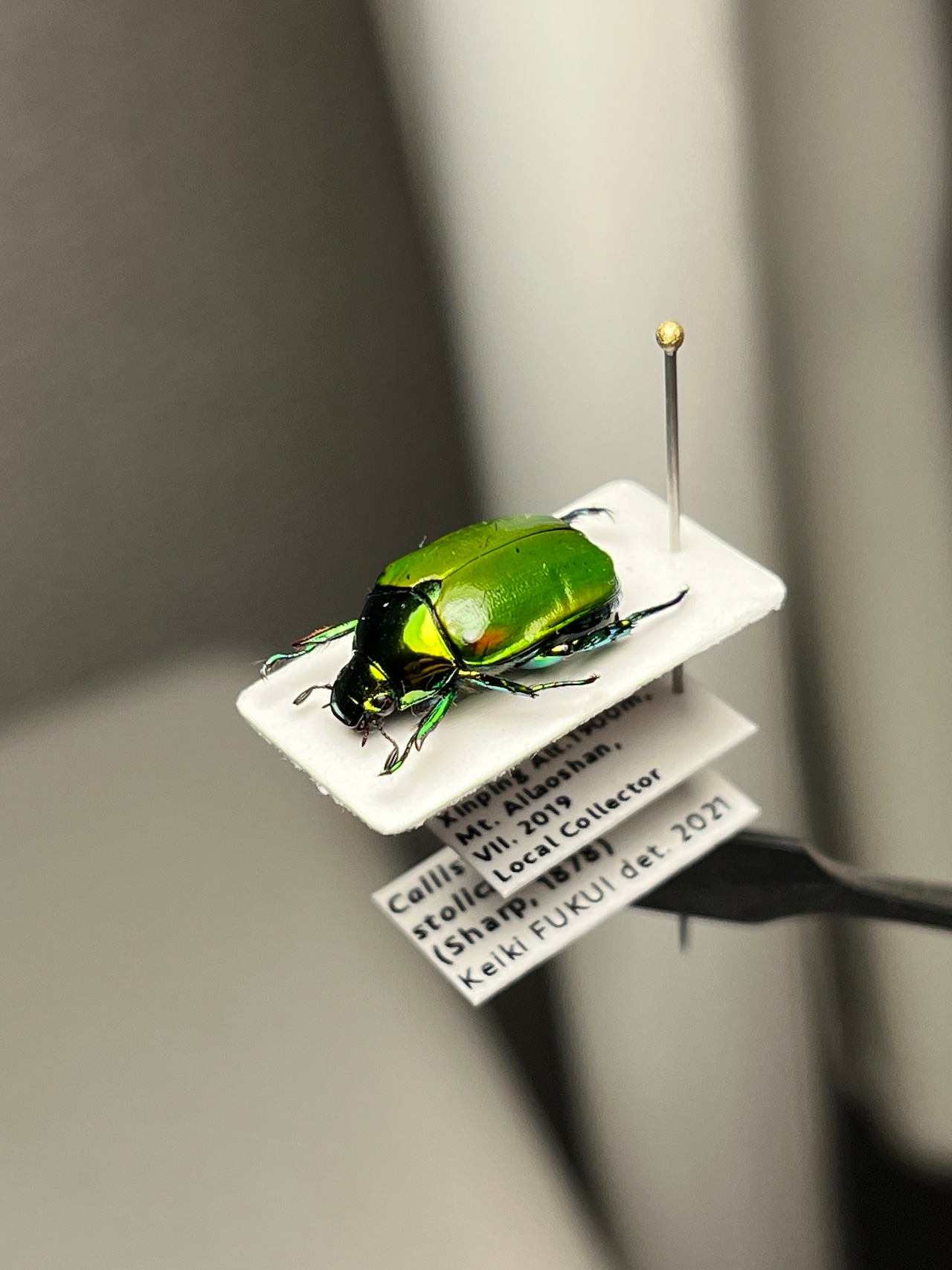 頭だけプラチナコガネのように光り輝いているスジコガネの一種です。