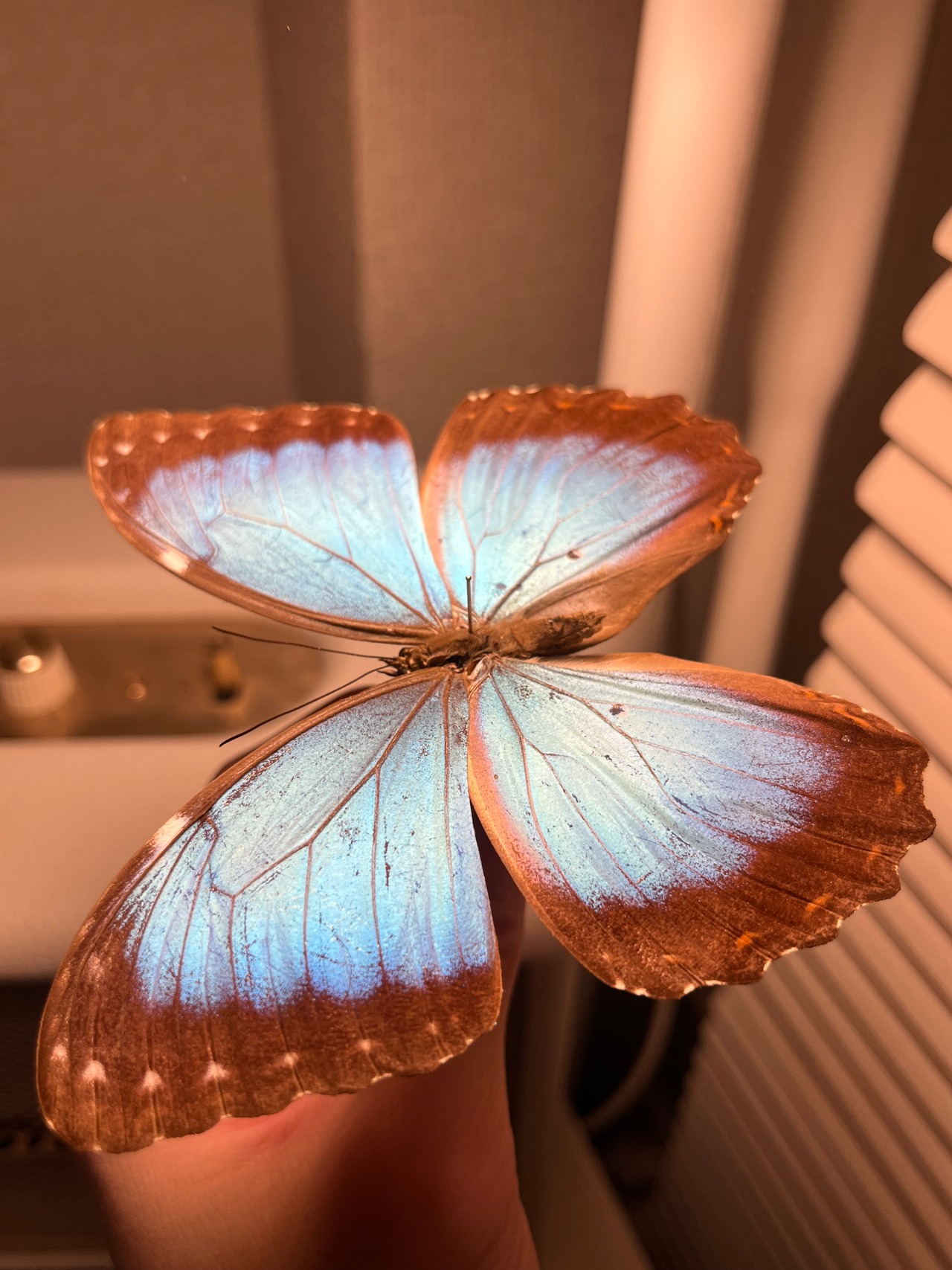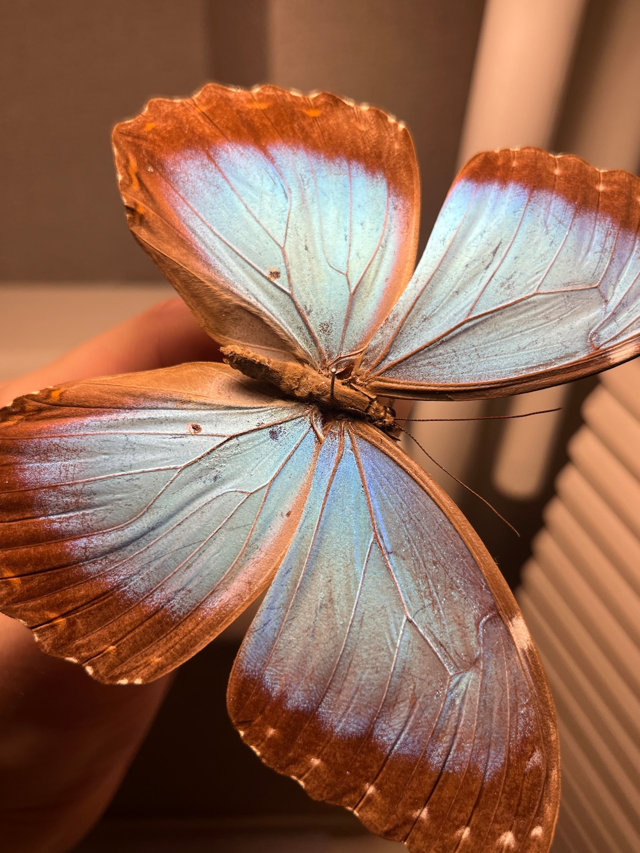 モルフォ属は、羽の背側に鮮やかな青色が見られることで識別できます。虹彩のような青色は、羽の表面にある層状の鱗粉による光の反射と干渉によって生じます。それぞれの鱗粉には隆起した縞模様があり、これが干渉を引き起こします。M. peleidesには、覆鱗粉と地鱗粉の2種類の鱗粉があります。地鱗粉は、覆鱗粉よりも鮮やかな虹彩を呈します。