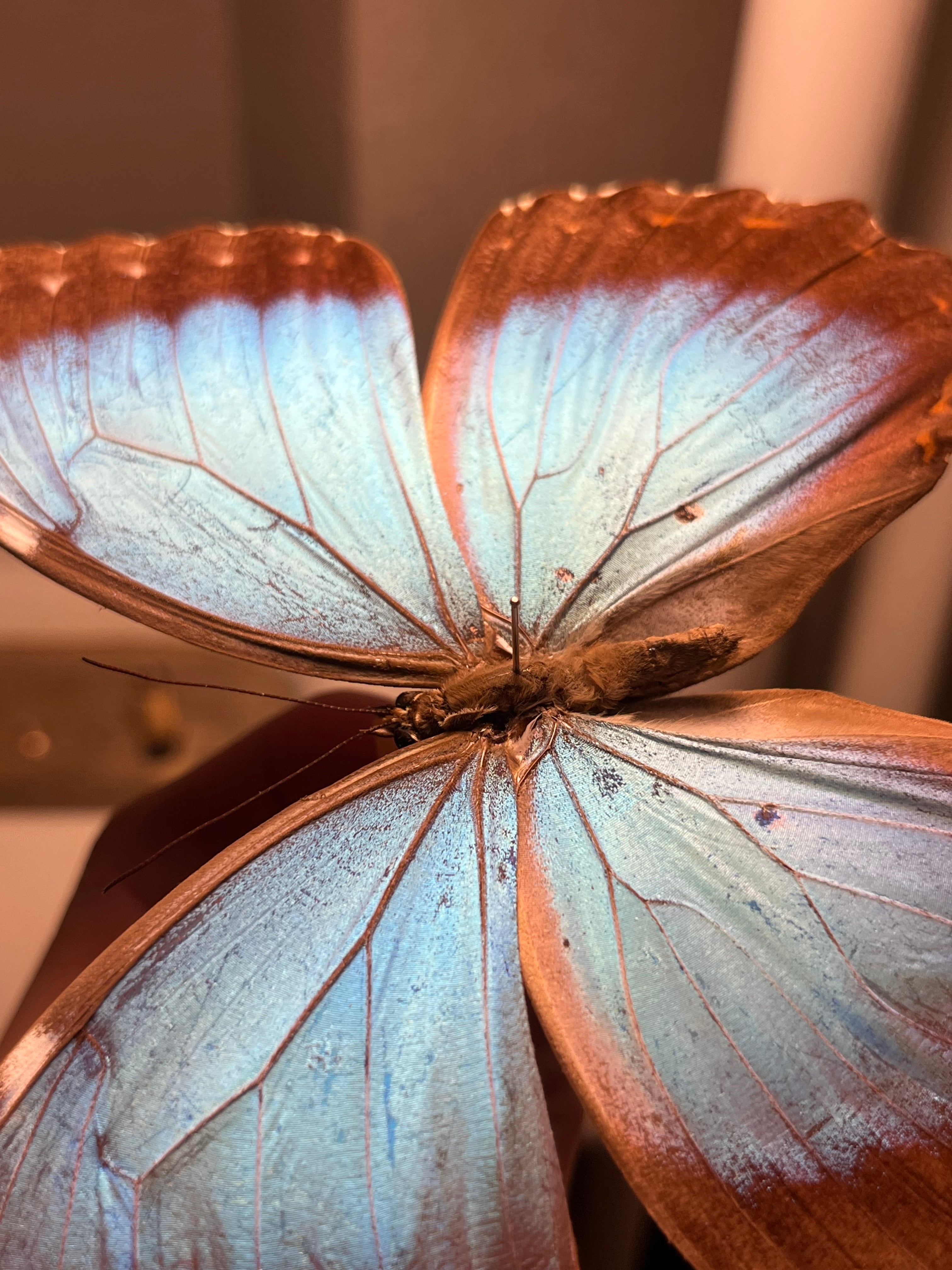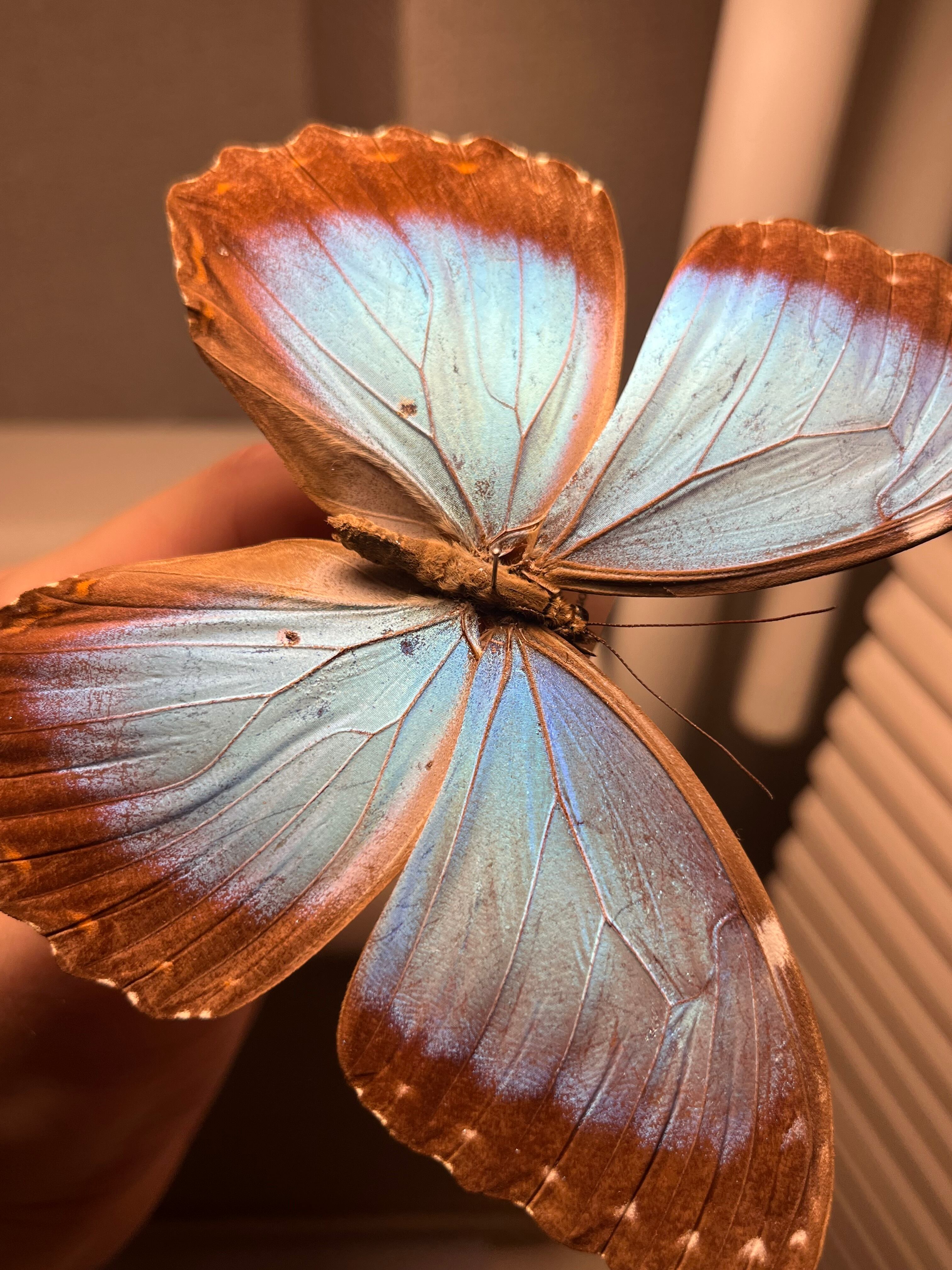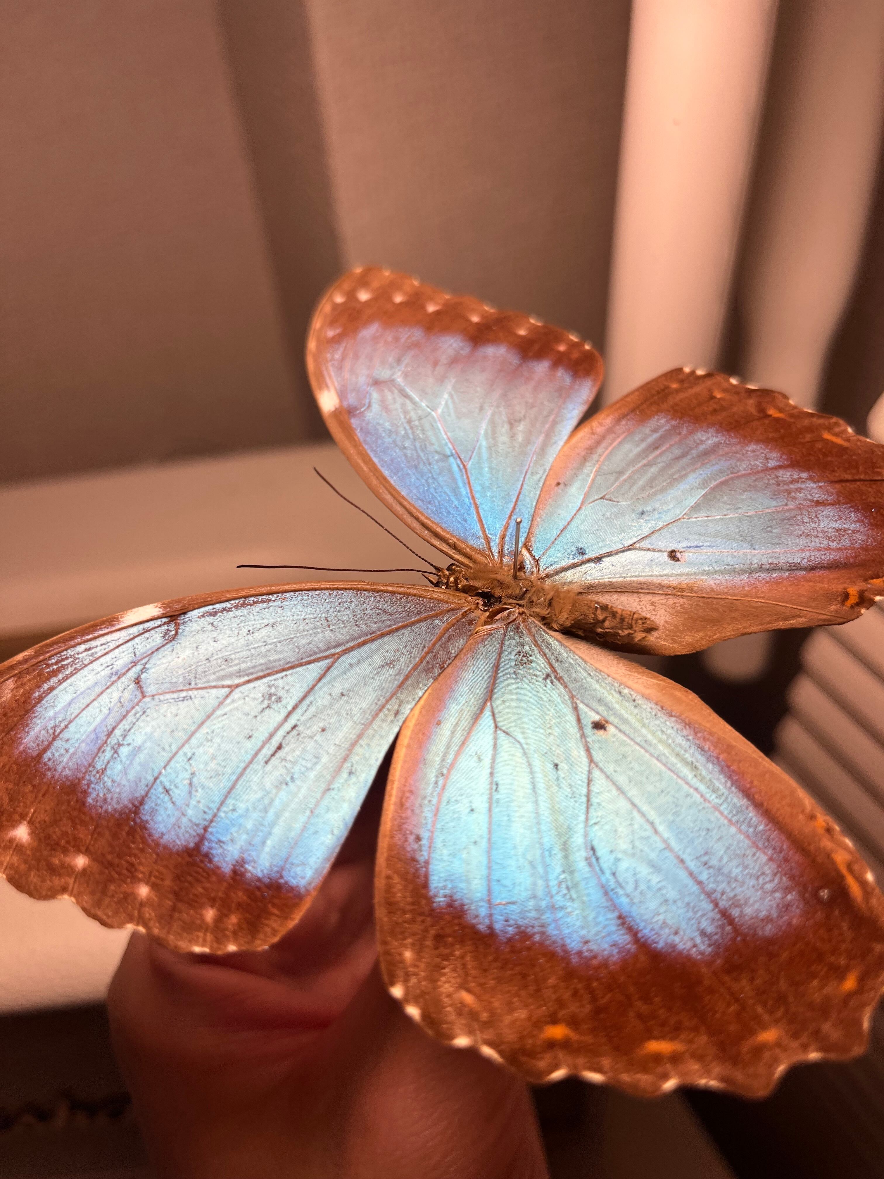蝶の鼓膜の聴覚器官は形態的に多様であり、モルフォ・ペレイデスは特に珍しい鼓膜の形態を有するため、徹底的に研究されてきました。モルフォ・ペレイデスの聴覚器官はフォーゲル器官と呼ばれ、前翅の腹側に位置しています。フォーゲル器官は内膜と外膜が別々に存在します。これらの膜は異なる振動をし、M. peleidesが検知できる周波数の範囲を拡大する方法であると考えられています。M. peleidesは、独自のフォーゲル器官により、振幅と周波数の両方の識別が可能です。M. peleidesの独特の聴覚器官は、鳥類の捕食者を検知できるように適応していると考えられています。
