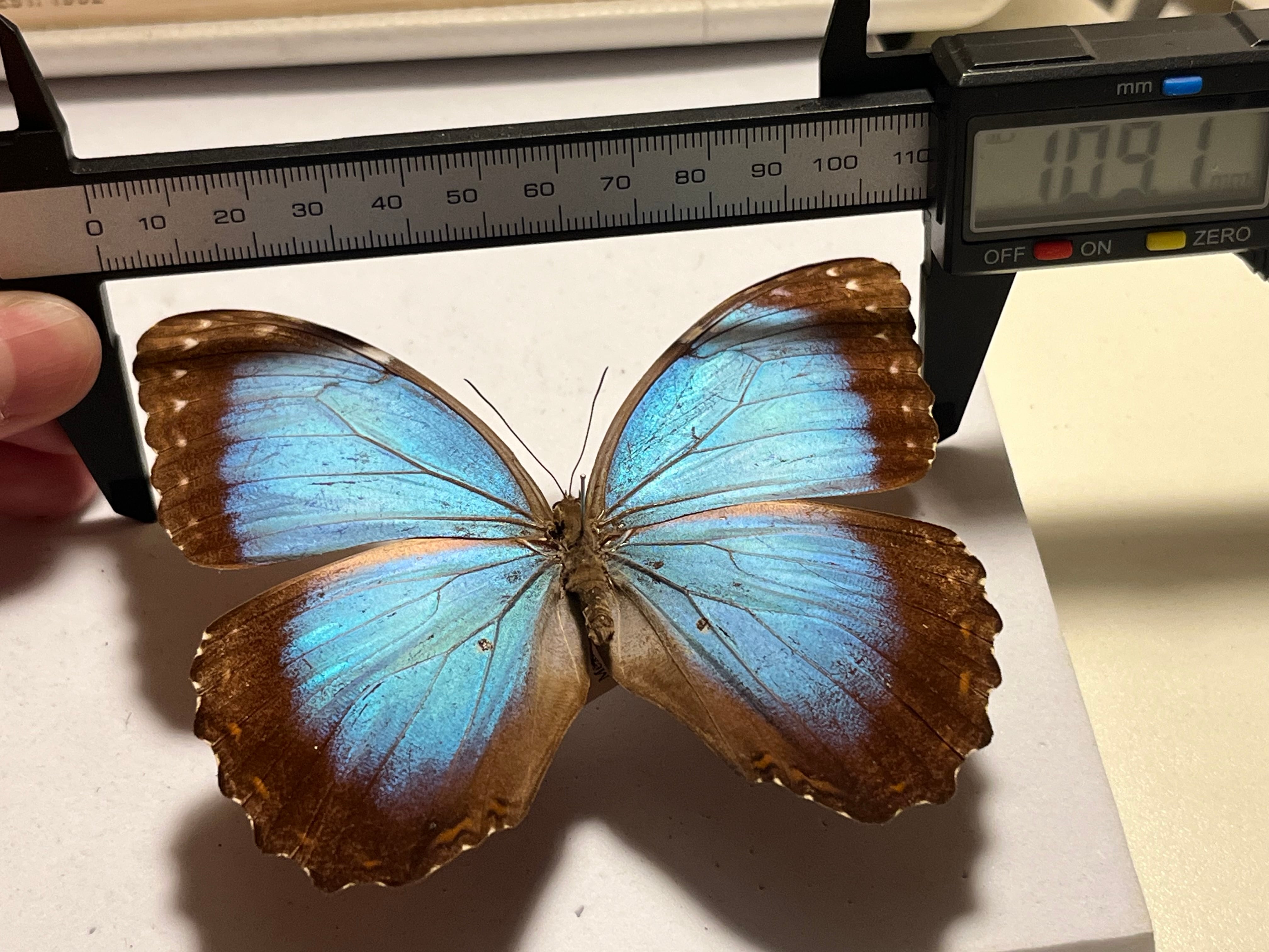M. peleidesは大型の蝶と考えられており、成虫の翼開長は約13~20cmです。Morpho peleides hyacinthusなど、一部の亜種は、平均的なM. peleides亜種よりも小型です。