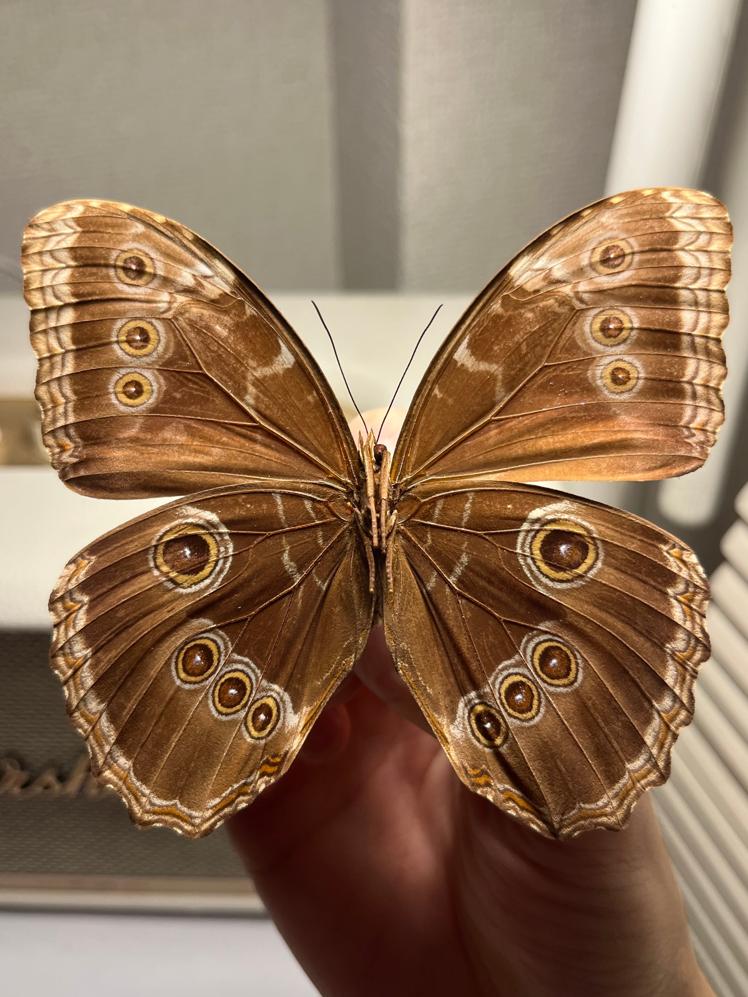 M. peleidesの羽の腹側は、茶色、赤、白で、はっきりとした眼紋があります。これらの眼紋は、捕食者への威嚇、またはカモフラージュとして捕食者から身を守る役割を果たします。M. peleides の羽の腹側と背側の違いを示す更なる例を、こちらでご覧いただけます。