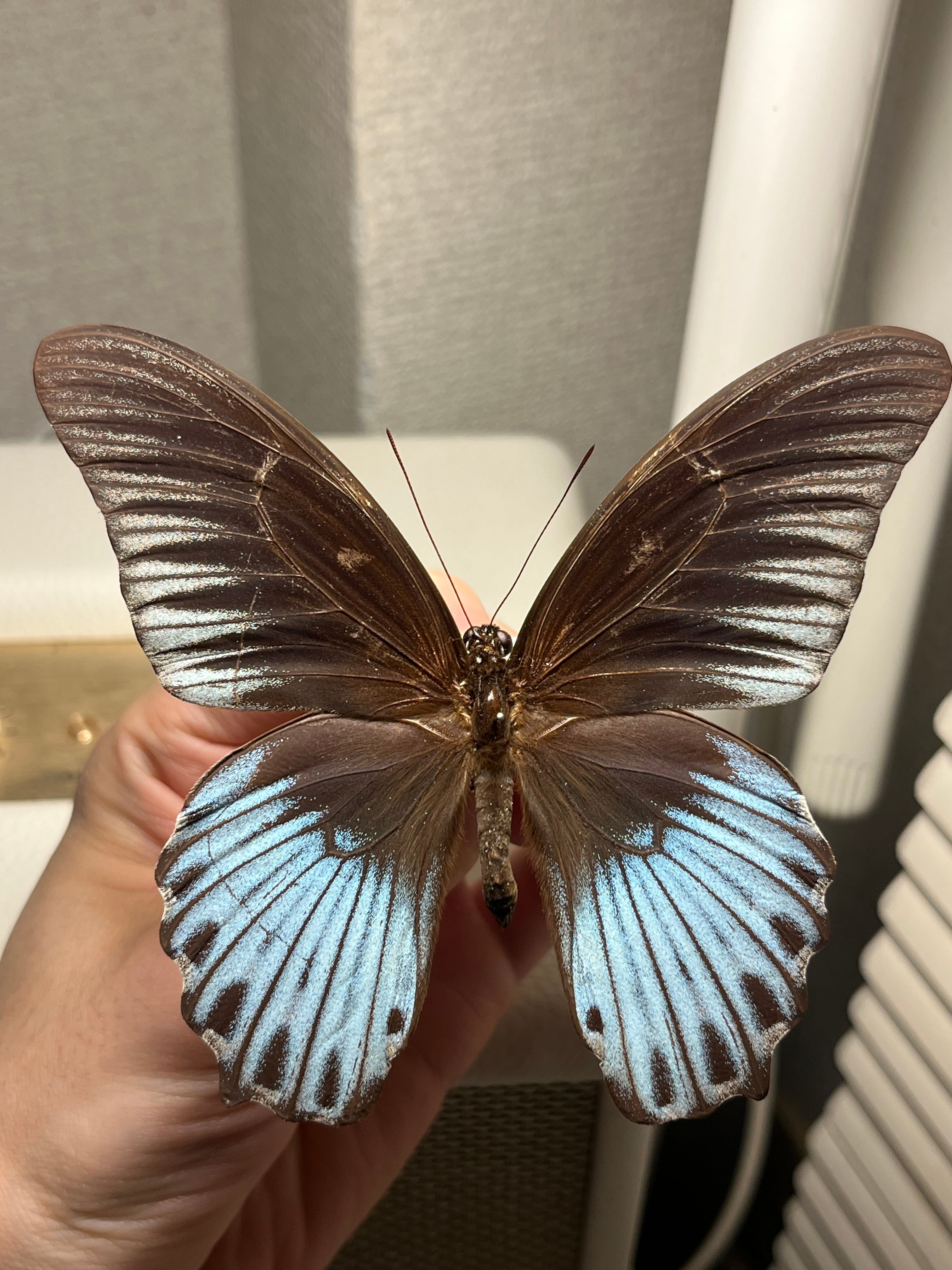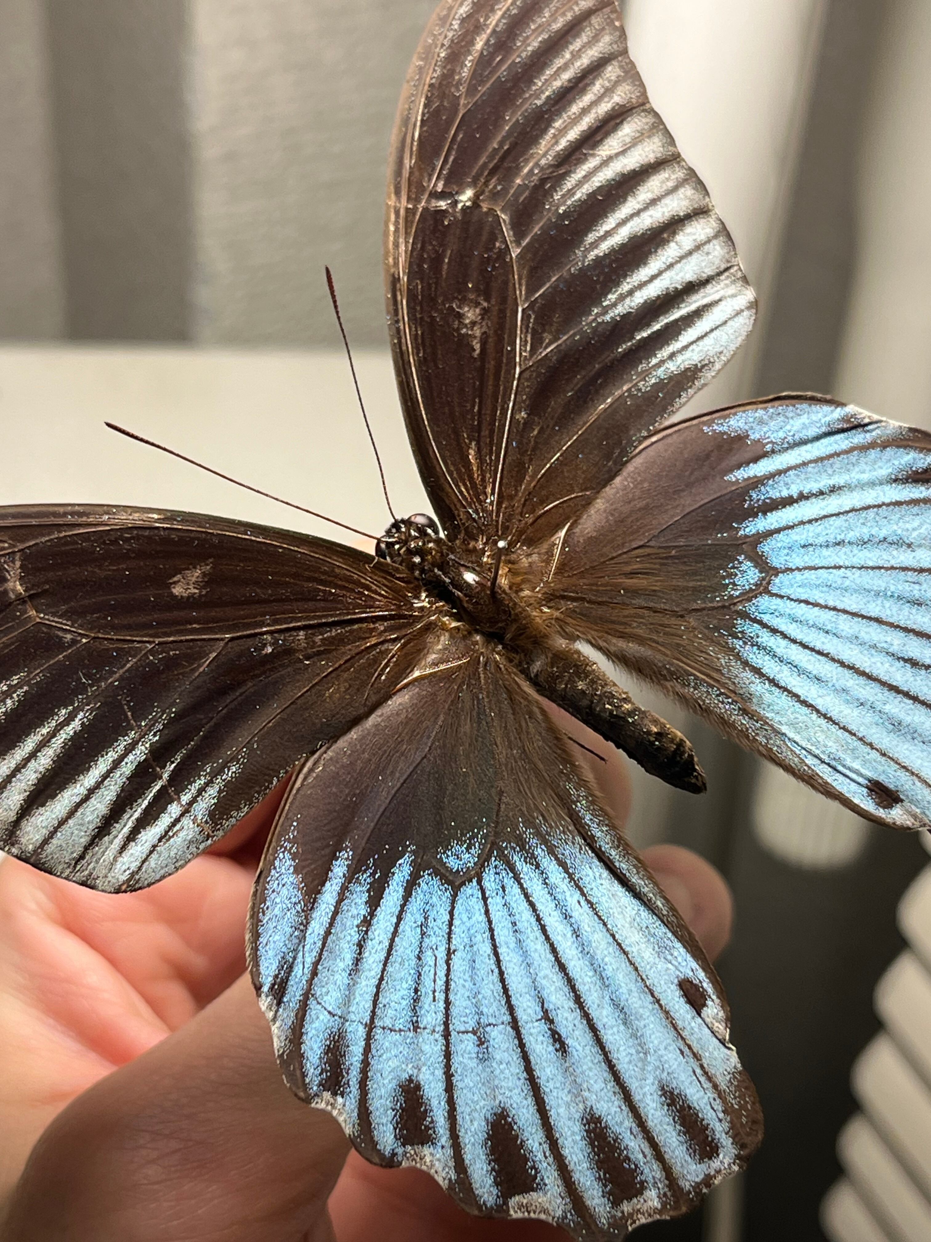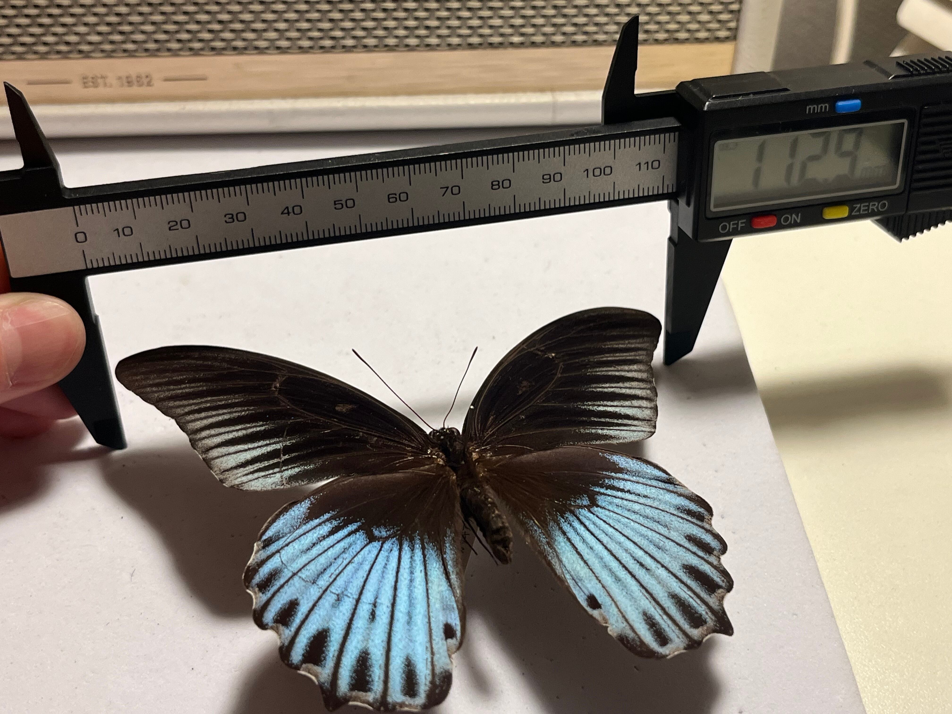 雄。尾部がなく、上面は濃い青から黒色です。前翅の羽根基部に赤い条線がある場合とない場合があります。