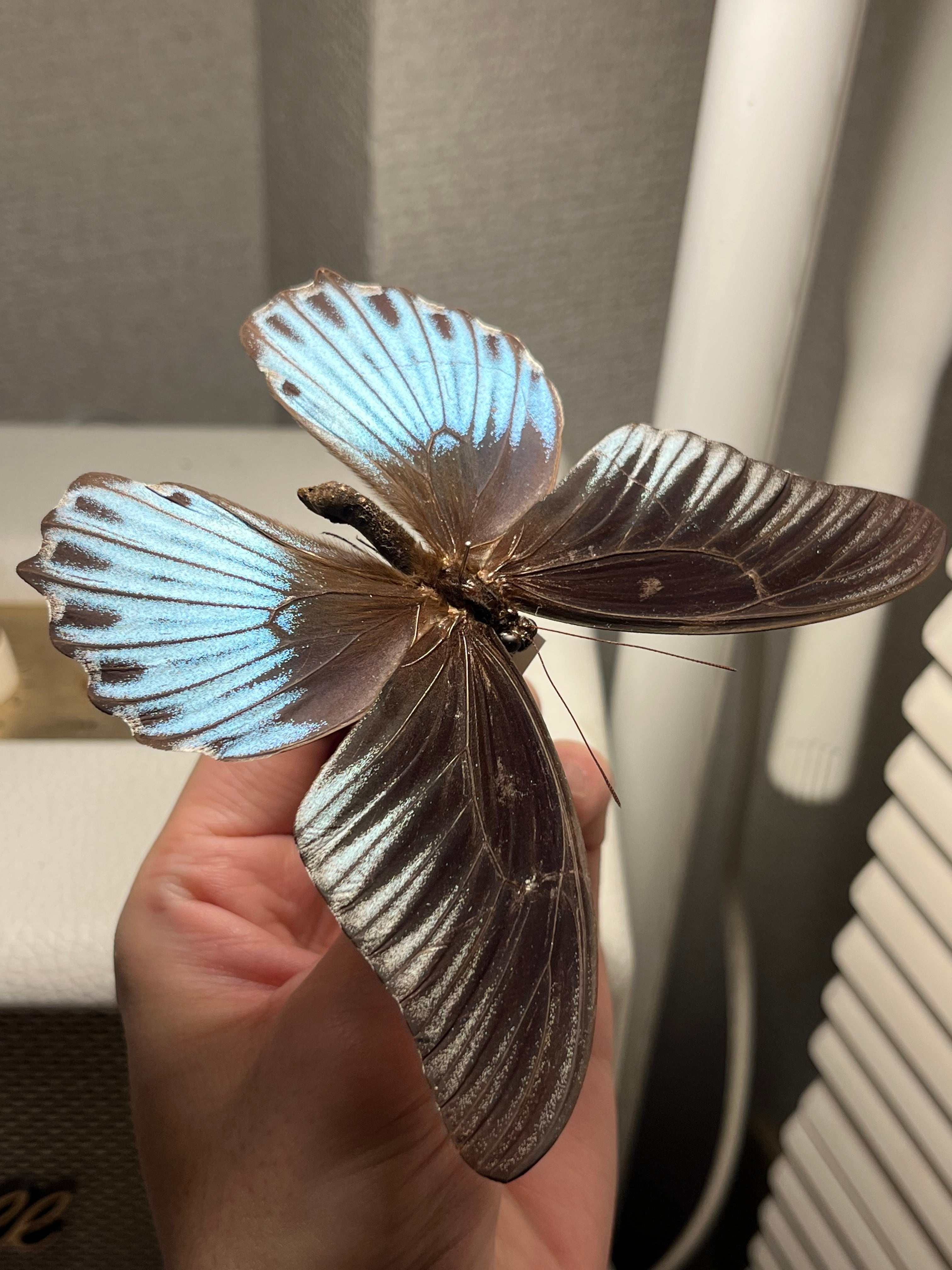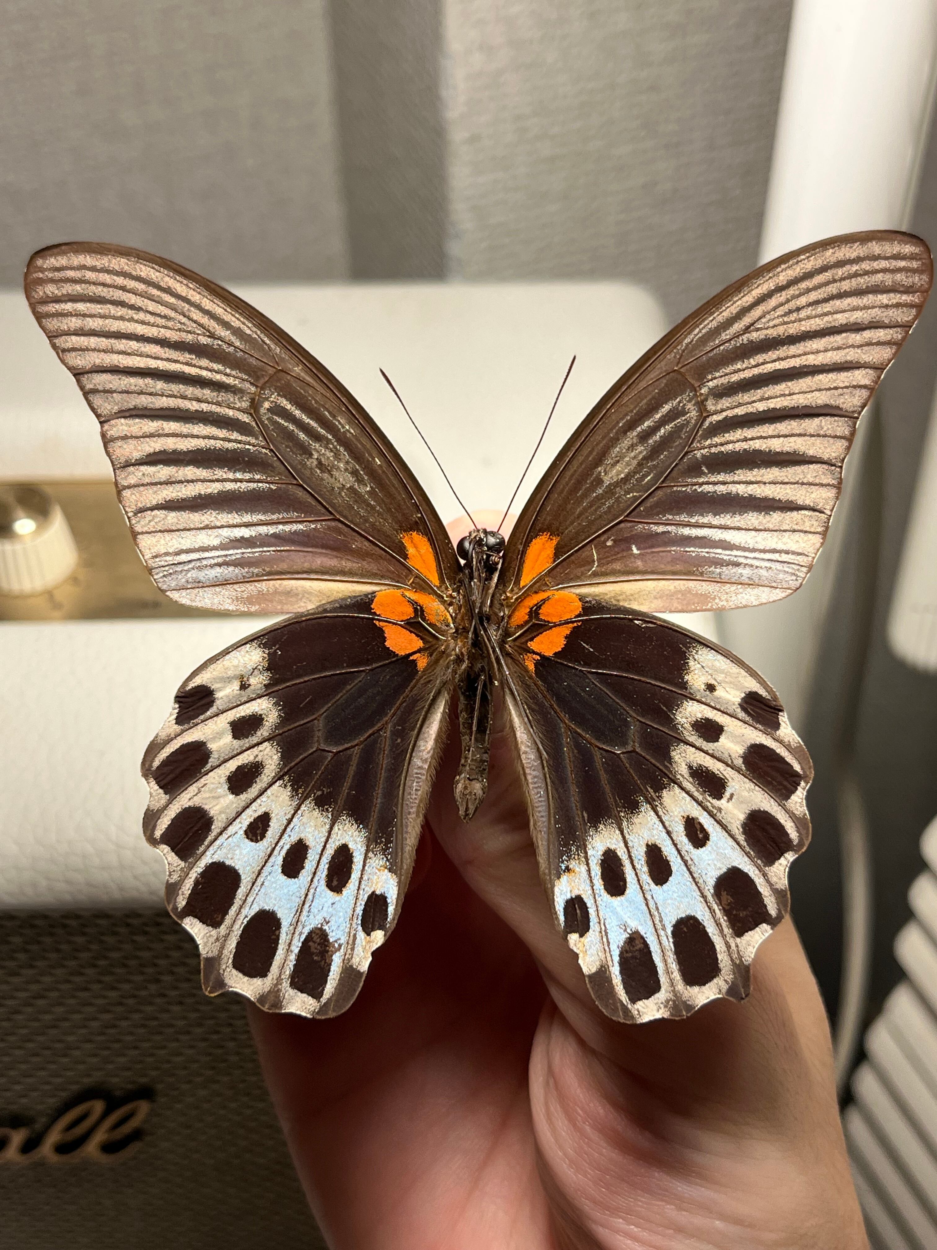 雌。尾部がありません。前翅上面の地色はセピア色で、灰白色の条線があります。羽根基部の3分の1は赤色で、外側に向かって白色の斑点があります。後翅上部は青黒色です。5~7個の黄色または白色の円盤状の斑点があります。