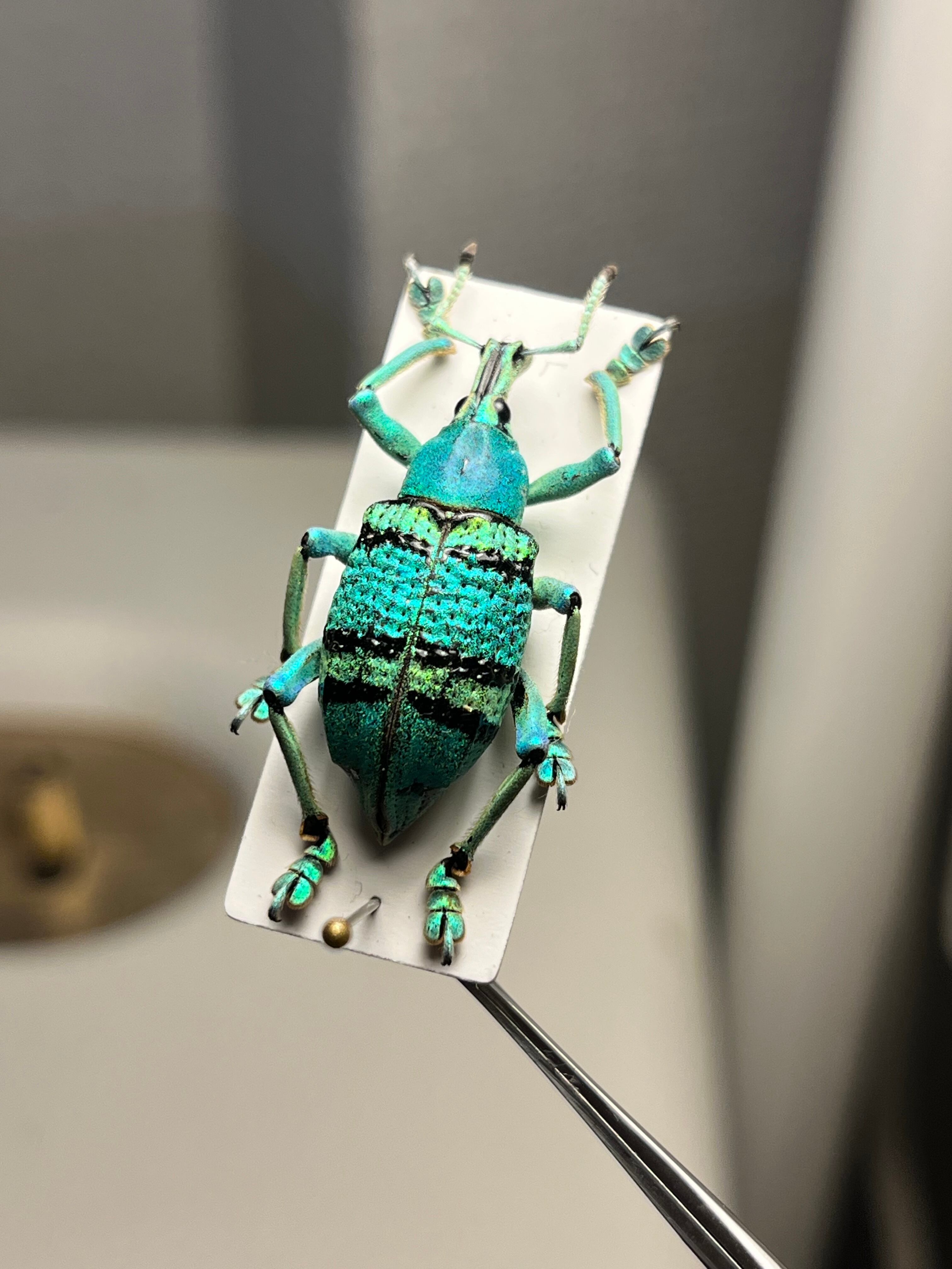 Eupholus schoenherrii は体長約25~31mmに達します。本種の体色は非常に変異に富んでいます。通常は金属的な青緑色で、鞘翅に沿って横方向の黒帯がいくつか見られます。脚は鮮やかな青色です。青緑色は非常に小さな鱗に由来しています。吻の先端と触角の先端は黒色です。