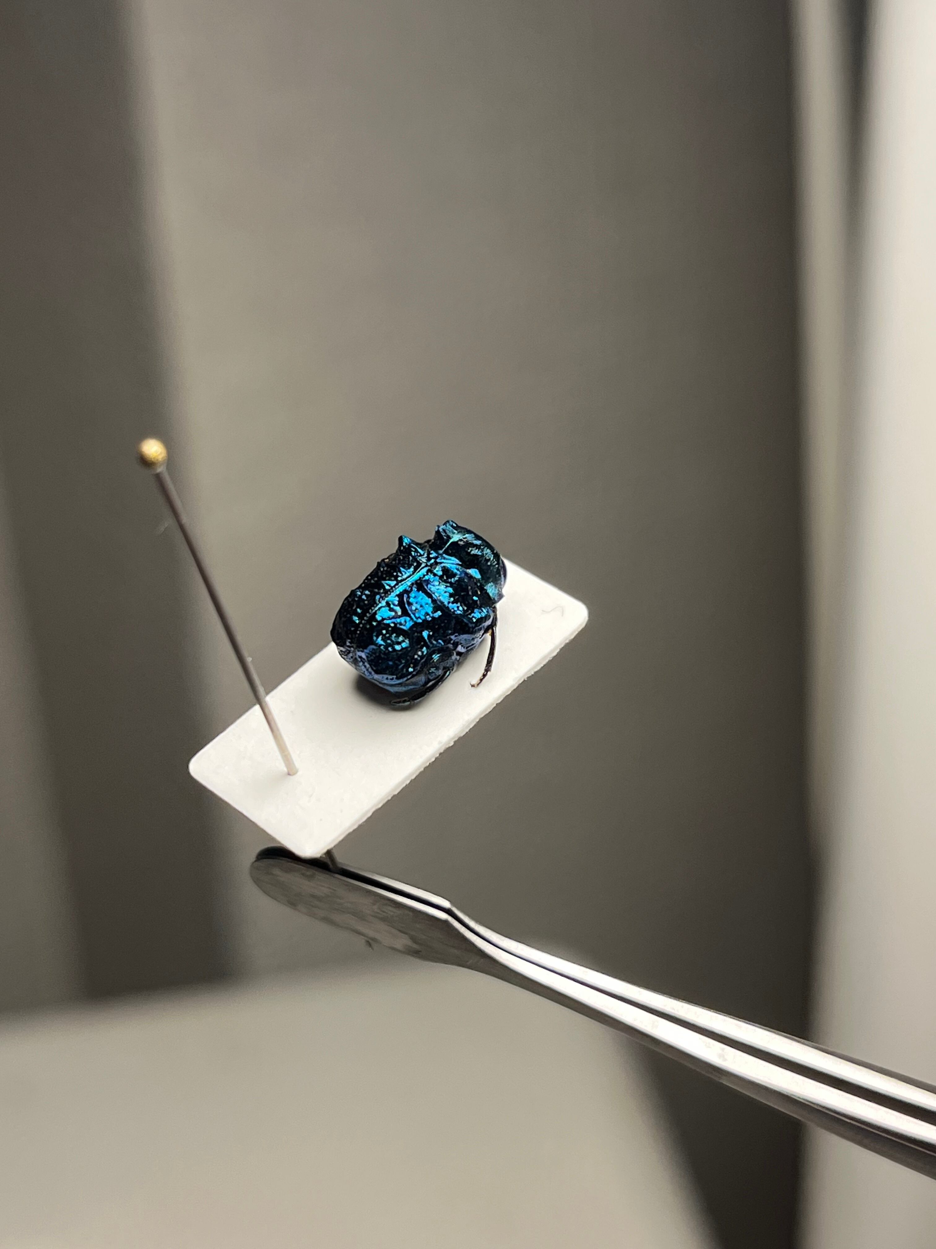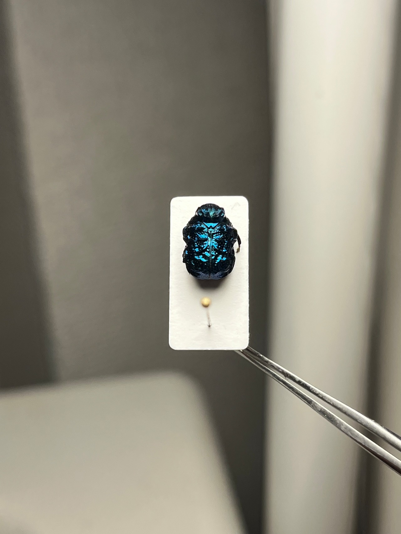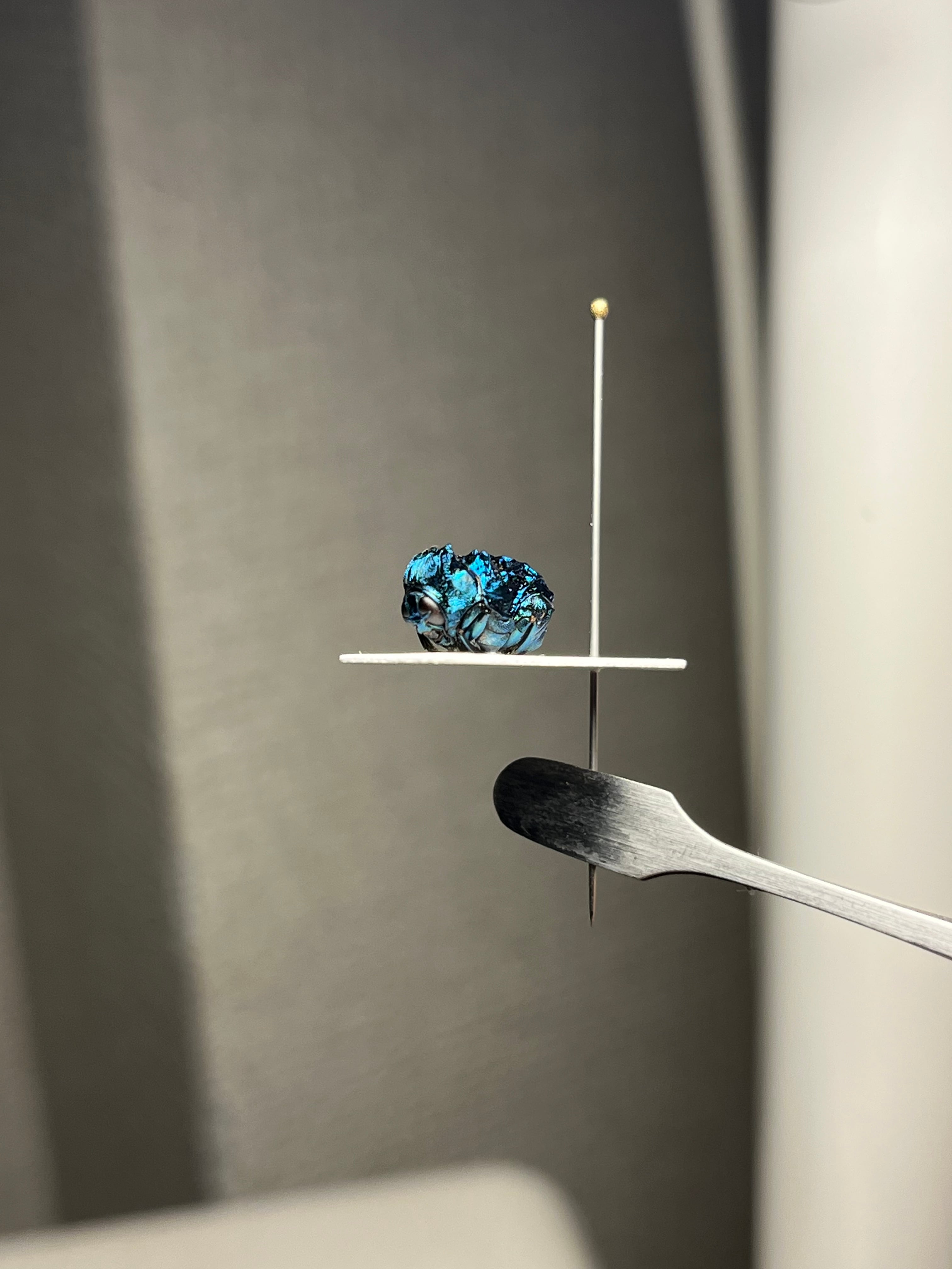 BRUTUSで1ページを丸々使って紹介されたグンジョウオオコブハムシの仲間。全体的に紺色がベースですが、角度によって鮮やかな水色から深みのある紫色へとグラデーションがかかります。大きさは約9mmあります。