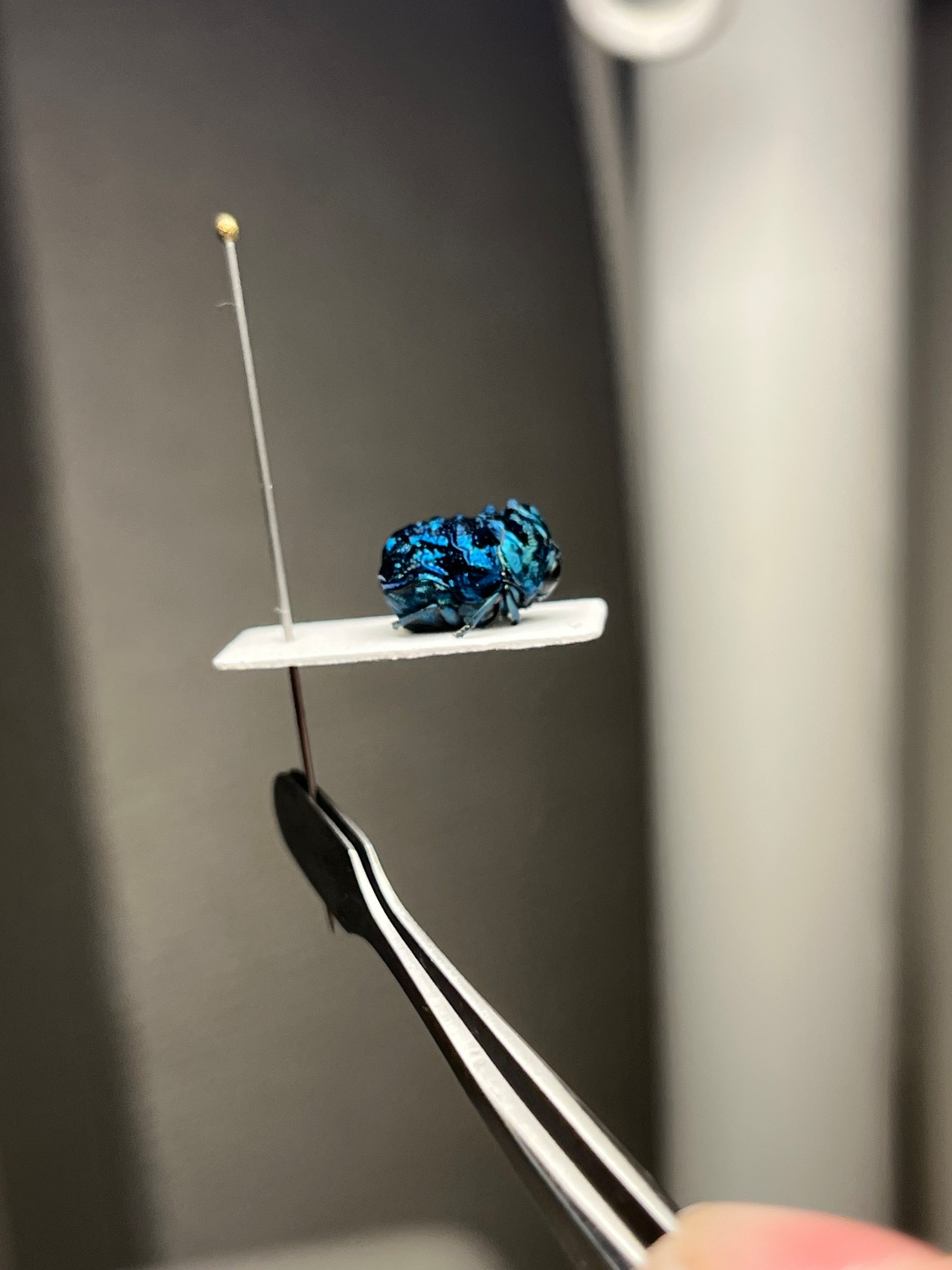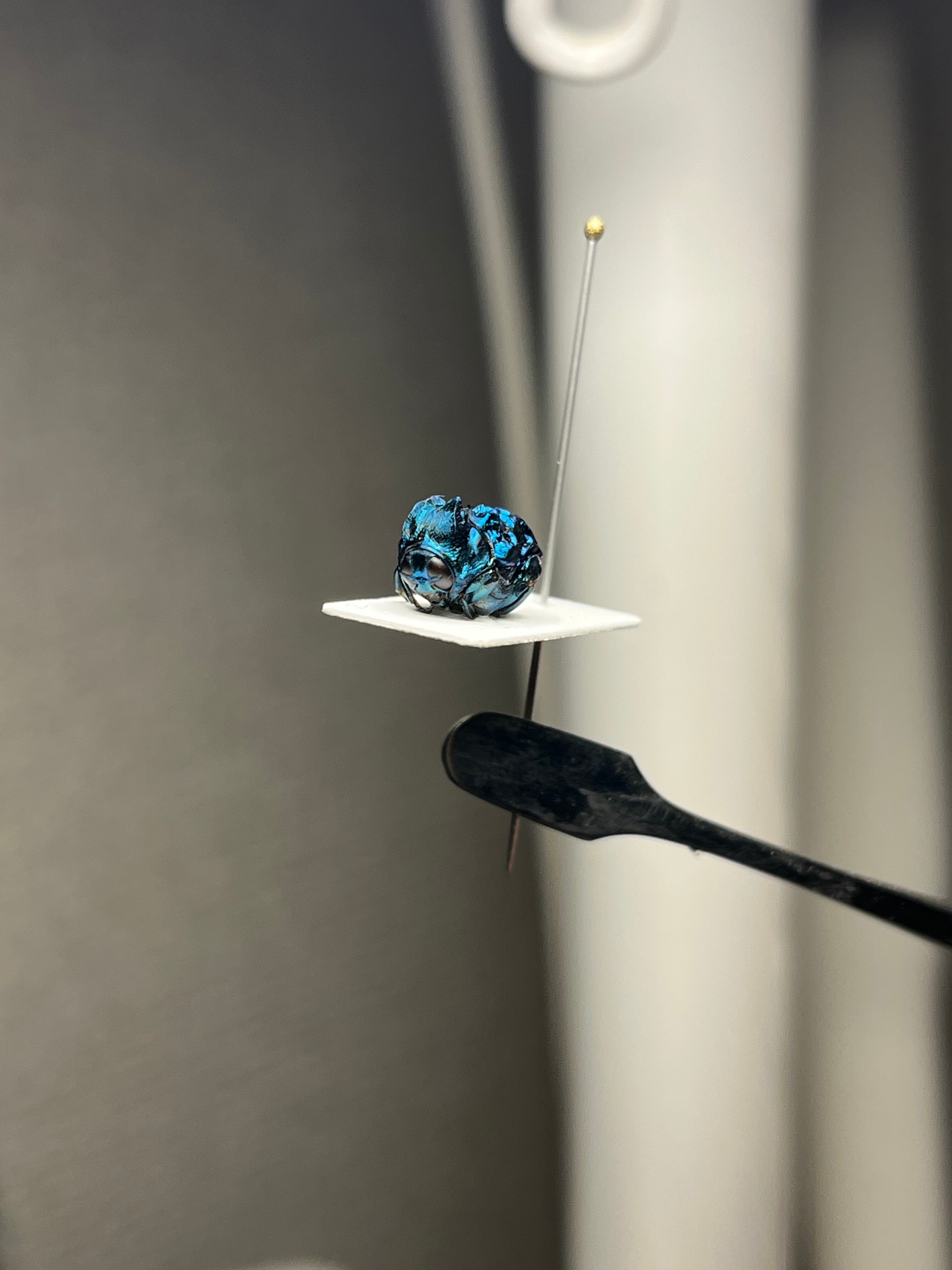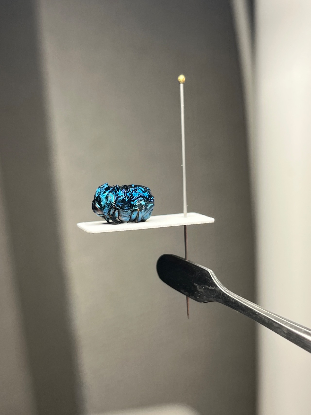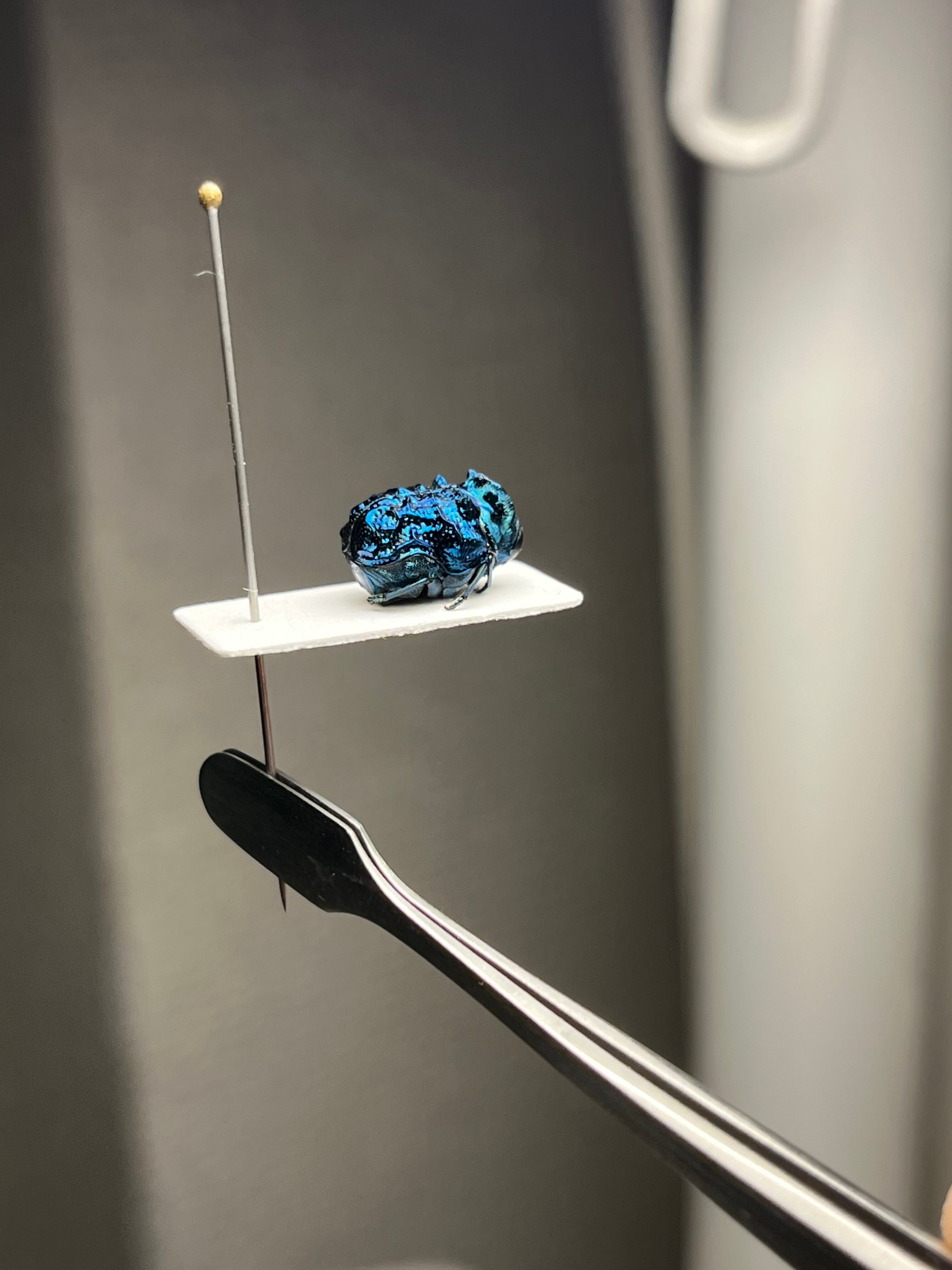 BRUTUSで1ページを丸々使って紹介されたグンジョウオオコブハムシの仲間。全体的に紺色がベースですが、角度によって鮮やかな水色から深みのある紫色へとグラデーションがかかります。大きさは約9mmあります。