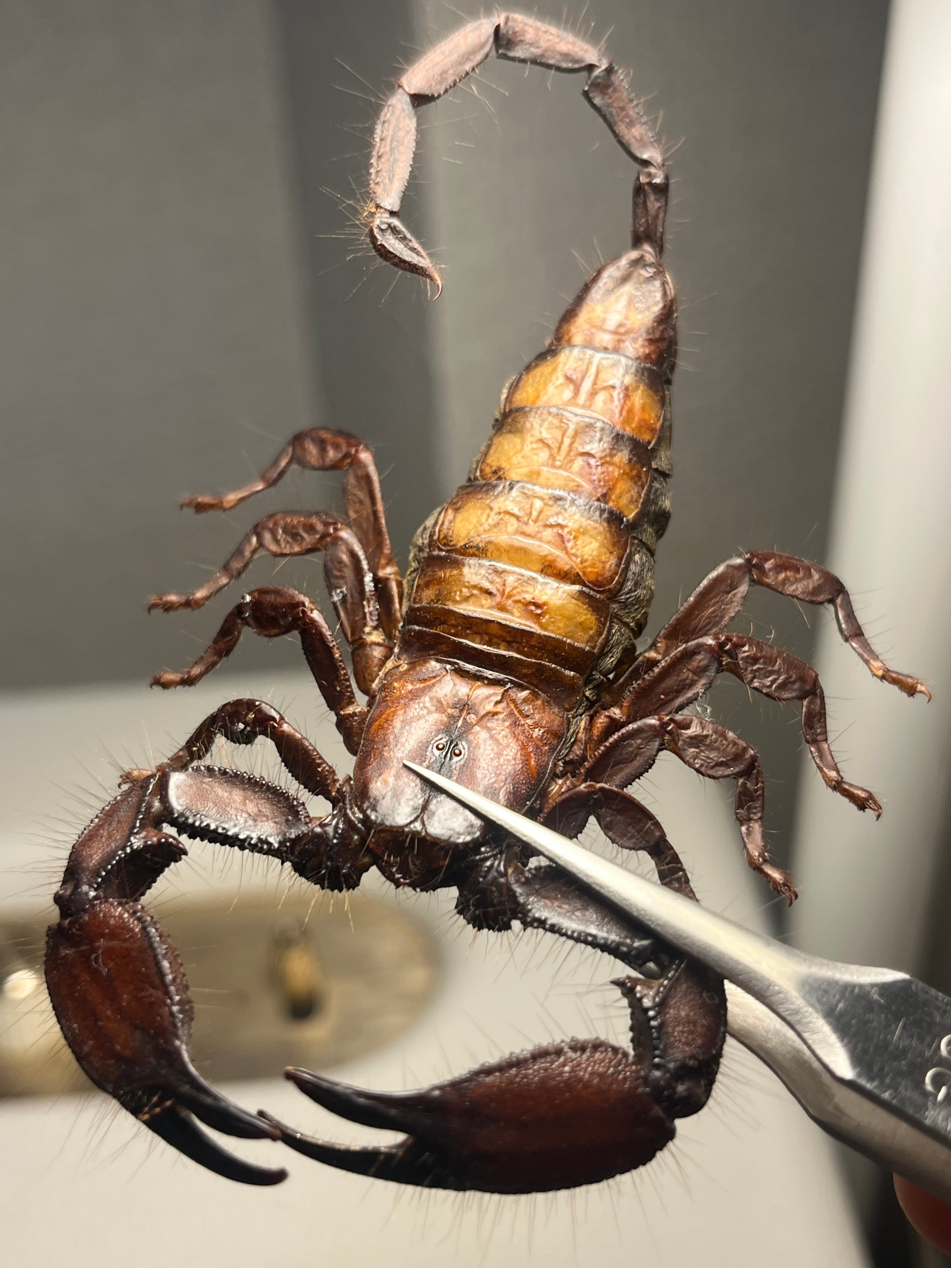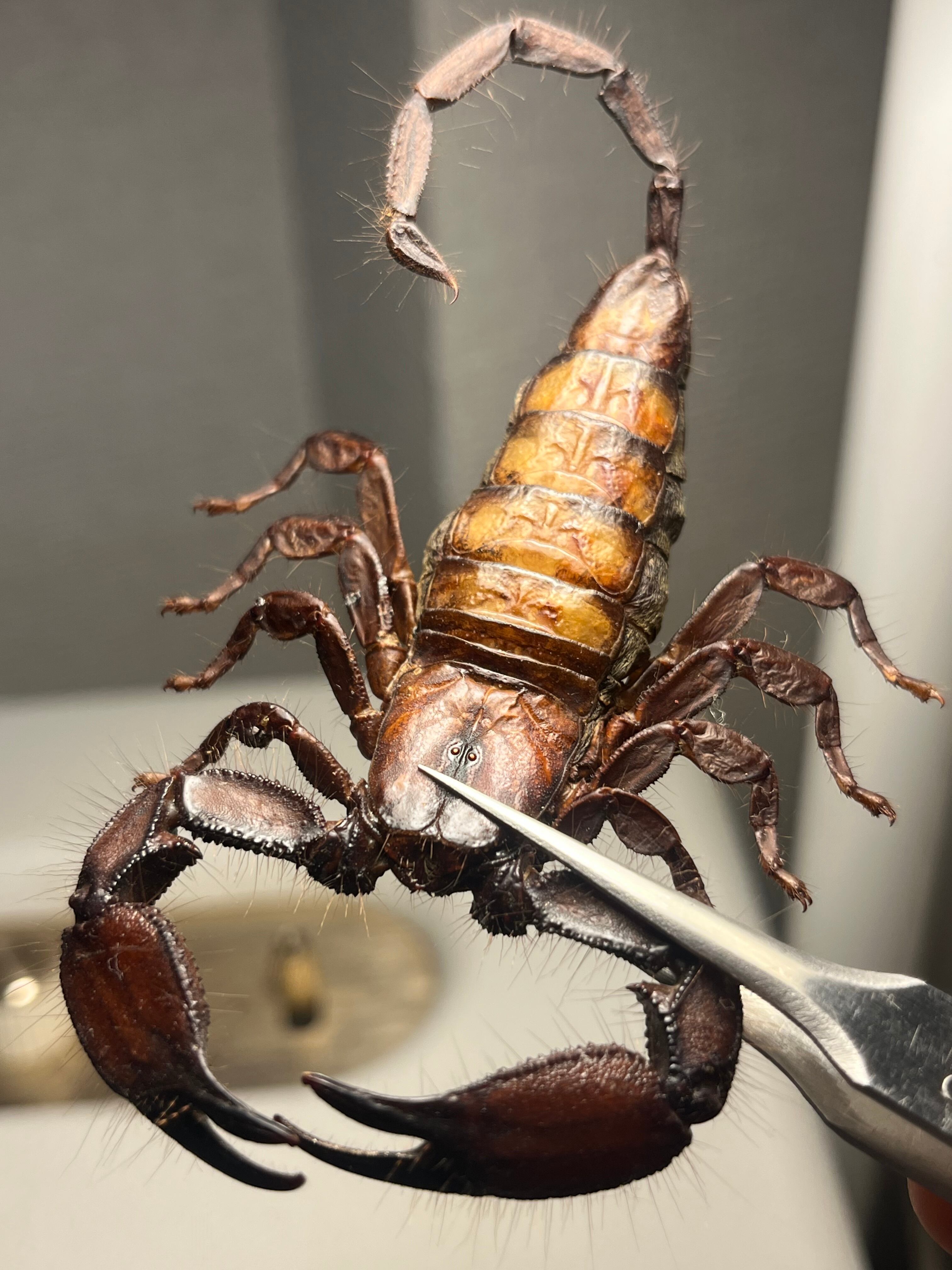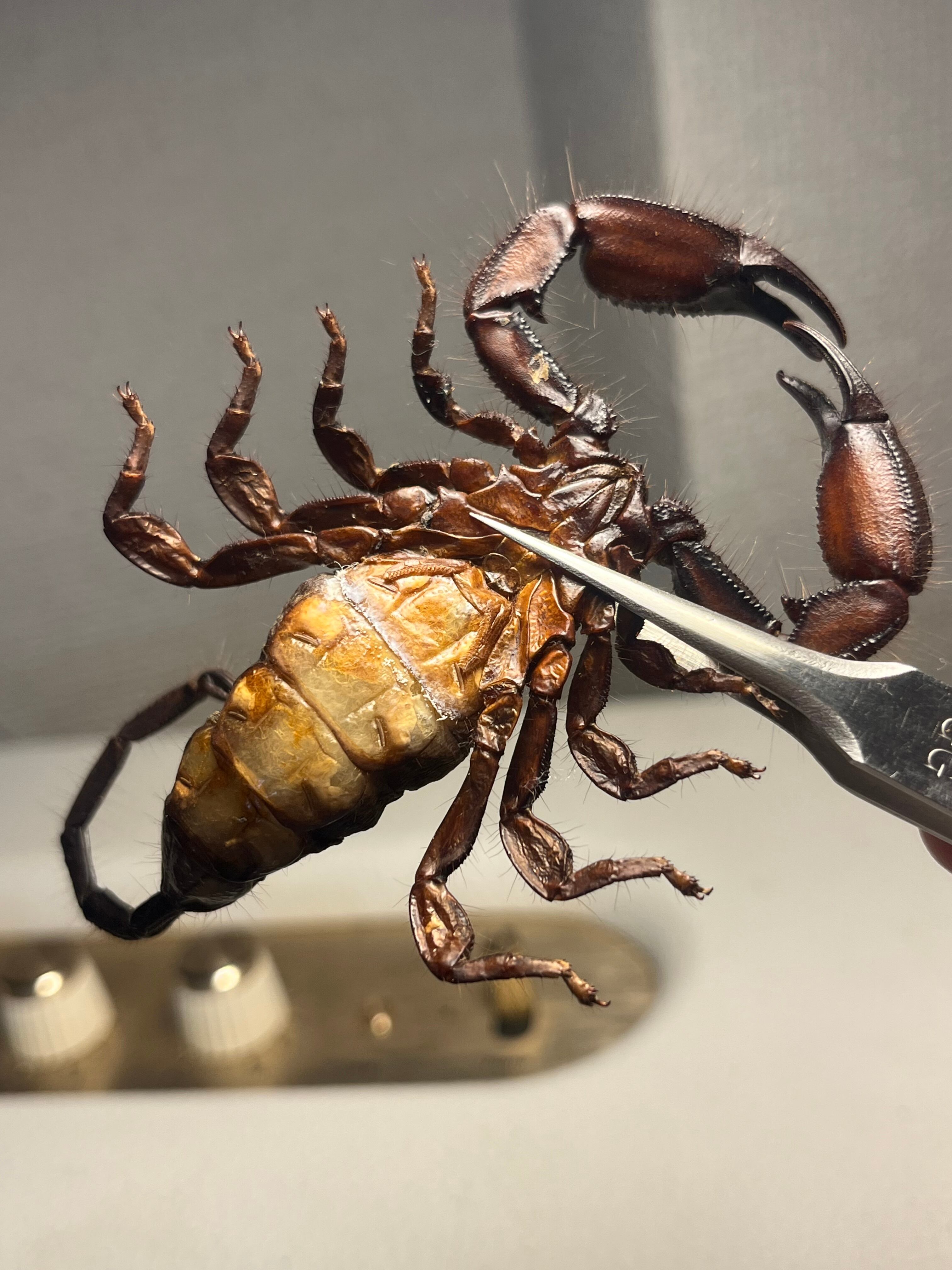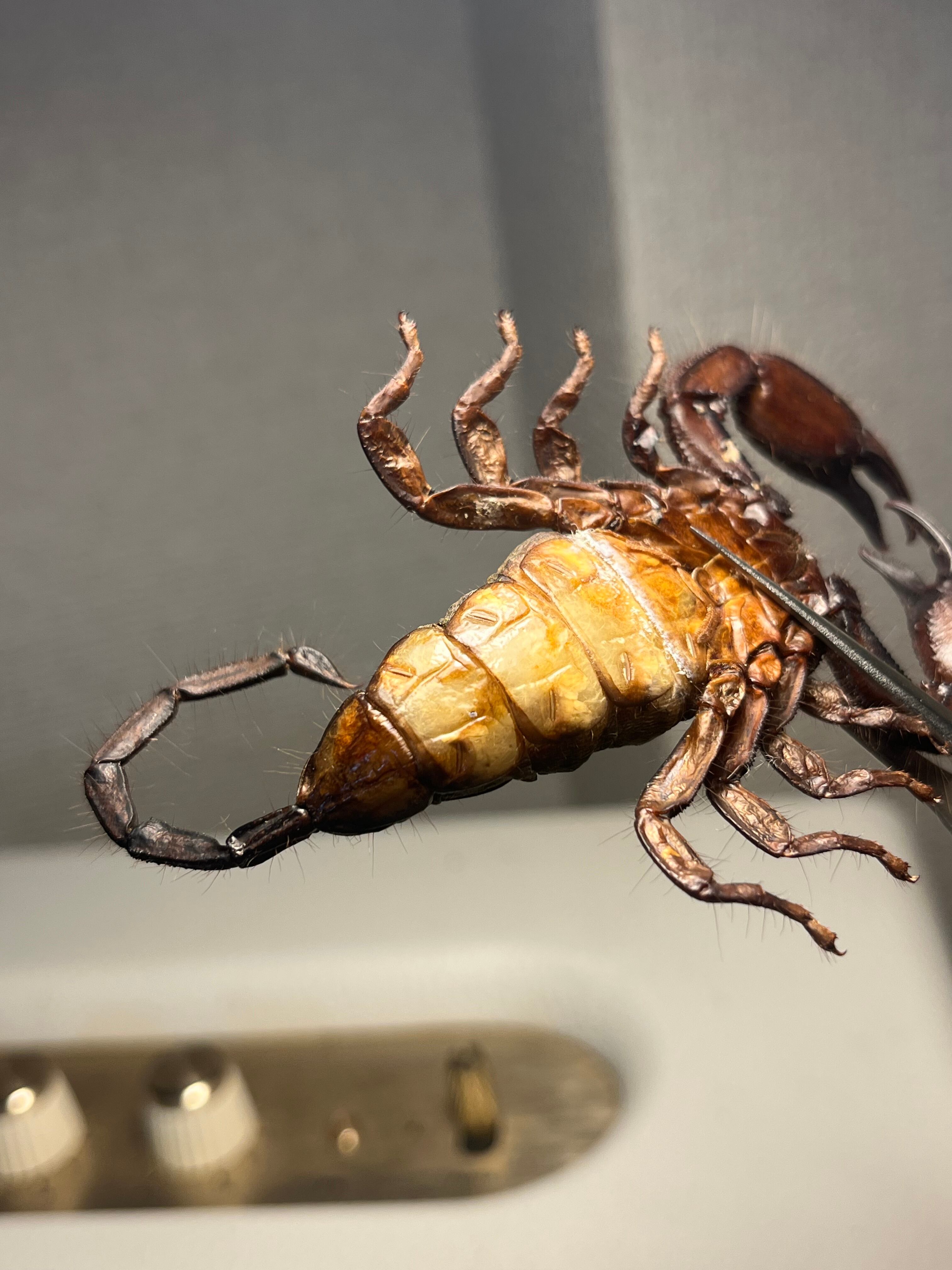 画像標本♀をお送りします。腕にコブがないのでサブアダルトのサイズ感です。サソリの理想的な展足方法かとおもいます。