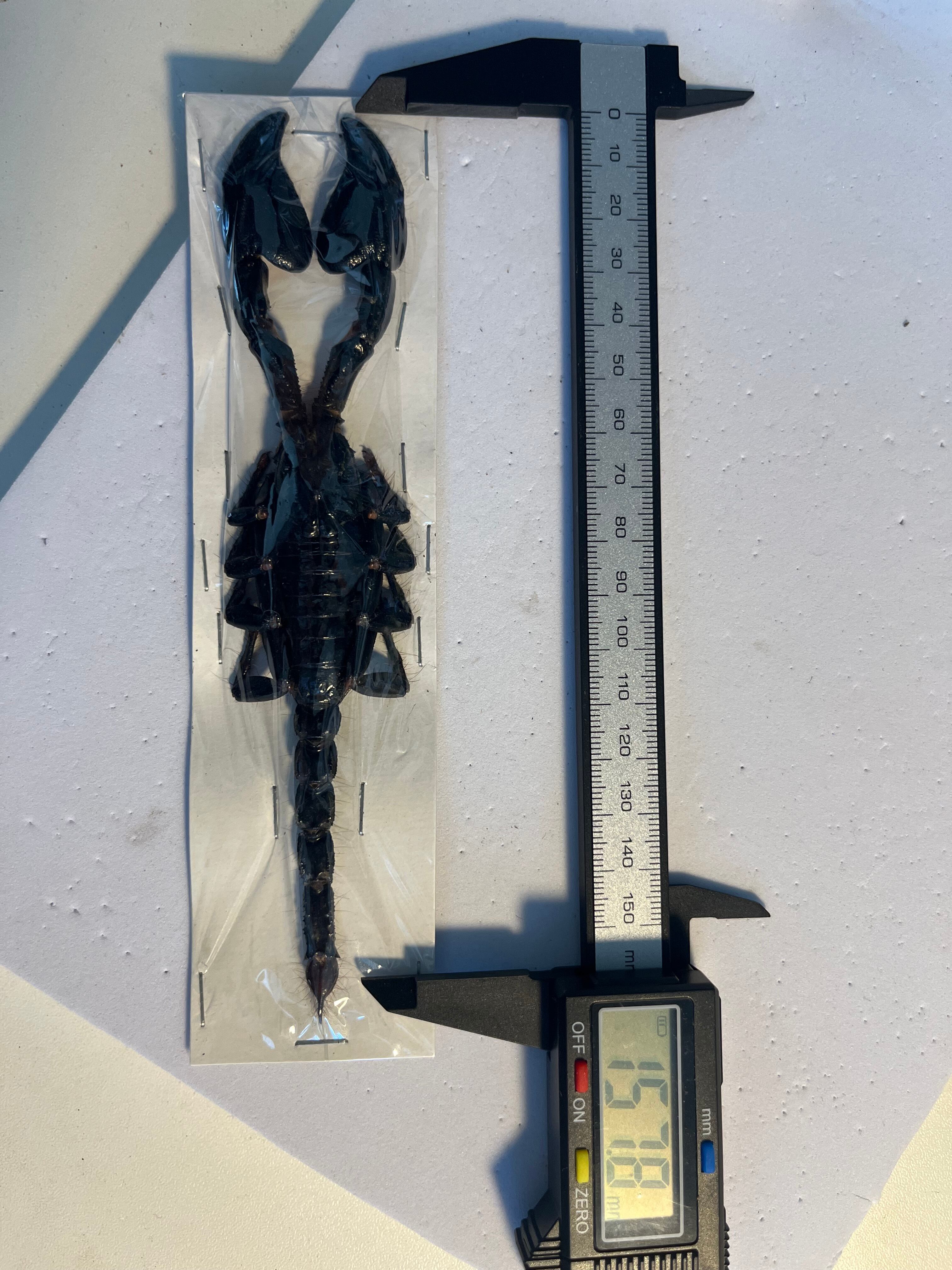 マレーシアなどの地域に生息する大型の黒いサソリの一種です。この肉食性の節足動物は、強靭なハサミと、大きな獲物を仕留める際に使用する毒針を持つことで知られています。堅い外骨格を持ち、夜行性で岩の割れ目や石の下に隠れる習性があります。