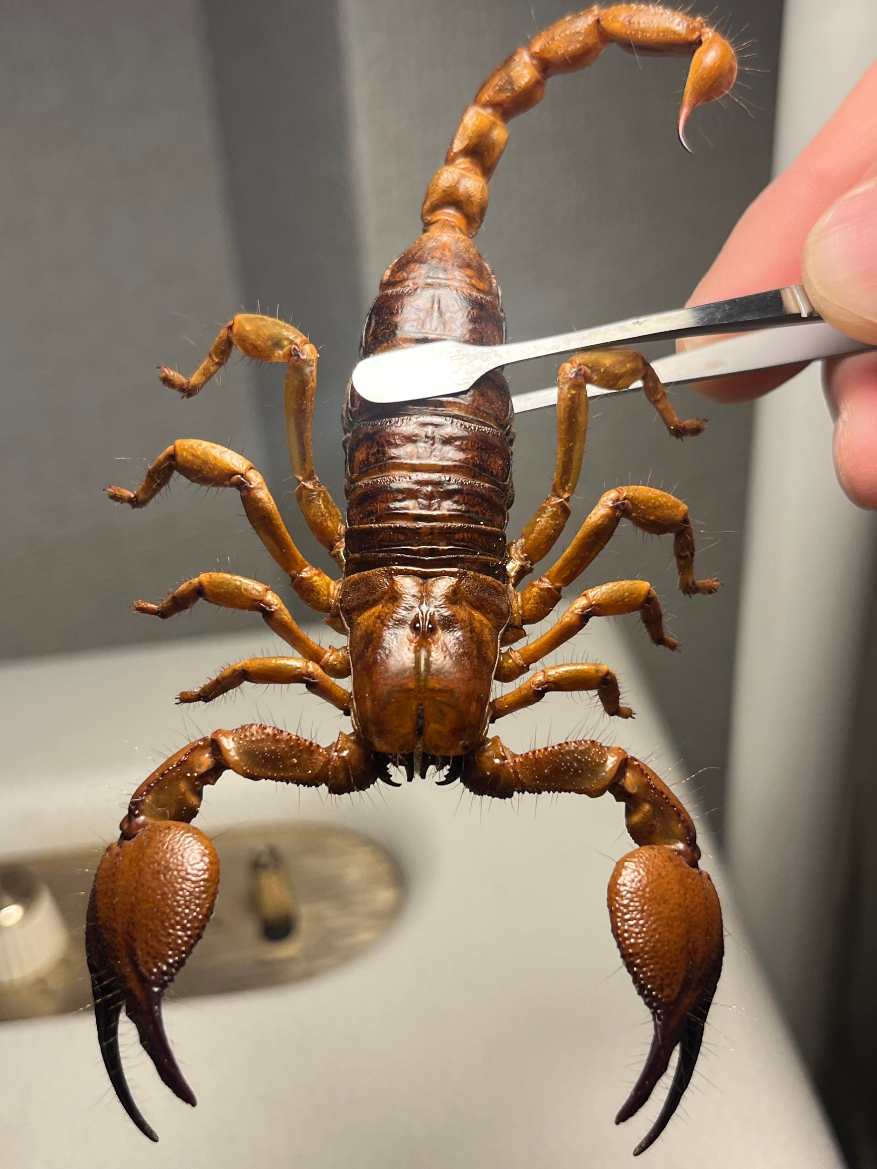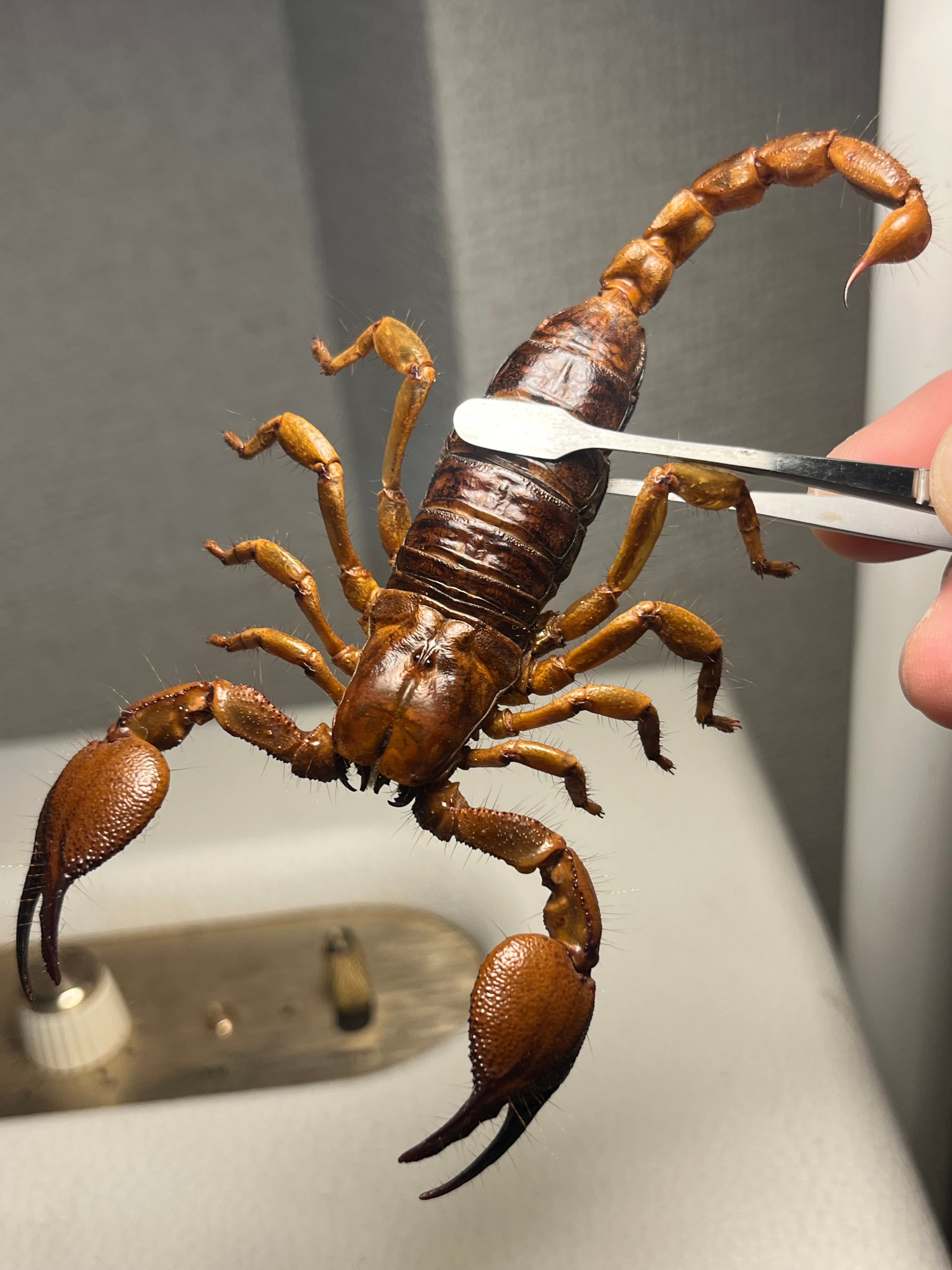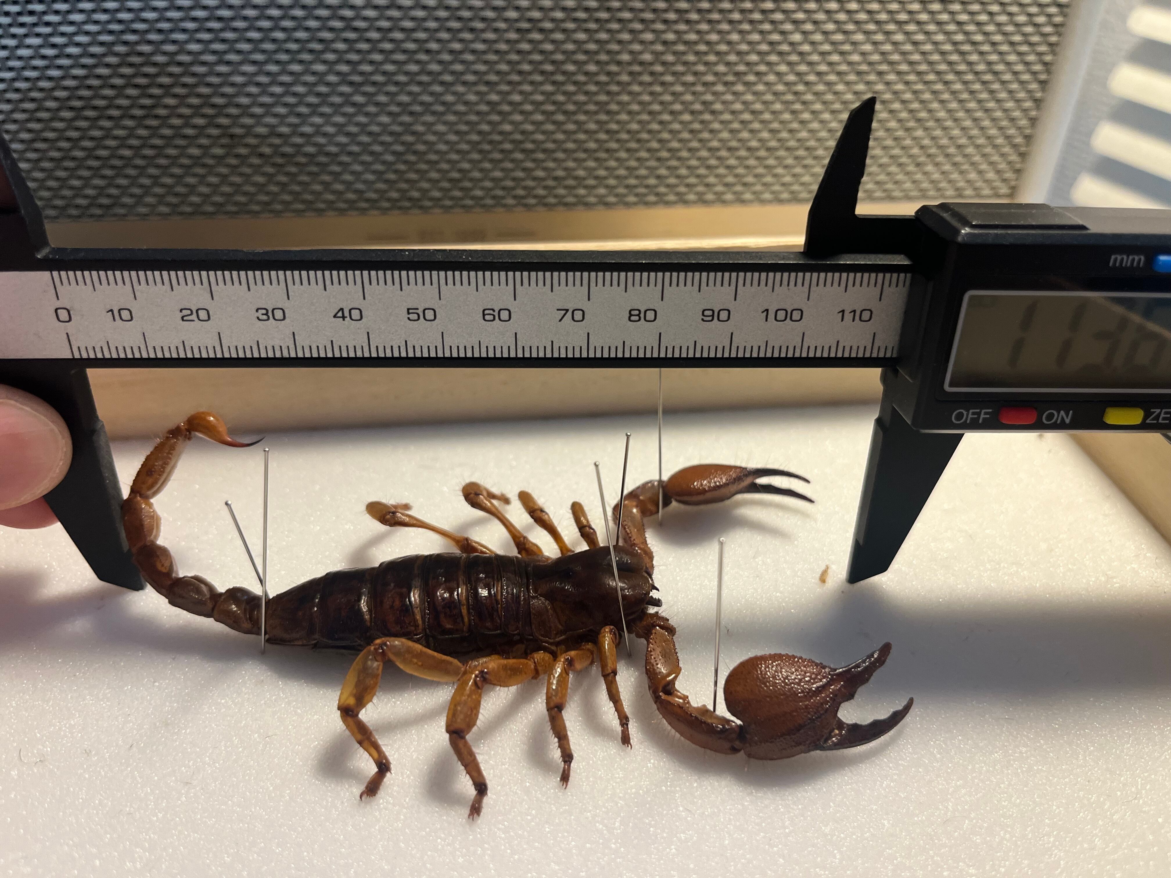 画像標本をお送りします。フルアダルトに近いサイズ感です。サソリの理想的な展足方法かとおもいます。