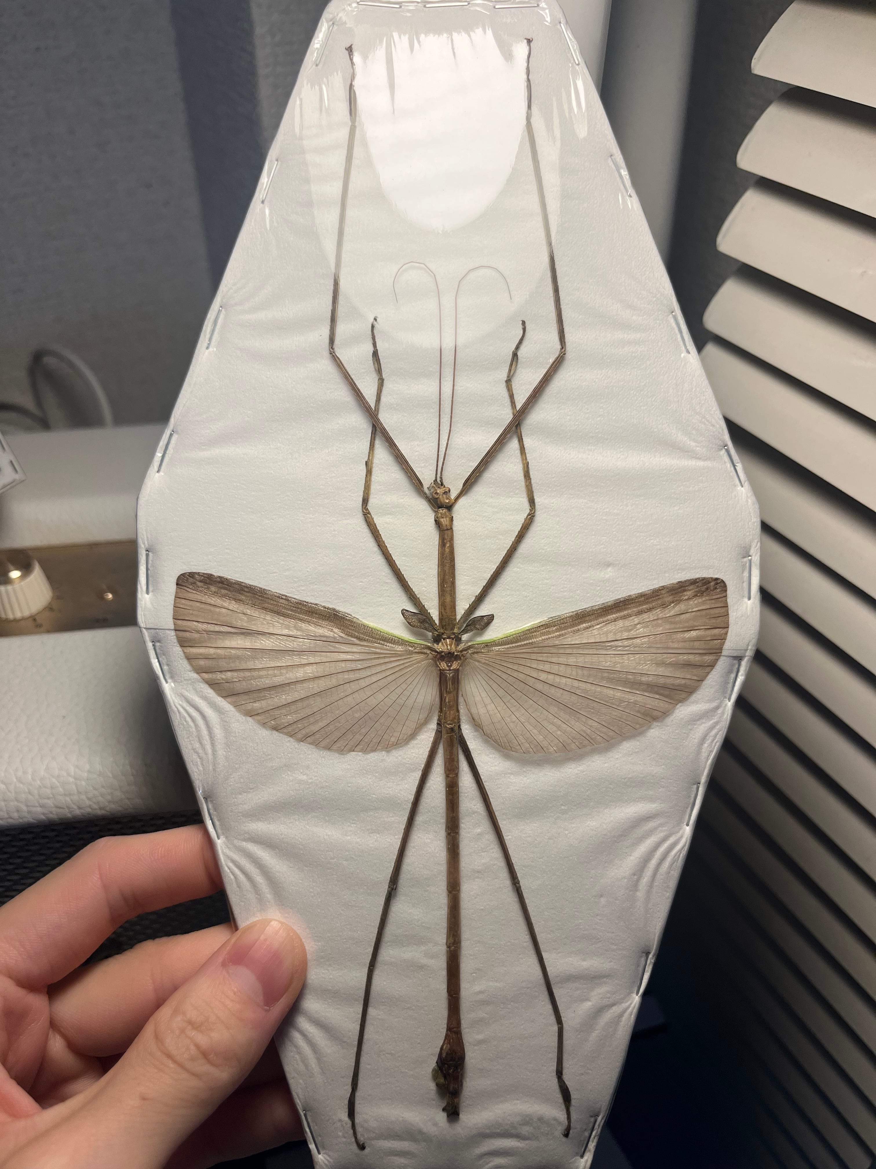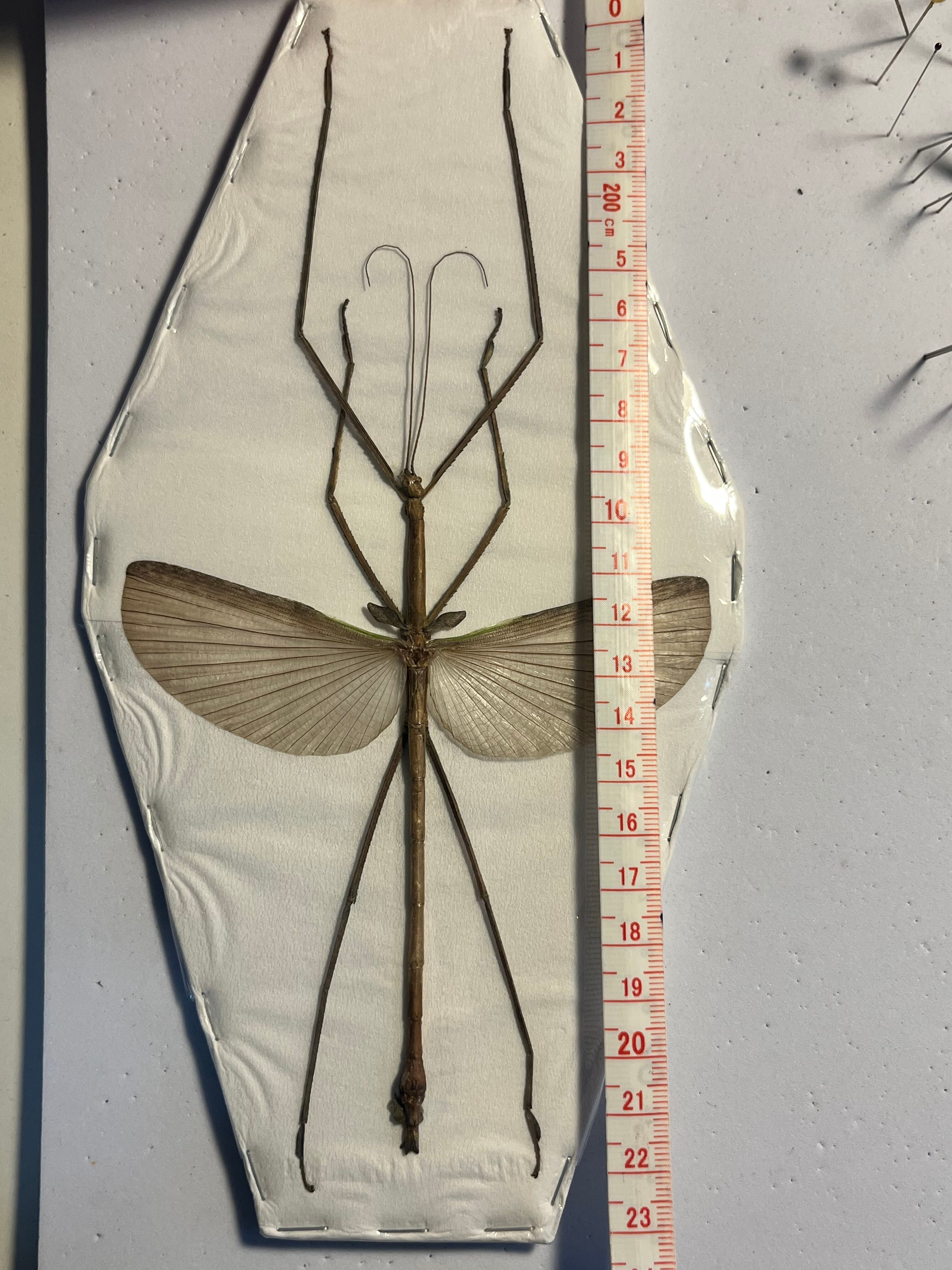 インドネシア 西ジャワ島 Mt. Argopuro産の画像標本♂をお送りします。2014年6月に採取されております。私が計測したところ頭胴長190mm程でした。ナナフシの標本は状態が悪いのが多いですがかなり良いと思います。