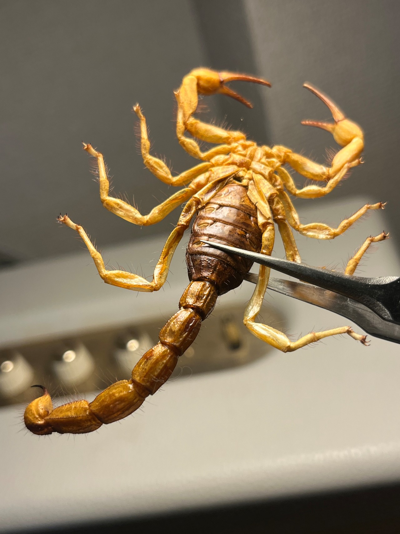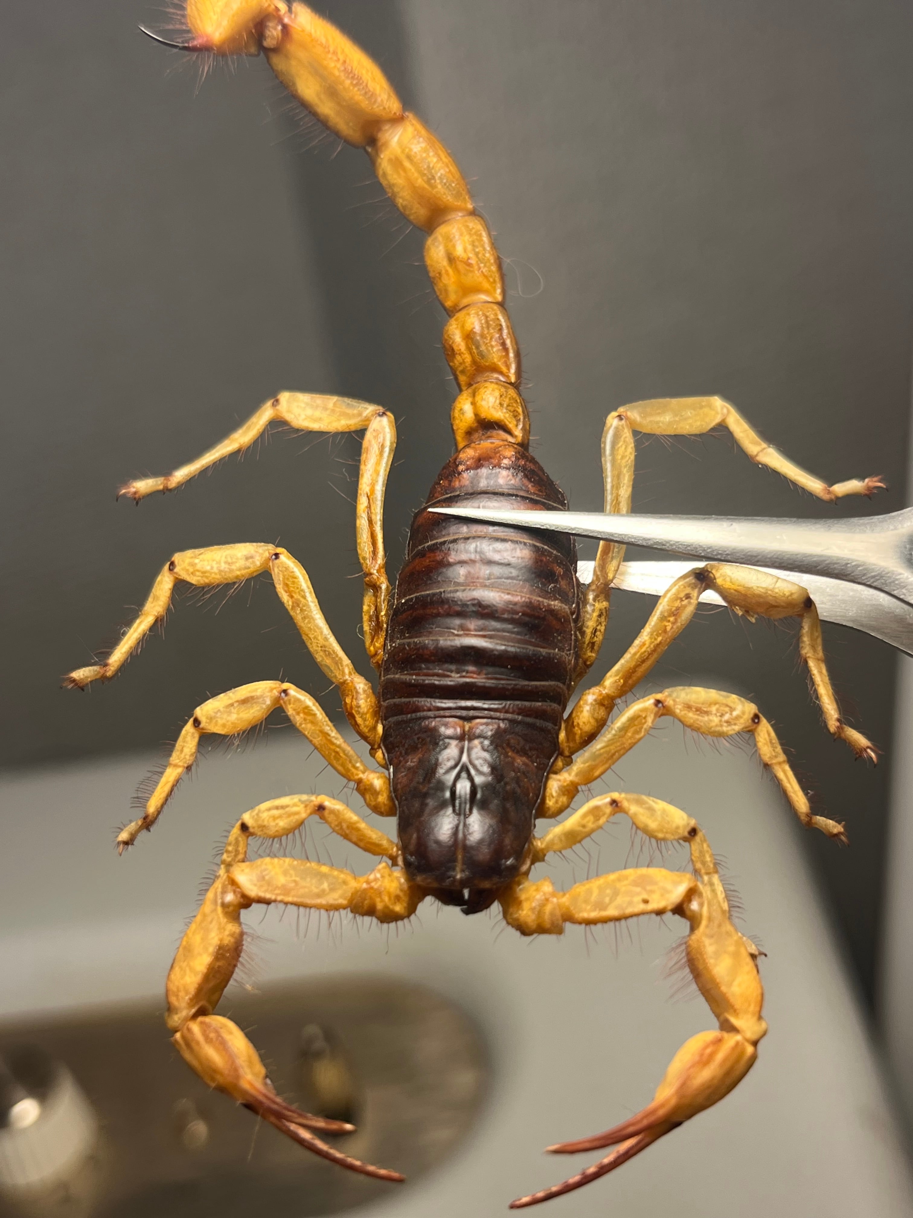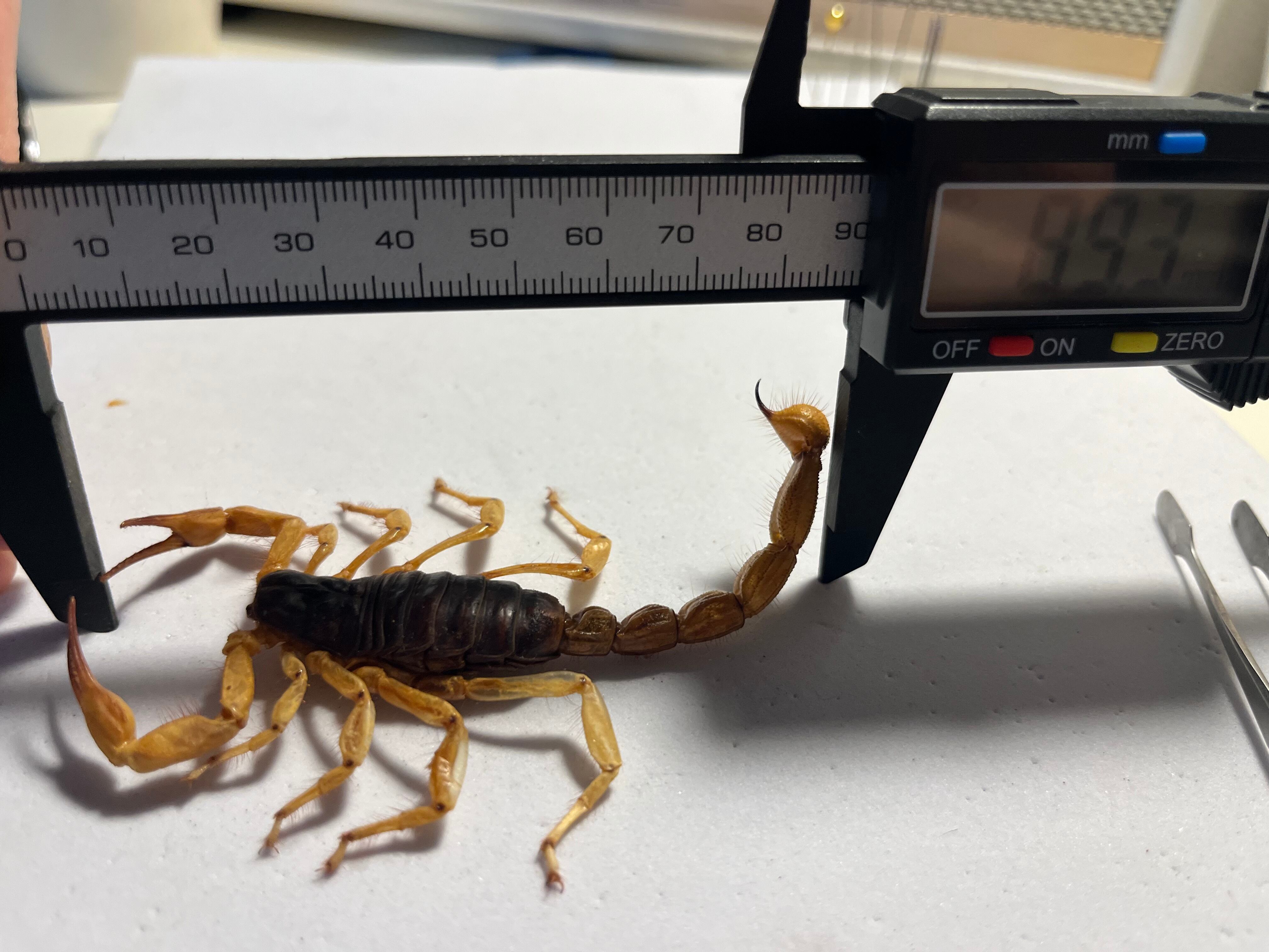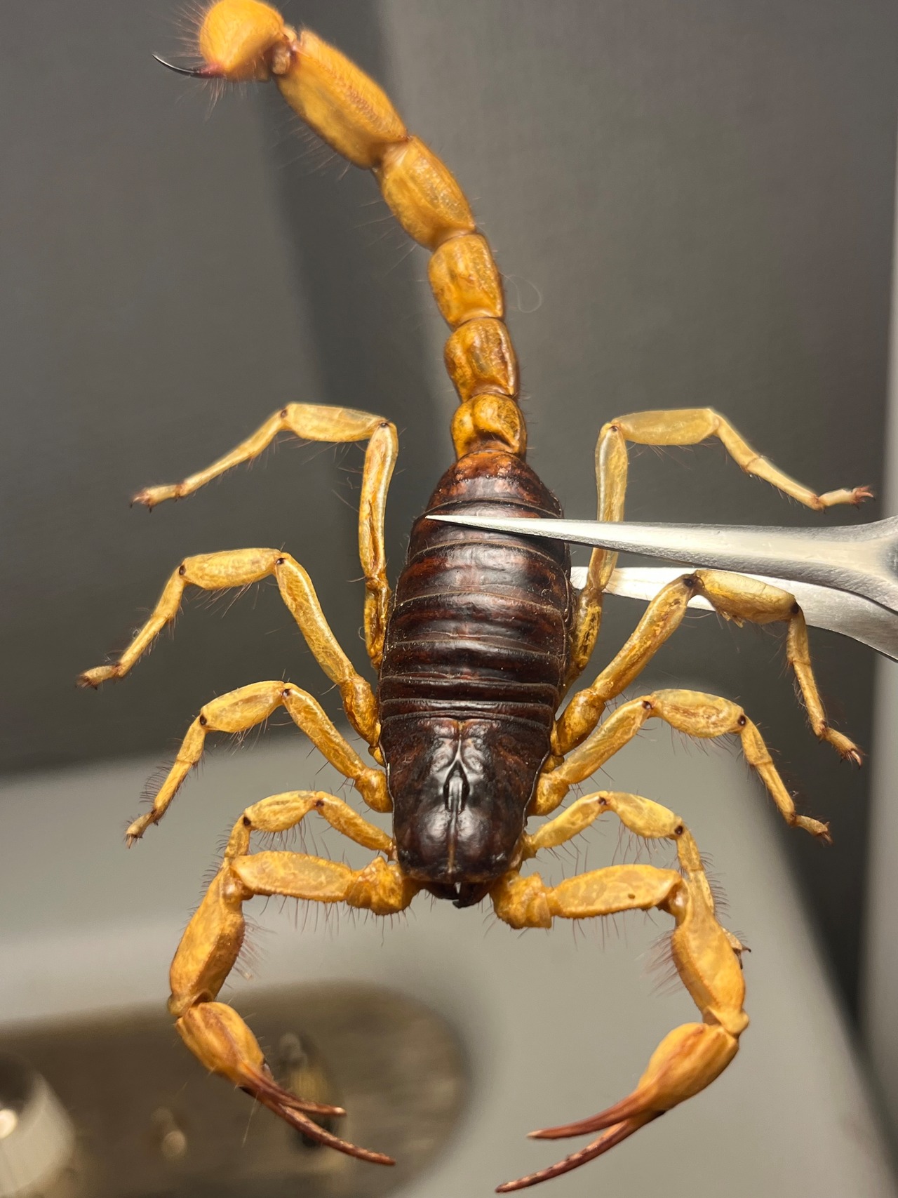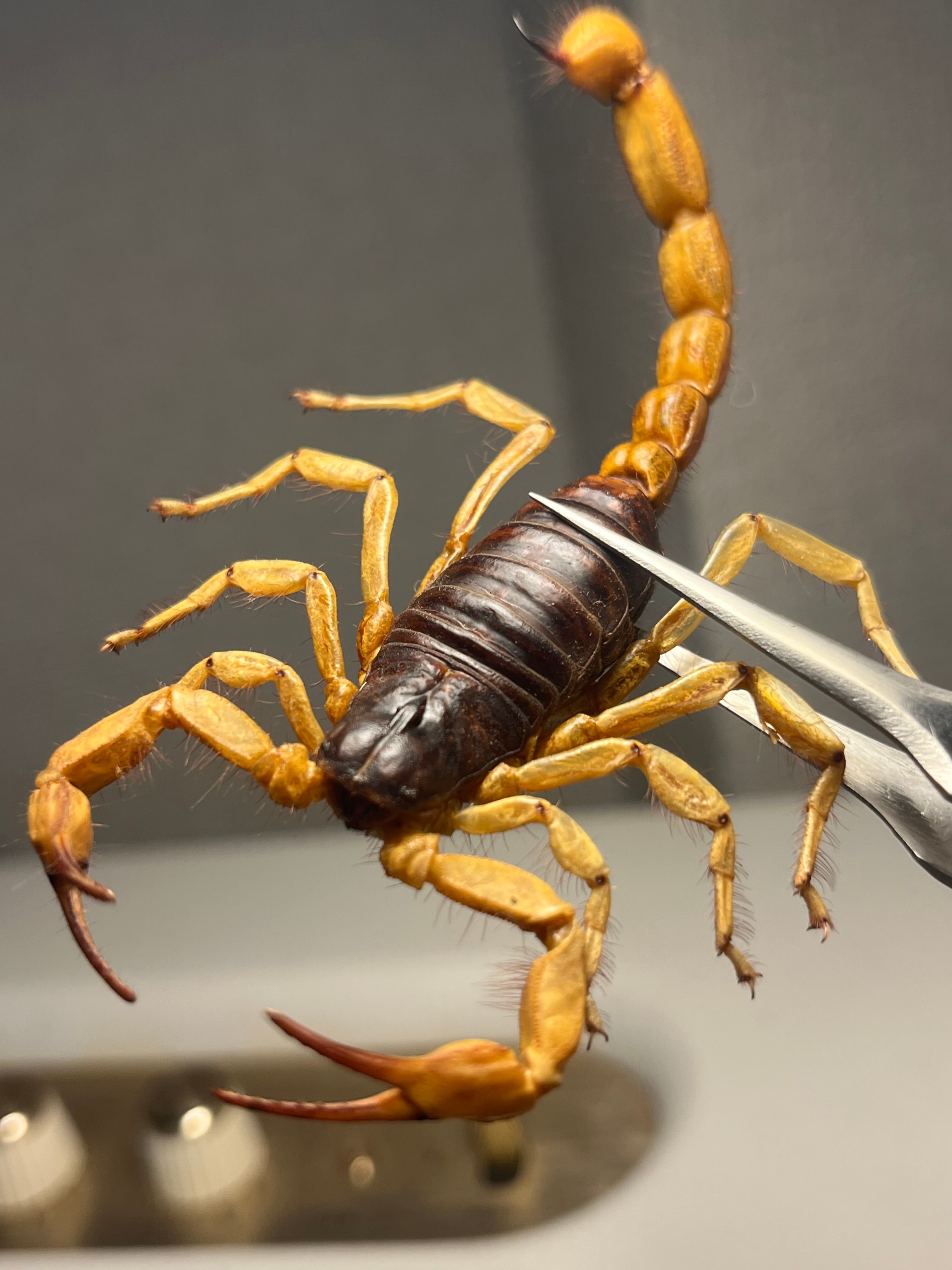 画像標本をお送りします。サソリの理想的な展足方法かとおもいます。全長90mmほどです。